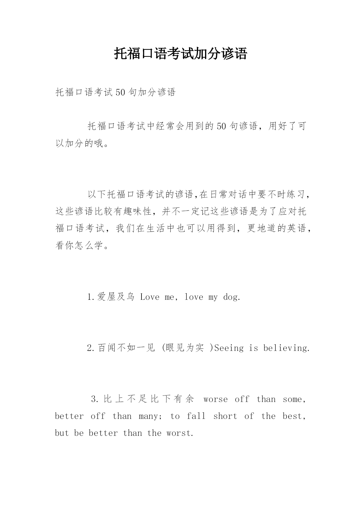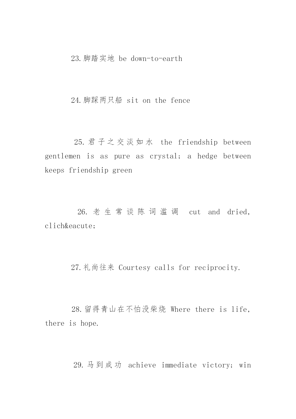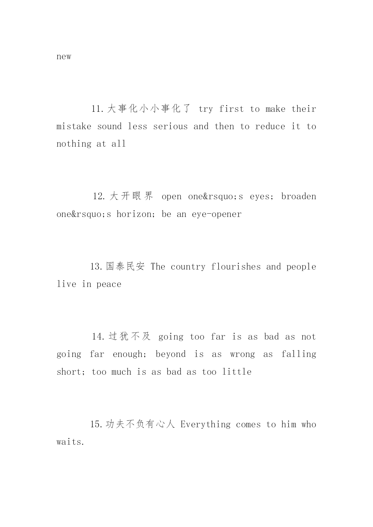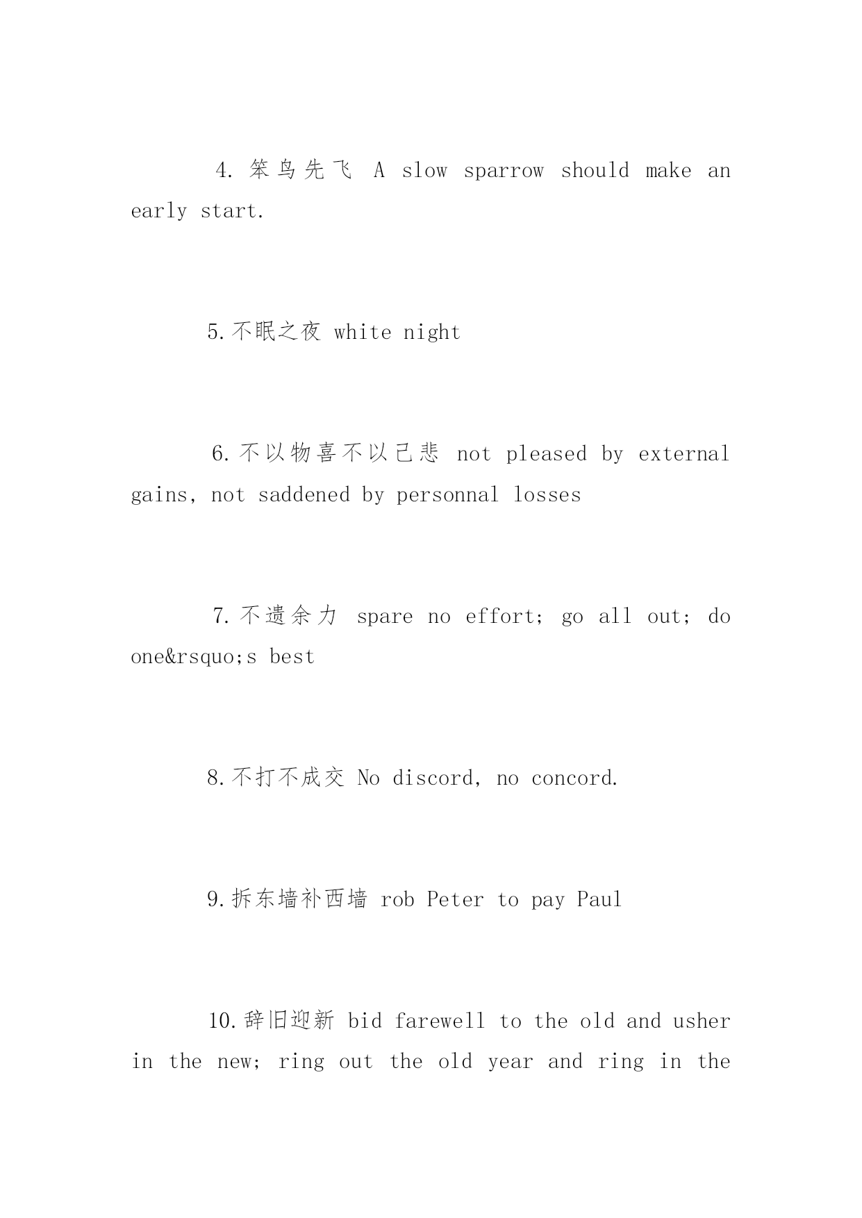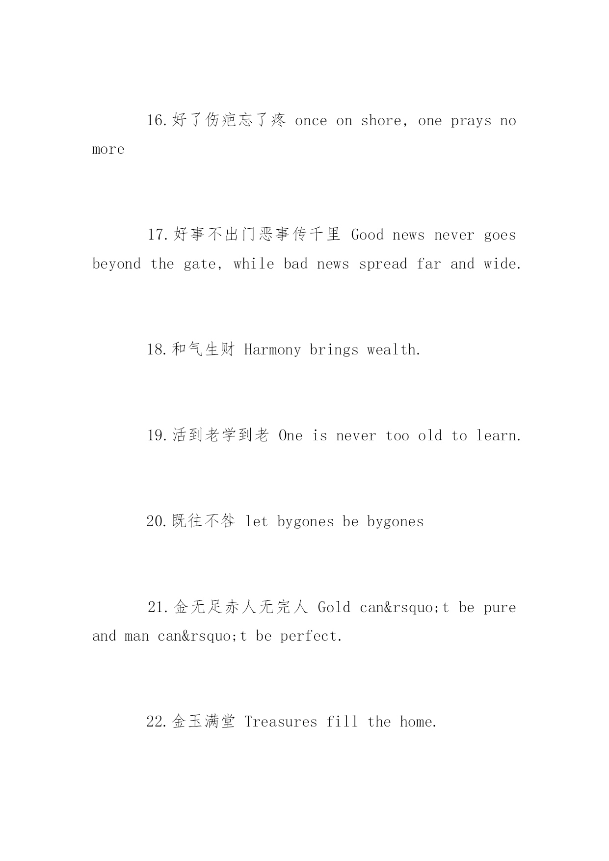 托福口语考试加分谚语 托福口语考试50句加分谚语 托福口语考试中经常会用到的50句谚语,用好了可以加分的哦。 以下托福口语考试的谚语,在日常对话中要不时练习,这些谚语比较有趣味性,并不一定记这些谚语是为了应对托福口语考试,我们在生活中也可以用得到,更地道的英语,看你怎么学。 1.爱屋及乌Loveme,lovemydog. 2.百闻不如一见(眼见为实)Seeingisbelieving. 3.比上不足比下有余worseoffthansome,betteroffthanmany;tofallshortofthebest,butbebetterthantheworst. 4.笨鸟先飞Aslowsparrowshouldmakeanearlystart. 5.不眠之夜whitenight 6.不以物喜不以己悲notpleasedbyexternalgains,notsaddenedbypersonnallosses 7.不遗余力sparenoeffort;goallout;doone’sbest 8.不打不成交Nodiscord,noconcord. 9.拆东墙补西墙robPetertopayPaul 10.辞旧迎新bidfarewelltotheoldandusherinthenew;ringouttheoldyearandringinthenew 11.大事化小小事化了tryfirsttomaketheirmistakesoundlessseriousandthentoreduceittonothingatall 12.大开眼界openone’seyes;broadenone’shorizon;beaneye-opener 13.国泰民安Thecountryflourishesandpeopleliveinpeace 14.过犹不及goingtoofarisasbadasnotgoingfarenough;beyondisaswrongasfallingshort;toomuchisasbadastoolittle 15.功夫不负有心人Everythingcomestohimwhowaits. 16.好了伤疤忘了疼onceonshore,onepraysnomore 17.好事不出门恶事传千里Goodnewsnevergoesbeyondthegate,whilebadnewsspreadfarandwide. 18.和气生财Harmonybringswealth. 19.活到老学到老Oneisnevertoooldtolearn. 20.既往不咎letbygonesbebygones 21.金无足赤人无完人Goldcan’tbepureandmancan’tbeperfect. 22.金玉满堂Treasuresfillthehome. 23.脚踏实地bedown-to-earth 24.脚踩两只船sitonthefence 25.君子之交淡如水thefriendshipbetweengentlemenisaspureascrystal;ahedgebetweenkeepsfriendshipgreen 26.老生常谈陈词滥调cutanddried,cliché 27.礼尚往来Courtesycallsforreciprocity. 28.留得青山在不怕没柴烧Wherethereislife,thereishope. 29.马到成功achieveimmediatevictory;wininstantsuccess 30.名利双收gaininbothfameandwealth 31.茅塞顿开besuddenlyenlightened 32.没有规矩不成方圆Nothingcanbeaccomplishedwithoutnormsorstandards. 33.每逢佳节倍思亲Onfestiveoccasionsmorethaneveronethinksofone’sdearonesfaraway.Itisonthefestivaloccasionswhenonemisseshisdearmost. 34.谋事在人成事在天Theplanninglieswithman,theoutcomewithHeaven.Manproposes,Goddisposes. 35.弄巧成拙betoosmartbyhalf;Cunningoutwitsitself 36.拿手好戏masterpiece 37.赔了夫人又折兵throwgoodmoneyafterbad 38.抛砖引玉amodestspurtoinduceotherstocomeforwardwithvalu
