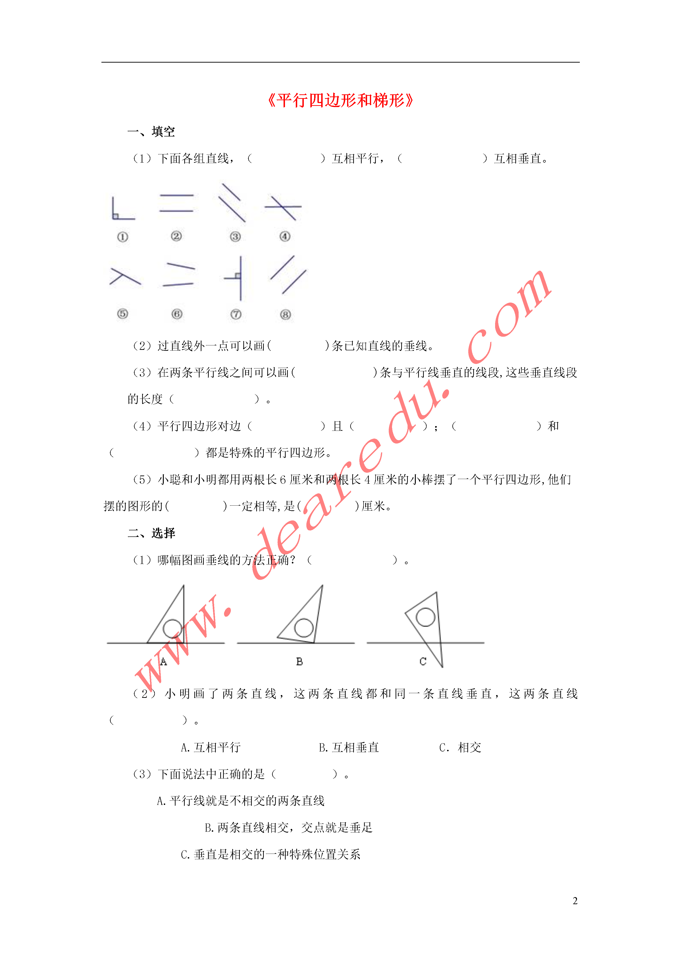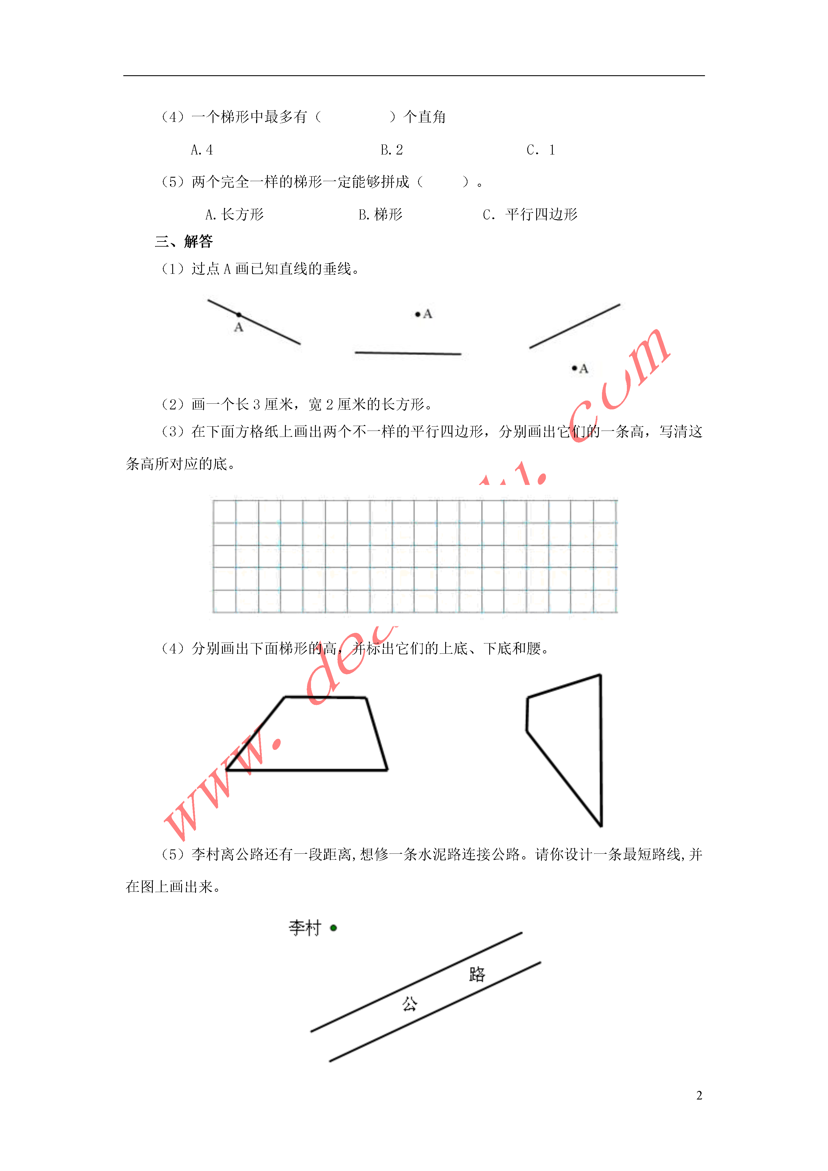 2《平行四边形和梯形》一、填空(1)下面各组直线,()互相平行,()互相垂直。(2)过直线外一点可以画()条已知直线的垂线。(3)在两条平行线之间可以画()条与平行线垂直的线段,这些垂直线段的长度()。(4)平行四边形对边()且();()和()都是特殊的平行四边形。(5)小聪和小明都用两根长6厘米和两根长4厘米的小棒摆了一个平行四边形,他们摆的图形的()一定相等,是()厘米。二、选择(1)哪幅图画垂线的方法正确?()。(2)小明画了两条直线,这两条直线都和同一条直线垂直,这两条直线()。A.互相平行B.互相垂直C.相交(3)下面说法中正确的是()。A.平行线就是不相交的两条直线B.两条直线相交,交点就是垂足C.垂直是相交的一种特殊位置关系(4)一个梯形中最多有()个直角A.4B.2C.1(5)两个完全一样的梯形一定能够拼成()。A.长方形B.梯形C.平行四边形三、解答(1)过点A画已知直线的垂线。(2)画一个长3厘米,宽2厘米的长方形。(3)在下面方格纸上画出两个不一样的平行四边形,分别画出它们的一条高,写清这条高所对应的底。(4)分别画出下面梯形的高,并标出它们的上底、下底和腰。(5)李村离公路还有一段距离,想修一条水泥路连接公路。请你设计一条最短路线,并在图上画出来。