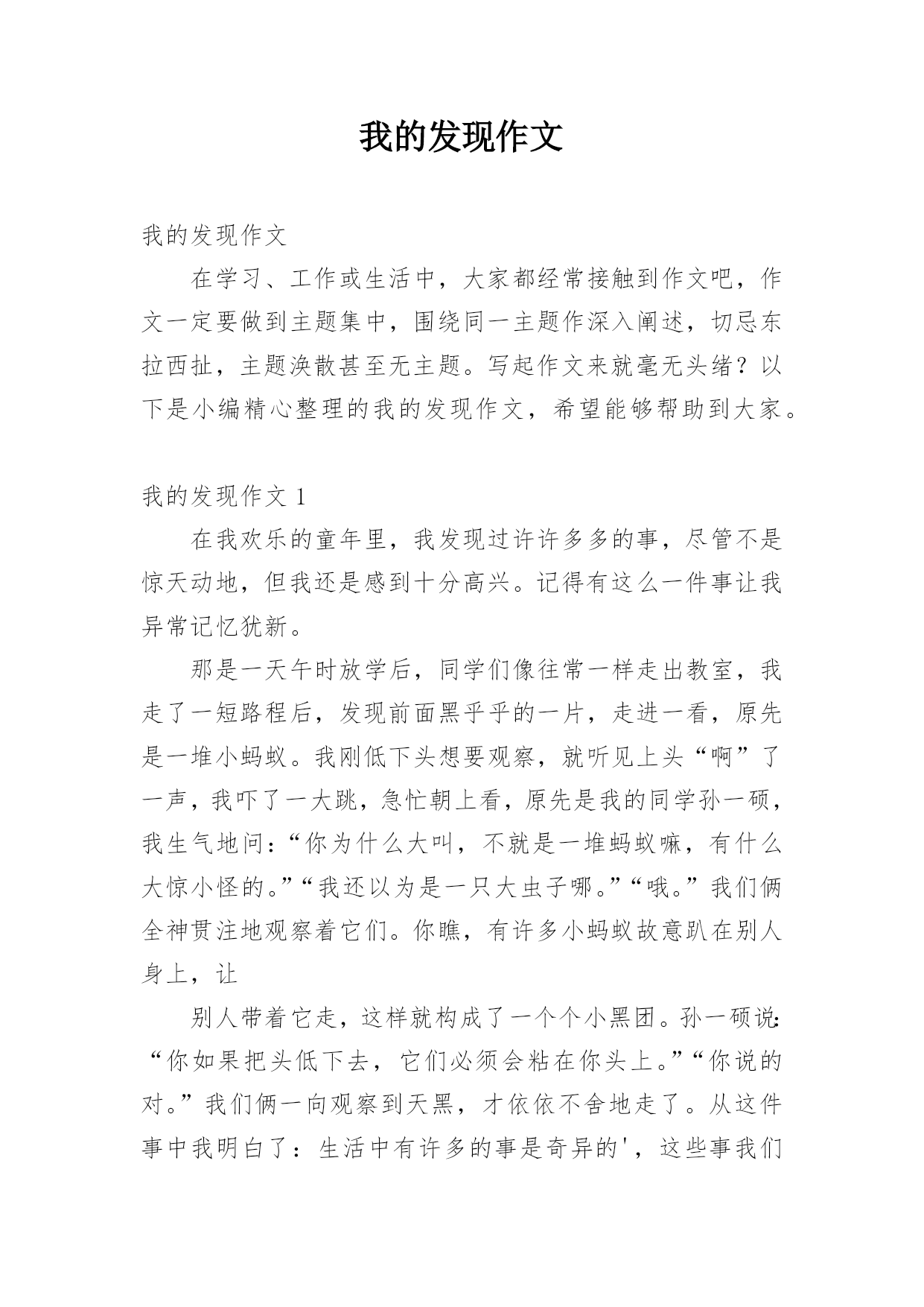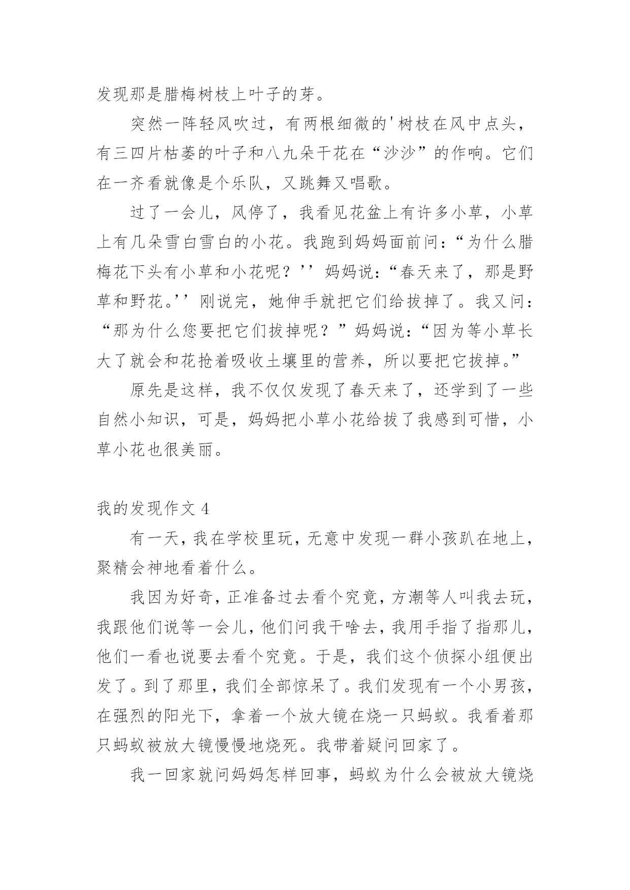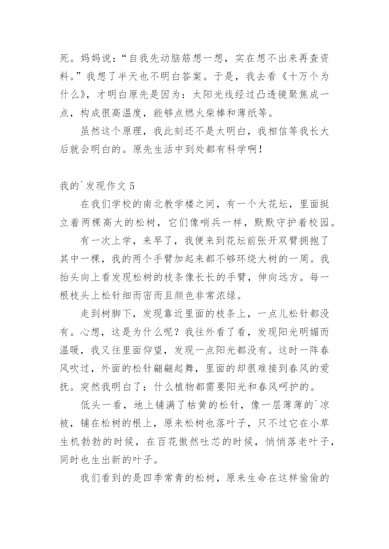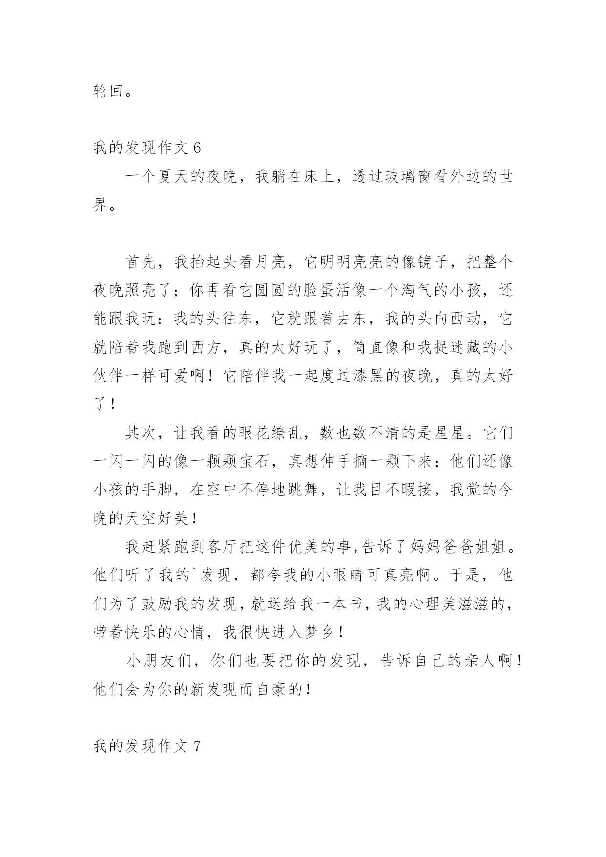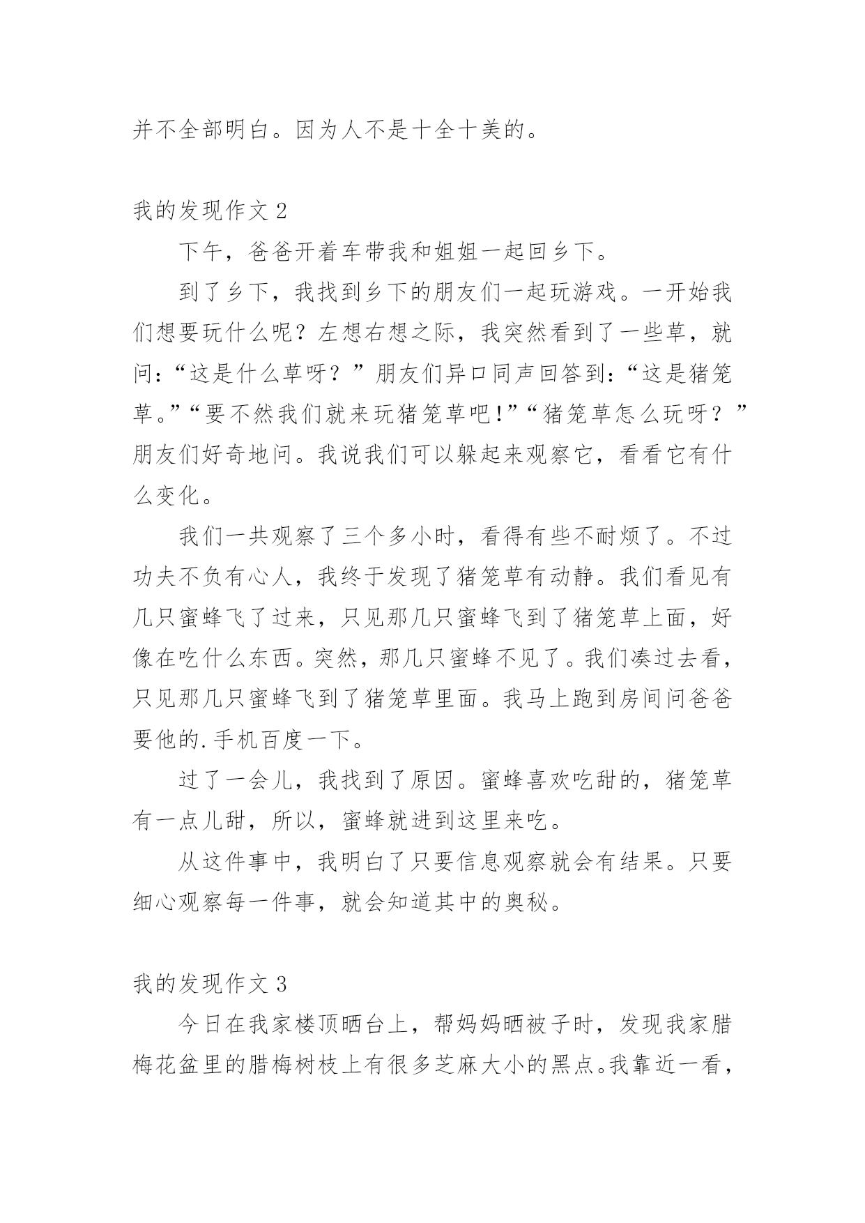 我的发现作文 我的发现作文在学习、工作或生活中,大家都经常接触到作文吧,作文一定要做到主题集中,围绕同一主题作深入阐述,切忌东拉西扯,主题涣散甚至无主题。写起作文来就毫无头绪?以下是小编精心整理的我的发现作文,希望能够帮助到大家。我的发现作文1在我欢乐的童年里,我发现过许许多多的事,尽管不是惊天动地,但我还是感到十分高兴。记得有这么一件事让我异常记忆犹新。那是一天午时放学后,同学们像往常一样走出教室,我走了一短路程后,发现前面黑乎乎的一片,走进一看,原先是一堆小蚂蚁。我刚低下头想要观察,就听见上头“啊”了一声,我吓了一大跳,急忙朝上看,原先是我的同学孙一硕,我生气地问:“你为什么大叫,不就是一堆蚂蚁嘛,有什么大惊小怪的。”“我还以为是一只大虫子哪。”“哦。”我们俩全神贯注地观察着它们。你瞧,有许多小蚂蚁故意趴在别人身上,让别人带着它走,这样就构成了一个个小黑团。孙一硕说:“你如果把头低下去,它们必须会粘在你头上。”“你说的对。”我们俩一向观察到天黑,才依依不舍地走了。从这件事中我明白了:生活中有许多的事是奇异的',这些事我们并不全部明白。因为人不是十全十美的。我的发现作文2下午,爸爸开着车带我和姐姐一起回乡下。到了乡下,我找到乡下的朋友们一起玩游戏。一开始我们想要玩什么呢?左想右想之际,我突然看到了一些草,就问:“这是什么草呀?”朋友们异口同声回答到:“这是猪笼草。”“要不然我们就来玩猪笼草吧!”“猪笼草怎么玩呀?”朋友们好奇地问。我说我们可以躲起来观察它,看看它有什么变化。我们一共观察了三个多小时,看得有些不耐烦了。不过功夫不负有心人,我终于发现了猪笼草有动静。我们看见有几只蜜蜂飞了过来,只见那几只蜜蜂飞到了猪笼草上面,好像在吃什么东西。突然,那几只蜜蜂不见了。我们凑过去看,只见那几只蜜蜂飞到了猪笼草里面。我马上跑到房间问爸爸要他的.手机百度一下。过了一会儿,我找到了原因。蜜蜂喜欢吃甜的,猪笼草有一点儿甜,所以,蜜蜂就进到这里来吃。从这件事中,我明白了只要信息观察就会有结果。只要细心观察每一件事,就会知道其中的奥秘。我的发现作文3今日在我家楼顶晒台上,帮妈妈晒被子时,发现我家腊梅花盆里的腊梅树枝上有很多芝麻大小的黑点。我靠近一看,发现那是腊梅树枝上叶子的芽。突然一阵轻风吹过,有两根细微的'树枝在风中点头,有三四片枯萎的叶子和八九朵干花在“沙沙”的作响。它们在一齐看就像是个乐队,又跳舞又唱歌。过了一会儿,风停了,我看见花盆上有许多小草,小草上有几朵雪白雪白的小花。我跑到妈妈面前问:“为什么腊梅花下头有小草和小花呢?’’妈妈说:“春天来了,那是野草和野花。’’刚说完,她伸手就把它们给拔掉了。我又问:“那为什么您要把它们拔掉呢?”妈妈说:“因为等小草长大了就会和花抢着吸收土壤里的营养,所以要把它拔掉。”原先是这样,我不仅仅发现了春天来了,还学到了一些自然小知识,可是,妈妈把小草小花给拔了我感到可惜,小草小花也很美丽。我的发现作文4有一天,我在学校里玩,无意中发现一群小孩趴在地上,聚精会神地看着什么。我因为好奇,正准备过去看个究竟,方潮等人叫我去玩,我跟他们说等一会儿,他们问我干啥去,我用手指了指那儿,他们一看也说要去看个究竟。于是,我们这个侦探小组便出发了。到了那里,我们全部惊呆了。我们发现有一个小男孩,在强烈的阳光下,拿着一个放大镜在烧一只蚂蚁。我看着那只蚂蚁被放大镜慢慢地烧死。我带着疑问回家了。我一回家就问妈妈怎样回事,蚂蚁为什么会被放大镜烧死。妈妈说:“自我先动脑筋想一想,实在想不出来再查资料。”我想了半天也不明白答案。于是,我去看《十万个为什么》,才明白原先是因为:太阳光线经过凸透镜聚焦成一点,构成很高温度,能够点燃火柴棒和薄纸等。虽然这个原理,我此刻还不是太明白,我相信等我长大后就会明白的。原先生活中到处都有科学啊!我的`发现作文5在我们学校的南北教学楼之间,有一个大花坛,里面挺立着两棵高大的松树,它们像哨兵一样,默默守护着校园。有一次上学,来早了,我便来到花坛前张开双臂拥抱了其中一棵,我的两个手臂加起来都不够环绕大树的一周。我抬头向上看发现松树的枝条像长长的手臂,伸向远方。每一根枝头上松针细而密而且颜色非常浓绿。走到树脚下,发现靠近里面的枝条上,一点儿松针都没有。心想,这是为什么呢?我往外看了看,发现阳光明媚而温暖,我又往里面仰望,发现一点阳光都没有。这时一阵春风吹过,外面的松针翩翩起舞,里面的却很难接到春风的爱抚。突然我明白了:什么植物都需要阳光和春风呵护的。低头一看,地上铺满了枯黄的松针,像一层薄薄的`凉被,铺在松树的根上,原来松树也落叶子,只不过它在小草生机勃勃的时候,在百花傲然吐芯的时候,悄悄落老叶子,同时也生出新的叶子。我们看到的是四季常青的松树,原来生命在这样偷偷的轮回。我的发现作文6一个夏天的夜晚,我躺