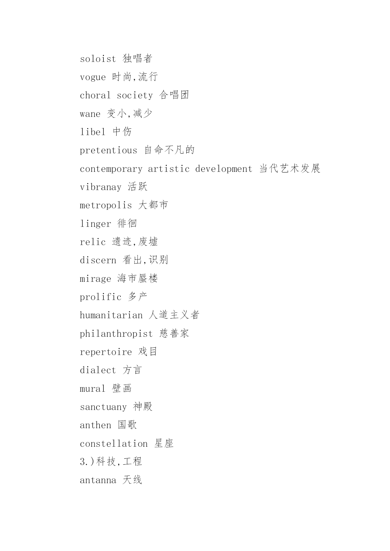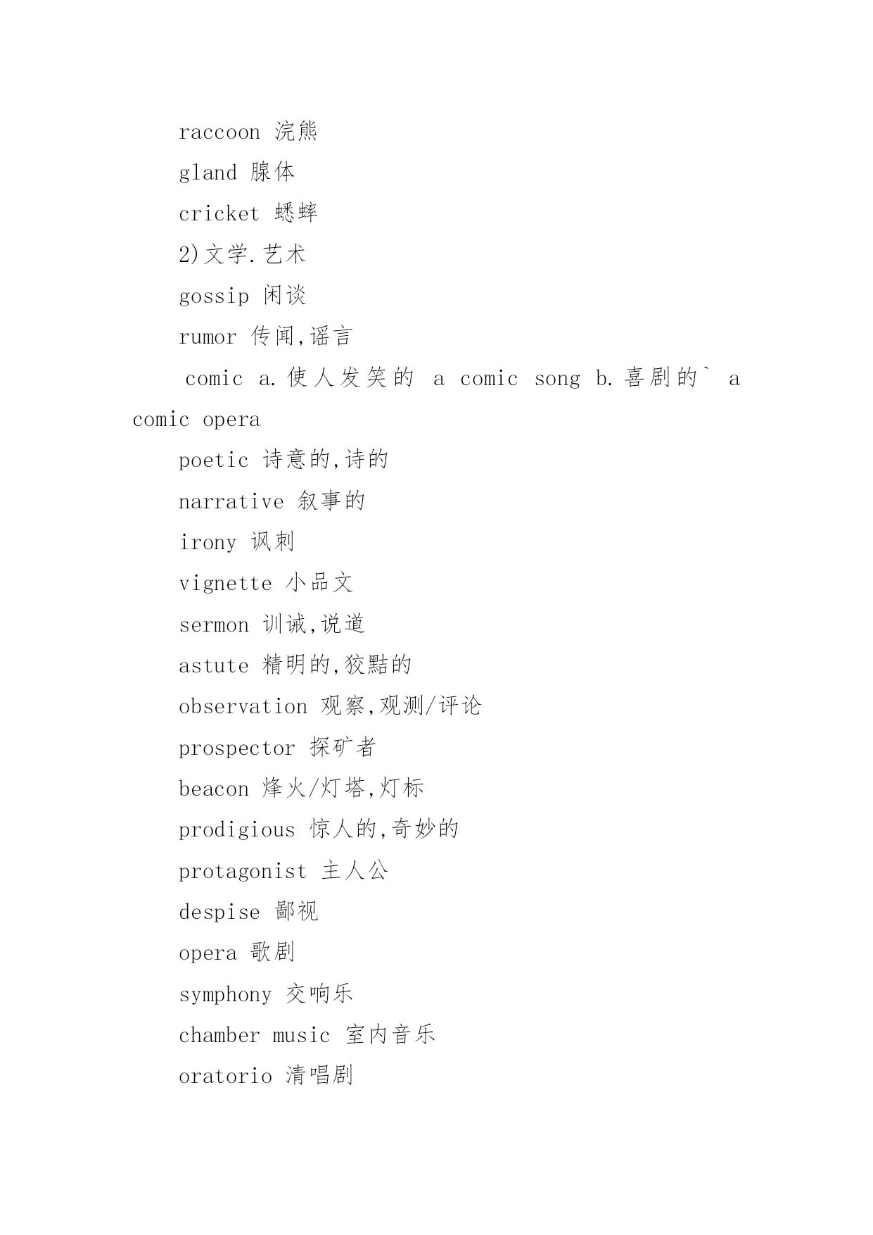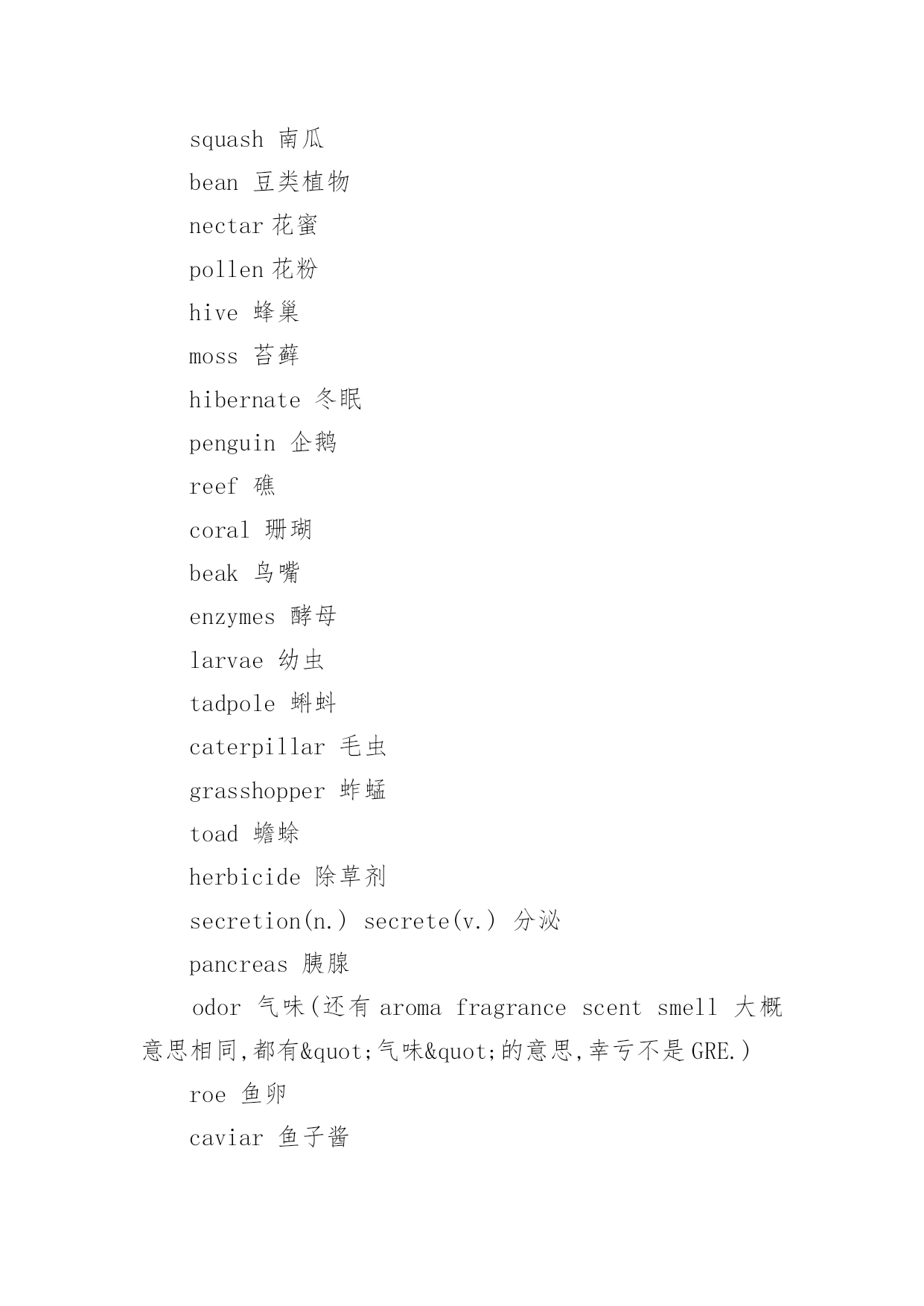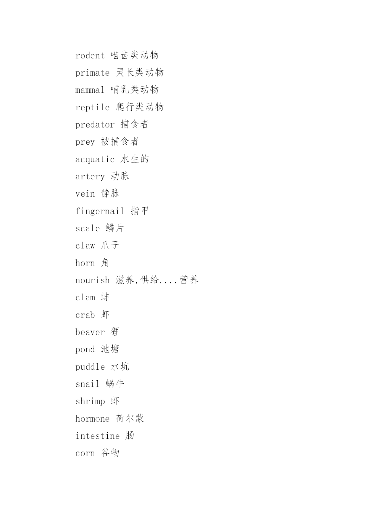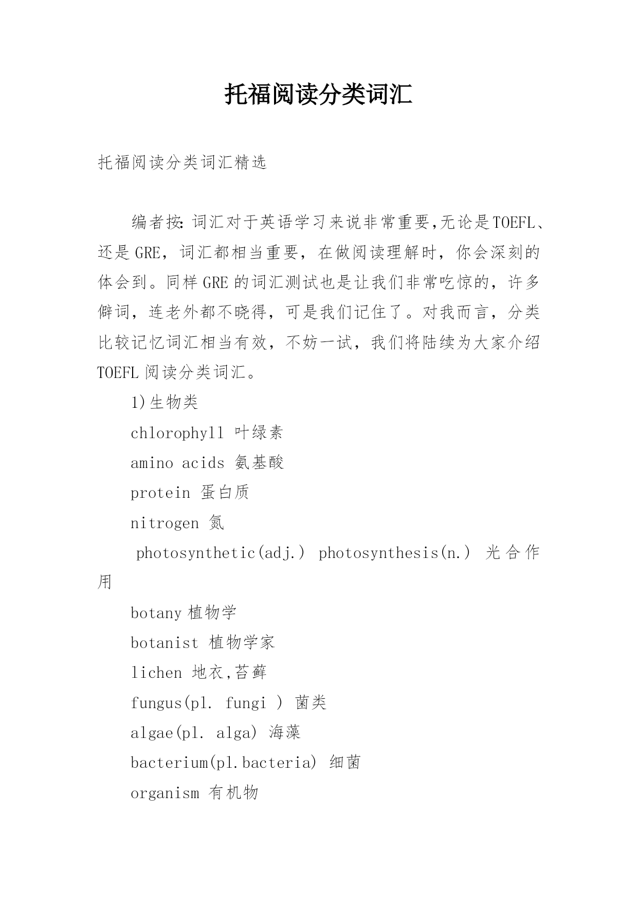 托福阅读分类词汇 托福阅读分类词汇精选编者按:词汇对于英语学习来说非常重要,无论是TOEFL、还是GRE,词汇都相当重要,在做阅读理解时,你会深刻的体会到。同样GRE的词汇测试也是让我们非常吃惊的,许多僻词,连老外都不晓得,可是我们记住了。对我而言,分类比较记忆词汇相当有效,不妨一试,我们将陆续为大家介绍TOEFL阅读分类词汇。1)生物类chlorophyll叶绿素aminoacids氨基酸protein蛋白质nitrogen氮photosynthetic(adj.)photosynthesis(n.)光合作用botany植物学botanist植物学家lichen地衣,苔藓fungus(pl.fungi)菌类algae(pl.alga)海藻bacterium(pl.bacteria)细菌organism有机物rodent啮齿类动物primate灵长类动物mammal哺乳类动物reptile爬行类动物predator捕食者prey被捕食者acquatic水生的artery动脉vein静脉fingernail指甲scale鳞片claw爪子horn角nourish滋养,供给....营养clam蚌crab虾beaver狸pond池塘puddle水坑snail蜗牛shrimp虾hormone荷尔蒙intestine肠corn谷物squash南瓜bean豆类植物nectar花蜜pollen花粉hive蜂巢moss苔藓hibernate冬眠penguin企鹅reef礁coral珊瑚beak鸟嘴enzymes酵母larvae幼虫tadpole蝌蚪caterpillar毛虫grasshopper蚱蜢toad蟾蜍herbicide除草剂secretion(n.)secrete(v.)分泌pancreas胰腺odor气味(还有aromafragrancescentsmell大概意思相同,都有"气味"的意思,幸亏不是GRE.)roe鱼卵caviar鱼子酱raccoon浣熊gland腺体cricket蟋蟀2)文学.艺术gossip闲谈rumor传闻,谣言comica.使人发笑的acomicsongb.喜剧的`acomicoperapoetic诗意的,诗的narrative叙事的irony讽刺vignette小品文sermon训诫,说道astute精明的,狡黠的observation观察,观测/评论prospector探矿者beacon烽火/灯塔,灯标prodigious惊人的,奇妙的protagonist主人公despise鄙视opera歌剧symphony交响乐chambermusic室内音乐oratorio清唱剧soloist独唱者vogue时尚,流行choralsociety合唱团wane变小,减少libel中伤pretentious自命不凡的contemporaryartisticdevelopment当代艺术发展vibranay活跃metropolis大都市linger徘徊relic遗迹,废墟discern看出,识别mirage海市蜃楼prolific多产humanitarian人道主义者philanthropist慈善家repertoire戏目dialect方言mural壁画sanctuany神殿anthen国歌constellation星座3.)科技,工程antanna天线synchronous(adj.)synchronize(v.)同步revolution革命/旋转,绕转disparage贬抑,藐视barrel桶sail帆wing翼paddle桨hoop铁环flap垂下物meteorologically气象学meteorologist气象学家precipitation降水(几种形式:rain下雨hail冰雹sleet雨夹)