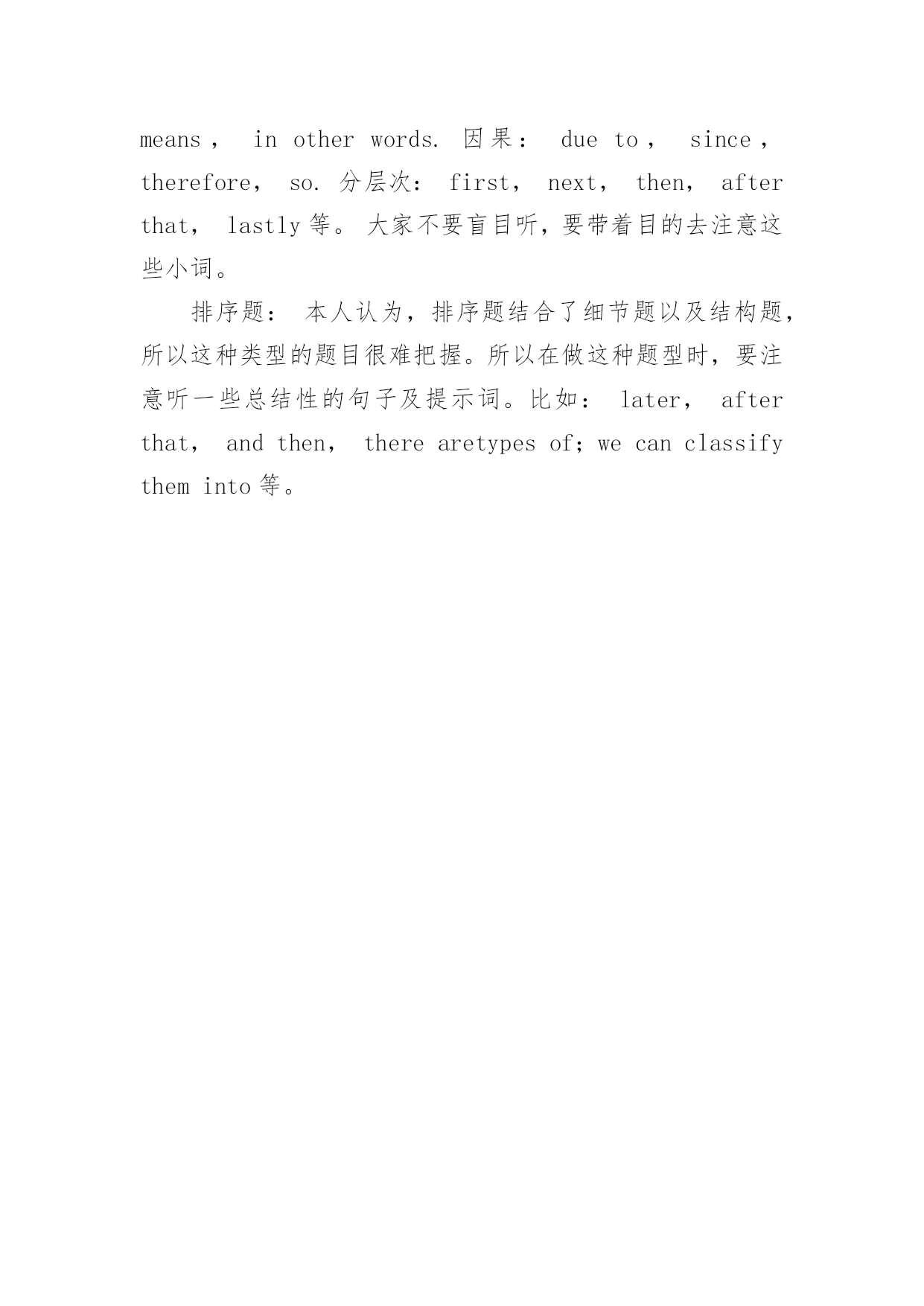 托福听力考试类型 有关托福听力考试类型托福考试可能考试最头疼的就是听力部分了。其实听力没有想象中那么难,只要方法得当就可以搞定。知己知彼才能百战。先来了解下托福考试听力的类型。主旨题:听力6道题里面第一个题就是主旨题。大部分对话和讲座在开头表明整篇材料主旨,也有的需要我们推理概括出来。这里有几个常用词组可帮大家辨别主旨。Whatwewillbediscussingontoday;whatwewillbefocusingontoday;这两句中间的discusson,focuson还有takealookat,letusdiscuss等都可帮大家推断。细节题:这类题目通常问的是细节内容的目的或原因,有的题目甚至会问有关统计的数字和年份。如:forexample;thereasonis;theproblemis;ontheotherhand;however等。细节题大多是客观性较强的问题,在答题时要排除明显的错误选项。意图、态度题:这种题型很好玩,有的.是可以根据语气的阴阳顿挫听出来的,但有的很隐秘必须要结合上下文进行判断,还有的是要根据有些词组的特定含义进行推断。结构题:结构题听清楚逻辑结构词会有利于大家更好的做好。对比、比较:but,however,nevertheless,ontheotherhand.下定义:thatis,whichis,whichmeans,inotherwords.因果:dueto,since,therefore,so.分层次:first,next,then,afterthat,lastly等。大家不要盲目听,要带着目的去注意这些小词。排序题:本人认为,排序题结合了细节题以及结构题,所以这种类型的题目很难把握。所以在做这种题型时,要注意听一些总结性的句子及提示词。比如:later,afterthat,andthen,therearetypesof;wecanclassifytheminto等。