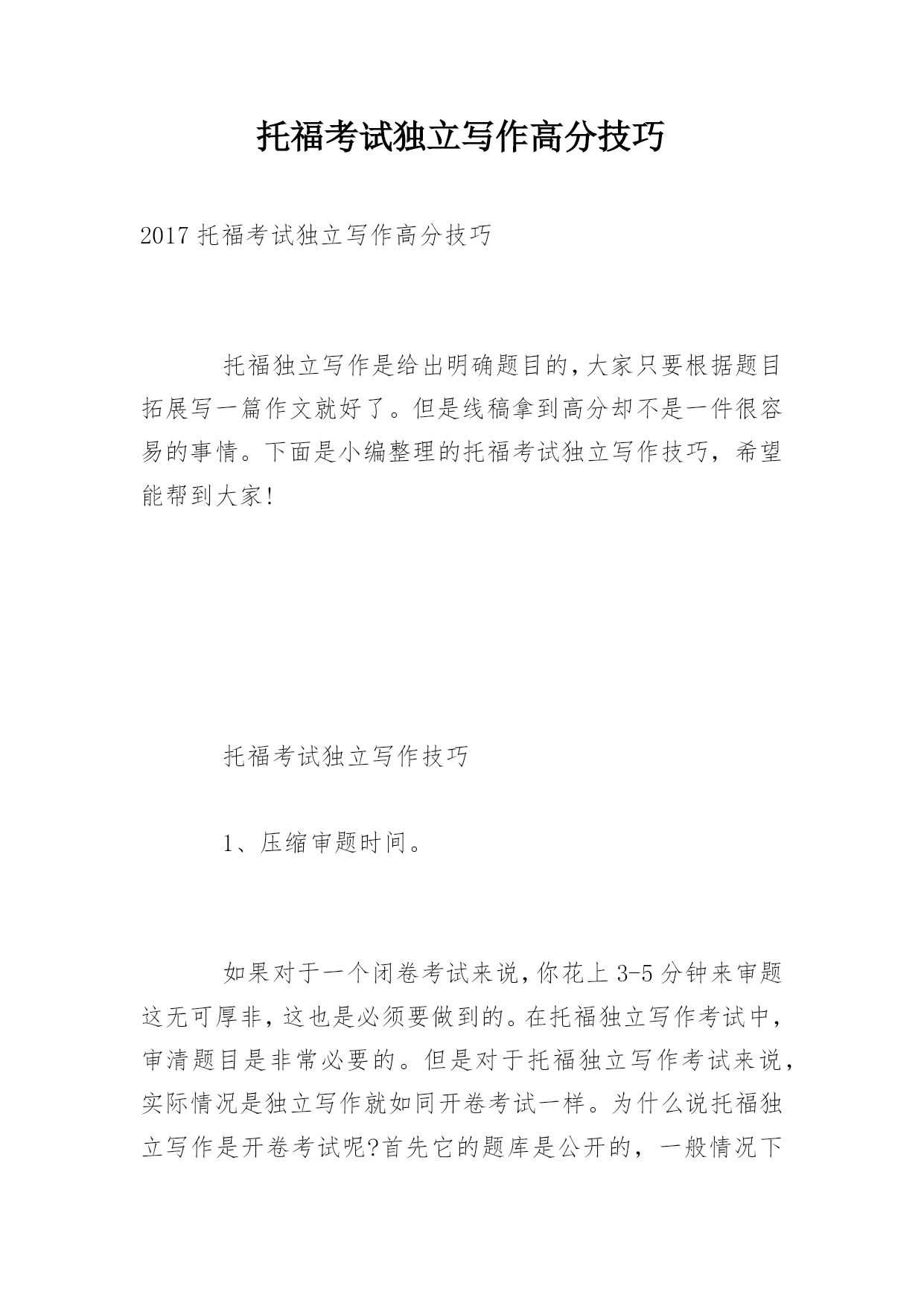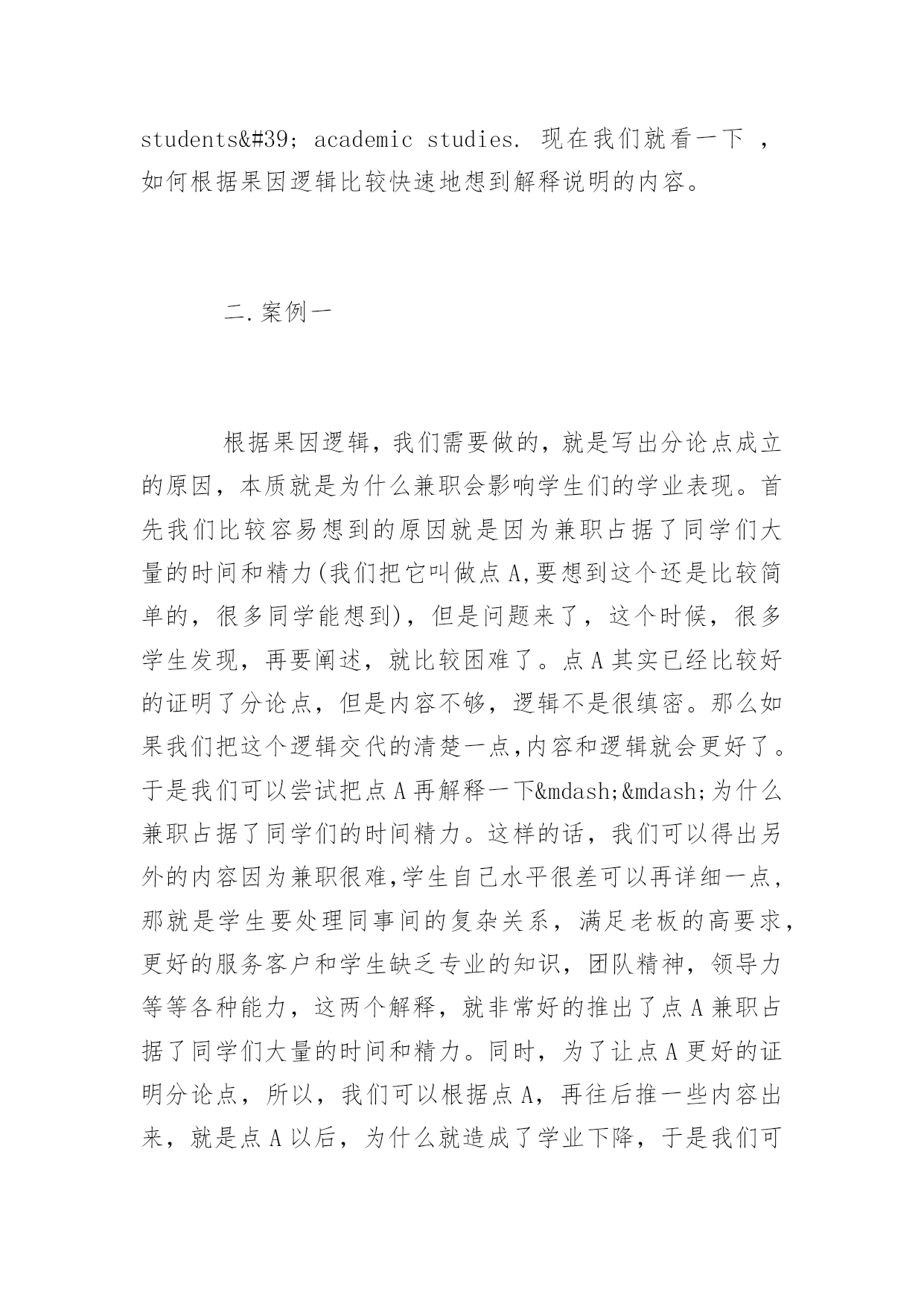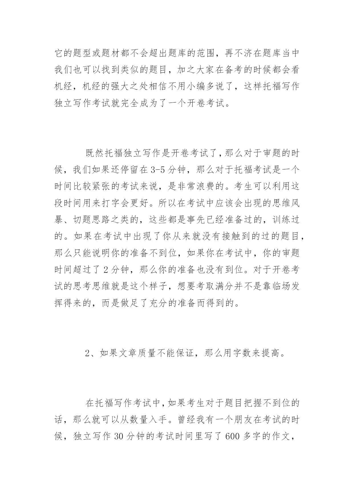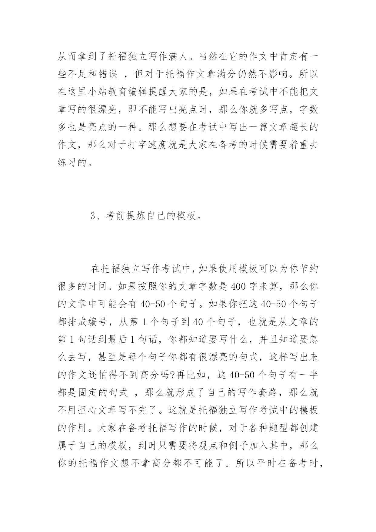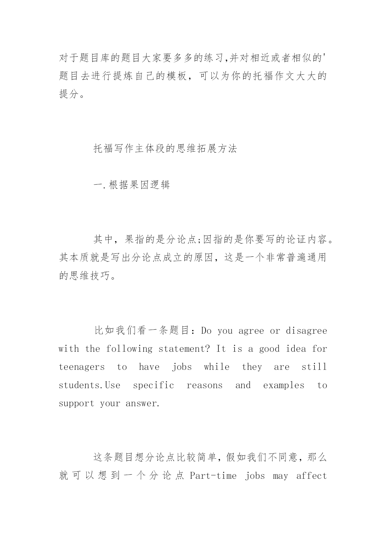 托福考试独立写作高分技巧 2017托福考试独立写作高分技巧 托福独立写作是给出明确题目的,大家只要根据题目拓展写一篇作文就好了。但是线稿拿到高分却不是一件很容易的事情。下面是小编整理的托福考试独立写作技巧,希望能帮到大家! 托福考试独立写作技巧 1、压缩审题时间。 如果对于一个闭卷考试来说,你花上3-5分钟来审题这无可厚非,这也是必须要做到的。在托福独立写作考试中,审清题目是非常必要的。但是对于托福独立写作考试来说,实际情况是独立写作就如同开卷考试一样。为什么说托福独立写作是开卷考试呢?首先它的题库是公开的,一般情况下它的题型或题材都不会超出题库的范围,再不济在题库当中我们也可以找到类似的题目,加之大家在备考的时候都会看机经,机经的强大之处相信不用小编多说了,这样托福写作独立写作考试就完全成为了一个开卷考试。 既然托福独立写作是开卷考试了,那么对于审题的时候,我们如果还停留在3-5分钟,那么对于托福考试是一个时间比较紧张的考试来说,是非常浪费的。考生可以利用这段时间用来打字会更好。所以在考试中应该会出现的思维风暴、切题思路之类的,这些都是事先已经准备过的,训练过的。如果在考试中出现了你从来就没有接触到的过的题目,那么只能说明你的准备不到位,如果你在考试中,你的审题时间超过了2分钟,那么你的准备也没有到位。对于开卷考试的思考思维就是这个样子,想要考取满分并不是靠临场发挥得来的,而是做足了充分的准备而得到的。 2、如果文章质量不能保证,那么用字数来提高。 在托福写作考试中,如果考生对于题目把握不到位的话,那么就可以从数量入手。曾经我有一个朋友在考试的时候,独立写作30分钟的考试时间里写了600多字的作文,从而拿到了托福独立写作满人。当然在它的作文中肯定有一些不足和错误,但对于托福作文拿满分仍然不影响。所以在这里小站教育编辑提醒大家的是,如果在考试中不能把文章写的很漂亮,即不能写出亮点时,那么你就多写点,字数多也是亮点的一种。那么想要在考试中写出一篇文章超长的作文,那么对于打字速度就是大家在备考的时候需要着重去练习的。 3、考前提炼自己的模板。 在托福独立写作考试中,如果使用模板可以为你节约很多的时间。如果按照你的文章字数是400字来算,那么你的文章中可能会有40-50个句子。如果你把这40-50个句子都排成编号,从第1个句子到40个句子,也就是从文章的第1句话到最后1句话,你都知道要写什么,并且知道要怎么去写,甚至是每个句子你都有很漂亮的句式,这样写出来的作文还怕得不到高分吗?再比如,这40-50个句子有一半都是固定的句式,那么就形成了自己的写作套路,那么就不用担心文章写不完了。这就是托福独立写作考试中的模板的作用。大家在备考托福写作的时候,对于各种题型都创建属于自己的模板,到时只需要将观点和例子加入其中,那么你的托福作文想不拿高分都不可能了。所以平时在备考时,对于题目库的题目大家要多多的练习,并对相近或者相似的'题目去进行提炼自己的模板,可以为你的托福作文大大的提分。 托福写作主体段的思维拓展方法 一.根据果因逻辑 其中,果指的是分论点;因指的是你要写的论证内容。其本质就是写出分论点成立的原因,这是一个非常普遍通用的思维技巧。 比如我们看一条题目:Doyouagreeordisagreewiththefollowingstatement?Itisagoodideaforteenagerstohavejobswhiletheyarestillstudents.Usespecificreasonsandexamplestosupportyouranswer. 这条题目想分论点比较简单,假如我们不同意,那么就可以想到一个分论点Part-timejobsmayaffectstudents'academicstudies.现在我们就看一下,如何根据果因逻辑比较快速地想到解释说明的内容。 二.案例一 根据果因逻辑,我们需要做的,就是写出分论点成立的原因,本质就是为什么兼职会影响学生们的学业表现。首先我们比较容易想到的原因就是因为兼职占据了同学们大量的时间和精力(我们把它叫做点A,要想到这个还是比较简单的,很多同学能想到),但是问题来了,这个时候,很多学生发现,再要阐述,就比较困难了。点A其实已经比较好的证明了分论点,但是内容不够,逻辑不是很缜密。那么如果我们把这个逻辑交代的清楚一点,内容和逻辑就会更好了。于是我们可以尝试把点A再解释一下——为什么兼职占据了同学们的时间精力。这样的话,我们可以得出另外的内容因为兼职很难,学生自己水平很差可以再详细一点,那就是学生要处理同事间的复杂关系,满足老板的高要求,更好的服务客户和学生缺乏专业的知识,团队精神,领导力等等各种能力,这两个解释,就非常好的推出了点A兼职占据
