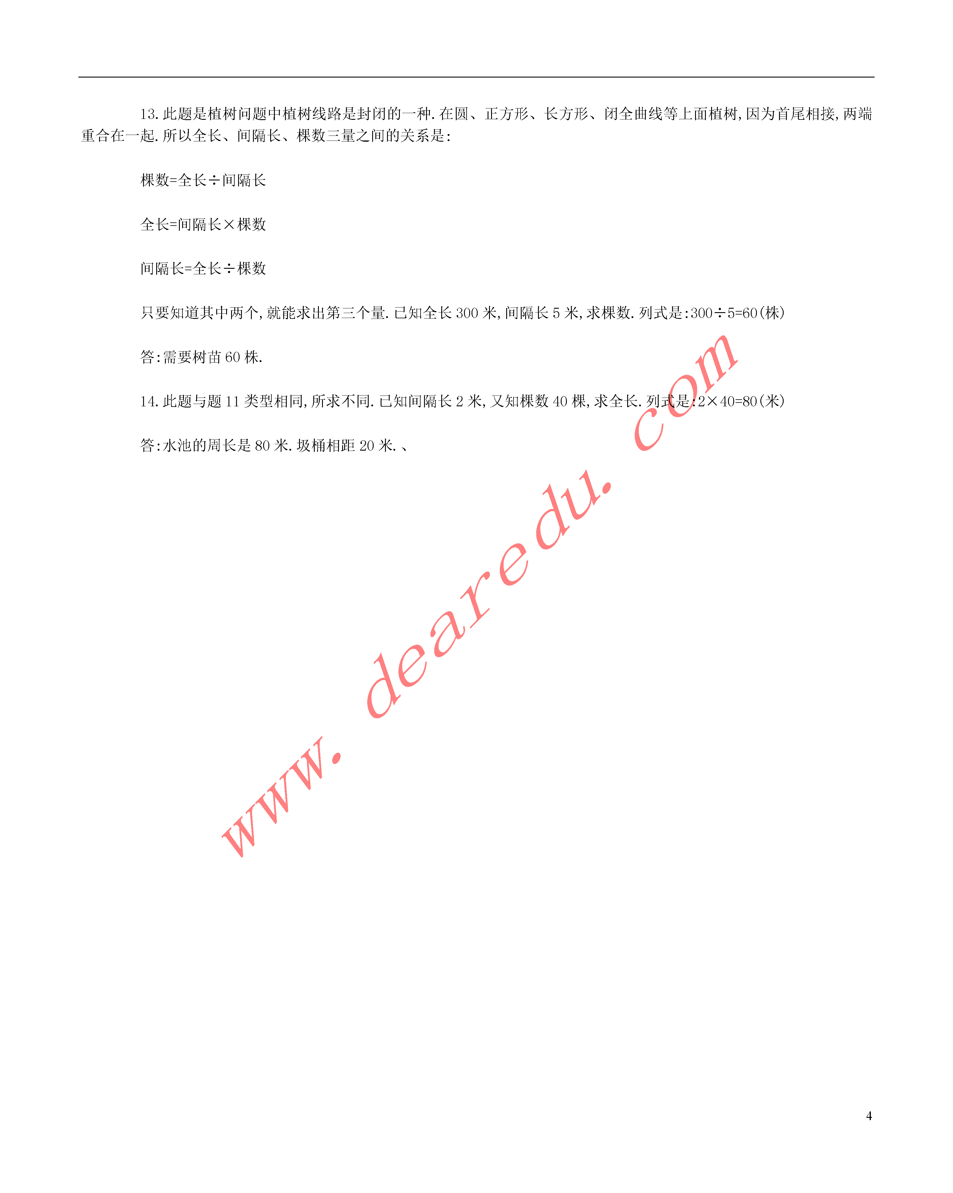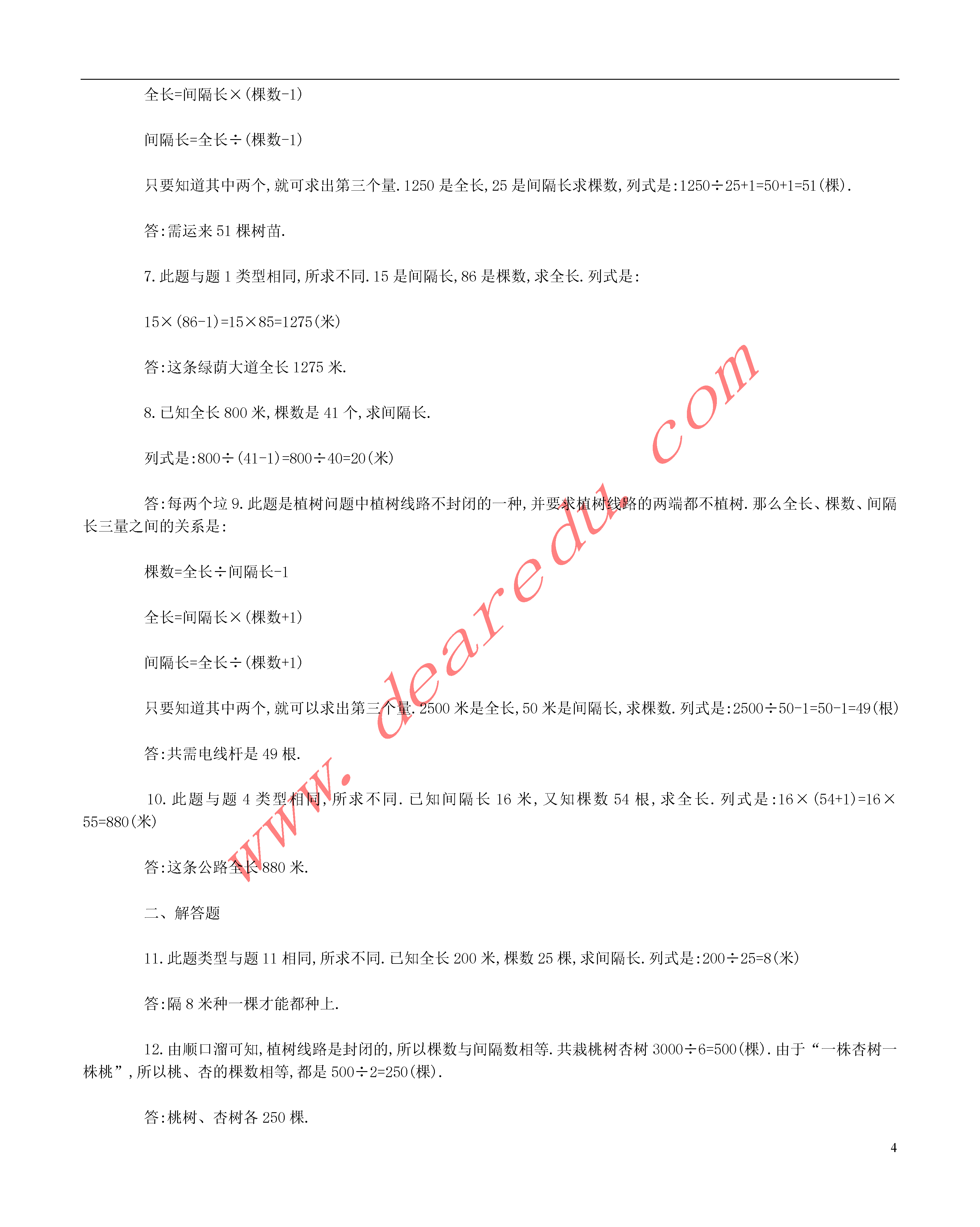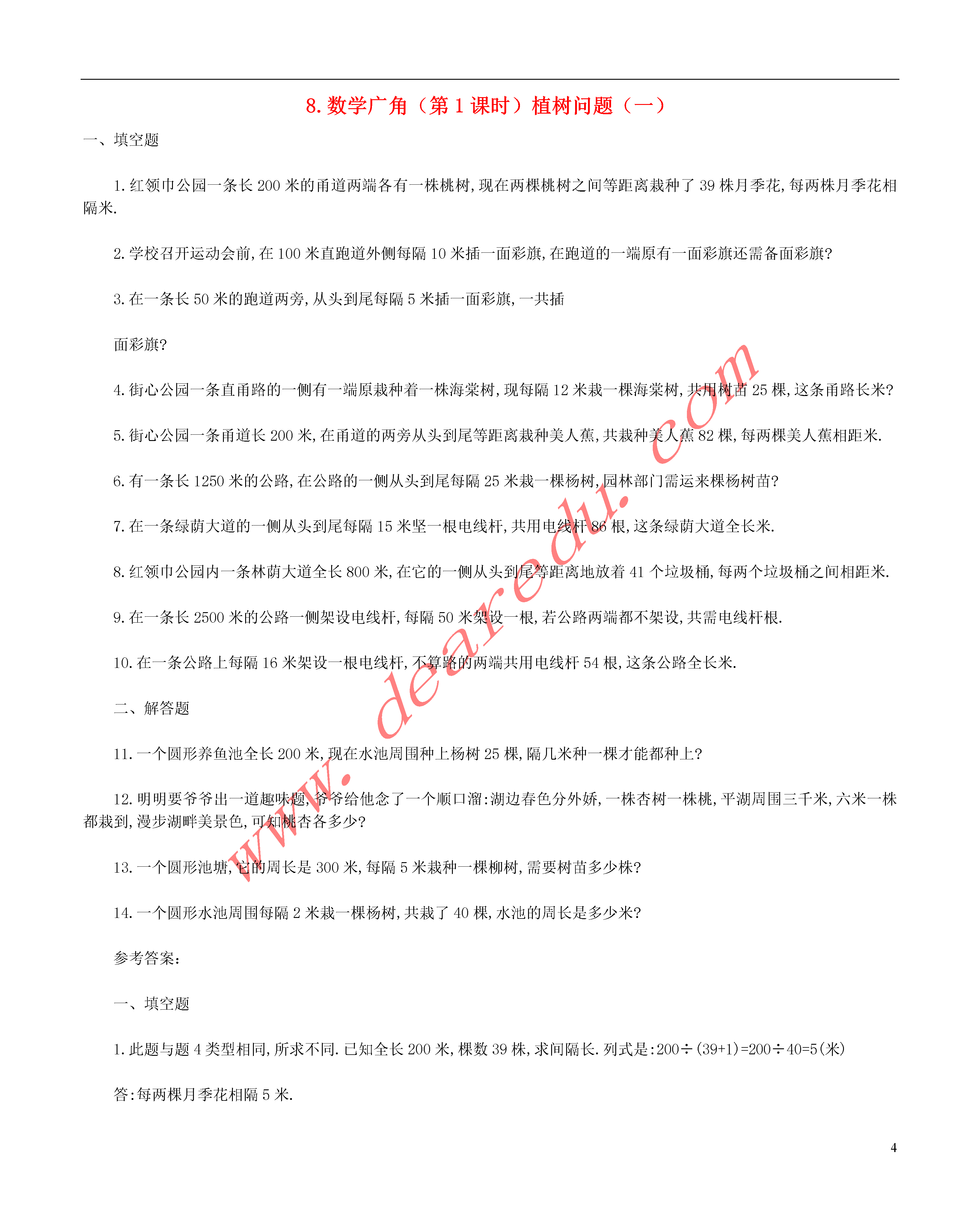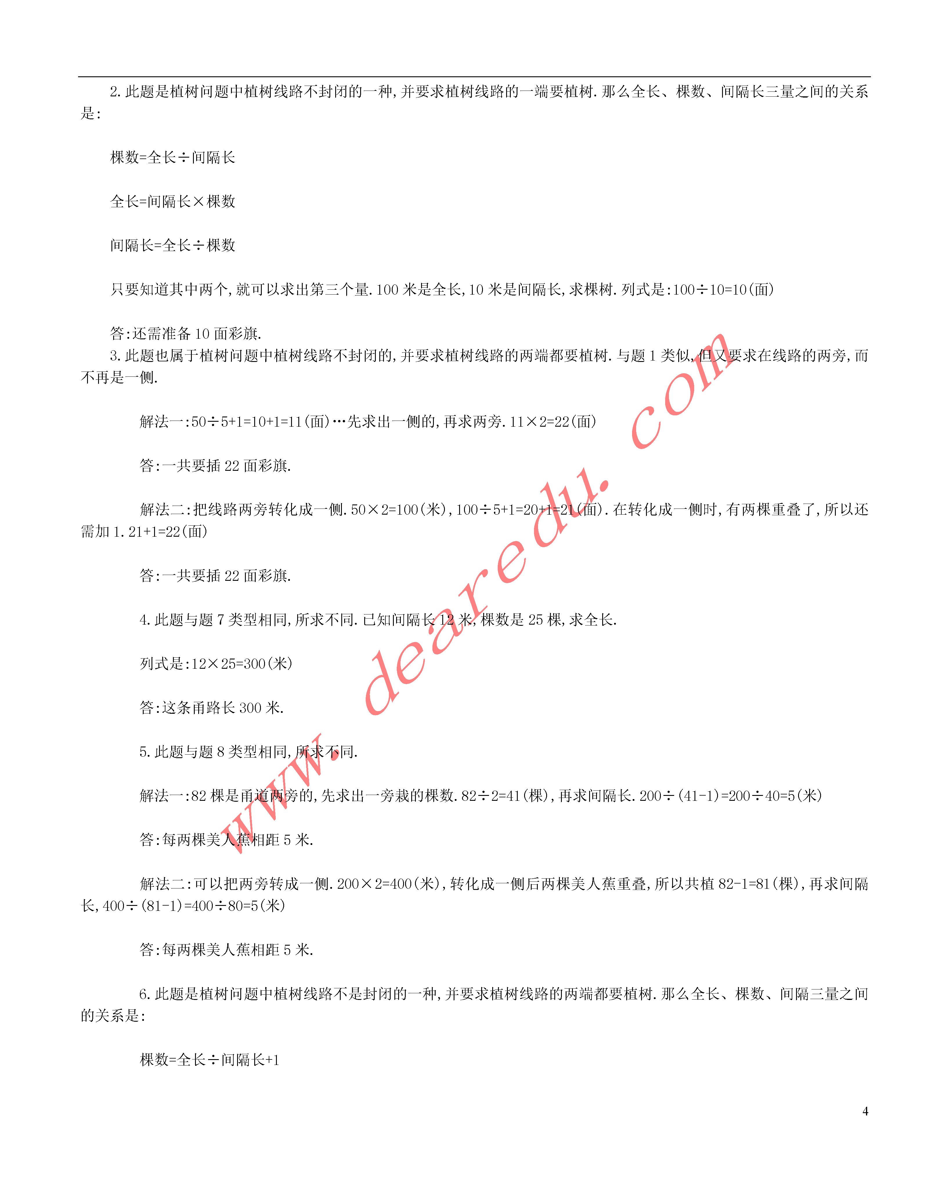 48.数学广角(第1课时)植树问题(一)一、填空题1.红领巾公园一条长200米的甬道两端各有一株桃树,现在两棵桃树之间等距离栽种了39株月季花,每两株月季花相隔米.2.学校召开运动会前,在100米直跑道外侧每隔10米插一面彩旗,在跑道的一端原有一面彩旗还需备面彩旗?3.在一条长50米的跑道两旁,从头到尾每隔5米插一面彩旗,一共插面彩旗?4.街心公园一条直甬路的一侧有一端原栽种着一株海棠树,现每隔12米栽一棵海棠树,共用树苗25棵,这条甬路长米?5.街心公园一条甬道长200米,在甬道的两旁从头到尾等距离栽种美人蕉,共栽种美人蕉82棵,每两棵美人蕉相距米.6.有一条长1250米的公路,在公路的一侧从头到尾每隔25米栽一棵杨树,园林部门需运来棵杨树苗?7.在一条绿荫大道的一侧从头到尾每隔15米坚一根电线杆,共用电线杆86根,这条绿荫大道全长米.8.红领巾公园内一条林荫大道全长800米,在它的一侧从头到尾等距离地放着41个垃圾桶,每两个垃圾桶之间相距米.9.在一条长2500米的公路一侧架设电线杆,每隔50米架设一根,若公路两端都不架设,共需电线杆根.10.在一条公路上每隔16米架设一根电线杆,不算路的两端共用电线杆54根,这条公路全长米.二、解答题11.一个圆形养鱼池全长200米,现在水池周围种上杨树25棵,隔几米种一棵才能都种上?12.明明要爷爷出一道趣味题,爷爷给他念了一个顺口溜:湖边春色分外娇,一株杏树一株桃,平湖周围三千米,六米一株都栽到,漫步湖畔美景色,可知桃杏各多少?13.一个圆形池塘,它的周长是300米,每隔5米栽种一棵柳树,需要树苗多少株?14.一个圆形水池周围每隔2米栽一棵杨树,共栽了40棵,水池的周长是多少米?参考答案:一、填空题1.此题与题4类型相同,所求不同.已知全长200米,棵数39株,求间隔长.列式是:200÷(39+1)=200÷40=5(米)答:每两棵月季花相隔5米.2.此题是植树问题中植树线路不封闭的一种,并要求植树线路的一端要植树.那么全长、棵数、间隔长三量之间的关系是:棵数=全长÷间隔长全长=间隔长×棵数间隔长=全长÷棵数只要知道其中两个,就可以求出第三个量.100米是全长,10米是间隔长,求棵树.列式是:100÷10=10(面)答:还需准备10面彩旗.3.此题也属于植树问题中植树线路不封闭的,并要求植树线路的两端都要植树.与题1类似,但又要求在线路的两旁,而不再是一侧.解法一:50÷5+1=10+1=11(面)…先求出一侧的,再求两旁.11×2=22(面)答:一共要插22面彩旗.解法二:把线路两旁转化成一侧.50×2=100(米),100÷5+1=20+1=21(面).在转化成一侧时,有两棵重叠了,所以还需加1.21+1=22(面)答:一共要插22面彩旗.4.此题与题7类型相同,所求不同.已知间隔长12米,棵数是25棵,求全长.列式是:12×25=300(米)答:这条甬路长300米.5.此题与题8类型相同,所求不同.解法一:82棵是甬道两旁的,先求出一旁栽的棵数.82÷2=41(棵),再求间隔长.200÷(41-1)=200÷40=5(米)答:每两棵美人蕉相距5米.解法二:可以把两旁转成一侧.200×2=400(米),转化成一侧后两棵美人蕉重叠,所以共植82-1=81(棵),再求间隔长,400÷(81-1)=400÷80=5(米)答:每两棵美人蕉相距5米.6.此题是植树问题中植树线路不是封闭的一种,并要求植树线路的两端都要植树.那么全长、棵数、间隔三量之间的关系是:棵数=全长÷间隔长+1全长=间隔长×(棵数-1)间隔长=全长÷(棵数-1)只要知道其中两个,就可求出第三个量.1250是全长,25是间隔长求棵数,列式是:1250÷25+1=50+1=51(棵).答:需运来51棵树苗.7.此题与题1类型相同,所求不同.15是间隔长,86是棵数,求全长.列式是:15×(86-1)=15×85=1275(米)答:这条绿荫大道全长1275米.8.已知全长800米,棵数是41个,求间隔长.列式是:800÷(41-1)=800÷40=20(米)答:每两个垃9.此题是植树问题中植树线路不封闭的一种,并要求植树线路的两端都不植树.那么全长、棵数、间隔长三量之间的关系是:棵数=全长÷间隔长-1全长=间隔长×(棵数+1)间隔长=全长÷(棵数+1)只要知道其中两个,就可以求出第三个量.2500米是全长,50米是间隔长,求棵数.列式是:2500÷50-1=50-1=49(根)答:共需电线杆是4