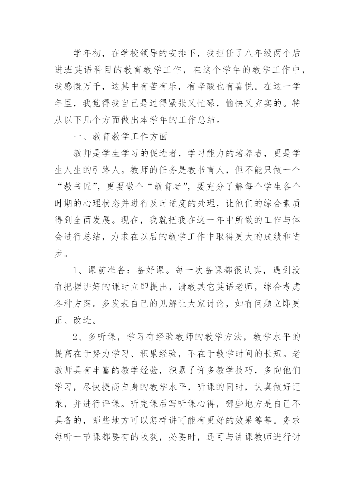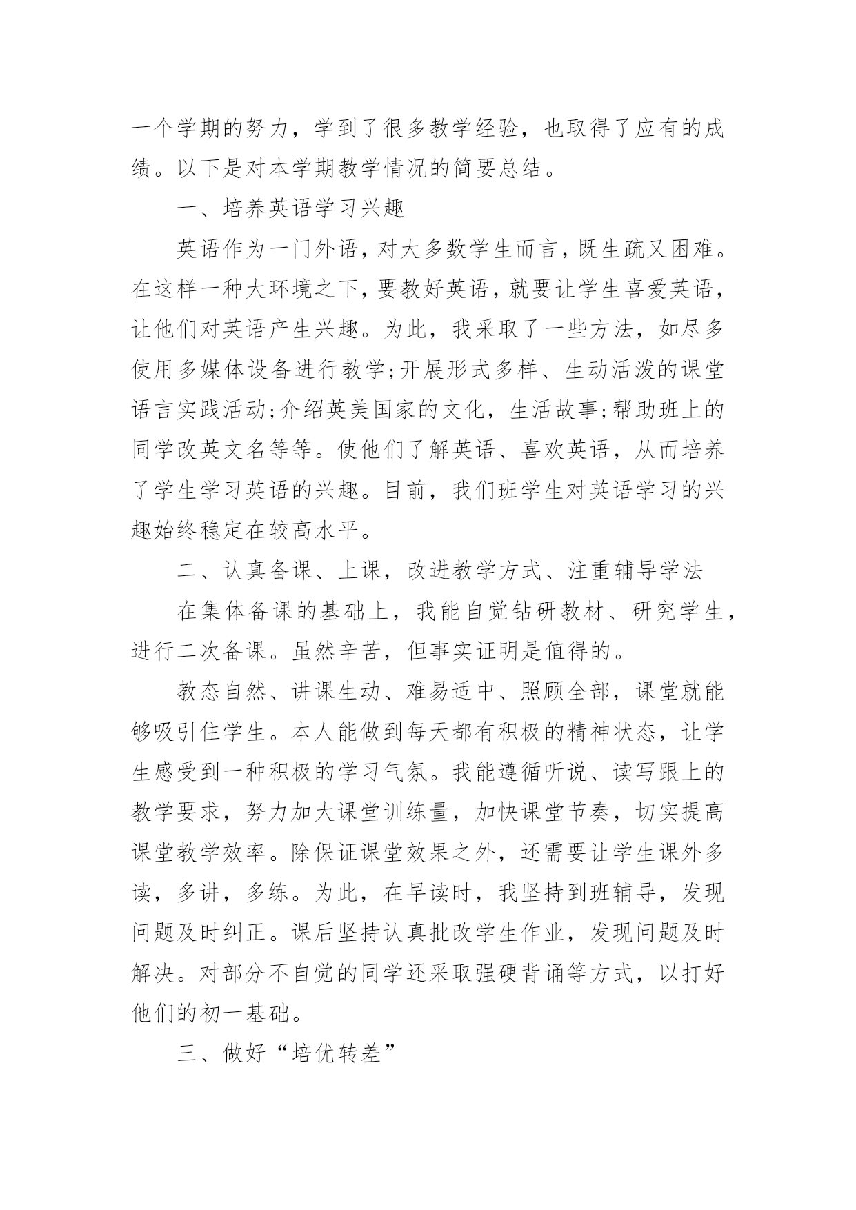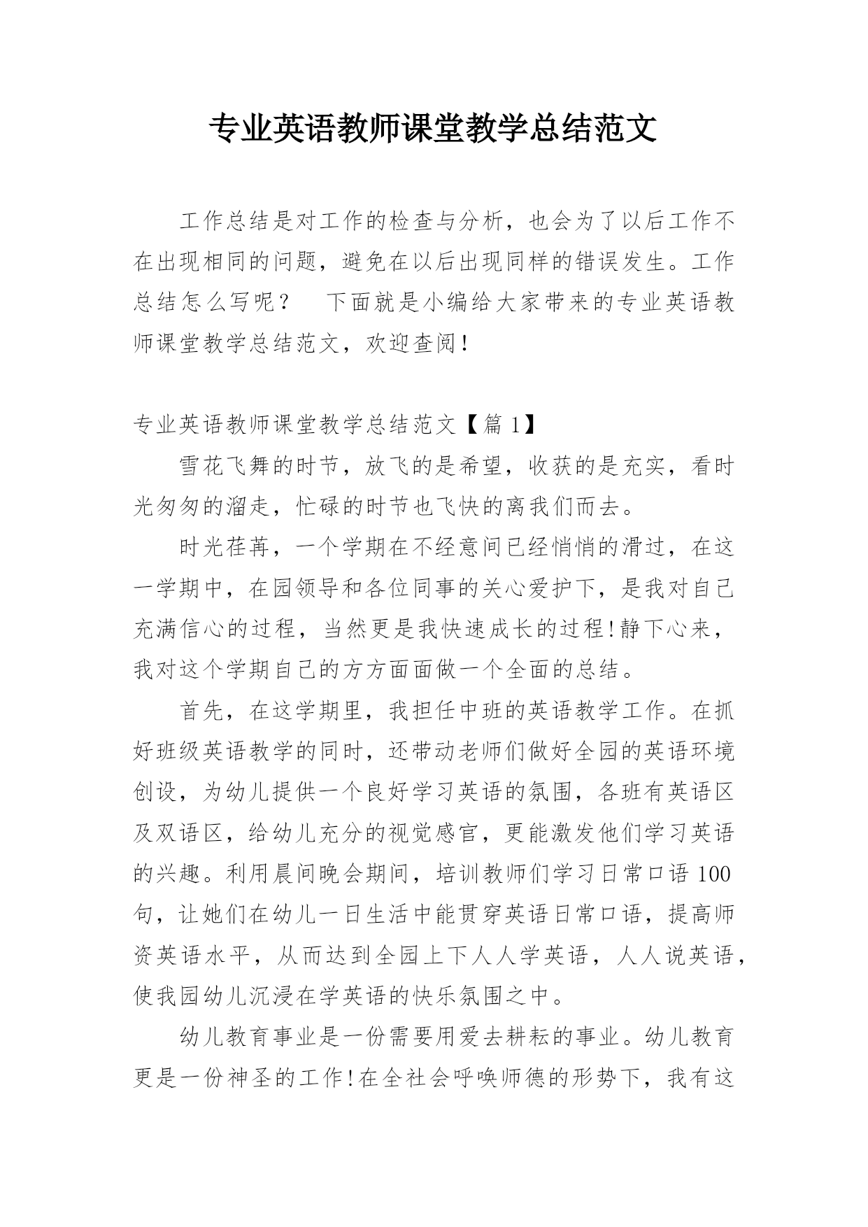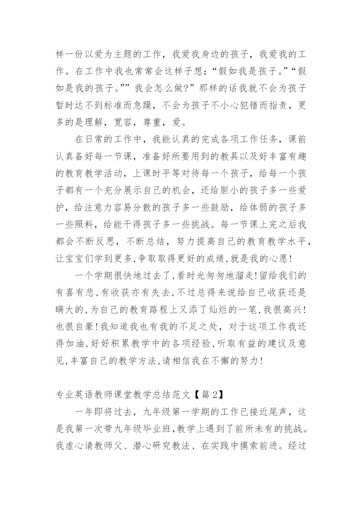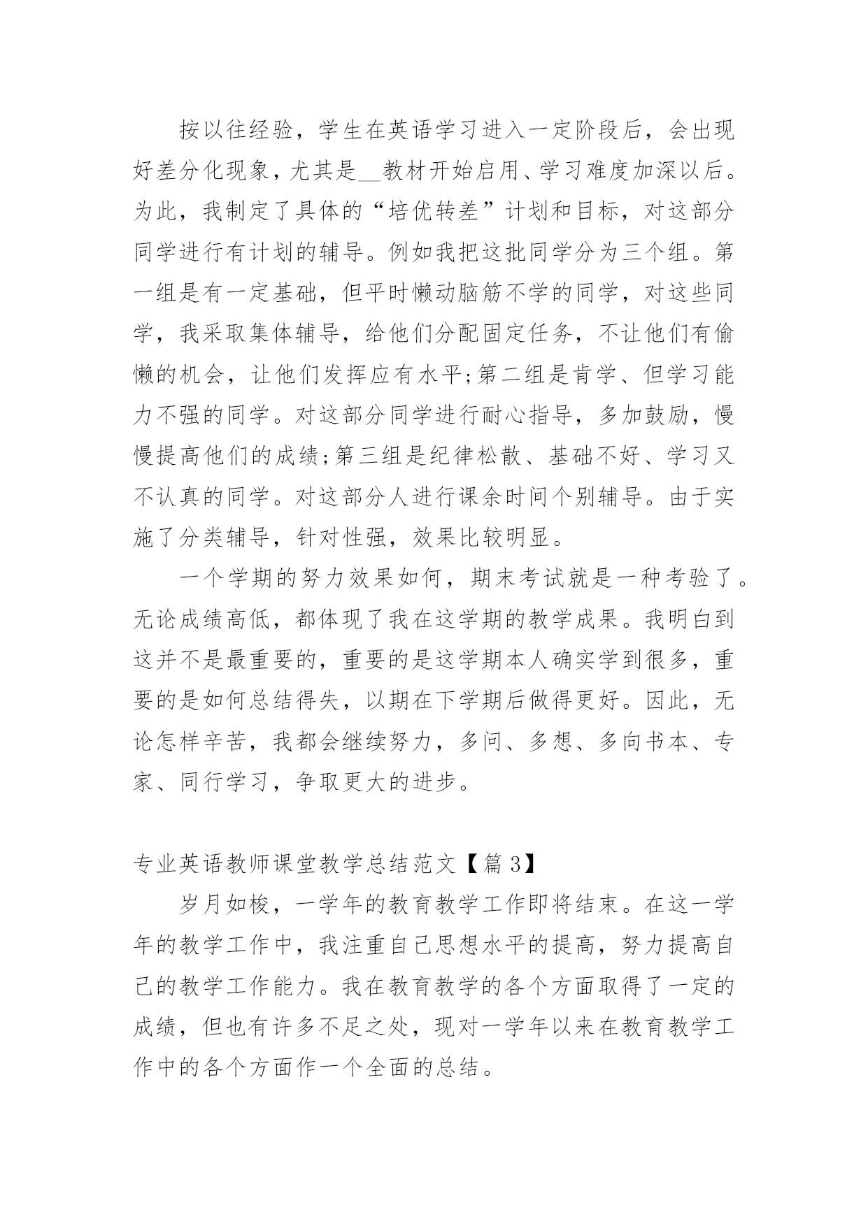 专业英语教师课堂教学总结范文 工作总结是对工作的检查与分析,也会为了以后工作不在出现相同的问题,避免在以后出现同样的错误发生。工作总结怎么写呢?下面就是小编给大家带来的专业英语教师课堂教学总结范文,欢迎查阅!专业英语教师课堂教学总结范文【篇1】雪花飞舞的时节,放飞的是希望,收获的是充实,看时光匆匆的溜走,忙碌的时节也飞快的离我们而去。时光荏苒,一个学期在不经意间已经悄悄的滑过,在这一学期中,在园领导和各位同事的关心爱护下,是我对自己充满信心的过程,当然更是我快速成长的过程!静下心来,我对这个学期自己的方方面面做一个全面的总结。首先,在这学期里,我担任中班的英语教学工作。在抓好班级英语教学的同时,还带动老师们做好全园的英语环境创设,为幼儿提供一个良好学习英语的氛围,各班有英语区及双语区,给幼儿充分的视觉感官,更能激发他们学习英语的兴趣。利用晨间晚会期间,培训教师们学习日常口语100句,让她们在幼儿一日生活中能贯穿英语日常口语,提高师资英语水平,从而达到全园上下人人学英语,人人说英语,使我园幼儿沉浸在学英语的快乐氛围之中。幼儿教育事业是一份需要用爱去耕耘的事业。幼儿教育更是一份神圣的工作!在全社会呼唤师德的形势下,我有这样一份以爱为主题的工作,我爱我身边的孩子,我爱我的工作。在工作中我也常常会这样子想:“假如我是孩子。”“假如是我的孩子。””我会怎么做?”那样的话我就不会为孩子暂时达不到标准而急躁,不会为孩子不小心犯错而指责,更多的是理解,宽容,尊重,爱。在日常的工作中,我能认真的完成各项工作任务,课前认真备好每一节课,准备好所要用到的教具以及好丰富有趣的教育教学活动,上课时平等对待每一个孩子,给每一个孩子都有一个充分展示自己的机会,还给胆小的孩子多一些爱护,给注意力容易分散的孩子多一些鼓励,给体弱的孩子多一些照料,给能干得孩子多一些挑战。每一节课上完之后我都会不断反思,不断总结,努力提高自己的教育教学水平,让宝宝们学到更多,争取取得更好的成绩,就是我的心愿!一个学期很快地过去了,看时光匆匆地溜走!留给我们的有喜有悲,有收获亦有失去,不过总得来说给自己收获还是瞒大的,为自己的教育路程上又添了灿烂的一笔,我很高兴!也很自豪!我知道我也有我的不足之处,对于这项工作我还得加油,好好积累教学中的各项经验,听取有益的建议及意见,丰富自己的教学方法,请相信我在不懈的努力!专业英语教师课堂教学总结范文【篇2】一年即将过去,九年级第一学期的工作已接近尾声,这是我第一次带九年级毕业班,教学上遇到了前所未有的挑战。我虚心请教师父、潜心研究教法、在实践中摸索前进。经过一个学期的努力,学到了很多教学经验,也取得了应有的成绩。以下是对本学期教学情况的简要总结。一、培养英语学习兴趣英语作为一门外语,对大多数学生而言,既生疏又困难。在这样一种大环境之下,要教好英语,就要让学生喜爱英语,让他们对英语产生兴趣。为此,我采取了一些方法,如尽多使用多媒体设备进行教学;开展形式多样、生动活泼的课堂语言实践活动;介绍英美国家的文化,生活故事;帮助班上的同学改英文名等等。使他们了解英语、喜欢英语,从而培养了学生学习英语的兴趣。目前,我们班学生对英语学习的兴趣始终稳定在较高水平。二、认真备课、上课,改进教学方式、注重辅导学法在集体备课的基础上,我能自觉钻研教材、研究学生,进行二次备课。虽然辛苦,但事实证明是值得的。教态自然、讲课生动、难易适中、照顾全部,课堂就能够吸引住学生。本人能做到每天都有积极的精神状态,让学生感受到一种积极的学习气氛。我能遵循听说、读写跟上的教学要求,努力加大课堂训练量,加快课堂节奏,切实提高课堂教学效率。除保证课堂效果之外,还需要让学生课外多读,多讲,多练。为此,在早读时,我坚持到班辅导,发现问题及时纠正。课后坚持认真批改学生作业,发现问题及时解决。对部分不自觉的同学还采取强硬背诵等方式,以打好他们的初一基础。三、做好“培优转差”按以往经验,学生在英语学习进入一定阶段后,会出现好差分化现象,尤其是__教材开始启用、学习难度加深以后。为此,我制定了具体的“培优转差”计划和目标,对这部分同学进行有计划的辅导。例如我把这批同学分为三个组。第一组是有一定基础,但平时懒动脑筋不学的同学,对这些同学,我采取集体辅导,给他们分配固定任务,不让他们有偷懒的机会,让他们发挥应有水平;第二组是肯学、但学习能力不强的同学。对这部分同学进行耐心指导,多加鼓励,慢慢提高他们的成绩;第三组是纪律松散、基础不好、学习又不认真的同学。对这部分人进行课余时间个别辅导。由于实施了分类辅导,针对性强,效果比较明显。一个学期的努力效果如何,期末考试就是一种考验了。无论成绩高低,都体现了我在这学期的教学成果。我明白到这并不是最重要的,重要的是这学期本人确实学到很多,重要的是如何总结得失,以期