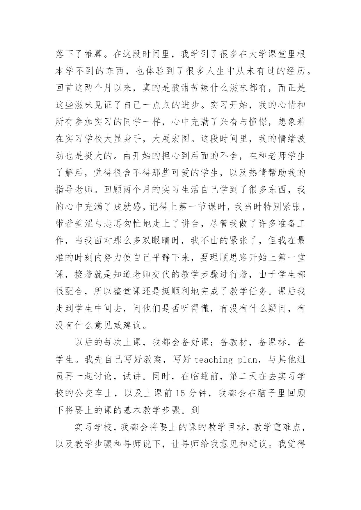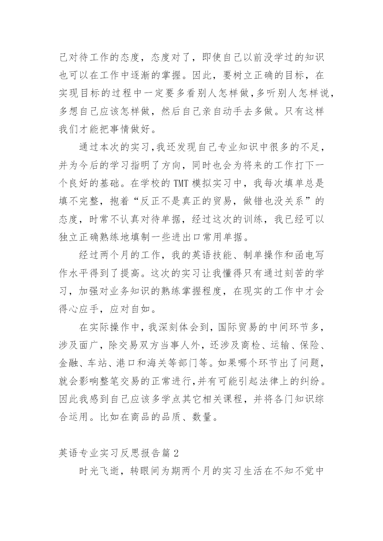 英语专业实习反思报告 英语专业实习反思报告(精选9篇)报告的字体格式应当简洁明了,比较正式,但又不失其灵活性。写好英语专业实习反思报告是有技巧的,接下来给大家分享英语专业实习反思报告,方便大家学习。英语专业实习反思报告篇1时间过的飞快,为期一个月的实习结束了,在这段时间里,实习充实了我的学习生活,我学到了许多书本上无法体验的知识。通过实习,我感触颇多,得到许多新的认识,对许多问题多了深一层次的思考。回想起这两个月的生活,一个人在新的环境里,应付新的人际关系,本来就是挺辛苦的事,再加上工作的繁忙和紧张的生活节奏,这两个月来真可以用艰辛来形容了。还好这一切我都挺了过来,相反这些困难让我更加的了解自己、坚定信心,也让我从中得到了深刻的认识。以后我就是社会上的一份子了,责任也将越来越重。实习,顾名思义,在实践中学习。在经过一段时间的学习之后,或者说当学习告一段落的时候,我们需要了解,自己的所学需要或应当如何应用在实践之中,因为任何知识都源于实践,归于实践,所以,要将所学付诸实践,来检验所学。然而,我们当然不希望实习仅止于此,那就太狭隘了。(实习单位简介)我的实习,其实是工作。在这两个月中,有太多太多的感触,一时竟不知道从何说起。在此次实习中,我感悟颇多:(1)坚持学以致用我的工作是在公司的商务部见习外贸业务。外贸业务员,算是与专业对口工作的不二选择了,而且我们曾于大三进行过TMT模拟实习,对外贸流程有一定的了解。然而经过在商务部一段时间的工作,我渐渐明白有时实际要比理论简单直接的多,但大多数情况下实际操作还是比理论要复杂、间接,通常是我在别人的实际操作中领会到了自己所学理论的重点及要旨。值得庆幸的是在两个月的时间里,公司的同事领导给予了我热情的指导和帮助,而我也虚心向他们请教学习,在理论运用于实践的同时,也在实践中更加深刻地理解了以前没有理解透彻的知识。(2)加强英语及专业知识的学习对于外贸人员而言,不仅要掌握够硬的专业知识,而且还必须会用英语与外商交流、谈判及写传真、书信。如果专业英语知识掌握不好,就很难胜任工作,甚至会影响业务的顺利进行。因此,在实习中要求我们加强英语的学习,掌握外贸专业术语基础。(3)要有坚持不懈的精神作为在校生,我们不管到哪家公司,一开始都不会给我们布置过多的工作任务,一般都是先让我们熟悉公司的工作环境,在这段时间里很多人会觉得很无聊,没事可做,便会产生离开的念头。在这个时候我们一定要坚持,不能轻易放弃。再者,在外工作不比在家里或者学校,做的不好挨批是正常的事,承受能力差的同学很容易放弃。这时我们要直面问题,如果是自己的失误,一定要改正错误,吸取经验,争取不再犯;如果不是自己的责任也不要和上司顶嘴,领导有比我们更大的压力,他工作不顺心总要找个方式释放。走上社会,要学着“宰相肚里能撑船”,成大事者心中必能纳百川。我只身一人在外工作,刚开始的几天觉得工作无聊,再加上想家的情绪“作祟”,真的有过放弃的念头,但是转念一想,我已经把行李带过来了,绝不能就这样回去,不能做一个逃兵,于是我坚持下来了,一个月,两个月……通过了这段时间的磨练,再加上四年远离家乡的大学生活,我的独立性越来越强。我相信,以后不管走到哪里,我能很快地适应新的环境,这对于我自身是一项难能可贵的技能。(4)要虚心学习,不耻下问在工作过程中,我们肯定会碰到很多的问题,有很多是我们所不懂的,不懂的东西我们就要虚心向同事请教。同时,我们也不要怕犯错。每一个人都有犯错的时候,工作中第一次做错了不要紧,重要的是知错能改。如此循序渐进,一定能够得到实质上的提高。(5)要确立明确的目标,并端正自己的态度平时,我们不管做什么事,都要明确自己的目标,到公司工作以后,要知道自己能否胜任这份工作,关键是看你自己对待工作的态度,态度对了,即使自己以前没学过的知识也可以在工作中逐渐的掌握。因此,要树立正确的目标,在实现目标的过程中一定要多看别人怎样做,多听别人怎样说,多想自己应该怎样做,然后自己亲自动手去多做。只有这样我们才能把事情做好。通过本次的实习,我还发现自己专业知识中很多的不足,并为今后的学习指明了方向,同时也会为将来的工作打下一个良好的基础。在学校的TMT模拟实习中,我每次填单总是填不完整,抱着“反正不是真正的贸易,做错也没关系”的态度,时常不认真对待单据,经过这次的训练,我已经可以独立正确熟练地填制一些进出口常用单据。经过两个月的工作,我的英语技能、制单操作和函电写作水平得到了提高。这次的实习让我懂得只有通过刻苦的学习,加强对业务知识的熟练掌握程度,在现实的工作中才会得心应手,应对自如。在实际操作中,我深刻体会到,国际贸易的中间环节多,涉及面广,除交易双方当事人外,还涉及商检、运输、保险、金融、车站、港口和海关等部门等。如果哪个环节出了问题,就会影响整笔交易的正常进