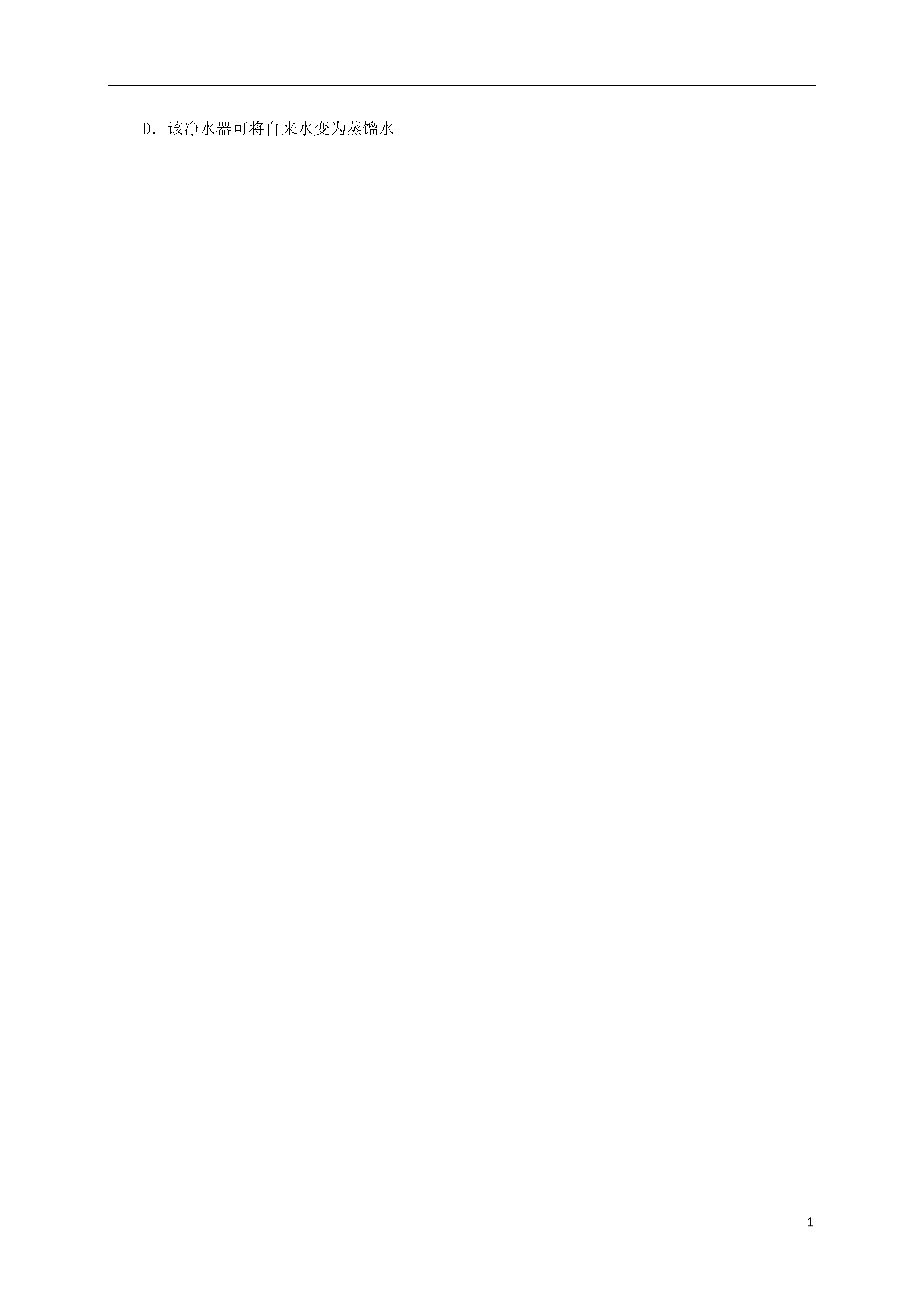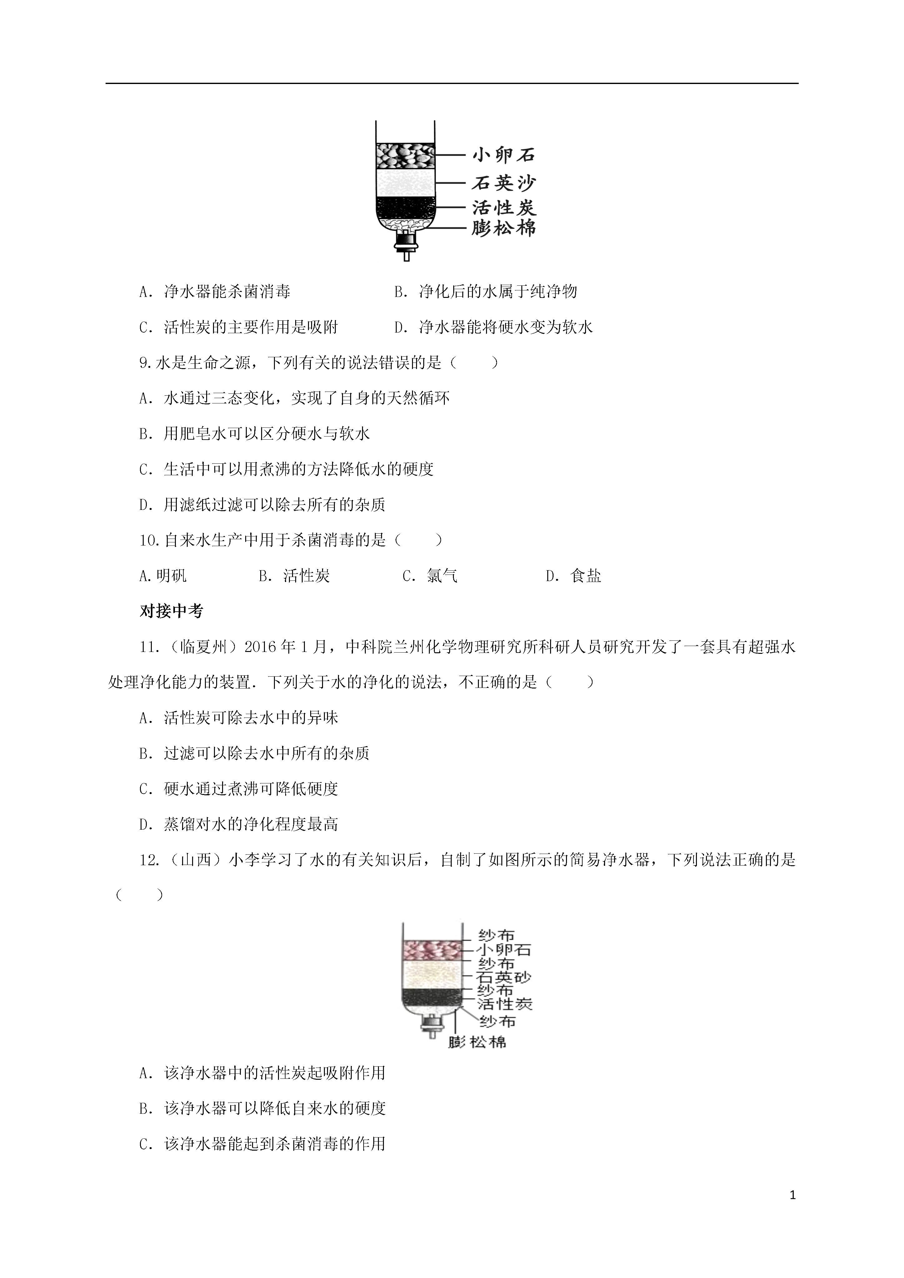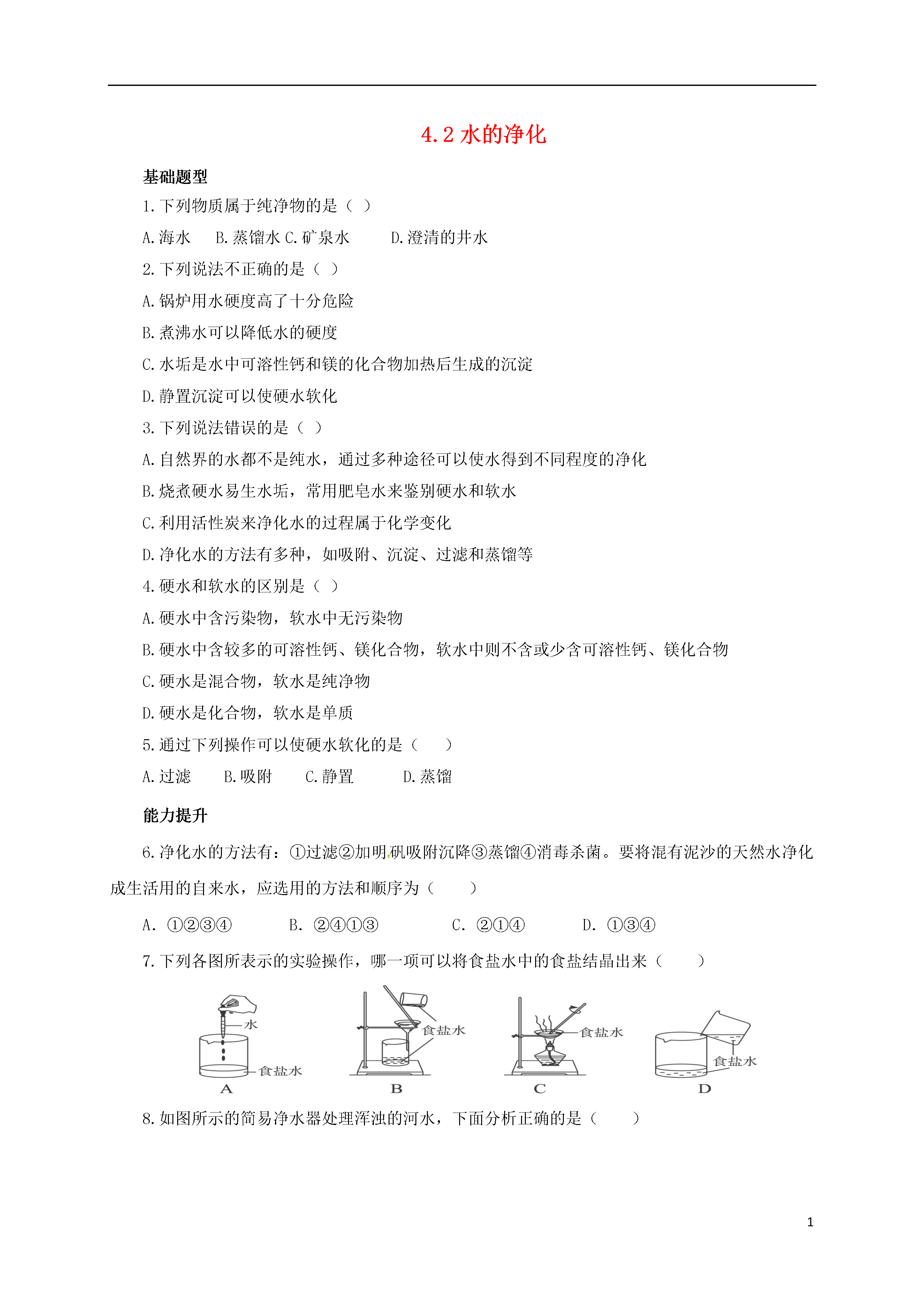 14.2水的净化基础题型1.下列物质属于纯净物的是()A.海水B.蒸馏水C.矿泉水D.澄清的井水2.下列说法不正确的是()A.锅炉用水硬度高了十分危险B.煮沸水可以降低水的硬度C.水垢是水中可溶性钙和镁的化合物加热后生成的沉淀D.静置沉淀可以使硬水软化3.下列说法错误的是()A.自然界的水都不是纯水,通过多种途径可以使水得到不同程度的净化B.烧煮硬水易生水垢,常用肥皂水来鉴别硬水和软水C.利用活性炭来净化水的过程属于化学变化D.净化水的方法有多种,如吸附、沉淀、过滤和蒸馏等4.硬水和软水的区别是()A.硬水中含污染物,软水中无污染物B.硬水中含较多的可溶性钙、镁化合物,软水中则不含或少含可溶性钙、镁化合物C.硬水是混合物,软水是纯净物D.硬水是化合物,软水是单质5.通过下列操作可以使硬水软化的是()A.过滤B.吸附C.静置D.蒸馏能力提升6.净化水的方法有:①过滤②加明矾吸附沉降③蒸馏④消毒杀菌。要将混有泥沙的天然水净化成生活用的自来水,应选用的方法和顺序为()A.①②③④B.②④①③C.②①④D.①③④7.下列各图所表示的实验操作,哪一项可以将食盐水中的食盐结晶出来()8.如图所示的简易净水器处理浑浊的河水,下面分析正确的是()A.净水器能杀菌消毒B.净化后的水属于纯净物C.活性炭的主要作用是吸附D.净水器能将硬水变为软水9.水是生命之源,下列有关的说法错误的是()A.水通过三态变化,实现了自身的天然循环B.用肥皂水可以区分硬水与软水C.生活中可以用煮沸的方法降低水的硬度D.用滤纸过滤可以除去所有的杂质10.自来水生产中用于杀菌消毒的是()A.明矾B.活性炭C.氯气D.食盐对接中考11.(临夏州)2016年1月,中科院兰州化学物理研究所科研人员研究开发了一套具有超强水处理净化能力的装置.下列关于水的净化的说法,不正确的是()A.活性炭可除去水中的异味B.过滤可以除去水中所有的杂质C.硬水通过煮沸可降低硬度D.蒸馏对水的净化程度最高(山西)小李学习了水的有关知识后,自制了如图所示的简易净水器,下列说法正确的是()A.该净水器中的活性炭起吸附作用B.该净水器可以降低自来水的硬度C.该净水器能起到杀菌消毒的作用D.该净水器可将自来水变为蒸馏水参考答案1.B2.D3.C4.B5.D6.C7.C8.C9.D10.C11.B12.A