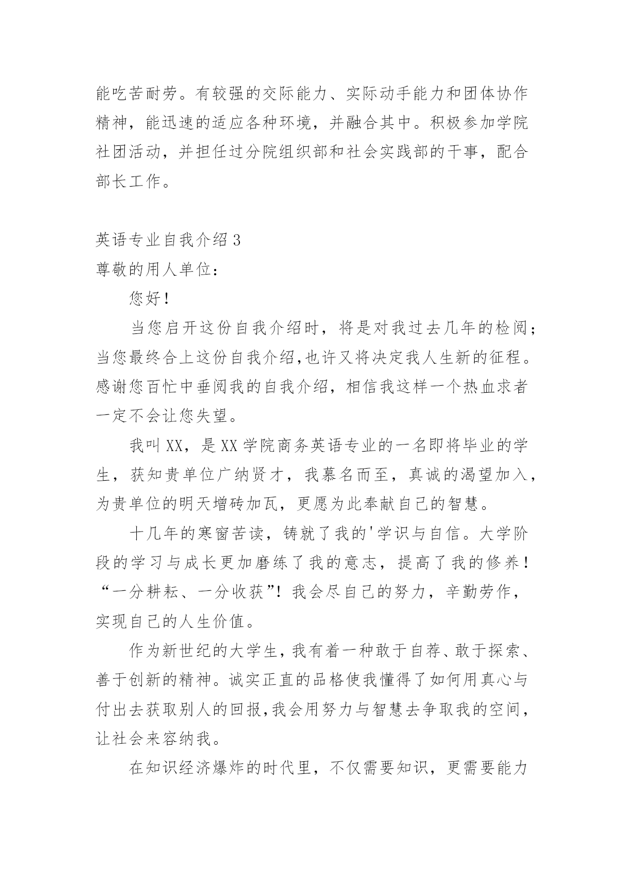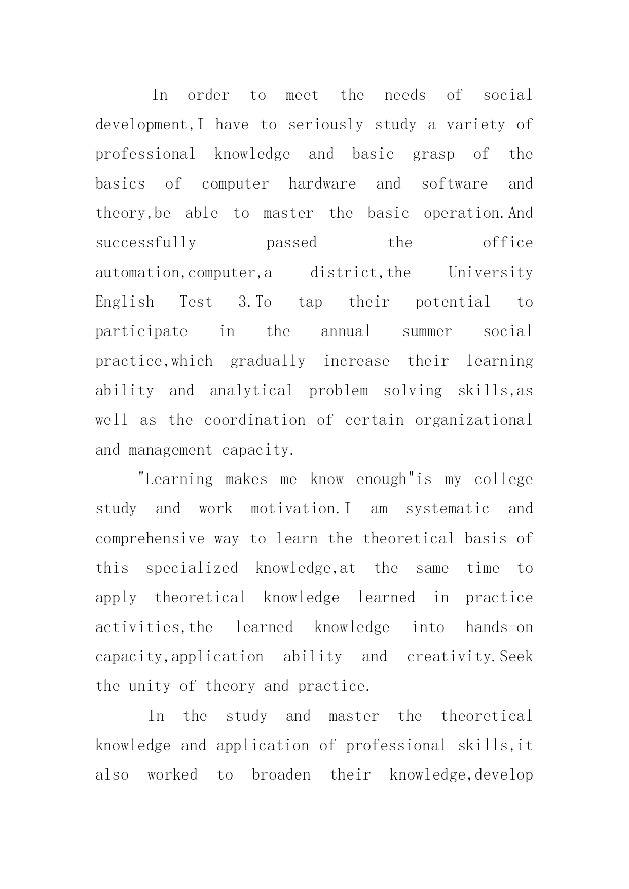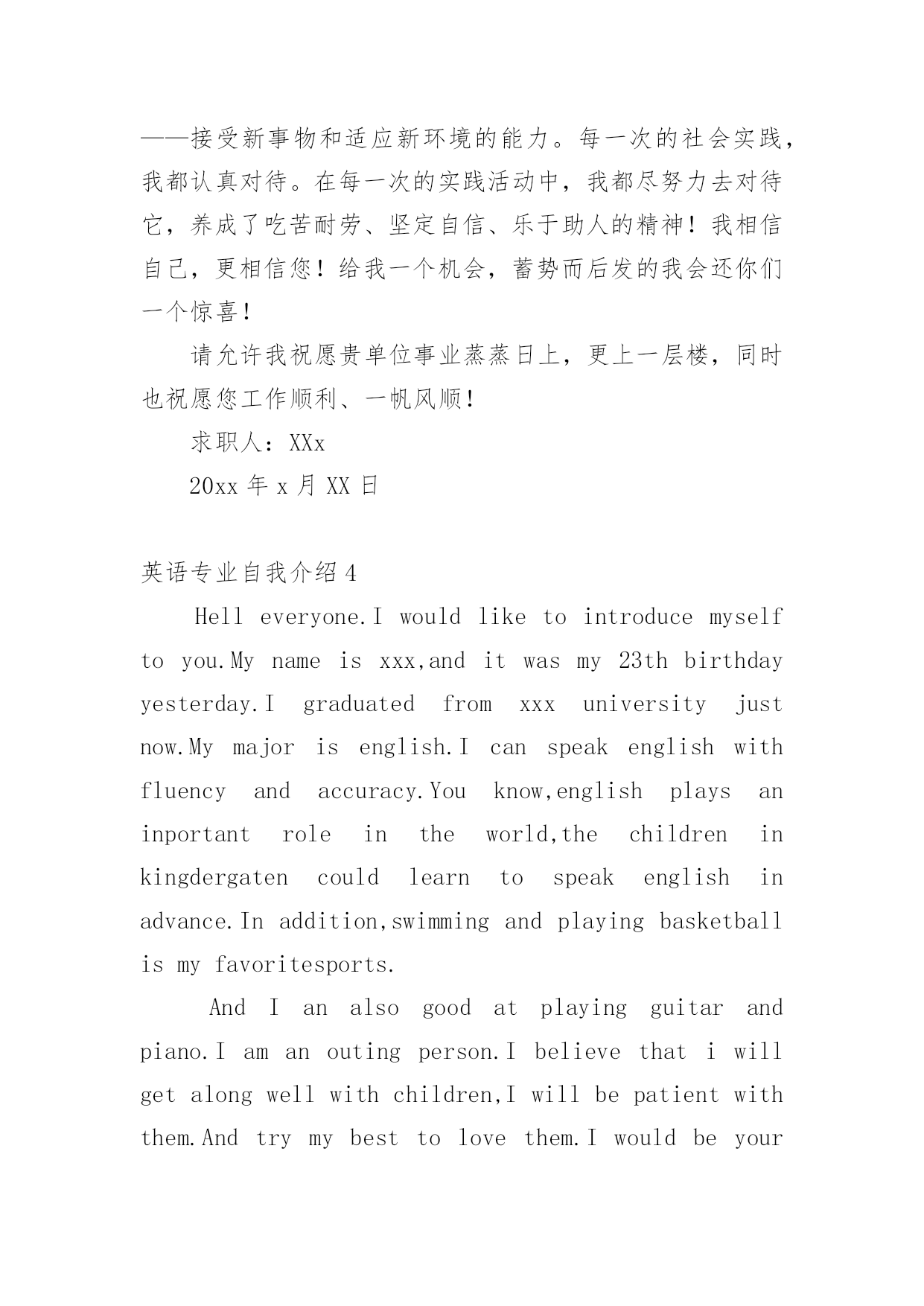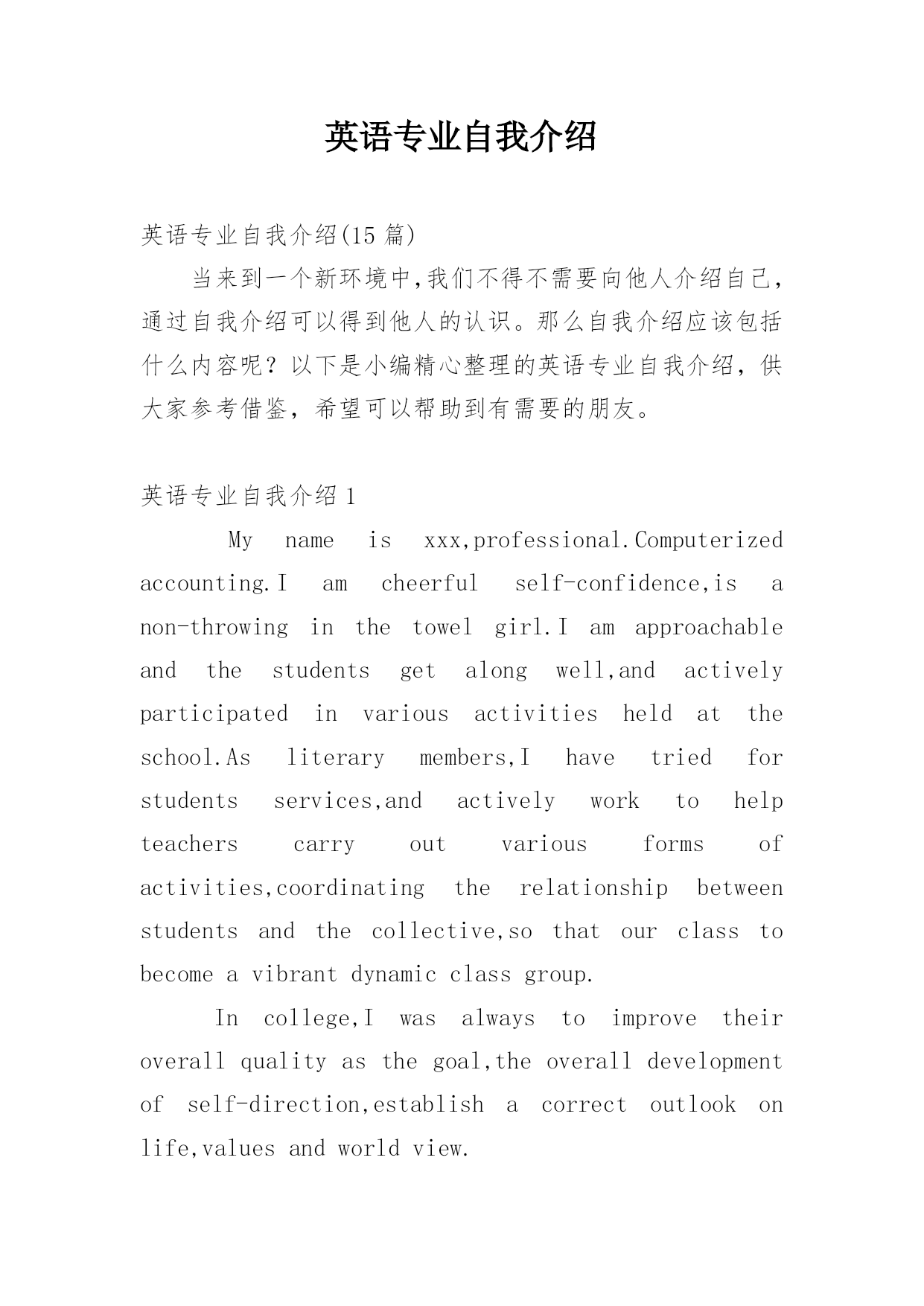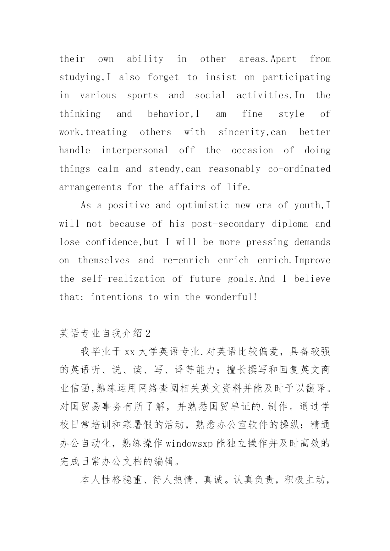 英语专业自我介绍 英语专业自我介绍(15篇)当来到一个新环境中,我们不得不需要向他人介绍自己,通过自我介绍可以得到他人的认识。那么自我介绍应该包括什么内容呢?以下是小编精心整理的英语专业自我介绍,供大家参考借鉴,希望可以帮助到有需要的朋友。英语专业自我介绍1Mynameisxxx,professional.Computerizedaccounting.Iamcheerfulself-confidence,isanon-throwinginthetowelgirl.Iamapproachableandthestudentsgetalongwell,andactivelyparticipatedinvariousactivitiesheldattheschool.Asliterarymembers,Ihavetriedforstudentsservices,andactivelyworktohelpteacherscarryoutvariousformsofactivities,coordinatingtherelationshipbetweenstudentsandthecollective,sothatourclasstobecomeavibrantdynamicclassgroup.Incollege,Iwasalwaystoimprovetheiroverallqualityasthegoal,theoveralldevelopmentofself-direction,establishacorrectoutlookonlife,valuesandworldview.Inordertomeettheneedsofsocialdevelopment,Ihavetoseriouslystudyavarietyofprofessionalknowledgeandbasicgraspofthebasicsofcomputerhardwareandsoftwareandtheory,beabletomasterthebasicoperation.Andsuccessfullypassedtheofficeautomation,computer,adistrict,theUniversityEnglishTest3.Totaptheirpotentialtoparticipateintheannualsummersocialpractice,whichgraduallyincreasetheirlearningabilityandanalyticalproblemsolvingskills,aswellasthecoordinationofcertainorganizationalandmanagementcapacity."Learningmakesmeknowenough"ismycollegestudyandworkmotivation.Iamsystematicandcomprehensivewaytolearnthetheoreticalbasisofthisspecializedknowledge,atthesametimetoapplytheoreticalknowledgelearnedinpracticeactivities,thelearnedknowledgeintohands-oncapacity,applicationabilityandcreativity.Seektheunityoftheoryandpractice.Inthestudyandmasterthetheoreticalknowledgeandapplicationofprofessionalskills,italsoworkedtobroadentheirknowledge,developtheirownabilityinotherareas.Apartfromstudying,Ialsoforgettoinsistonparticipatinginvarioussportsandsocialactivities.Inthethinkingandbehavior,Iamfinestyleofwork,treatingotherswithsincerity,canbetterhandleinterpersonalofftheoccasionofdoingthingscalmandsteady,canreasonablyco-ordinatedarrangementsfortheaffairsoflife.Asapositiveandoptimisticneweraofyouth,Iwillnotbecauseofhispost-second