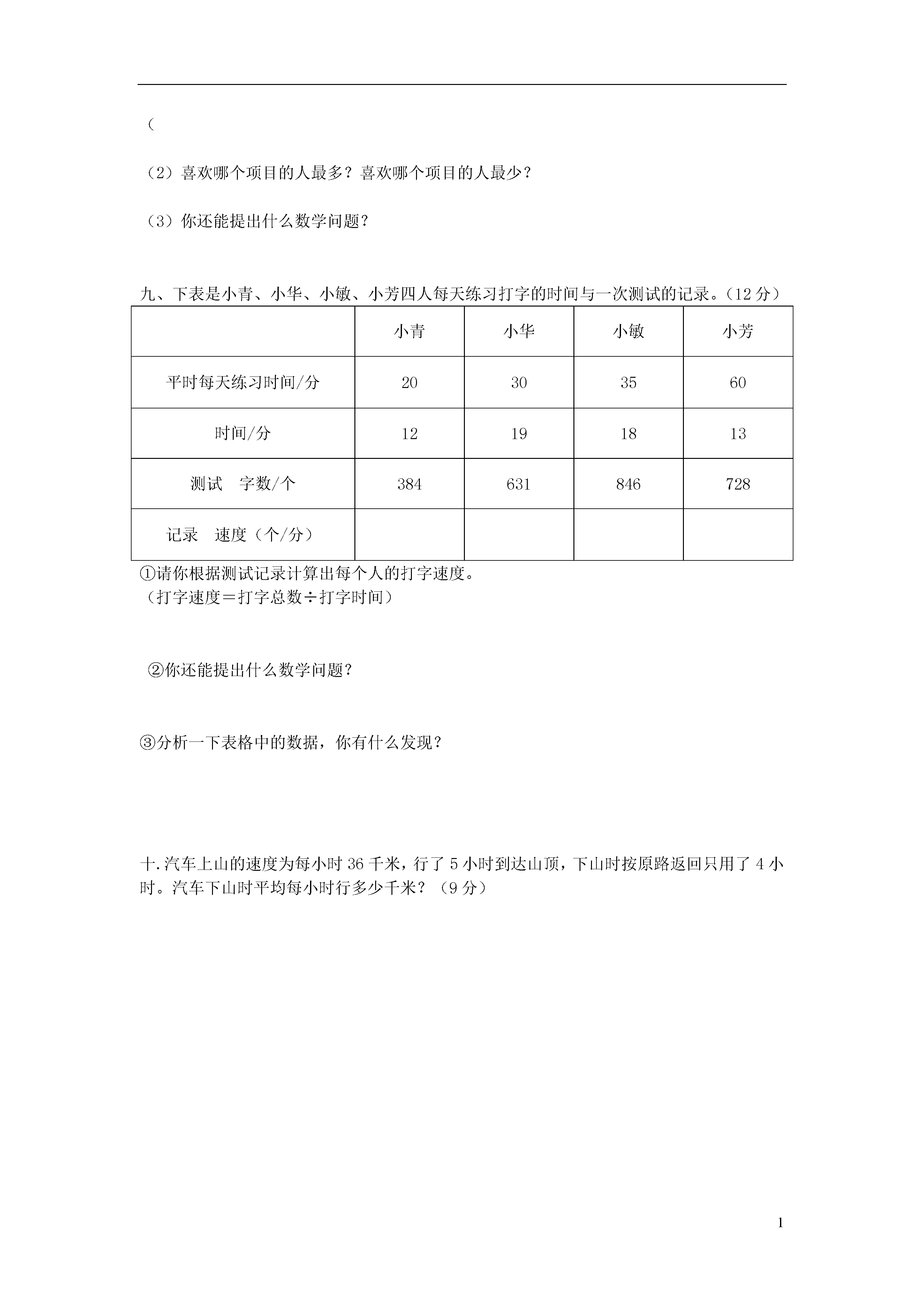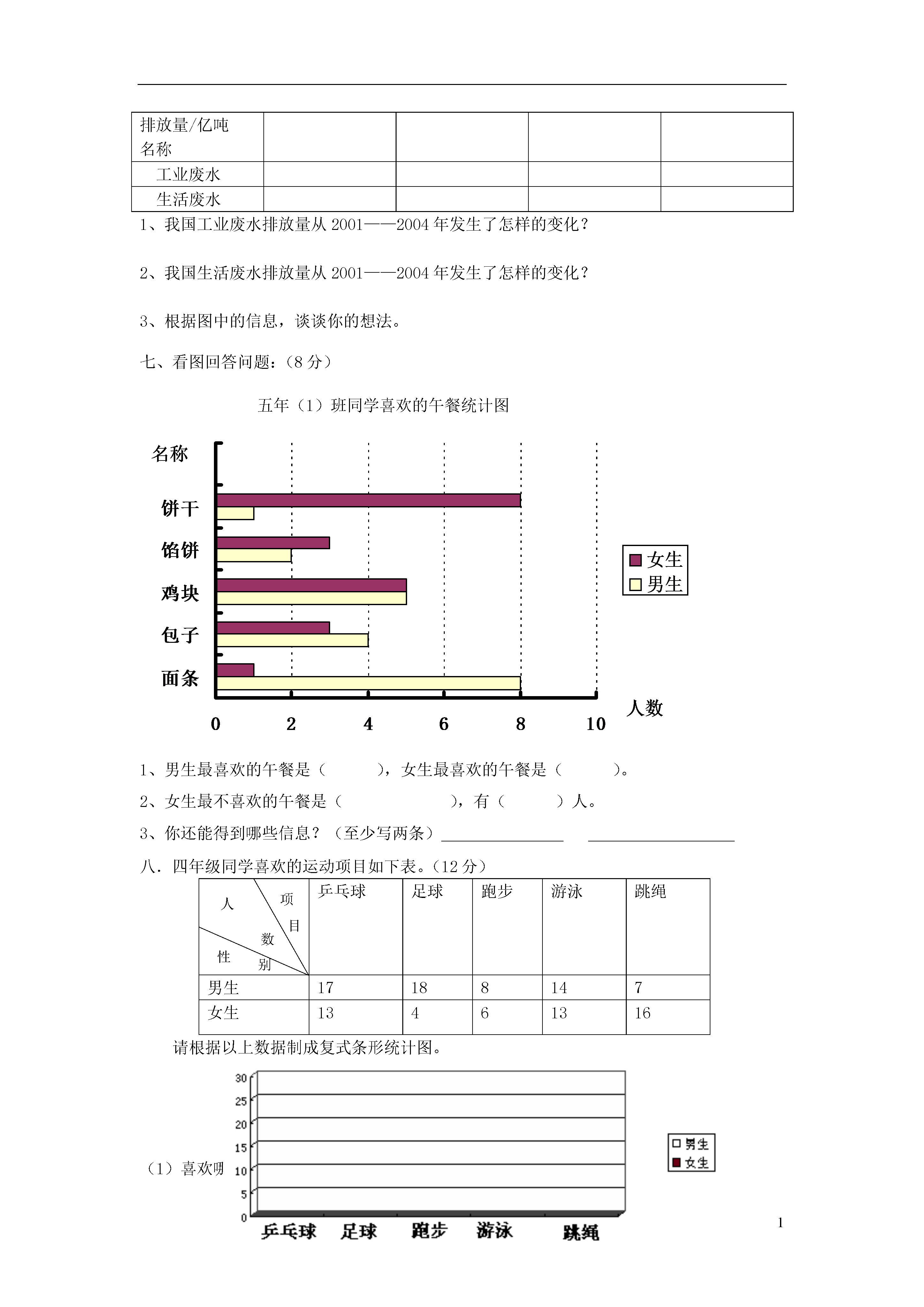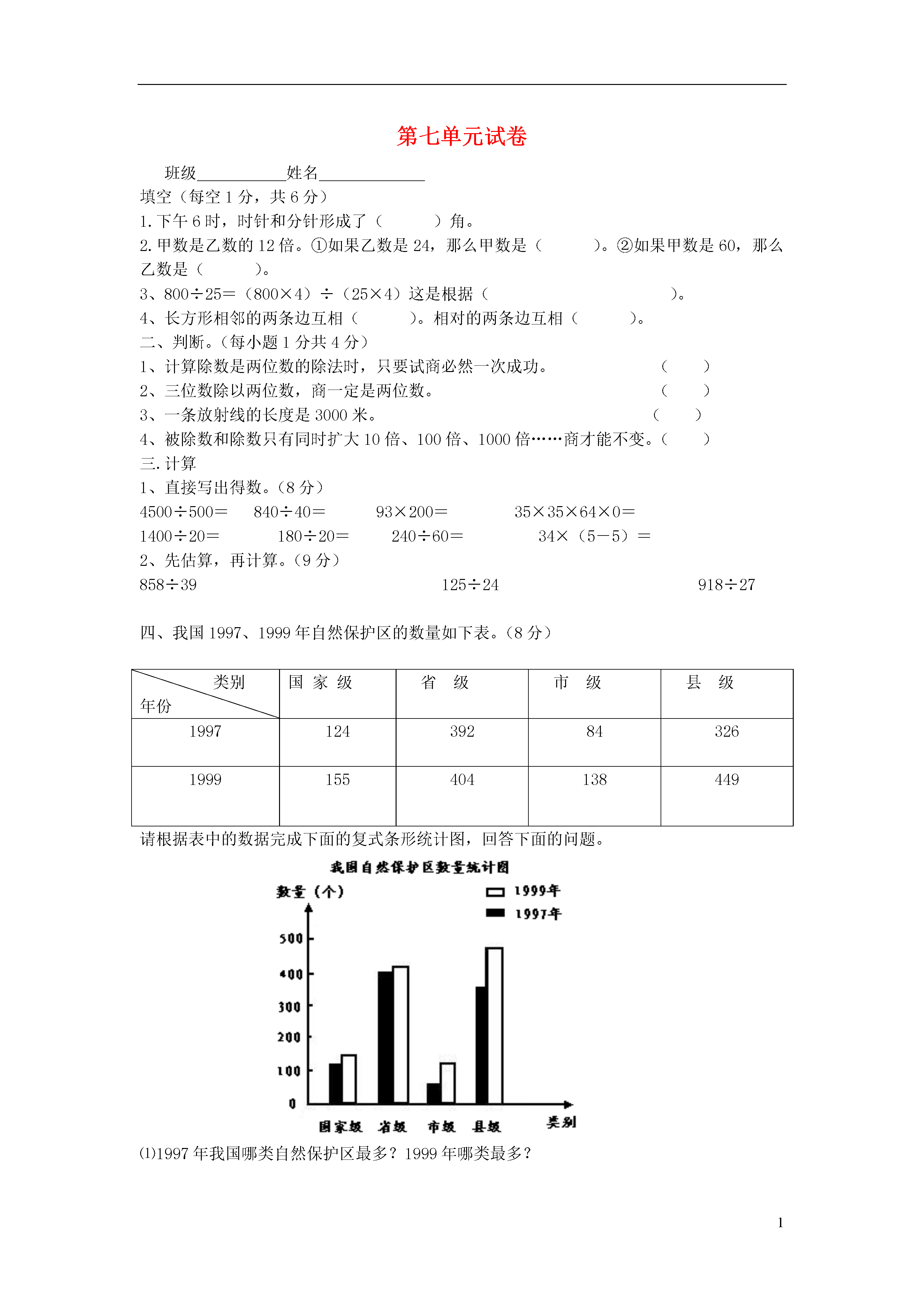 1第七单元试卷班级姓名填空(每空1分,共6分)1.下午6时,时针和分针形成了()角。2.甲数是乙数的12倍。①如果乙数是24,那么甲数是()。②如果甲数是60,那么乙数是()。3、800÷25=(800×4)÷(25×4)这是根据()。4、长方形相邻的两条边互相()。相对的两条边互相()。二、判断。(每小题1分共4分)1、计算除数是两位数的除法时,只要试商必然一次成功。()2、三位数除以两位数,商一定是两位数。()3、一条放射线的长度是3000米。()4、被除数和除数只有同时扩大10倍、100倍、1000倍……商才能不变。()三.计算1、直接写出得数。(8分)4500÷500=840÷40=93×200=35×35×64×0=1400÷20=180÷20=240÷60=34×(5-5)=2、先估算,再计算。(9分)858÷39125÷24918÷27四、我国1997、1999年自然保护区的数量如下表。(8分)类别年份国家级省级市级县级1997124392843261999155404138449请根据表中的数据完成下面的复式条形统计图,回答下面的问题。⑴1997年我国哪类自然保护区最多?1999年哪类最多?⑵1999年我国各类保护区均比1997年()。⑶从统计图中你还能得到哪些信息?五、下面是育才小学3个年级春季植树情况的统计表。(10分)班级月份四年级五年级六年级3月951001054月105110110请根据上表完成下面的统计图,并回答下面的问题。育才小学春季植树情况统计图⑴哪个年级春季植树最多?⑵3月份3个年级共植树()棵,4月份比3月份多植树()棵.⑶你还能提出哪些数学问题?六、下面是我国2001——2004年废水排放量统计图。(14分)我国2001~2004年废水排放统计图根据统计图完成统计表:年份排放量/亿吨名称2001200220032004工业废水生活废水1、我国工业废水排放量从2001——2004年发生了怎样的变化?2、我国生活废水排放量从2001——2004年发生了怎样的变化?3、根据图中的信息,谈谈你的想法。七、看图回答问题:(8分)五年(1)班同学喜欢的午餐统计图人数名称1、男生最喜欢的午餐是(),女生最喜欢的午餐是()。2、女生最不喜欢的午餐是(),有()人。3、你还能得到哪些信息?(至少写两条)八.四年级同学喜欢的运动项目如下表。(12分)项目人数性别乒乓球足球跑步游泳跳绳男生17188147女生13461316请根据以上数据制成复式条形统计图。(1)喜欢哪个项目的男生最多?喜欢哪个项目的女生最少?((2)喜欢哪个项目的人最多?喜欢哪个项目的人最少?(3)你还能提出什么数学问题?九、下表是小青、小华、小敏、小芳四人每天练习打字的时间与一次测试的记录。(12分)小青小华小敏小芳平时每天练习时间/分20303560时间/分12191813测试字数/个384631846728记录速度(个/分)①请你根据测试记录计算出每个人的打字速度。(打字速度=打字总数÷打字时间)②你还能提出什么数学问题?③分析一下表格中的数据,你有什么发现?十.汽车上山的速度为每小时36千米,行了5小时到达山顶,下山时按原路返回只用了4小时。汽车下山时平均每小时行多少千米?(9分)