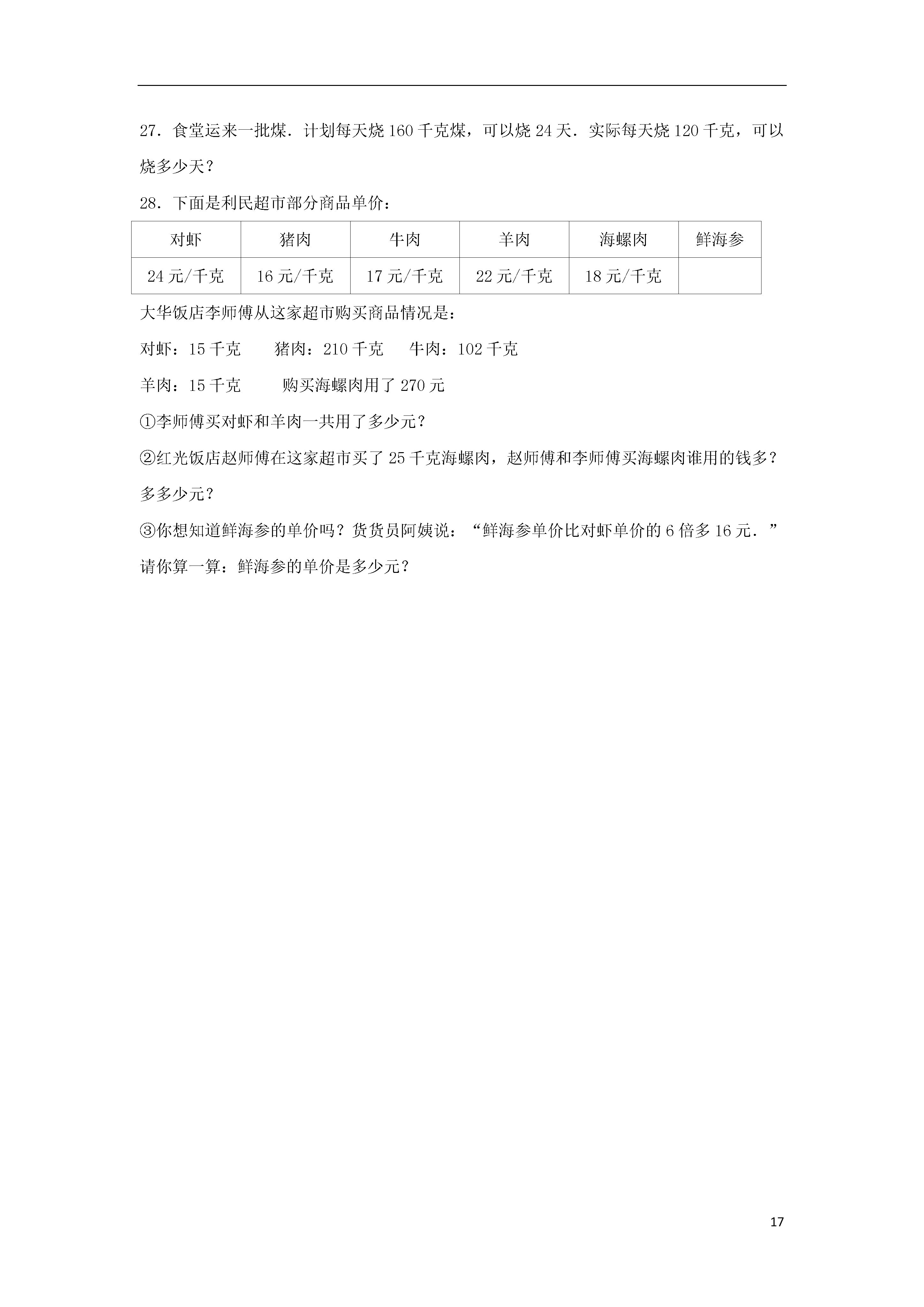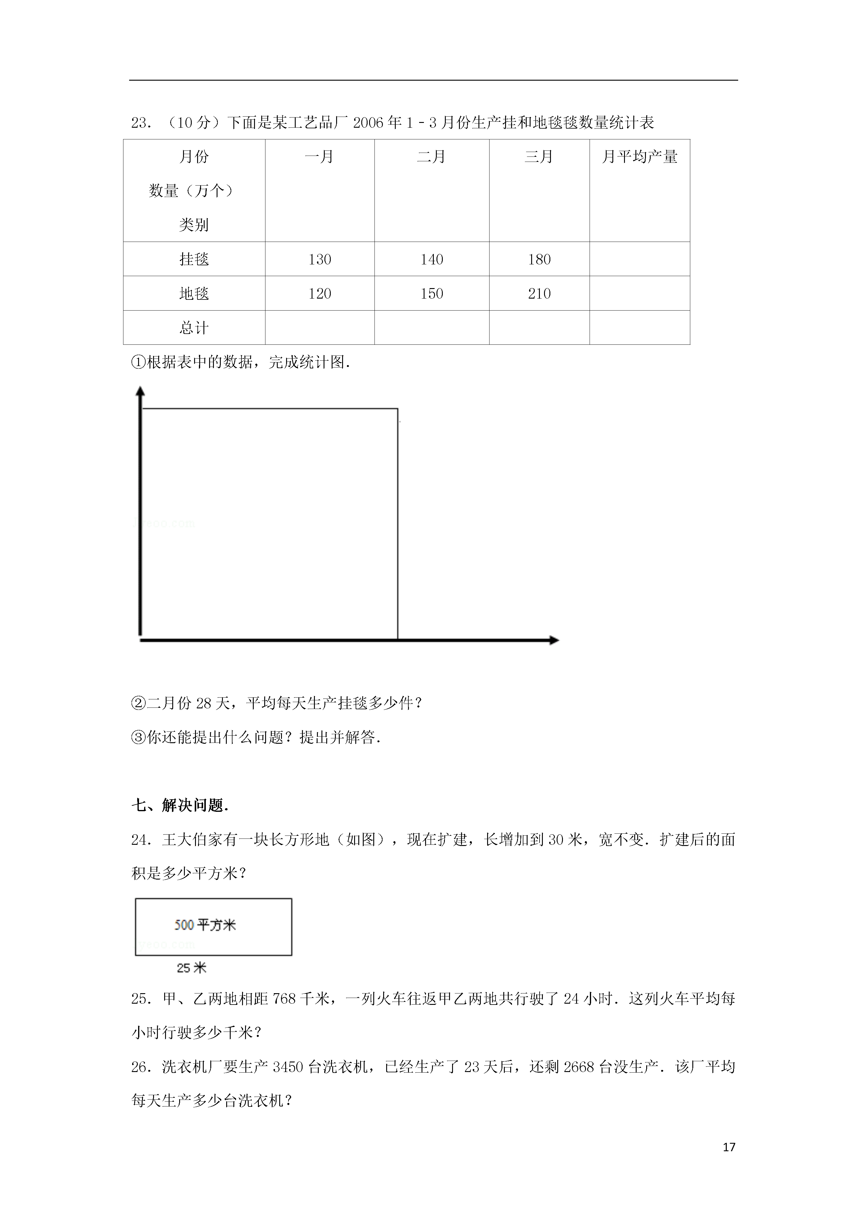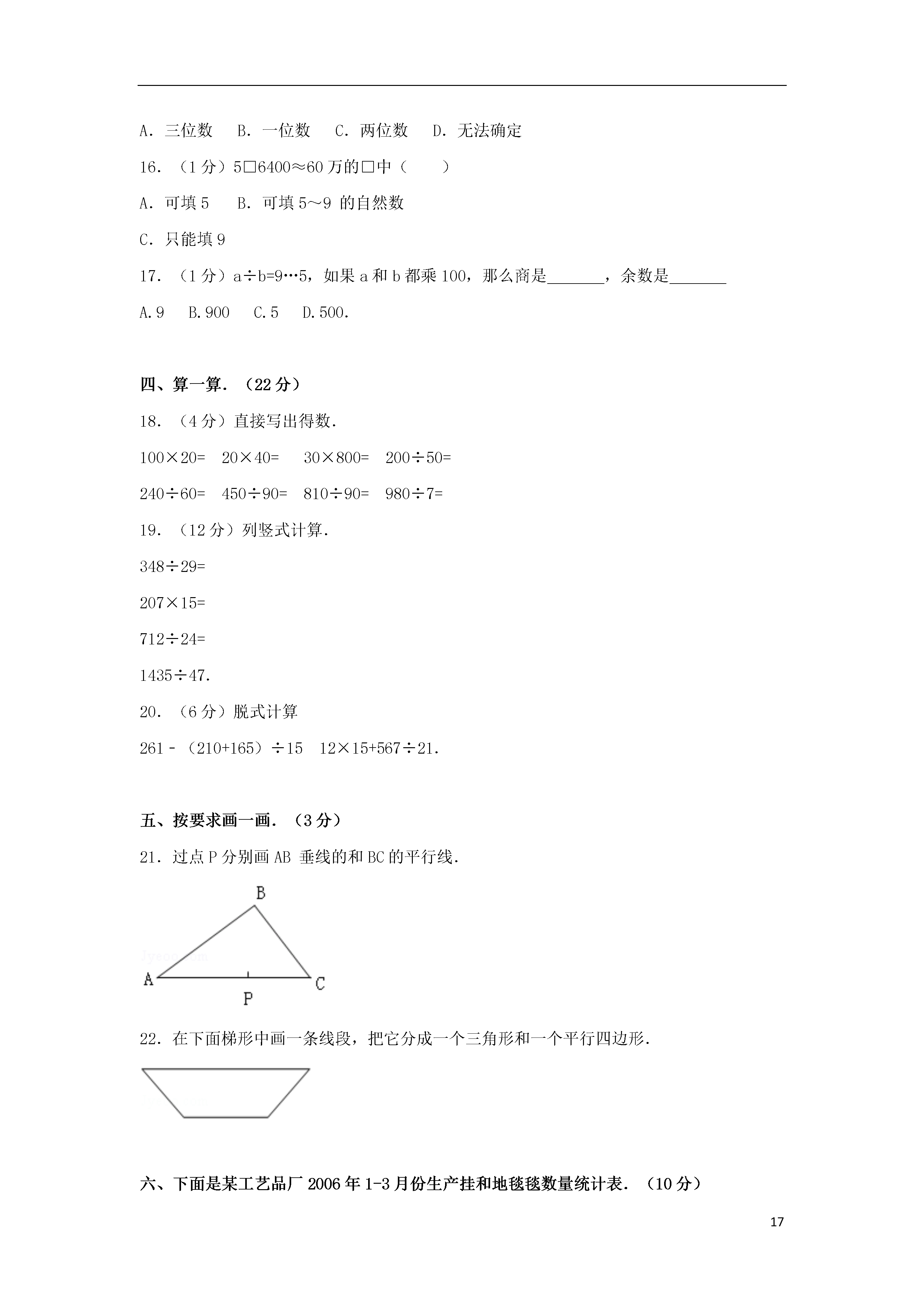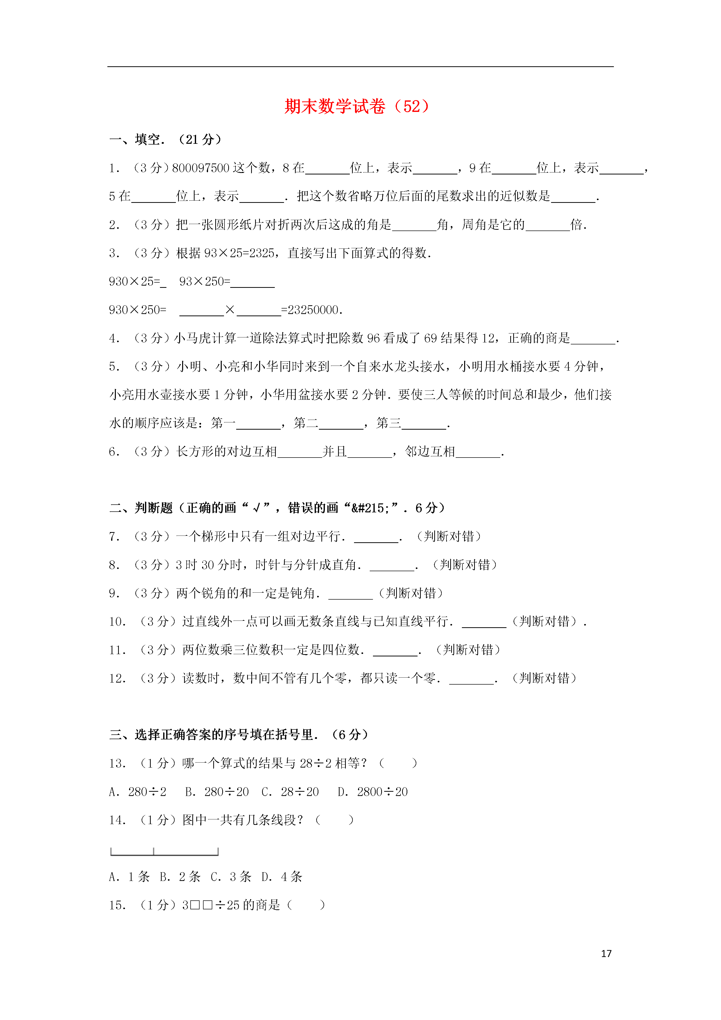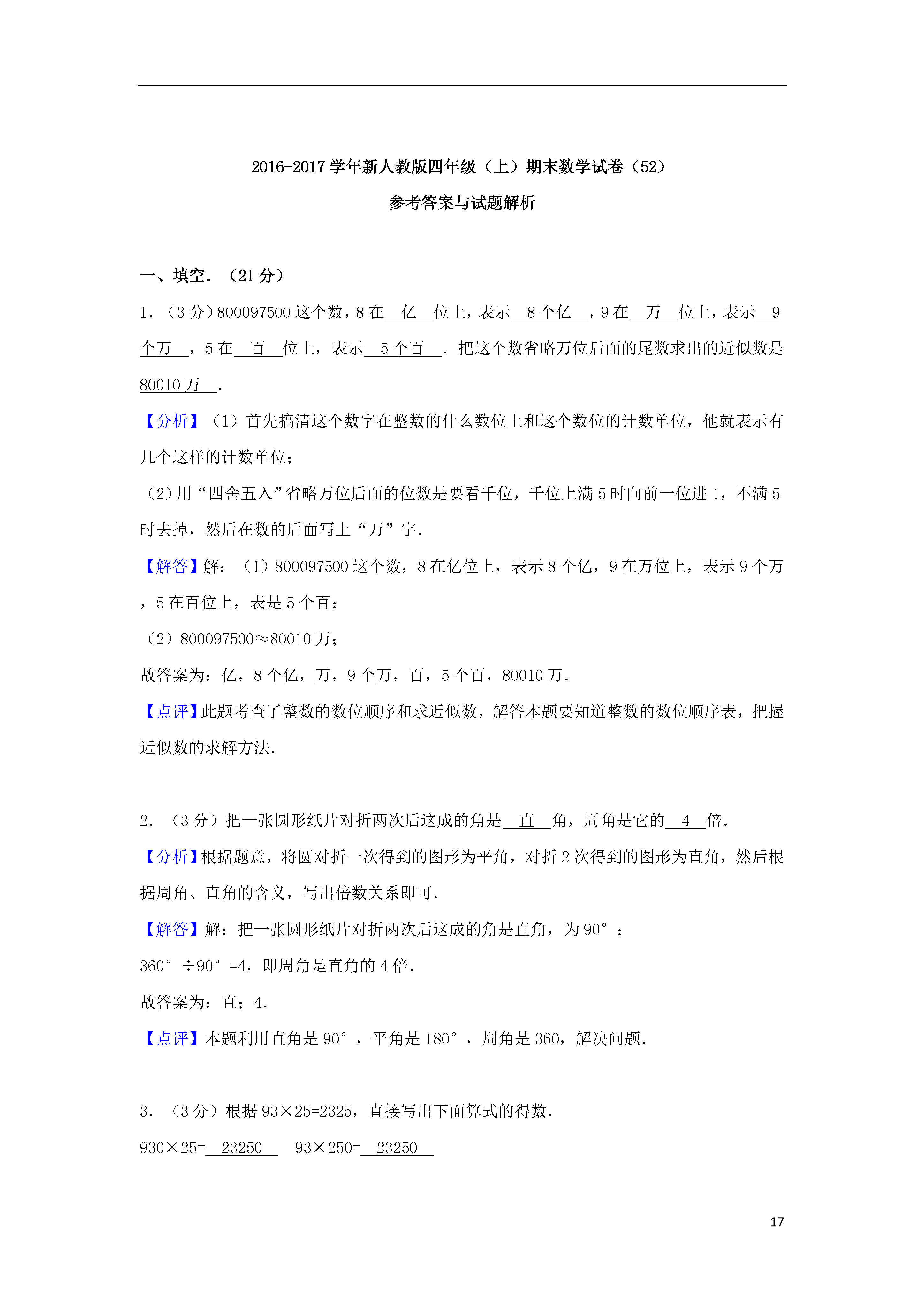 17期末数学试卷(52)一、填空.(21分)1.(3分)800097500这个数,8在位上,表示,9在位上,表示,5在位上,表示.把这个数省略万位后面的尾数求出的近似数是.2.(3分)把一张圆形纸片对折两次后这成的角是角,周角是它的倍.3.(3分)根据93×25=2325,直接写出下面算式的得数.930×25=93×250=930×250=×=23250000.4.(3分)小马虎计算一道除法算式时把除数96看成了69结果得12,正确的商是.5.(3分)小明、小亮和小华同时来到一个自来水龙头接水,小明用水桶接水要4分钟,小亮用水壶接水要1分钟,小华用盆接水要2分钟.要使三人等候的时间总和最少,他们接水的顺序应该是:第一,第二,第三.6.(3分)长方形的对边互相并且,邻边互相.二、判断题(正确的画“√”,错误的画“×”.6分)7.(3分)一个梯形中只有一组对边平行..(判断对错)8.(3分)3时30分时,时针与分针成直角..(判断对错)9.(3分)两个锐角的和一定是钝角.(判断对错)10.(3分)过直线外一点可以画无数条直线与已知直线平行.(判断对错).11.(3分)两位数乘三位数积一定是四位数..(判断对错)12.(3分)读数时,数中间不管有几个零,都只读一个零..(判断对错)三、选择正确答案的序号填在括号里.(6分)13.(1分)哪一个算式的结果与28÷2相等?()A.280÷2B.280÷20C.28÷20D.2800÷2014.(1分)图中一共有几条线段?()A.1条B.2条C.3条D.4条15.(1分)3□□÷25的商是()A.三位数B.一位数C.两位数D.无法确定16.(1分)5□6400≈60万的□中()A.可填5B.可填5~9的自然数C.只能填917.(1分)a÷b=9…5,如果a和b都乘100,那么商是,余数是A.9B.900C.5D.500.四、算一算.(22分)18.(4分)直接写出得数.100×20=20×40=30×800=200÷50=240÷60=450÷90=810÷90=980÷7=19.(12分)列竖式计算.348÷29=207×15=712÷24=1435÷47.20.(6分)脱式计算261﹣(210+165)÷1512×15+567÷21.五、按要求画一画.(3分)21.过点P分别画AB垂线的和BC的平行线.22.在下面梯形中画一条线段,把它分成一个三角形和一个平行四边形.六、下面是某工艺品厂2006年1-3月份生产挂和地毯毯数量统计表.(10分)23.(10分)下面是某工艺品厂2006年1﹣3月份生产挂和地毯毯数量统计表月份数量(万个)类别一月二月三月月平均产量挂毯130140180地毯120150210总计①根据表中的数据,完成统计图.②二月份28天,平均每天生产挂毯多少件?③你还能提出什么问题?提出并解答.七、解决问题.24.王大伯家有一块长方形地(如图),现在扩建,长增加到30米,宽不变.扩建后的面积是多少平方米?25.甲、乙两地相距768千米,一列火车往返甲乙两地共行驶了24小时.这列火车平均每小时行驶多少千米?26.洗衣机厂要生产3450台洗衣机,已经生产了23天后,还剩2668台没生产.该厂平均每天生产多少台洗衣机?27.食堂运来一批煤.计划每天烧160千克煤,可以烧24天.实际每天烧120千克,可以烧多少天?28.下面是利民超市部分商品单价:对虾猪肉牛肉羊肉海螺肉鲜海参24元/千克16元/千克17元/千克22元/千克18元/千克大华饭店李师傅从这家超市购买商品情况是:对虾:15千克猪肉:210千克牛肉:102千克羊肉:15千克购买海螺肉用了270元①李师傅买对虾和羊肉一共用了多少元?②红光饭店赵师傅在这家超市买了25千克海螺肉,赵师傅和李师傅买海螺肉谁用的钱多?多多少元?③你想知道鲜海参的单价吗?货货员阿姨说:“鲜海参单价比对虾单价的6倍多16元.”请你算一算:鲜海参的单价是多少元?2016-2017学年新人教版四年级(上)期末数学试卷(52)参考答案与试题解析一、填空.(21分)1.(3分)800097500这个数,8在亿位上,表示8个亿,9在万位上,表示9个万,5在百位上,表示5个百.把这个数省略万位后面的尾数求出的近似数是80010万.【分析】(1)首先搞清这个数字在整数的什么数位上和这个数位的计数单位,他就表示有几个这样的计数单位;(2)用“四舍五入”省略万位后面的位数是要看千位,千位上满5时向前一位进1,不满5时去掉,然后在数的后面写上“万”字.【解答】解:(1)800097500这个数