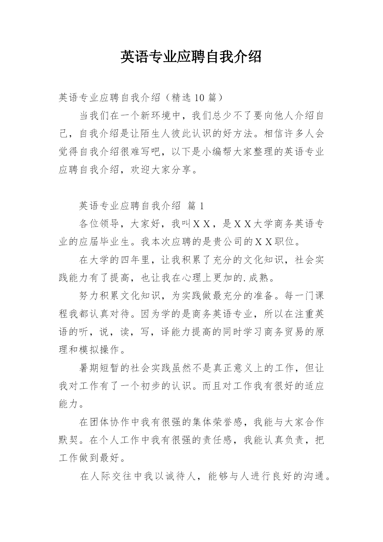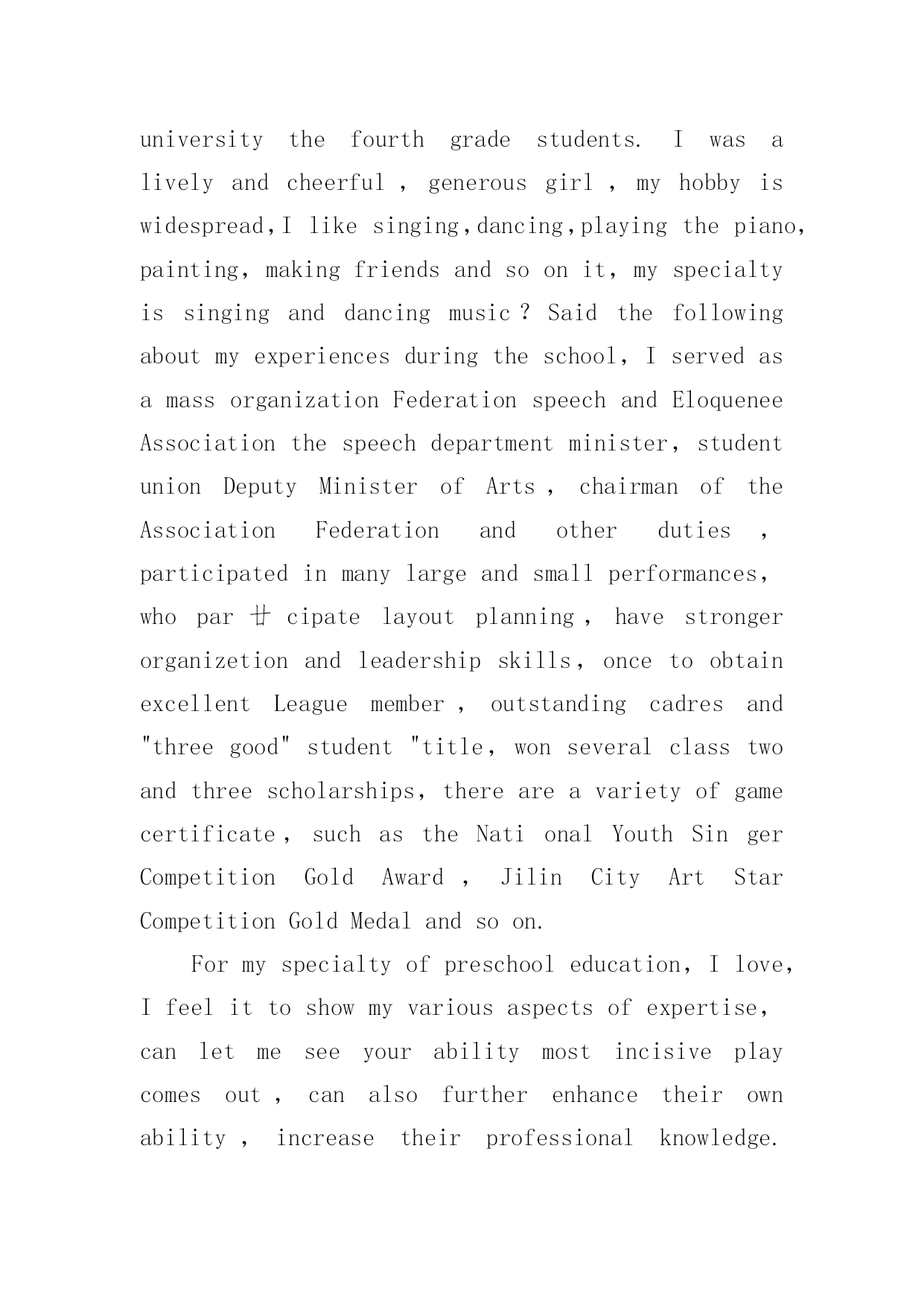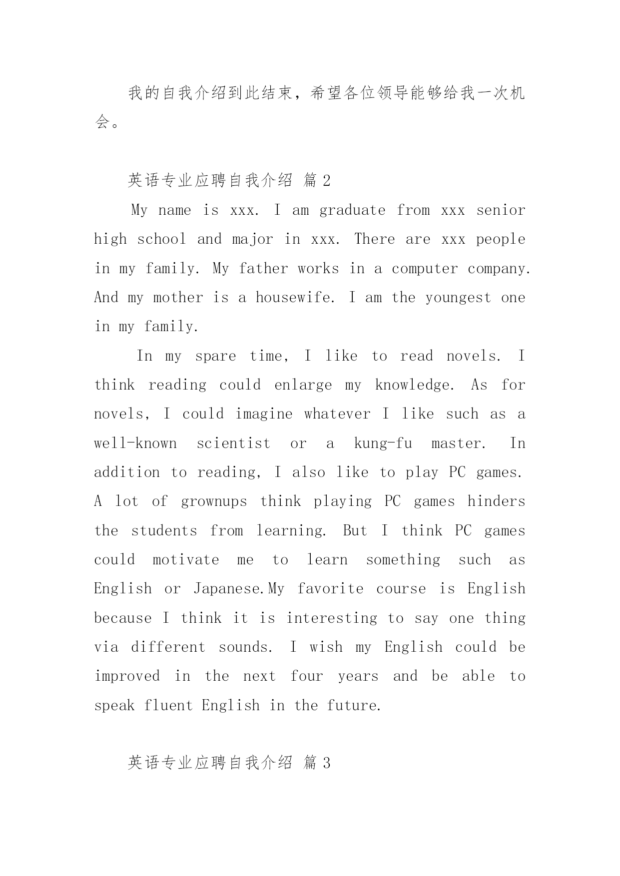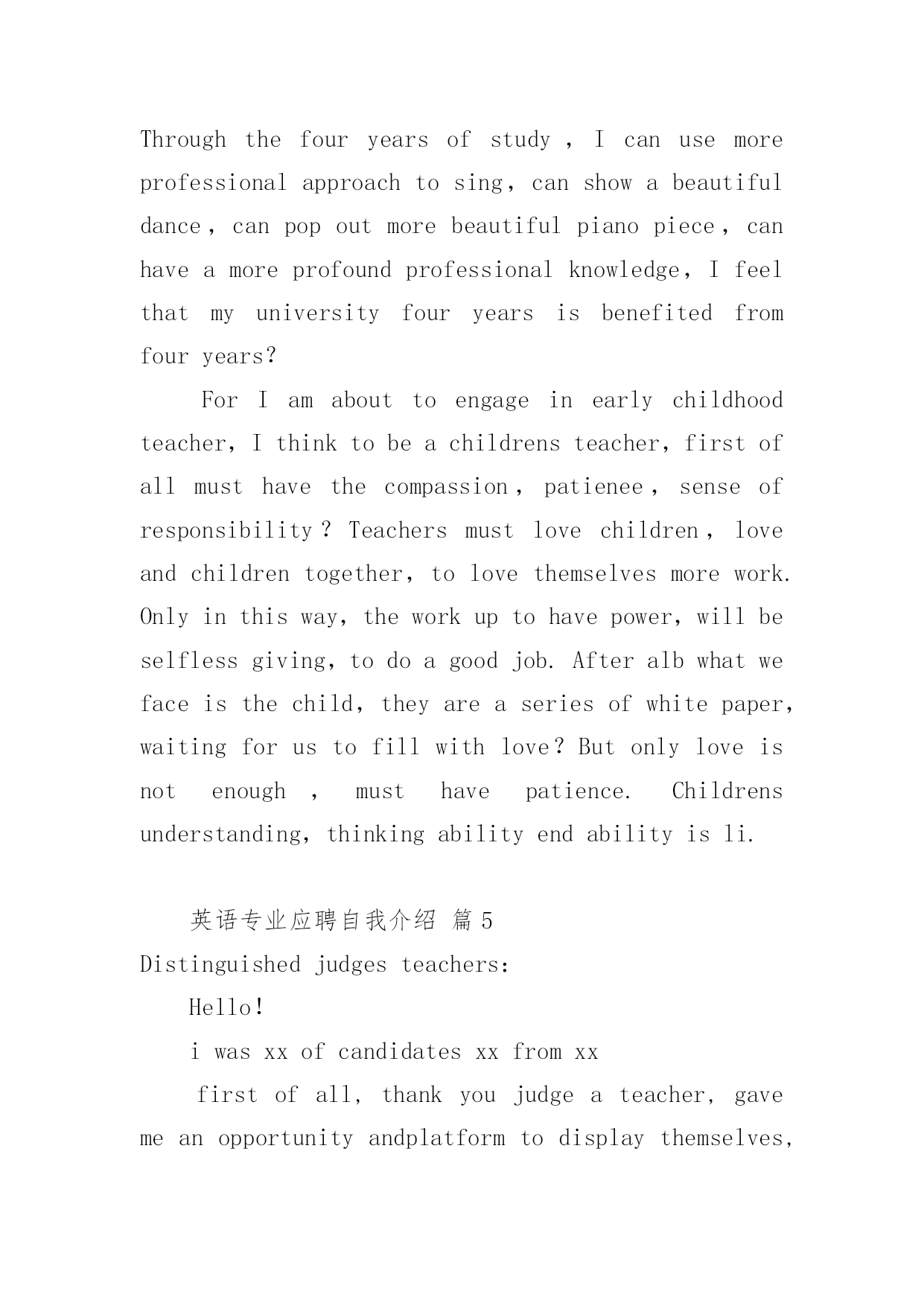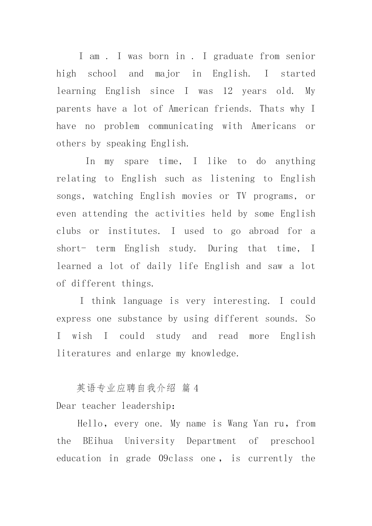 英语专业应聘自我介绍 英语专业应聘自我介绍(精选10篇)当我们在一个新环境中,我们总少不了要向他人介绍自己,自我介绍是让陌生人彼此认识的好方法。相信许多人会觉得自我介绍很难写吧,以下是小编帮大家整理的英语专业应聘自我介绍,欢迎大家分享。英语专业应聘自我介绍篇1各位领导,大家好,我叫XX,是XX大学商务英语专业的应届毕业生。我本次应聘的是贵公司的XX职位。在大学的四年里,让我积累了充分的文化知识,社会实践能力有了提高,也让我在心理上更加的.成熟。努力积累文化知识,为实践做最充分的准备。每一门课程我都认真对待。因为学的是商务英语专业,所以在注重英语的听,说,读,写,译能力提高的同时学习商务贸易的原理和模拟操作。暑期短暂的社会实践虽然不是真正意义上的工作,但让我对工作有了一个初步的认识。而且对工作我有很好的适应能力。在团体协作中我有很强的集体荣誉感,我能与大家合作默契。在个人工作中我有很强的责任感,我能认真负责,把工作做到最好。在人际交往中我以诚待人,能够与人进行良好的沟通。我的自我介绍到此结束,希望各位领导能够给我一次机会。英语专业应聘自我介绍篇2Mynameisxxx.Iamgraduatefromxxxseniorhighschoolandmajorinxxx.Therearexxxpeopleinmyfamily.Myfatherworksinacomputercompany.Andmymotherisahousewife.Iamtheyoungestoneinmyfamily.Inmysparetime,Iliketoreadnovels.Ithinkreadingcouldenlargemyknowledge.Asfornovels,IcouldimaginewhateverIlikesuchasawell-knownscientistorakung-fumaster.Inadditiontoreading,IalsoliketoplayPCgames.AlotofgrownupsthinkplayingPCgameshindersthestudentsfromlearning.ButIthinkPCgamescouldmotivatemetolearnsomethingsuchasEnglishorJapanese.MyfavoritecourseisEnglishbecauseIthinkitisinterestingtosayonethingviadifferentsounds.IwishmyEnglishcouldbeimprovedinthenextfouryearsandbeabletospeakfluentEnglishinthefuture.英语专业应聘自我介绍篇3Iam.Iwasbornin.IgraduatefromseniorhighschoolandmajorinEnglish.IstartedlearningEnglishsinceIwas12yearsold.MyparentshavealotofAmericanfriends.ThatswhyIhavenoproblemcommunicatingwithAmericansorothersbyspeakingEnglish.Inmysparetime,IliketodoanythingrelatingtoEnglishsuchaslisteningtoEnglishsongs,watchingEnglishmoviesorTVprograms,orevenattendingtheactivitiesheldbysomeEnglishclubsorinstitutes.Iusedtogoabroadforashort-termEnglishstudy.Duringthattime,IlearnedalotofdailylifeEnglishandsawalotofdifferentthings.Ithinklanguageisveryinteresting.Icouldexpressonesubstancebyusingdifferentsounds.SoIwishIcouldstudyandreadmoreEnglishliteraturesandenlargemyknowledge.英语专业应聘自我介绍篇4Dearteacherleadership:Hello,everyone.MynameisWangYanru,fromtheBEihuaUniversityDepartmentofpreschooleducationingrade09classone,iscurrentlytheuniversitythefourthgradestuden