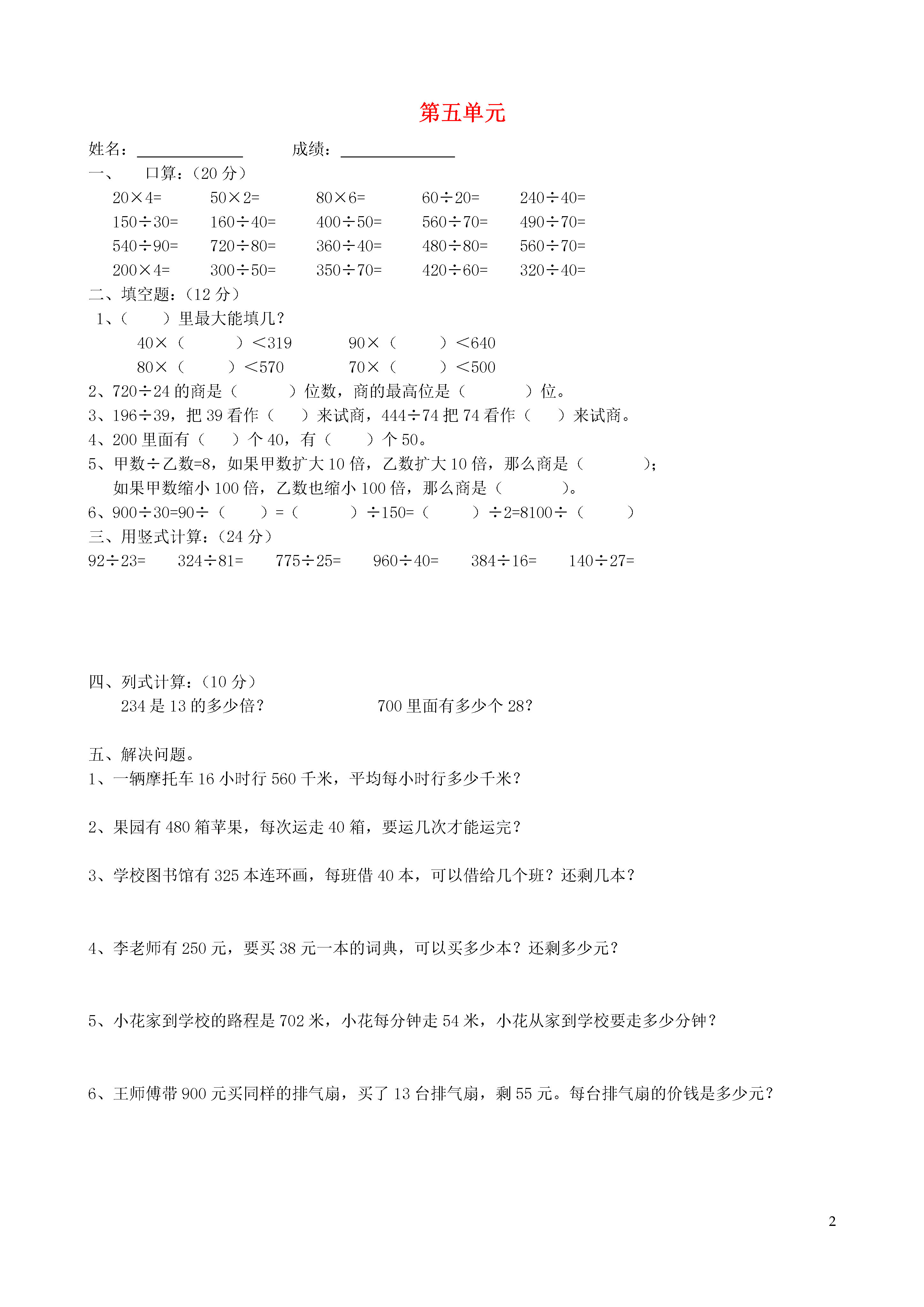 2第五单元姓名:成绩:口算:(20分)20×4=50×2=80×6=60÷20=240÷40=150÷30=160÷40=400÷50=560÷70=490÷70=540÷90=720÷80=360÷40=480÷80=560÷70=200×4=300÷50=350÷70=420÷60=320÷40=二、填空题:(12分)1、()里最大能填几?40×()<31990×()<64080×()<57070×()<5002、720÷24的商是()位数,商的最高位是()位。3、196÷39,把39看作()来试商,444÷74把74看作()来试商。4、200里面有()个40,有()个50。5、甲数÷乙数=8,如果甲数扩大10倍,乙数扩大10倍,那么商是();如果甲数缩小100倍,乙数也缩小100倍,那么商是()。6、900÷30=90÷()=()÷150=()÷2=8100÷()三、用竖式计算:(24分)92÷23=324÷81=775÷25=960÷40=384÷16=140÷27=四、列式计算:(10分)234是13的多少倍?700里面有多少个28?五、解决问题。1、一辆摩托车16小时行560千米,平均每小时行多少千米?2、果园有480箱苹果,每次运走40箱,要运几次才能运完?3、学校图书馆有325本连环画,每班借40本,可以借给几个班?还剩几本?4、李老师有250元,要买38元一本的词典,可以买多少本?还剩多少元?5、小花家到学校的路程是702米,小花每分钟走54米,小花从家到学校要走多少分钟?6、王师傅带900元买同样的排气扇,买了13台排气扇,剩55元。每台排气扇的价钱是多少元?