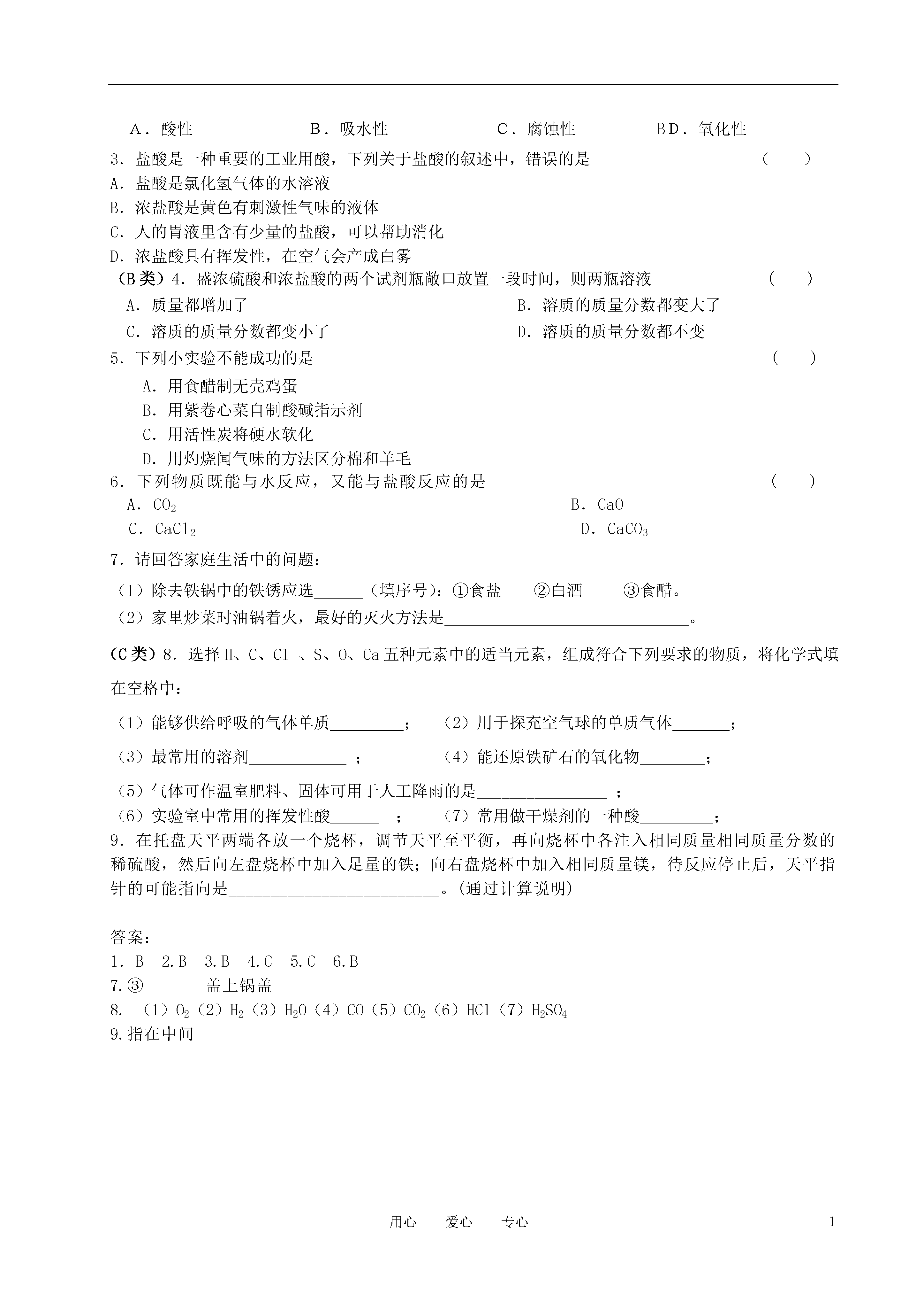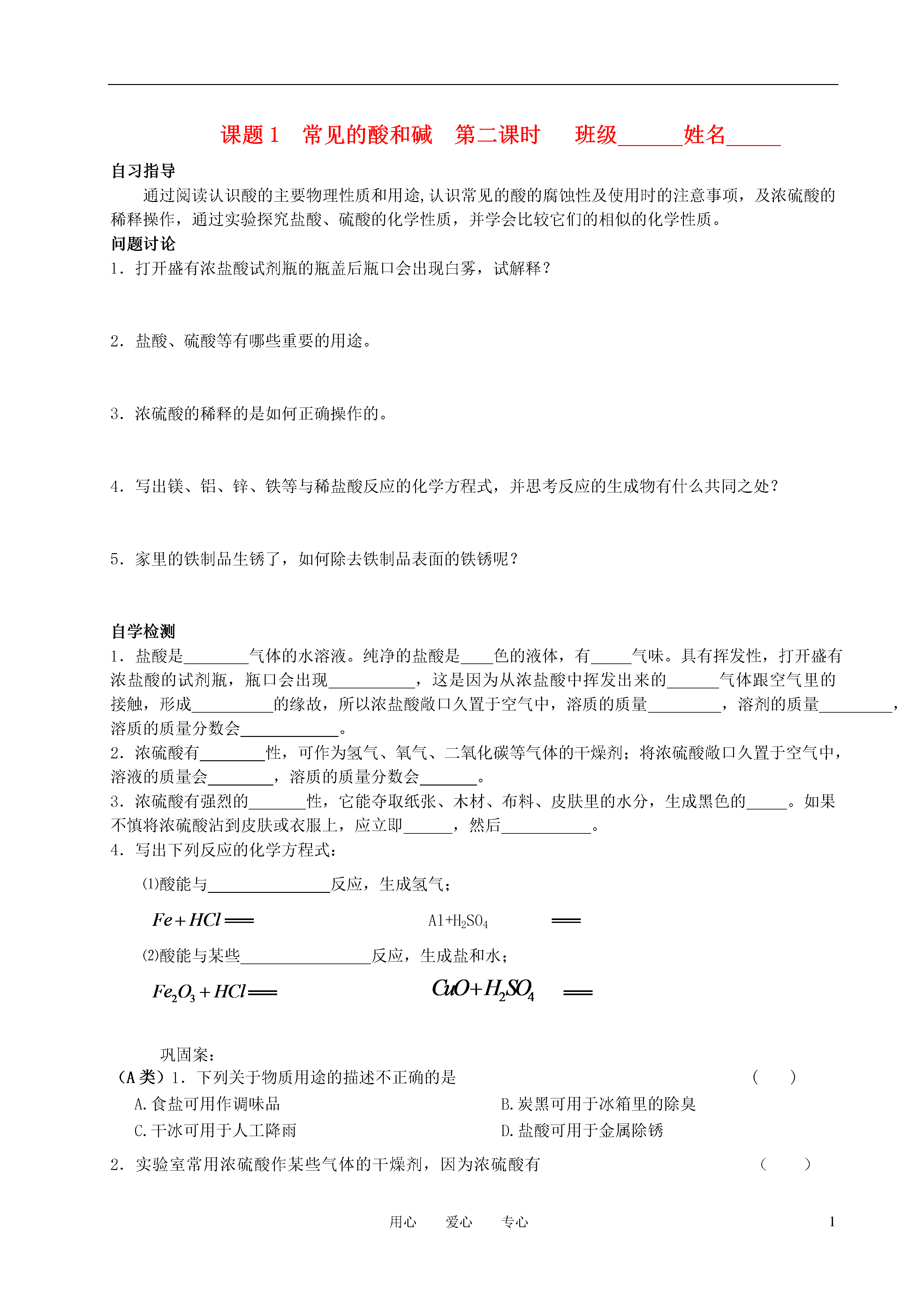 1用心爱心专心课题1常见的酸和碱第二课时班级姓名自习指导通过阅读认识酸的主要物理性质和用途,认识常见的酸的腐蚀性及使用时的注意事项,及浓硫酸的稀释操作,通过实验探究盐酸、硫酸的化学性质,并学会比较它们的相似的化学性质。问题讨论1.打开盛有浓盐酸试剂瓶的瓶盖后瓶口会出现白雾,试解释?2.盐酸、硫酸等有哪些重要的用途。3.浓硫酸的稀释的是如何正确操作的。4.写出镁、铝、锌、铁等与稀盐酸反应的化学方程式,并思考反应的生成物有什么共同之处?5.家里的铁制品生锈了,如何除去铁制品表面的铁锈呢?自学检测1.盐酸是气体的水溶液。纯净的盐酸是色的液体,有气味。具有挥发性,打开盛有浓盐酸的试剂瓶,瓶口会出现,这是因为从浓盐酸中挥发出来的气体跟空气里的接触,形成的缘故,所以浓盐酸敞口久置于空气中,溶质的质量,溶剂的质量,溶质的质量分数会。2.浓硫酸有性,可作为氢气、氧气、二氧化碳等气体的干燥剂;将浓硫酸敞口久置于空气中,溶液的质量会,溶质的质量分数会。3.浓硫酸有强烈的性,它能夺取纸张、木材、布料、皮肤里的水分,生成黑色的。如果不慎将浓硫酸沾到皮肤或衣服上,应立即,然后。4.写出下列反应的化学方程式:⑴酸能与反应,生成氢气;Al+H2S04⑵酸能与某些反应,生成盐和水;巩固案:(A类)1.下列关于物质用途的描述不正确的是()A.食盐可用作调味品B.炭黑可用于冰箱里的除臭C.干冰可用于人工降雨D.盐酸可用于金属除锈2.实验室常用浓硫酸作某些气体的干燥剂,因为浓硫酸有()A.酸性B.吸水性C.腐蚀性BD.氧化性3.盐酸是一种重要的工业用酸,下列关于盐酸的叙述中,错误的是()A.盐酸是氯化氢气体的水溶液B.浓盐酸是黄色有刺激性气味的液体C.人的胃液里含有少量的盐酸,可以帮助消化D.浓盐酸具有挥发性,在空气会产成白雾(B类)4.盛浓硫酸和浓盐酸的两个试剂瓶敞口放置一段时间,则两瓶溶液()A.质量都增加了B.溶质的质量分数都变大了C.溶质的质量分数都变小了D.溶质的质量分数都不变5.下列小实验不能成功的是()A.用食醋制无壳鸡蛋B.用紫卷心菜自制酸碱指示剂C.用活性炭将硬水软化D.用灼烧闻气味的方法区分棉和羊毛6.下列物质既能与水反应,又能与盐酸反应的是()A.CO2B.CaOC.CaCl2D.CaCO37.请回答家庭生活中的问题:(1)除去铁锅中的铁锈应选(填序号):①食盐②白酒③食醋。(2)家里炒菜时油锅着火,最好的灭火方法是。(C类)8.选择H、C、Cl、S、O、Ca五种元素中的适当元素,组成符合下列要求的物质,将化学式填在空格中:(1)能够供给呼吸的气体单质;(2)用于探充空气球的单质气体;(3)最常用的溶剂;(4)能还原铁矿石的氧化物;(5)气体可作温室肥料、固体可用于人工降雨的是________________;(6)实验室中常用的挥发性酸;(7)常用做干燥剂的一种酸;9.在托盘天平两端各放一个烧杯,调节天平至平衡,再向烧杯中各注入相同质量相同质量分数的稀硫酸,然后向左盘烧杯中加入足量的铁;向右盘烧杯中加入相同质量镁,待反应停止后,天平指针的可能指向是_________________________。(通过计算说明)答案:1.B2.B3.B4.C5.C6.B7.③盖上锅盖8.(1)O2(2)H2(3)H2O(4)CO(5)CO2(6)HCl(7)H2SO49.指在中间