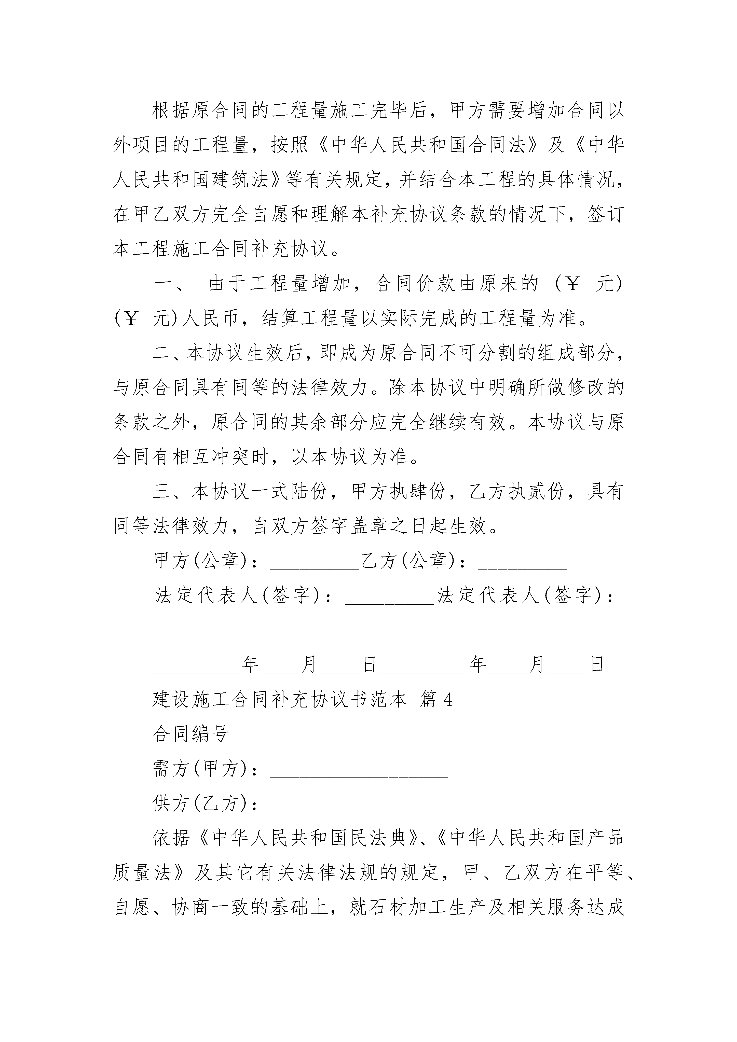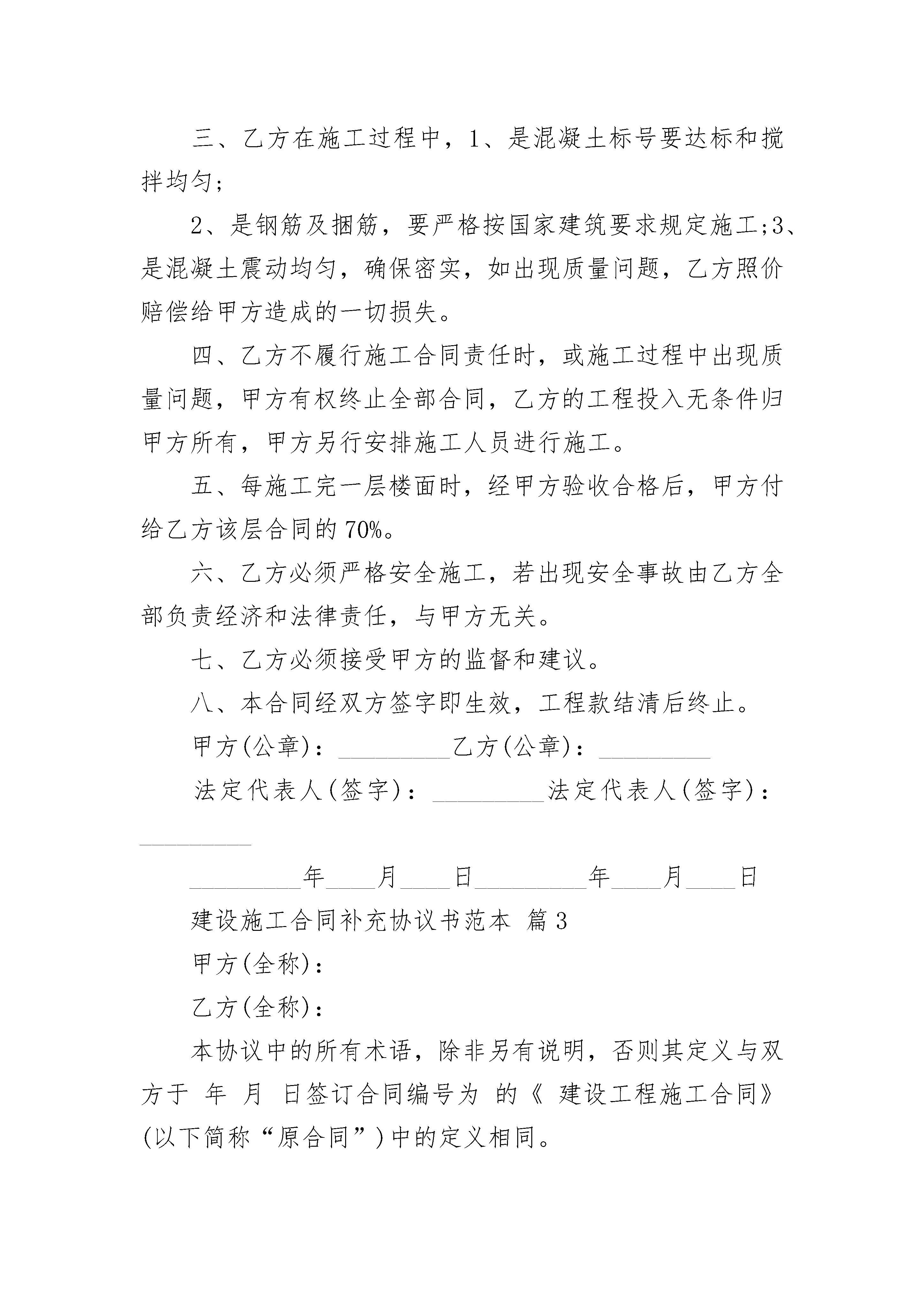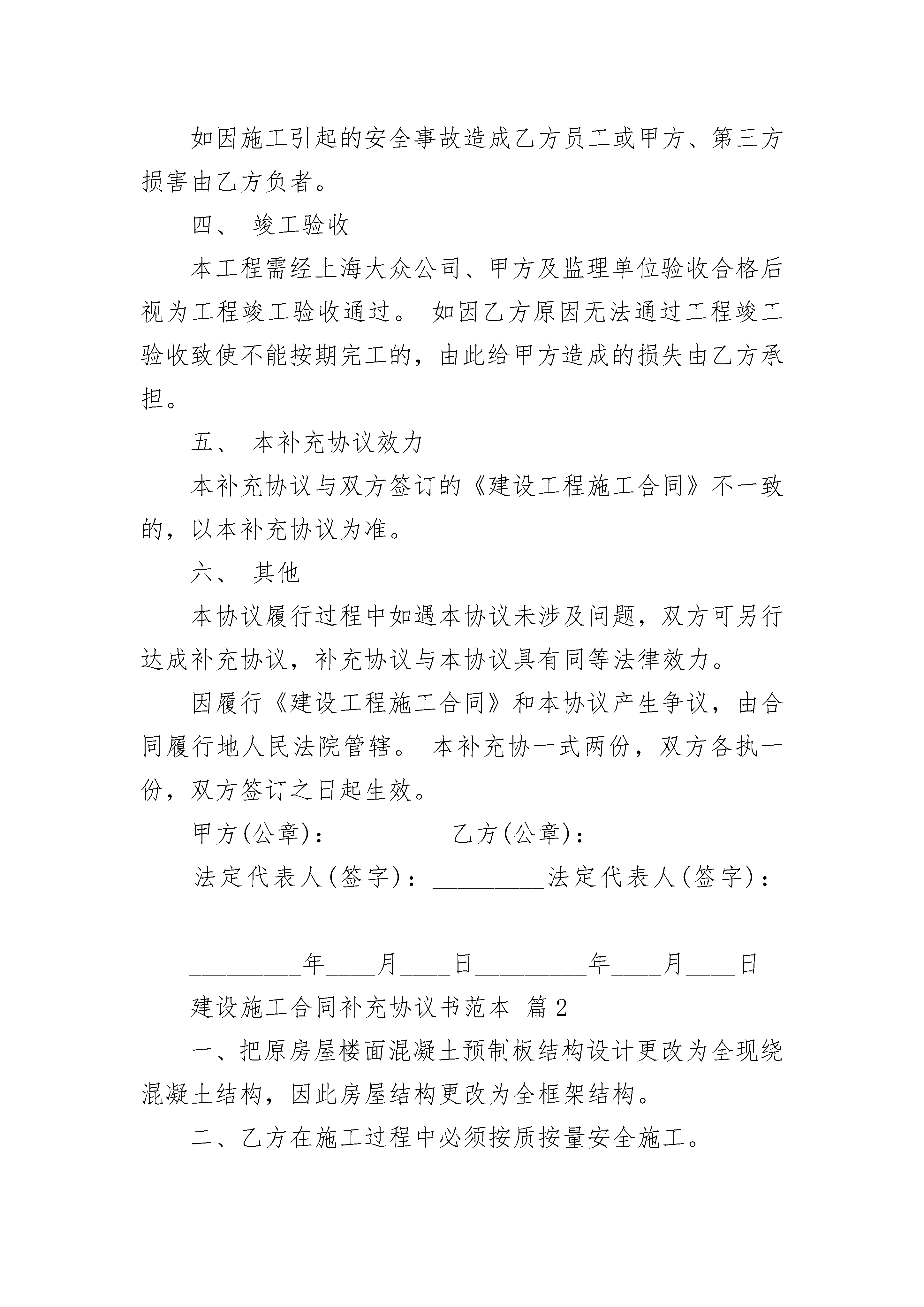 建设施工合同补充协议书范本建设施工合同补充协议书范本(精选22篇)建设施工合同补充协议书范本篇1发包人(全称):(简称甲方)承包人(全称):(简称乙方)甲乙双方现就______年___月___日签订的工程名称为__________________________的建设工程施工合同达成如下补充协议:一、付款方式乙方材料进场后甲方向乙方支付工程款三十万元,施工工程完成50%后甲方支付工程款二十万元,工程完工后甲方支付工程款二十万元,竣工验收合格后甲方支付工程款二十七万元。剩余工程款五万元作为质保金,该质保金于第一年质量保修期满后14天内支付。乙方负责提供正规发票。二、承包方式除按照上海大众规定的《上海大众汽车VW品牌意向特许经销商展厅建设装修材料及配套设施清单》之外,由乙方包工包料,上海大众指定品牌由甲乙共同确认,由乙方购买,费用包含在工程款内。三、施工安全在施工过程中因乙方原因给甲方或其他第三方造成的损失由乙方承担;如因施工引起的安全事故造成乙方员工或甲方、第三方损害由乙方负者。四、竣工验收本工程需经上海大众公司、甲方及监理单位验收合格后视为工程竣工验收通过。如因乙方原因无法通过工程竣工验收致使不能按期完工的,由此给甲方造成的损失由乙方承担。五、本补充协议效力本补充协议与双方签订的《建设工程施工合同》不一致的,以本补充协议为准。六、其他本协议履行过程中如遇本协议未涉及问题,双方可另行达成补充协议,补充协议与本协议具有同等法律效力。因履行《建设工程施工合同》和本协议产生争议,由合同履行地人民法院管辖。本补充协一式两份,双方各执一份,双方签订之日起生效。甲方(公章):_________乙方(公章):_________法定代表人(签字):_________法定代表人(签字):__________________年____月____日_________年____月____日建设施工合同补充协议书范本篇2一、把原房屋楼面混凝土预制板结构设计更改为全现绕混凝土结构,因此房屋结构更改为全框架结构。二、乙方在施工过程中必须按质按量安全施工。三、乙方在施工过程中,1、是混凝土标号要达标和搅拌均匀;2、是钢筋及捆筋,要严格按国家建筑要求规定施工;3、是混凝土震动均匀,确保密实,如出现质量问题,乙方照价赔偿给甲方造成的一切损失。四、乙方不履行施工合同责任时,或施工过程中出现质量问题,甲方有权终止全部合同,乙方的工程投入无条件归甲方所有,甲方另行安排施工人员进行施工。五、每施工完一层楼面时,经甲方验收合格后,甲方付给乙方该层合同的70%。六、乙方必须严格安全施工,若出现安全事故由乙方全部负责经济和法律责任,与甲方无关。七、乙方必须接受甲方的监督和建议。八、本合同经双方签字即生效,工程款结清后终止。甲方(公章):_________乙方(公章):_________法定代表人(签字):_________法定代表人(签字):__________________年____月____日_________年____月____日建设施工合同补充协议书范本篇3甲方(全称):乙方(全称):本协议中的所有术语,除非另有说明,否则其定义与双方于年月日签订合同编号为的《建设工程施工合同》(以下简称“原合同”)中的定义相同。根据原合同的工程量施工完毕后,甲方需要增加合同以外项目的工程量,按照《中华人民共和国合同法》及《中华人民共和国建筑法》等有关规定,并结合本工程的具体情况,在甲乙双方完全自愿和理解本补充协议条款的情况下,签订本工程施工合同补充协议。一、由于工程量增加,合同价款由原来的(¥元)(¥元)人民币,结算工程量以实际完成的工程量为准。二、本协议生效后,即成为原合同不可分割的组成部分,与原合同具有同等的法律效力。除本协议中明确所做修改的条款之外,原合同的其余部分应完全继续有效。本协议与原合同有相互冲突时,以本协议为准。三、本协议一式陆份,甲方执肆份,乙方执贰份,具有同等法律效力,自双方签字盖章之日起生效。甲方(公章):_________乙方(公章):_________法定代表人(签字):_________法定代表人(签字):__________________年____月____日_________年____月____日建设施工合同补充协议书范本篇4合同编号_________需方(甲方):__________________供方(乙方):__________________依据《中华人民共和国民法典》、《中华人民共和国产品质量法》及其它有关法律法规的规定,甲、乙双方在平等、自愿、协商一致的基础上,就石材加工生产及相关服务达成如下协议。第一条石材供料1.甲方委托乙方加工:___________________________。(石材)详见附件《石材供料单》。2.石材供料时