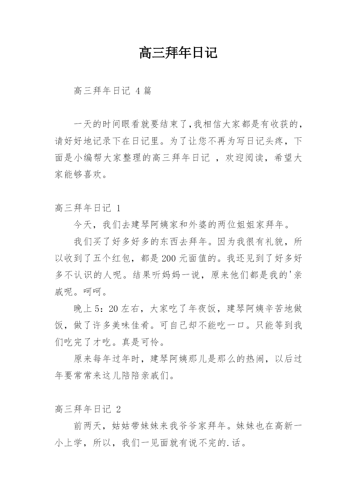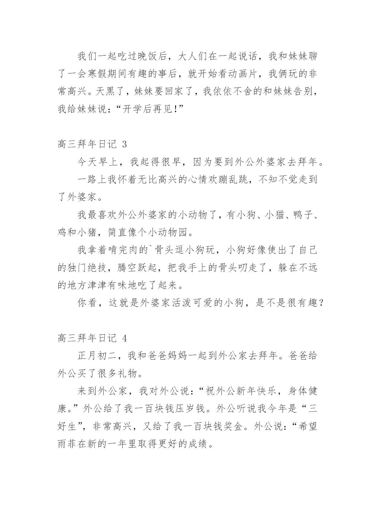 高三拜年日记 高三拜年日记4篇一天的时间眼看就要结束了,我相信大家都是有收获的,请好好地记录下在日记里。为了让您不再为写日记头疼,下面是小编帮大家整理的高三拜年日记,欢迎阅读,希望大家能够喜欢。高三拜年日记1今天,我们去建琴阿姨家和外婆的两位姐姐家拜年。我们买了好多好多的东西去拜年。因为我很有礼貌,所以收到了五个红包,都是200元面值的。我还见到了好多好多不认识的人呢。结果听妈妈一说,原来他们都是我的'亲戚呢。呵呵。晚上5:20左右,大家吃了年夜饭,建琴阿姨辛苦地做饭,做了许多美味佳肴。可自己却不能吃一口。只能等到我们吃完了才吃。真是可怜。原来每年过年时,建琴阿姨那儿是那么的热闹,以后过年要常常来这儿陪陪亲戚们。高三拜年日记2前两天,姑姑带妹妹来我爷爷家拜年。妹妹也在高新一小上学,所以,我们一见面就有说不完的.话。我们一起吃过晚饭后,大人们在一起说话,我和妹妹聊了一会寒假期间有趣的事后,就开始看动画片,我俩玩的非常高兴。天黒了,妹妹要回家了,我依依不舍的和妹妹告别,我给妹妹说:“开学后再见!”高三拜年日记3今天早上,我起得很早,因为要到外公外婆家去拜年。一路上我怀着无比高兴的心情欢蹦乱跳,不知不觉走到了外婆家。我最喜欢外公外婆家的小动物了,有小狗、小猫、鸭子、鸡和小猪,简直像个小动物园。我拿着啃完肉的`骨头逗小狗玩,小狗好像使出了自己的独门绝技,腾空跃起,把我手上的骨头叨走了,躲在不远的地方津津有味地吃了起来。你看,这就是外婆家活泼可爱的小狗,是不是很有趣?高三拜年日记4正月初二,我和爸爸妈妈一起到外公家去拜年。爸爸给外公买了很多礼物。来到外公家,我对外公说:“祝外公新年快乐,身体健康。”外公给了我一百块钱压岁钱。外公听说我今年是“三好生”,非常高兴,又给了我一百块钱奖金。外公说:“希望雨菲在新的一年里取得更好的成绩。