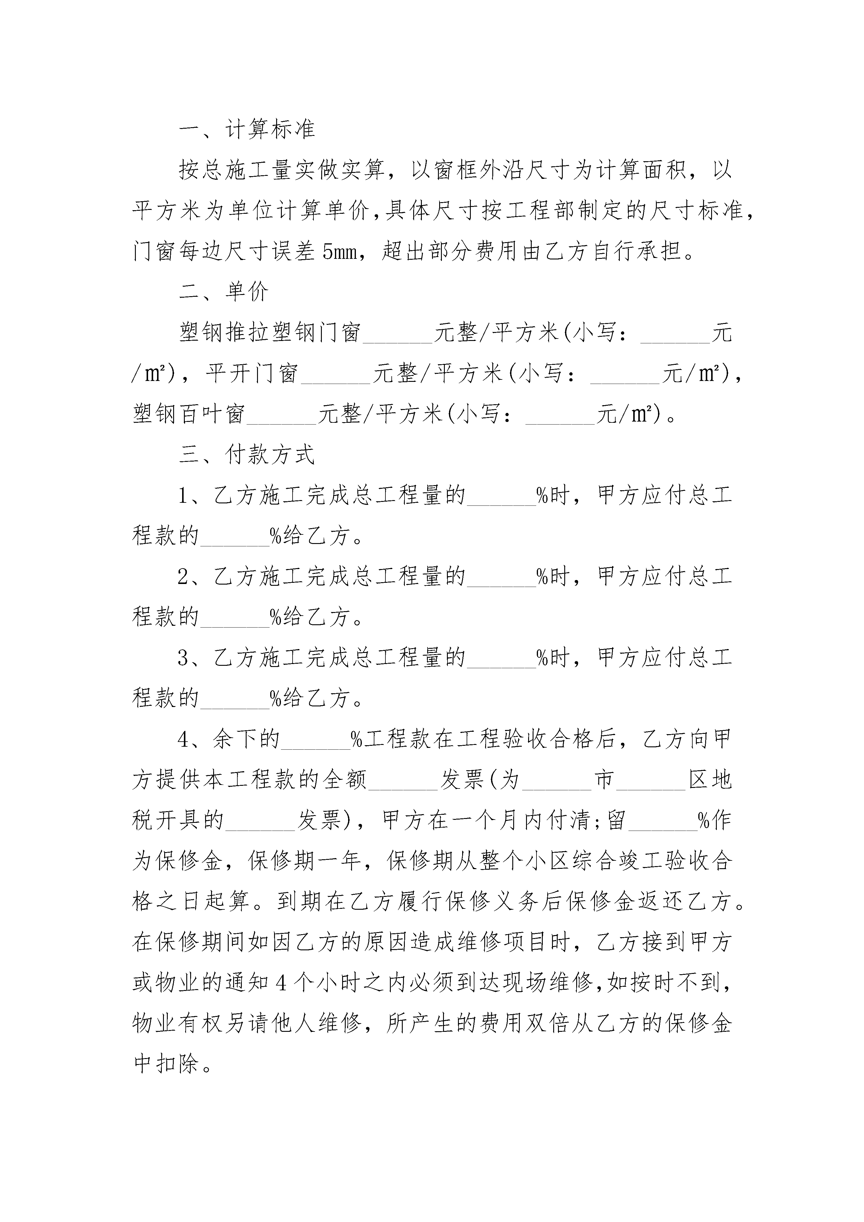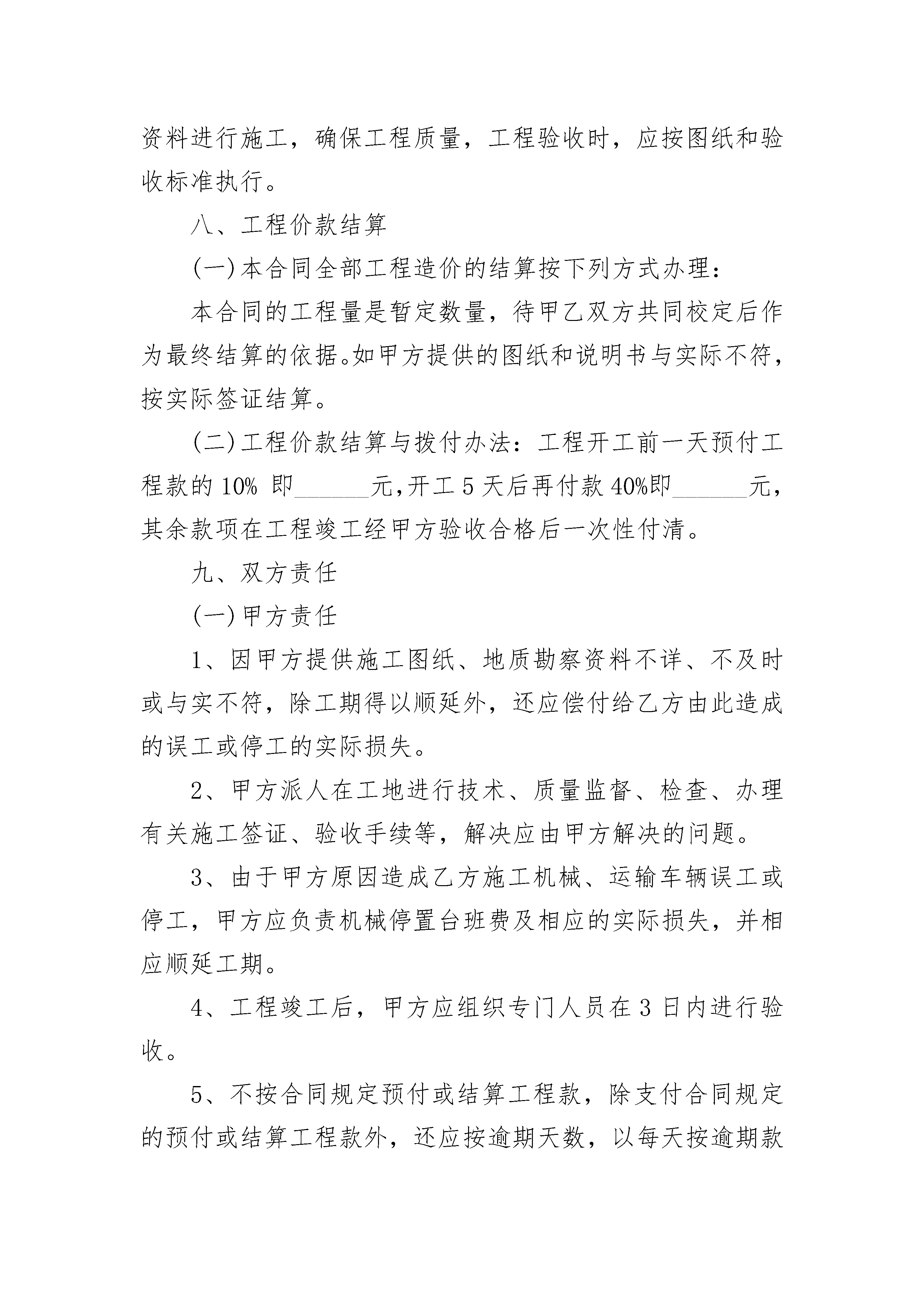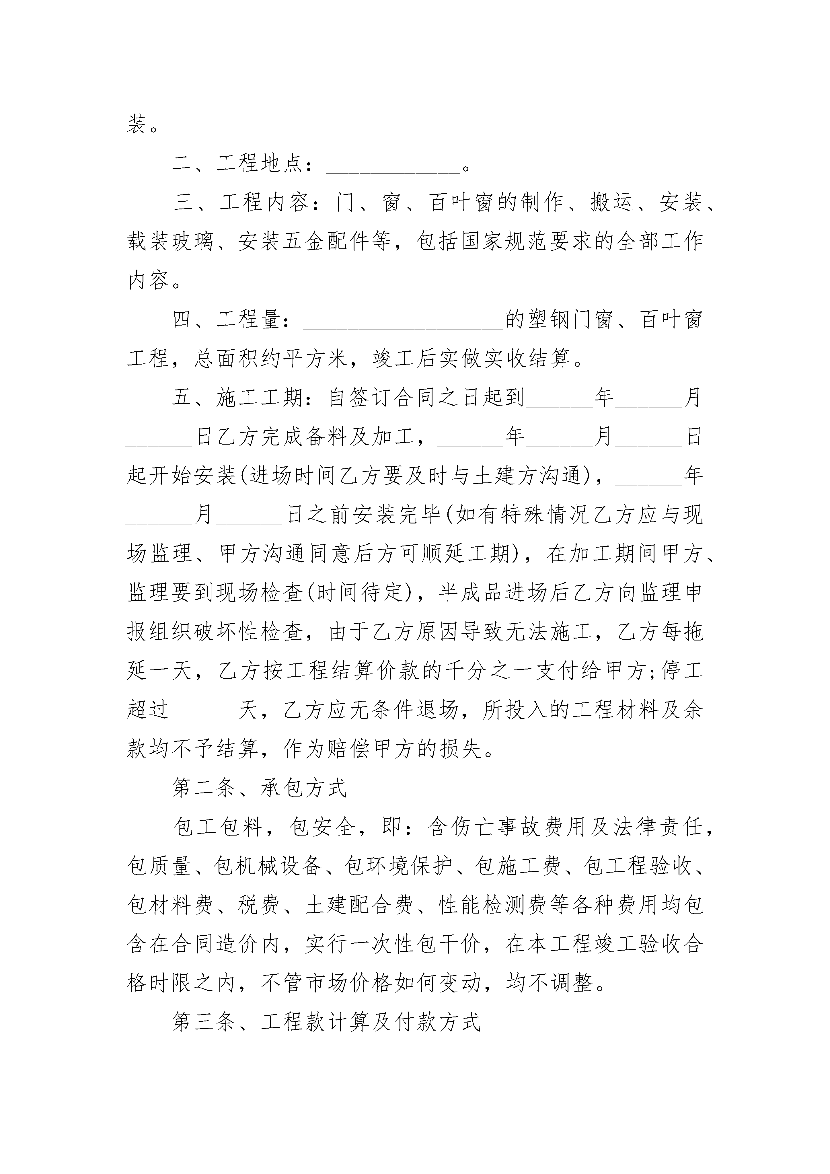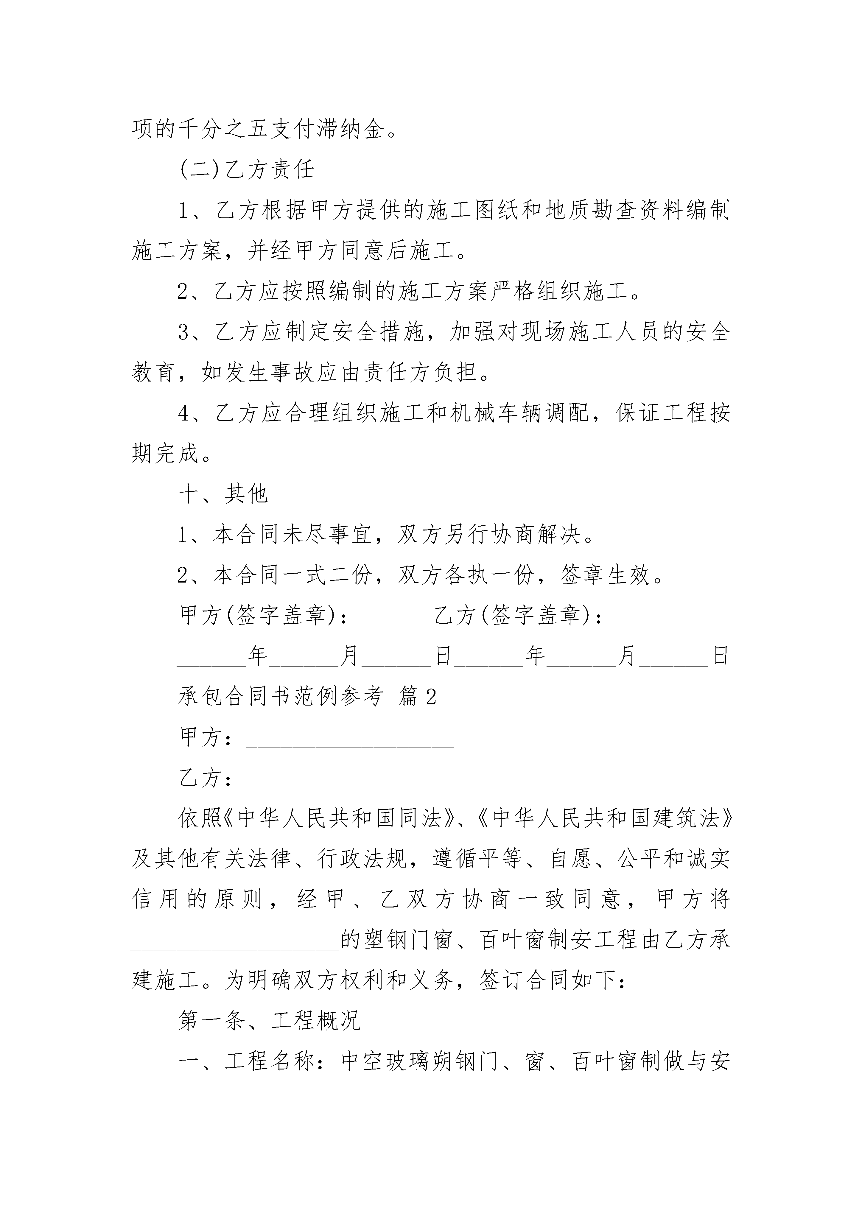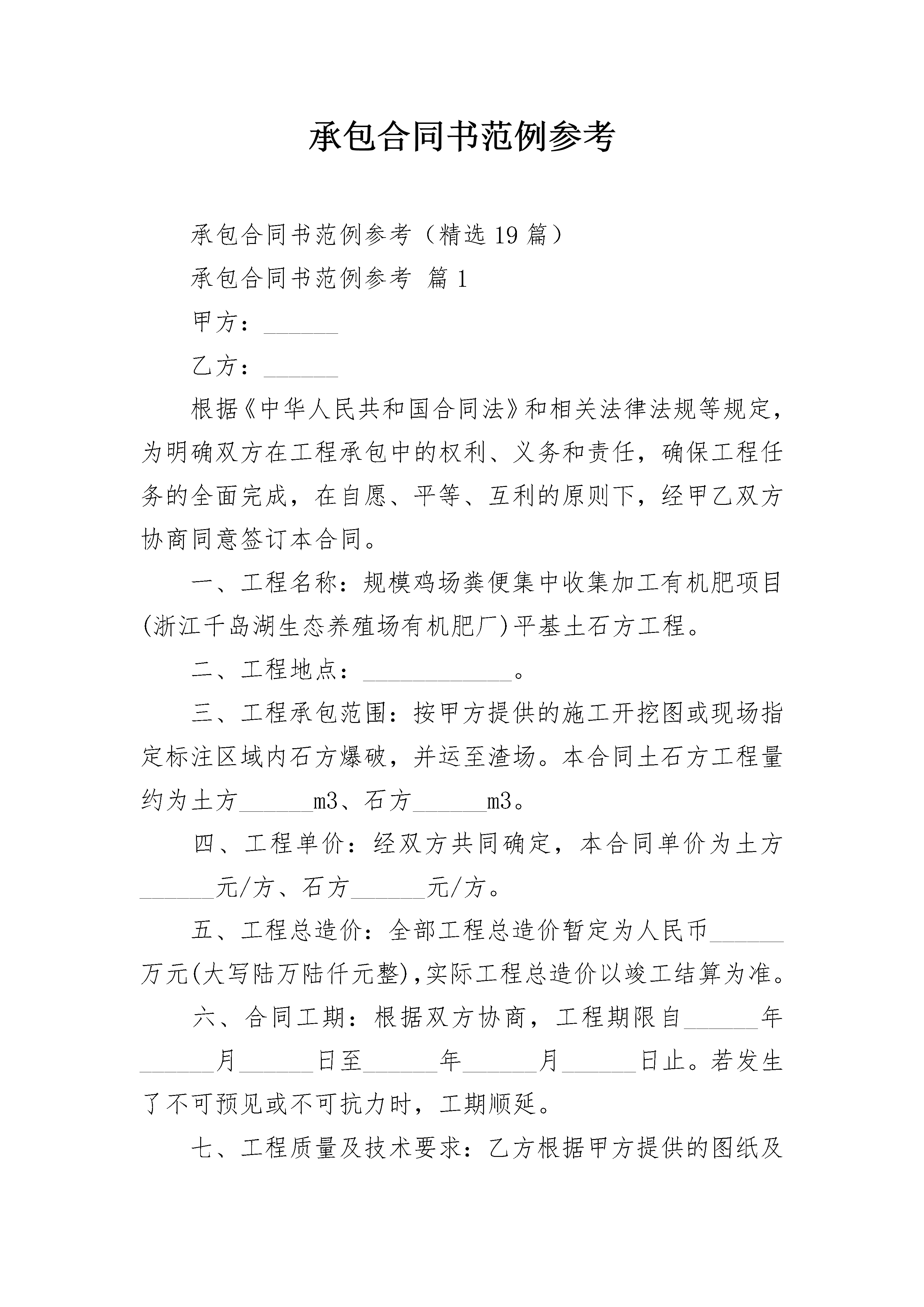 承包合同书范例参考承包合同书范例参考(精选19篇)承包合同书范例参考篇1甲方:______乙方:______根据《中华人民共和国合同法》和相关法律法规等规定,为明确双方在工程承包中的权利、义务和责任,确保工程任务的全面完成,在自愿、平等、互利的原则下,经甲乙双方协商同意签订本合同。一、工程名称:规模鸡场粪便集中收集加工有机肥项目(浙江千岛湖生态养殖场有机肥厂)平基土石方工程。二、工程地点:____________。三、工程承包范围:按甲方提供的施工开挖图或现场指定标注区域内石方爆破,并运至渣场。本合同土石方工程量约为土方______m3、石方______m3。四、工程单价:经双方共同确定,本合同单价为土方______元/方、石方______元/方。五、工程总造价:全部工程总造价暂定为人民币______万元(大写陆万陆仟元整),实际工程总造价以竣工结算为准。六、合同工期:根据双方协商,工程期限自______年______月______日至______年______月______日止。若发生了不可预见或不可抗力时,工期顺延。七、工程质量及技术要求:乙方根据甲方提供的图纸及资料进行施工,确保工程质量,工程验收时,应按图纸和验收标准执行。八、工程价款结算(一)本合同全部工程造价的结算按下列方式办理:本合同的工程量是暂定数量,待甲乙双方共同校定后作为最终结算的依据。如甲方提供的图纸和说明书与实际不符,按实际签证结算。(二)工程价款结算与拨付办法:工程开工前一天预付工程款的10%即______元,开工5天后再付款40%即______元,其余款项在工程竣工经甲方验收合格后一次性付清。九、双方责任(一)甲方责任1、因甲方提供施工图纸、地质勘察资料不详、不及时或与实不符,除工期得以顺延外,还应偿付给乙方由此造成的误工或停工的实际损失。2、甲方派人在工地进行技术、质量监督、检查、办理有关施工签证、验收手续等,解决应由甲方解决的问题。3、由于甲方原因造成乙方施工机械、运输车辆误工或停工,甲方应负责机械停置台班费及相应的实际损失,并相应顺延工期。4、工程竣工后,甲方应组织专门人员在3日内进行验收。5、不按合同规定预付或结算工程款,除支付合同规定的预付或结算工程款外,还应按逾期天数,以每天按逾期款项的千分之五支付滞纳金。(二)乙方责任1、乙方根据甲方提供的施工图纸和地质勘查资料编制施工方案,并经甲方同意后施工。2、乙方应按照编制的施工方案严格组织施工。3、乙方应制定安全措施,加强对现场施工人员的安全教育,如发生事故应由责任方负担。4、乙方应合理组织施工和机械车辆调配,保证工程按期完成。十、其他1、本合同未尽事宜,双方另行协商解决。2、本合同一式二份,双方各执一份,签章生效。甲方(签字盖章):______乙方(签字盖章):____________年______月______日______年______月______日承包合同书范例参考篇2甲方:__________________乙方:__________________依照《中华人民共和国同法》、《中华人民共和国建筑法》及其他有关法律、行政法规,遵循平等、自愿、公平和诚实信用的原则,经甲、乙双方协商一致同意,甲方将__________________的塑钢门窗、百叶窗制安工程由乙方承建施工。为明确双方权利和义务,签订合同如下:第一条、工程概况一、工程名称:中空玻璃朔钢门、窗、百叶窗制做与安装。二、工程地点:____________。三、工程内容:门、窗、百叶窗的制作、搬运、安装、载装玻璃、安装五金配件等,包括国家规范要求的全部工作内容。四、工程量:__________________的塑钢门窗、百叶窗工程,总面积约平方米,竣工后实做实收结算。五、施工工期:自签订合同之日起到______年______月______日乙方完成备料及加工,______年______月______日起开始安装(进场时间乙方要及时与土建方沟通),______年______月______日之前安装完毕(如有特殊情况乙方应与现场监理、甲方沟通同意后方可顺延工期),在加工期间甲方、监理要到现场检查(时间待定),半成品进场后乙方向监理申报组织破坏性检查,由于乙方原因导致无法施工,乙方每拖延一天,乙方按工程结算价款的千分之一支付给甲方;停工超过______天,乙方应无条件退场,所投入的工程材料及余款均不予结算,作为赔偿甲方的损失。第二条、承包方式包工包料,包安全,即:含伤亡事故费用及法律责任,包质量、包机械设备、包环境保护、包施工费、包工程验收、包材料费、税费、土建配合费、性能检测费等各种费用均包含在合同造价内,实行一次性包干价,在本工程竣工验收合格时限之内,不管市场价格如何变动,均不调整。第三条、工程款计算及付款方式一、计算标准按总