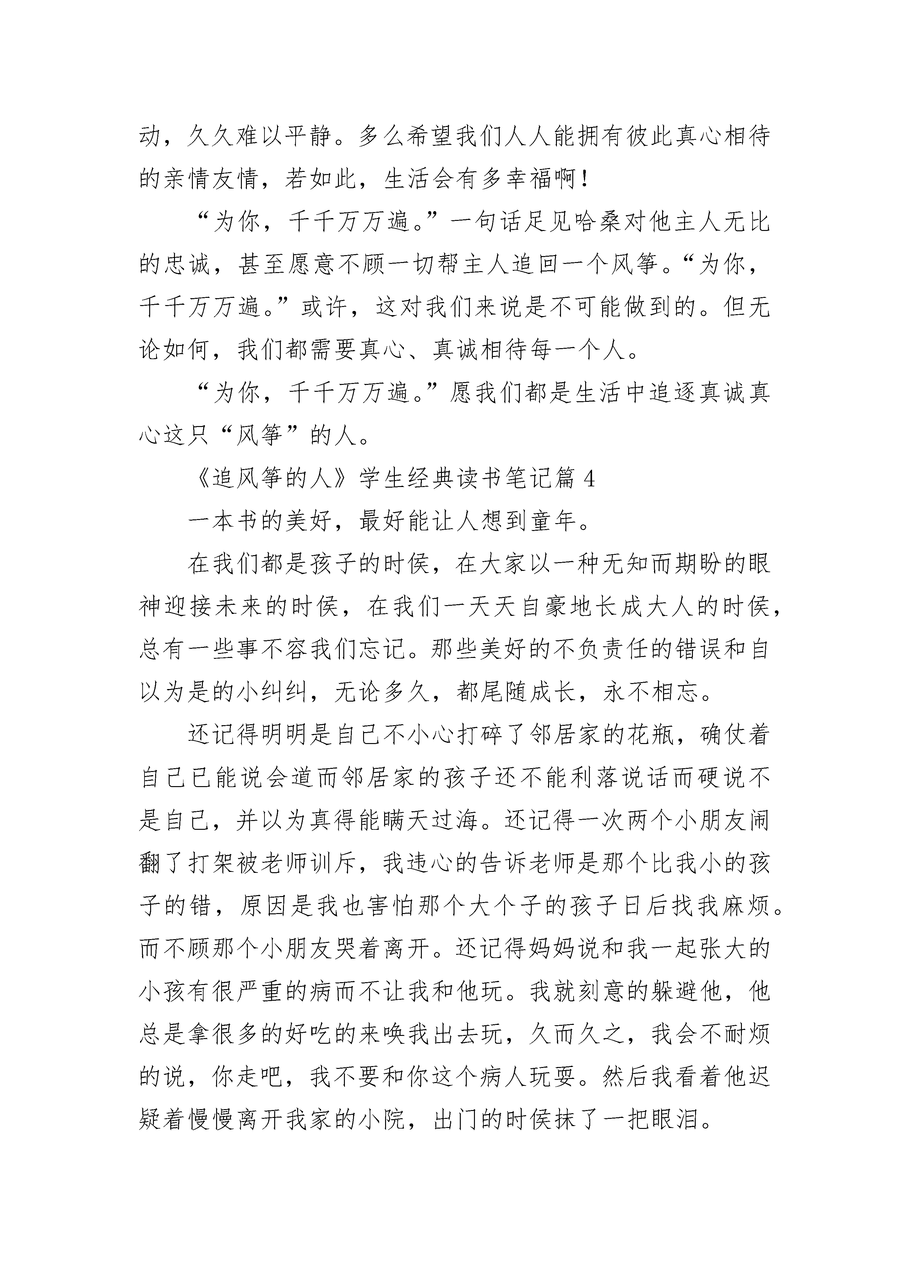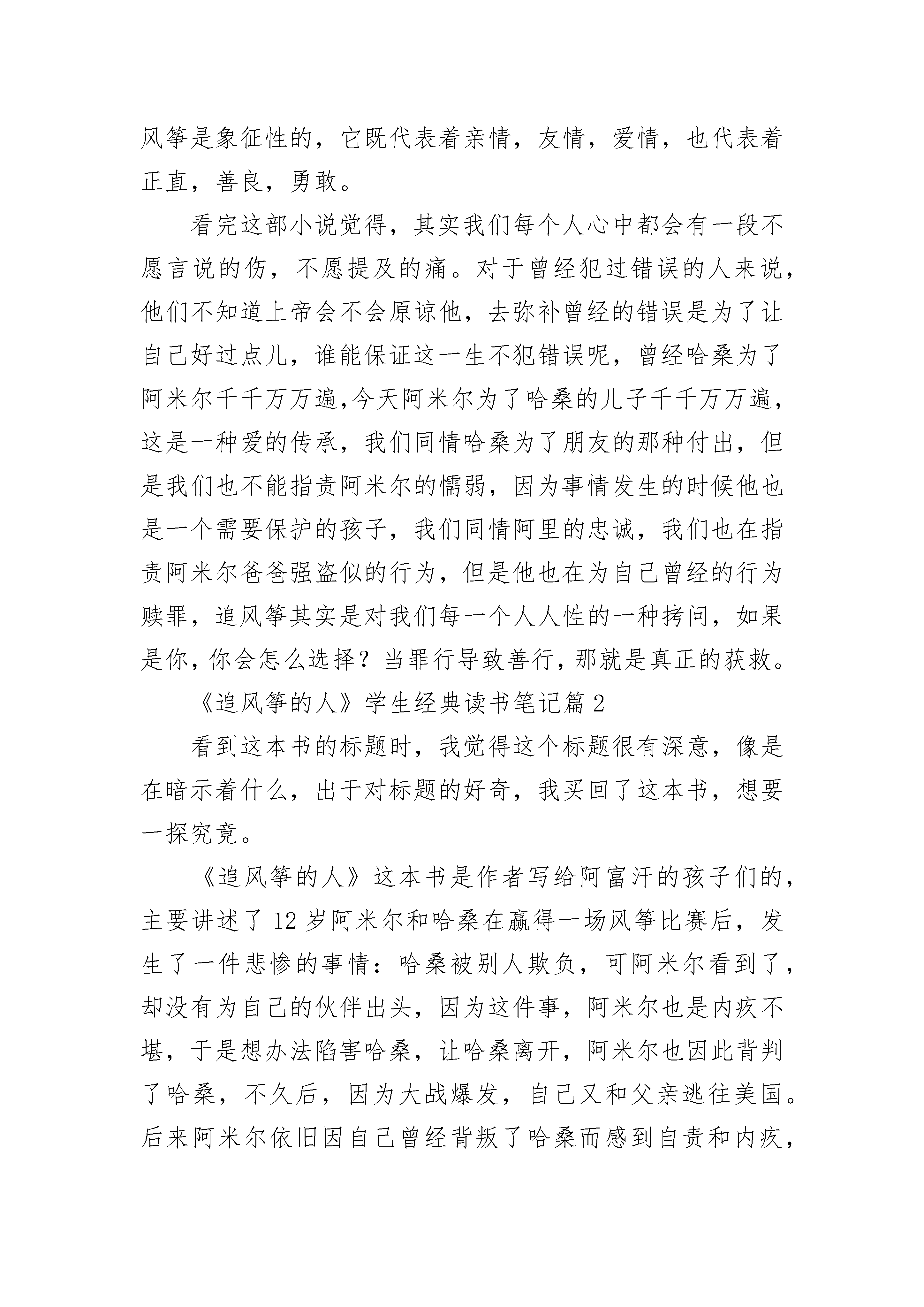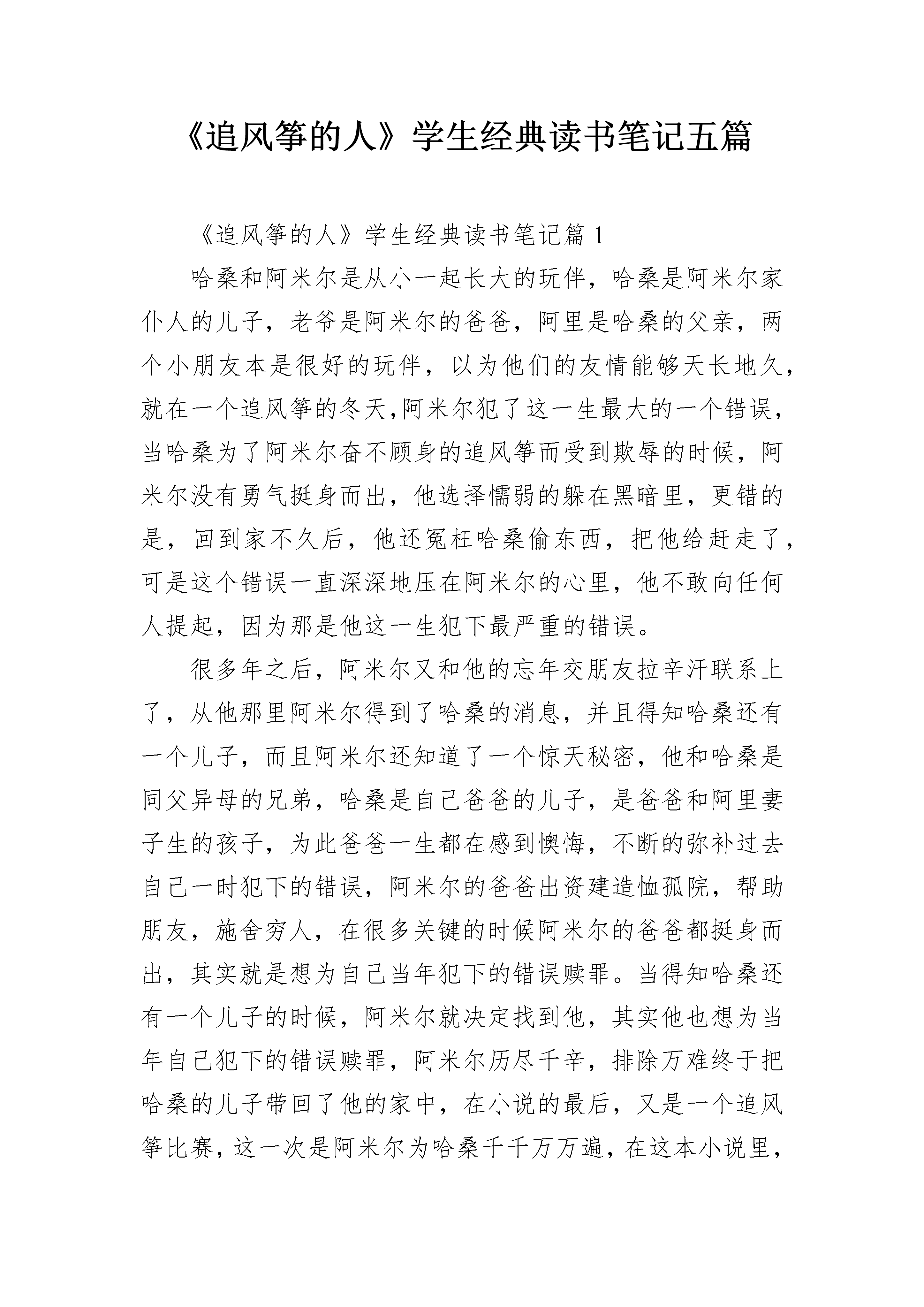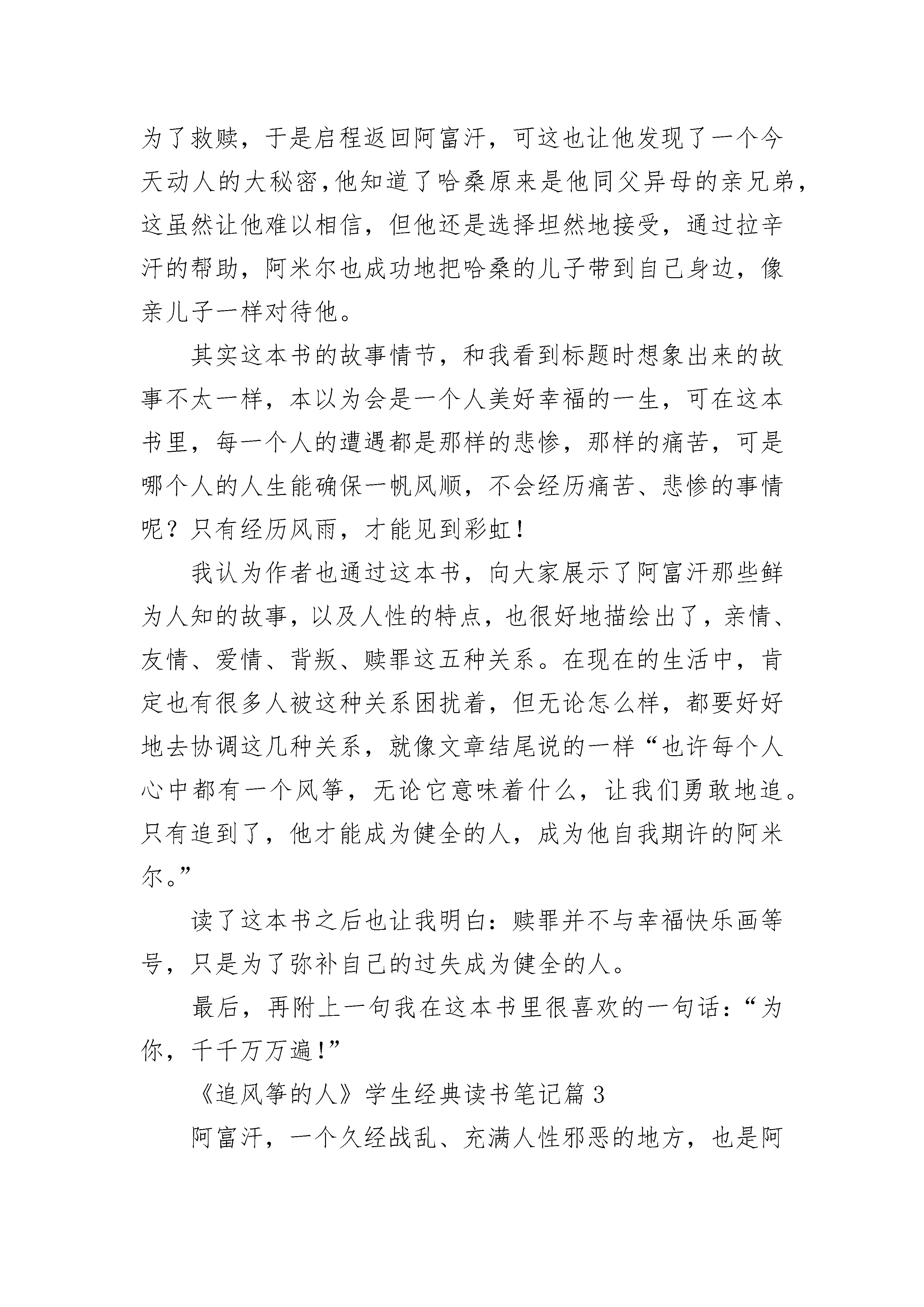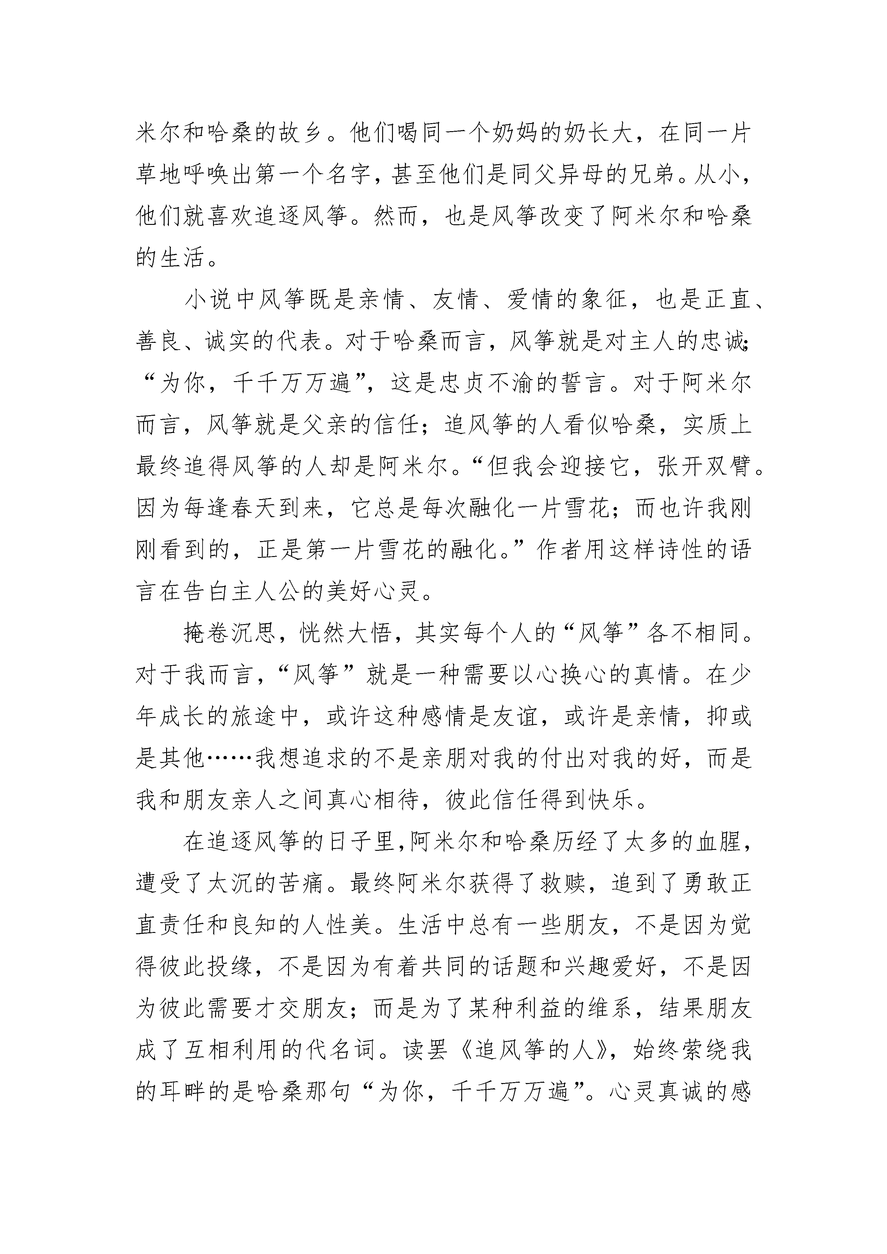 《追风筝的人》学生经典读书笔记五篇《追风筝的人》学生经典读书笔记篇1哈桑和阿米尔是从小一起长大的玩伴,哈桑是阿米尔家仆人的儿子,老爷是阿米尔的爸爸,阿里是哈桑的父亲,两个小朋友本是很好的玩伴,以为他们的友情能够天长地久,就在一个追风筝的冬天,阿米尔犯了这一生最大的一个错误,当哈桑为了阿米尔奋不顾身的追风筝而受到欺辱的时候,阿米尔没有勇气挺身而出,他选择懦弱的躲在黑暗里,更错的是,回到家不久后,他还冤枉哈桑偷东西,把他给赶走了,可是这个错误一直深深地压在阿米尔的心里,他不敢向任何人提起,因为那是他这一生犯下最严重的错误。很多年之后,阿米尔又和他的忘年交朋友拉辛汗联系上了,从他那里阿米尔得到了哈桑的消息,并且得知哈桑还有一个儿子,而且阿米尔还知道了一个惊天秘密,他和哈桑是同父异母的兄弟,哈桑是自己爸爸的儿子,是爸爸和阿里妻子生的孩子,为此爸爸一生都在感到懊悔,不断的弥补过去自己一时犯下的错误,阿米尔的爸爸出资建造恤孤院,帮助朋友,施舍穷人,在很多关键的时候阿米尔的爸爸都挺身而出,其实就是想为自己当年犯下的错误赎罪。当得知哈桑还有一个儿子的时候,阿米尔就决定找到他,其实他也想为当年自己犯下的错误赎罪,阿米尔历尽千辛,排除万难终于把哈桑的儿子带回了他的家中,在小说的最后,又是一个追风筝比赛,这一次是阿米尔为哈桑千千万万遍,在这本小说里,风筝是象征性的,它既代表着亲情,友情,爱情,也代表着正直,善良,勇敢。看完这部小说觉得,其实我们每个人心中都会有一段不愿言说的伤,不愿提及的痛。对于曾经犯过错误的人来说,他们不知道上帝会不会原谅他,去弥补曾经的错误是为了让自己好过点儿,谁能保证这一生不犯错误呢,曾经哈桑为了阿米尔千千万万遍,今天阿米尔为了哈桑的儿子千千万万遍,这是一种爱的传承,我们同情哈桑为了朋友的那种付出,但是我们也不能指责阿米尔的懦弱,因为事情发生的时候他也是一个需要保护的孩子,我们同情阿里的忠诚,我们也在指责阿米尔爸爸强盗似的行为,但是他也在为自己曾经的行为赎罪,追风筝其实是对我们每一个人人性的一种拷问,如果是你,你会怎么选择?当罪行导致善行,那就是真正的获救。《追风筝的人》学生经典读书笔记篇2看到这本书的标题时,我觉得这个标题很有深意,像是在暗示着什么,出于对标题的好奇,我买回了这本书,想要一探究竟。《追风筝的人》这本书是作者写给阿富汗的孩子们的,主要讲述了12岁阿米尔和哈桑在赢得一场风筝比赛后,发生了一件悲惨的事情:哈桑被别人欺负,可阿米尔看到了,却没有为自己的伙伴出头,因为这件事,阿米尔也是内疚不堪,于是想办法陷害哈桑,让哈桑离开,阿米尔也因此背判了哈桑,不久后,因为大战爆发,自己又和父亲逃往美国。后来阿米尔依旧因自己曾经背叛了哈桑而感到自责和内疚,为了救赎,于是启程返回阿富汗,可这也让他发现了一个今天动人的大秘密,他知道了哈桑原来是他同父异母的亲兄弟,这虽然让他难以相信,但他还是选择坦然地接受,通过拉辛汗的帮助,阿米尔也成功地把哈桑的儿子带到自己身边,像亲儿子一样对待他。其实这本书的故事情节,和我看到标题时想象出来的故事不太一样,本以为会是一个人美好幸福的一生,可在这本书里,每一个人的遭遇都是那样的悲惨,那样的痛苦,可是哪个人的人生能确保一帆风顺,不会经历痛苦、悲惨的事情呢?只有经历风雨,才能见到彩虹!我认为作者也通过这本书,向大家展示了阿富汗那些鲜为人知的故事,以及人性的特点,也很好地描绘出了,亲情、友情、爱情、背叛、赎罪这五种关系。在现在的生活中,肯定也有很多人被这种关系困扰着,但无论怎么样,都要好好地去协调这几种关系,就像文章结尾说的一样“也许每个人心中都有一个风筝,无论它意味着什么,让我们勇敢地追。只有追到了,他才能成为健全的人,成为他自我期许的阿米尔。”读了这本书之后也让我明白:赎罪并不与幸福快乐画等号,只是为了弥补自己的过失成为健全的人。最后,再附上一句我在这本书里很喜欢的一句话:“为你,千千万万遍!”《追风筝的人》学生经典读书笔记篇3阿富汗,一个久经战乱、充满人性邪恶的地方,也是阿米尔和哈桑的故乡。他们喝同一个奶妈的奶长大,在同一片草地呼唤出第一个名字,甚至他们是同父异母的兄弟。从小,他们就喜欢追逐风筝。然而,也是风筝改变了阿米尔和哈桑的生活。小说中风筝既是亲情、友情、爱情的象征,也是正直、善良、诚实的代表。对于哈桑而言,风筝就是对主人的忠诚;“为你,千千万万遍”,这是忠贞不渝的誓言。对于阿米尔而言,风筝就是父亲的信任;追风筝的人看似哈桑,实质上最终追得风筝的人却是阿米尔。“但我会迎接它,张开双臂。因为每逢春天到来,它总是每次融化一片雪花;而也许我刚刚看到的,正是第一片雪花的融化。”作者用这样诗性的语言在告白主人公的美好心灵。掩卷沉思,恍然大悟,其实每个人的“风筝”各不相同。对于我而言,“风筝”就是一种需