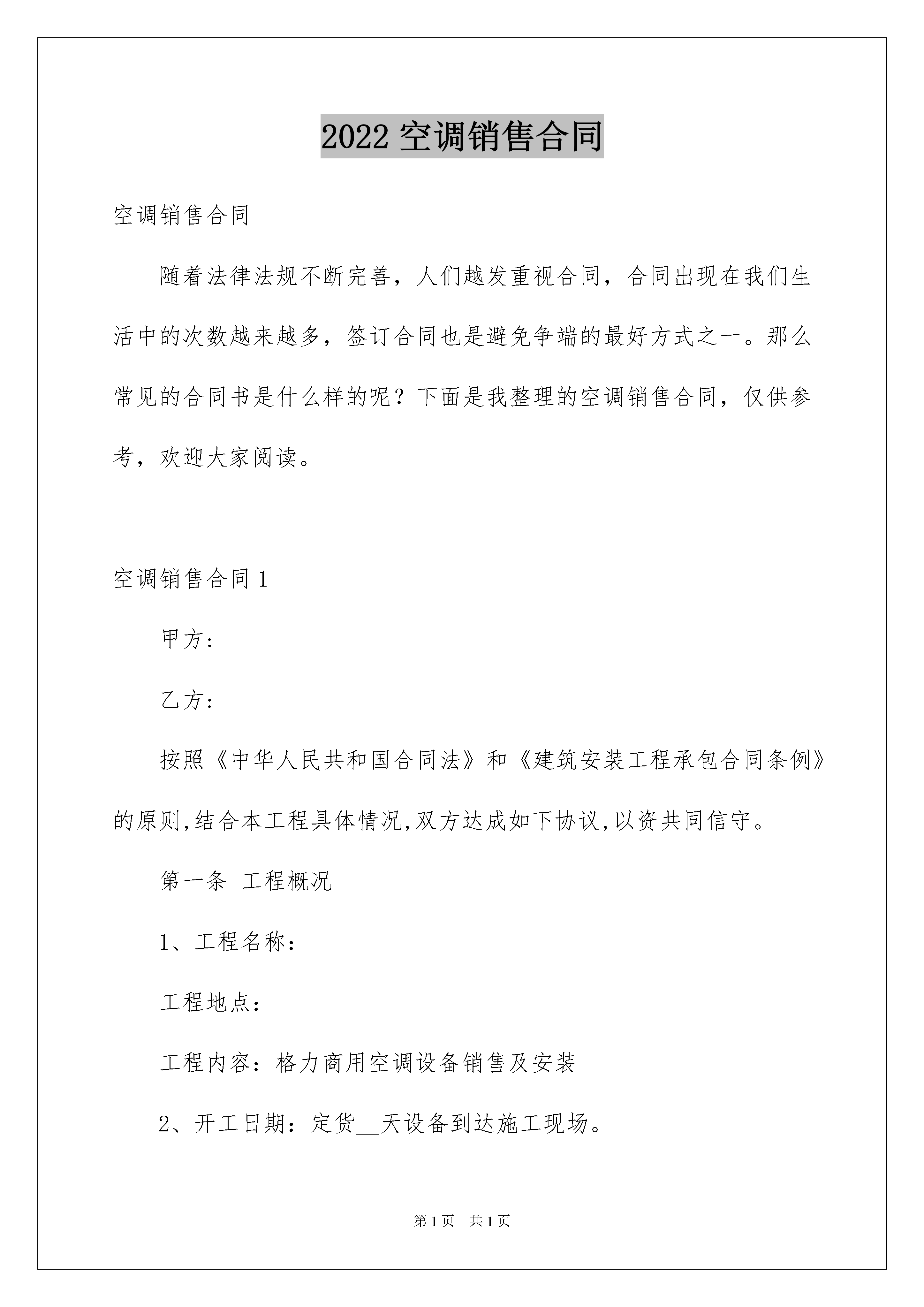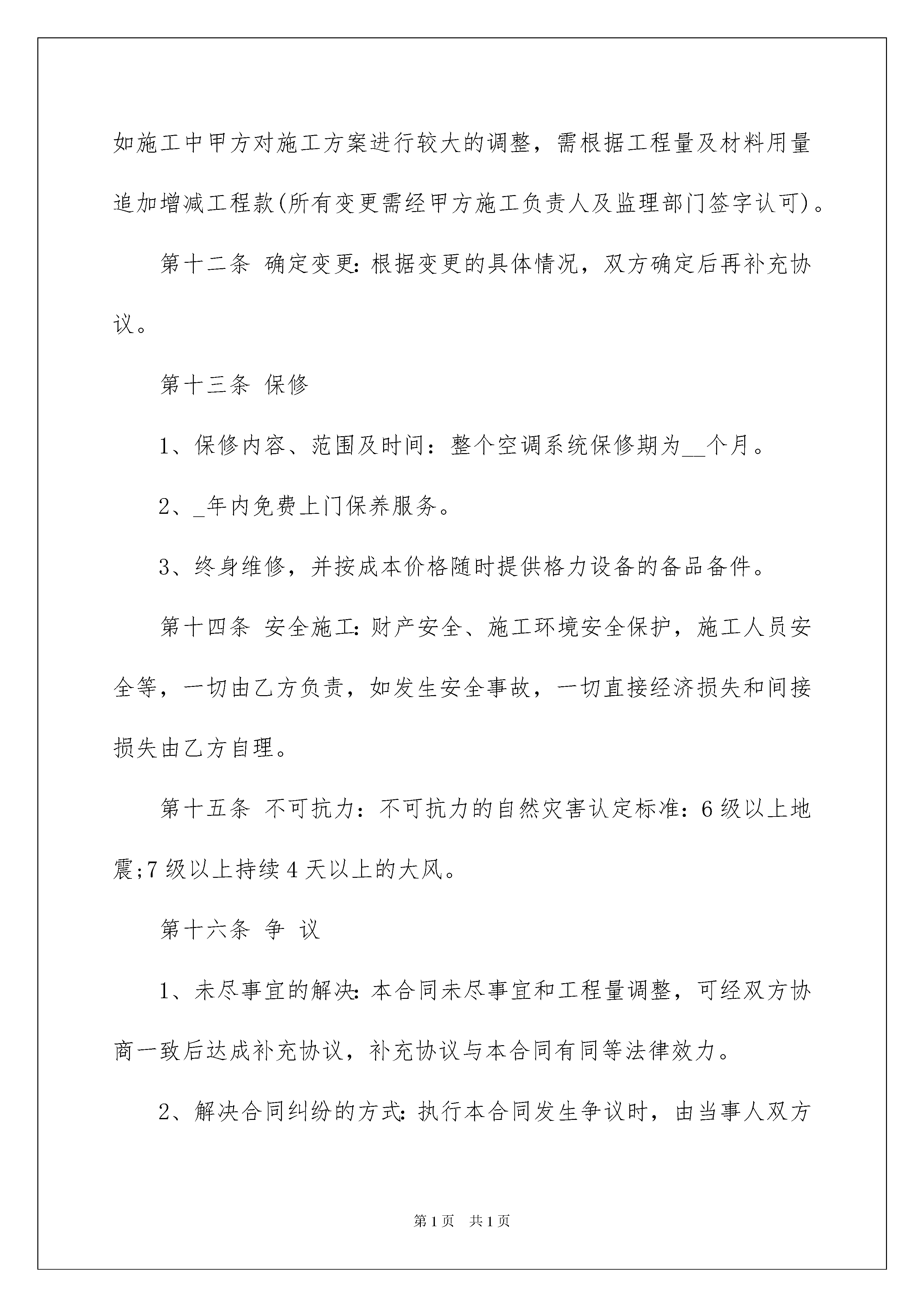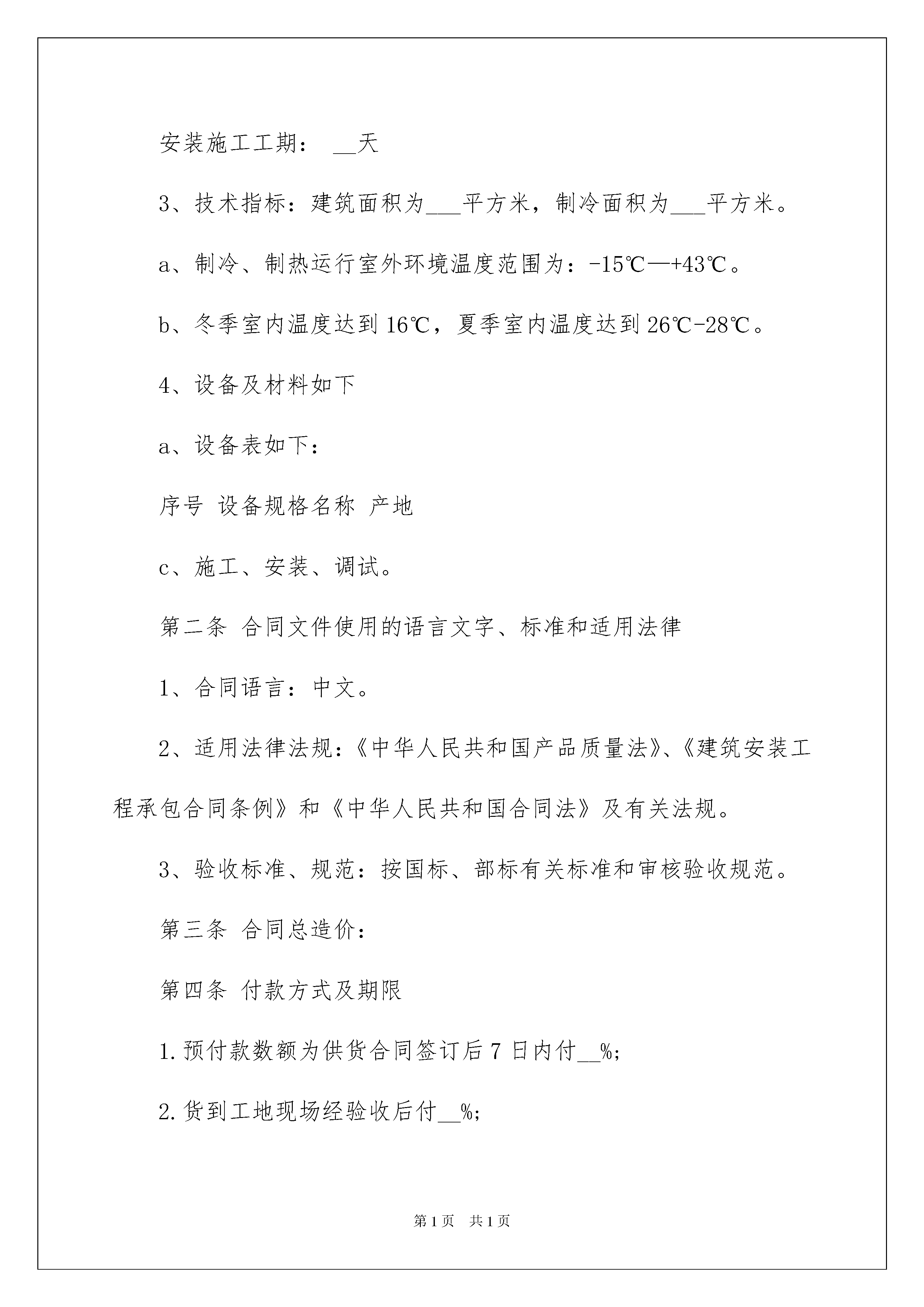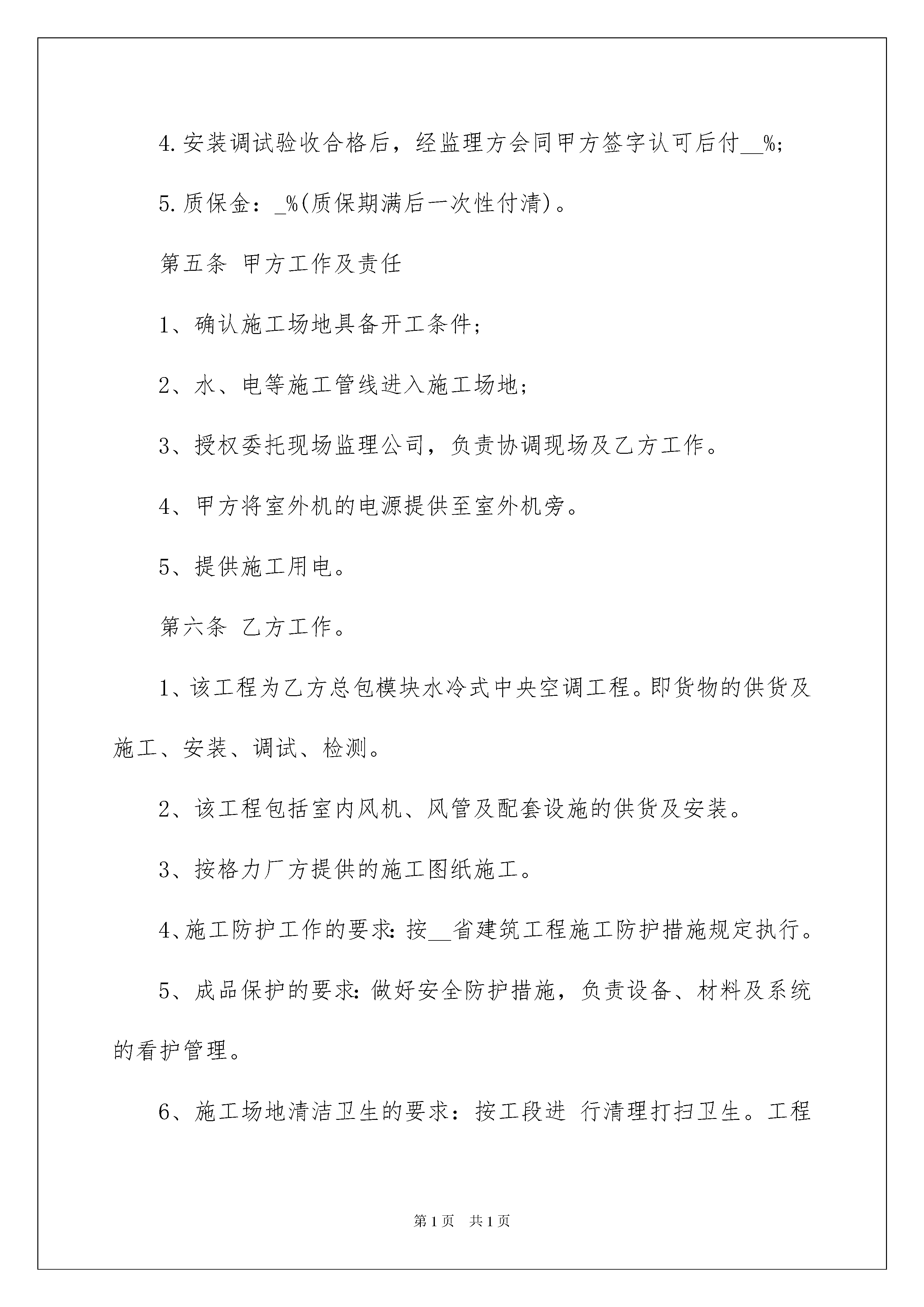 2022空调销售合同空调销售合同随着法律法规不断完善,人们越发重视合同,合同出现在我们生活中的次数越来越多,签订合同也是避免争端的最好方式之一。那么常见的合同书是什么样的呢?下面是我整理的空调销售合同,仅供参考,欢迎大家阅读。空调销售合同1甲方:乙方:按照《中华人民共和国合同法》和《建筑安装工程承包合同条例》的原则,结合本工程具体情况,双方达成如下协议,以资共同信守。第一条工程概况1、工程名称:工程地点:工程内容:格力商用空调设备销售及安装2、开工日期:定货__天设备到达施工现场。安装施工工期:__天3、技术指标:建筑面积为___平方米,制冷面积为___平方米。a、制冷、制热运行室外环境温度范围为:-15℃—+43℃。b、冬季室内温度达到16℃,夏季室内温度达到26℃-28℃。4、设备及材料如下a、设备表如下:序号设备规格名称产地c、施工、安装、调试。第二条合同文件使用的语言文字、标准和适用法律1、合同语言:中文。2、适用法律法规:《中华人民共和国产品质量法》、《建筑安装工程承包合同条例》和《中华人民共和国合同法》及有关法规。3、验收标准、规范:按国标、部标有关标准和审核验收规范。第三条合同总造价:第四条付款方式及期限1.预付款数额为供货合同签订后7日内付__%;2.货到工地现场经验收后付__%;4.安装调试验收合格后,经监理方会同甲方签字认可后付__%;5.质保金:_%(质保期满后一次性付清)。第五条甲方工作及责任1、确认施工场地具备开工条件;2、水、电等施工管线进入施工场地;3、授权委托现场监理公司,负责协调现场及乙方工作。4、甲方将室外机的电源提供至室外机旁。5、提供施工用电。第六条乙方工作。1、该工程为乙方总包模块水冷式中央空调工程。即货物的供货及施工、安装、调试、检测。2、该工程包括室内风机、风管及配套设施的供货及安装。3、按格力厂方提供的施工图纸施工。4、施工防护工作的要求:按__省建筑工程施工防护措施规定执行。5、成品保护的要求:做好安全防护措施,负责设备、材料及系统的看护管理。6、施工场地清洁卫生的要求:按工段进行清理打扫卫生。工程竣工验收前彻底清除一切垃圾并将垃圾送至到指定垃圾场。7、乙方应服从工程总包单位的现场管理和监理部门的质量监理督。8、乙方应严格遵守和执行招标原件和投标承诺的各项条款。9、乙方应加强施工人员的安全教育,在施工中若发生人身伤亡事故,责任由乙方全部承担。第七条检查和返工:按工段计划要求进行初检试压验收,如不符合安装质量,必须返工达到验收合格,返工责任及经济损失一律由乙方自负。第八条、隐蔽工程中间验收中间验收部位和时间:按设计图纸和工程施工进度的要求和时间执行,验收所有隐蔽系统合格后,再进行明工程施工。第九条试机:甲、乙双方派员共同参加试机,试机时间甲乙双方共同商定。第十条验收:工程验收日期双方协商而定。甲乙双方共同派员参加现场验收,验收标准根据招标文件要求及乙方提供的产品样本的技术参数进行验收。第十一条设计变更:乙方根据甲方提供的方案及图纸进行施工,如施工中甲方对施工方案进行较大的调整,需根据工程量及材料用量追加增减工程款(所有变更需经甲方施工负责人及监理部门签字认可)。第十二条确定变更:根据变更的具体情况,双方确定后再补充协议。第十三条保修1、保修内容、范围及时间:整个空调系统保修期为__个月。2、_年内免费上门保养服务。3、终身维修,并按成本价格随时提供格力设备的备品备件。第十四条安全施工:财产安全、施工环境安全保护,施工人员安全等,一切由乙方负责,如发生安全事故,一切直接经济损失和间接损失由乙方自理。第十五条不可抗力:不可抗力的自然灾害认定标准:6级以上地震;7级以上持续4天以上的大风。第十六条争议1、未尽事宜的解决:本合同未尽事宜和工程量调整,可经双方协商一致后达成补充协议,补充协议与本合同有同等法律效力。2、解决合同纠纷的方式:执行本合同发生争议时,由当事人双方协商解决。如协商不成,可通过仲裁委员会进行仲裁,也可通过法律诉讼解决。第十七条合同生效与终止1、合同生效的日期:本合同自签定之日起生效。2、合同终止的日期:本合同至本工程无质量问题,双方办理完所有经济手续后,自行终止。第十八条合同份数合同文件共计两份。甲乙双方各持壹份。第十九条合同签订日期和地点1、本合同签订的时间:20xx年12月31日2、合同签定的地点:第二十条双方需要说明的事项1、本合同签定的依据为设计图纸,如设计图纸发生变更,合同也将随之发生变更。2、乙方提供的产品样本做为合同附件,与合同具有同等法律效力。甲方(章)乙方(章)地址:地址:法定代表人:法定代表人
