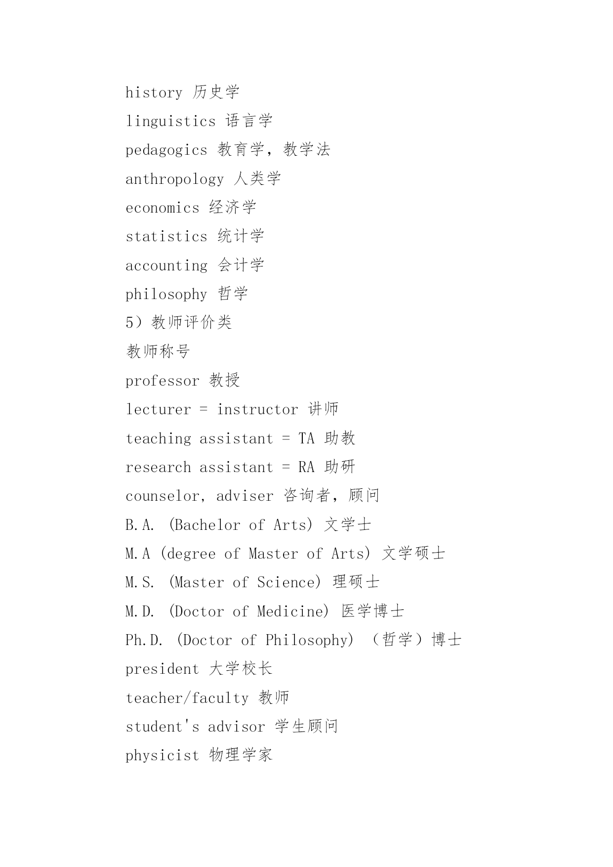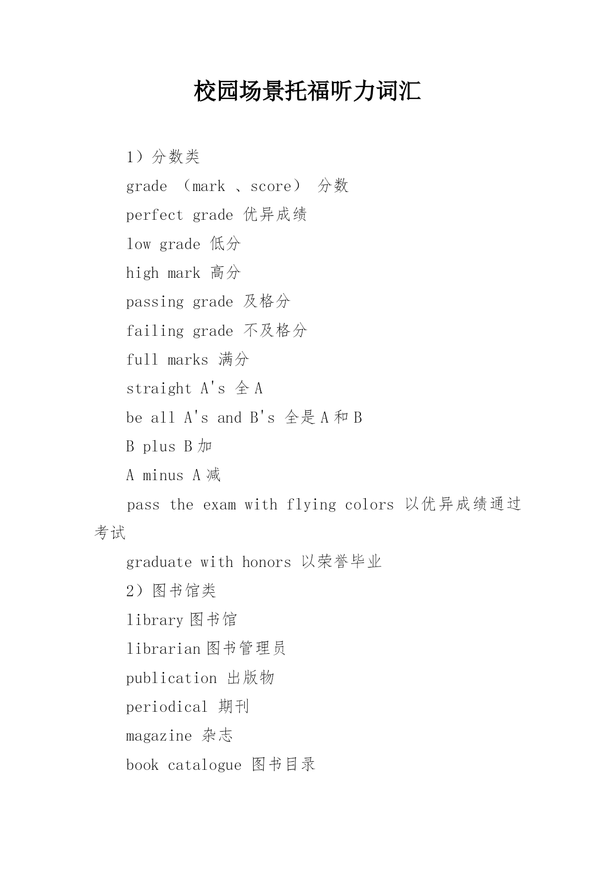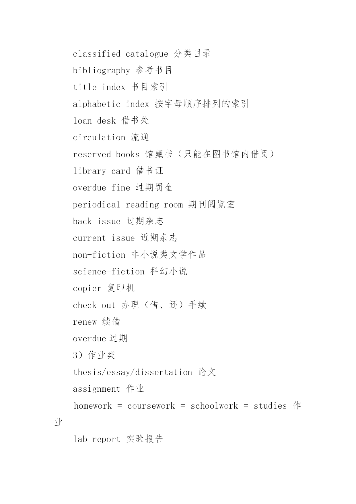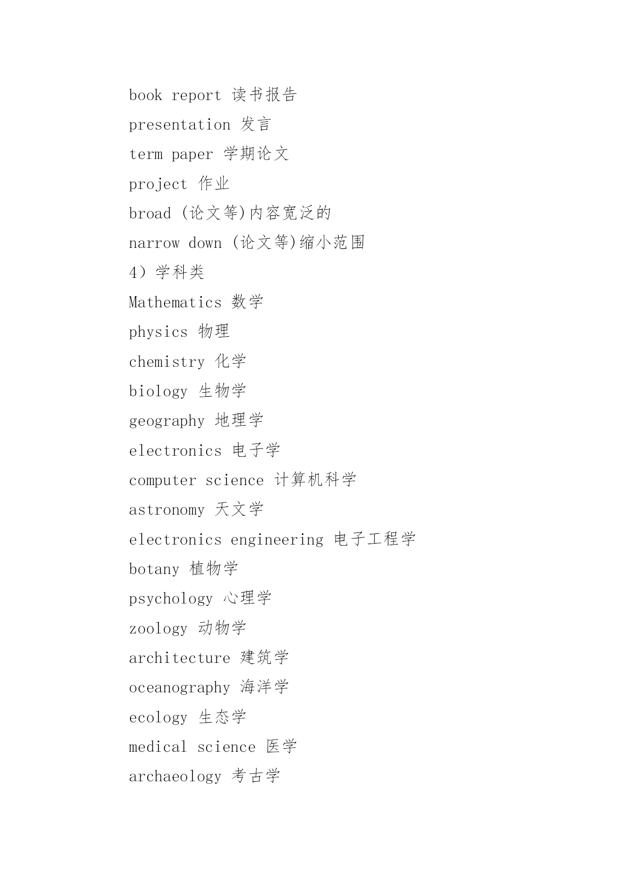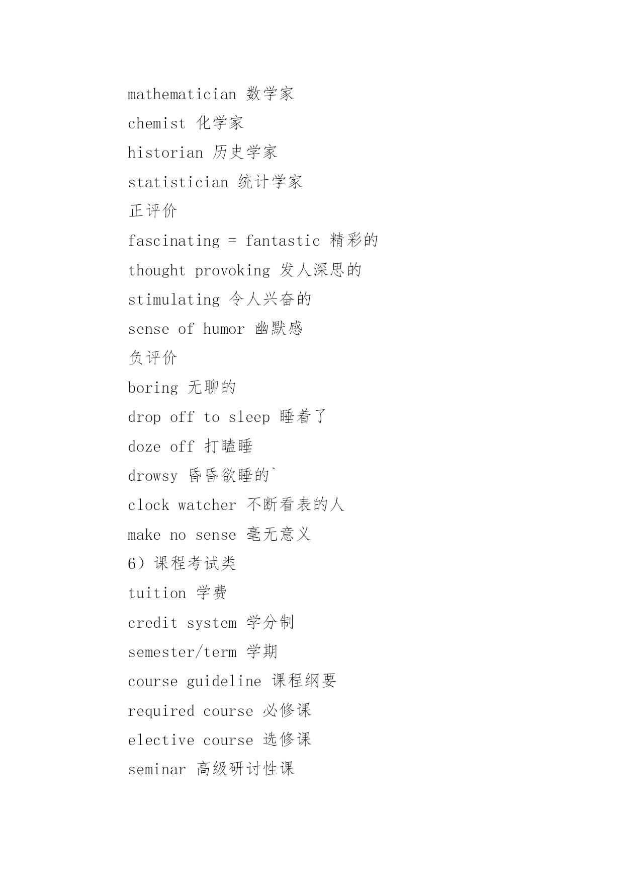 校园场景托福听力词汇 1)分数类grade(mark、score)分数perfectgrade优异成绩lowgrade低分highmark高分passinggrade及格分failinggrade不及格分fullmarks满分straightA's全AbeallA'sandB's全是A和BBplusB加AminusA减passtheexamwithflyingcolors以优异成绩通过考试graduatewithhonors以荣誉毕业2)图书馆类library图书馆librarian图书管理员publication出版物periodical期刊magazine杂志bookcatalogue图书目录classifiedcatalogue分类目录bibliography参考书目titleindex书目索引alphabeticindex按字母顺序排列的索引loandesk借书处circulation流通reservedbooks馆藏书(只能在图书馆内借阅)librarycard借书证overduefine过期罚金periodicalreadingroom期刊阅览室backissue过期杂志currentissue近期杂志non-fiction非小说类文学作品science-fiction科幻小说copier复印机checkout办理(借、还)手续renew续借overdue过期3)作业类thesis/essay/dissertation论文assignment作业homework=coursework=schoolwork=studies作业labreport实验报告bookreport读书报告presentation发言termpaper学期论文project作业broad(论文等)内容宽泛的narrowdown(论文等)缩小范围4)学科类Mathematics数学physics物理chemistry化学biology生物学geography地理学electronics电子学computerscience计算机科学astronomy天文学electronicsengineering电子工程学botany植物学psychology心理学zoology动物学architecture建筑学oceanography海洋学ecology生态学medicalscience医学archaeology考古学history历史学linguistics语言学pedagogics教育学,教学法anthropology人类学economics经济学statistics统计学accounting会计学philosophy哲学5)教师评价类教师称号professor教授lecturer=instructor讲师teachingassistant=TA助教researchassistant=RA助研counselor,adviser咨询者,顾问B.A.(BachelorofArts)文学士M.A(degreeofMasterofArts)文学硕士M.S.(MasterofScience)理硕士M.D.(DoctorofMedicine)医学博士Ph.D.(DoctorofPhilosophy)(哲学)博士president大学校长teacher/faculty教师student'sadvisor学生顾问physicist物理学家mathematician数学家chemist化学家historian历史学家statistician统计学家正评价fascinating=fantastic精彩的thoughtprovoking发人深思的stimulating令人兴奋的senseofhumor幽默感负评价boring无聊的dropofftosleep睡着了dozeoff打瞌睡drowsy昏昏欲睡的`clockwatcher不断看表的人makenosense毫无意义6)课程考试类tuition学费creditsystem学分制semester/term学期courseguideline课程纲要requiredcourse必修课electivecourse选修课seminar高级研讨性课mid-termexam期中考finalexams=finals期末考subjectivetest主观性测试objectivetest客观性测试popquiz抽查式测验major主修minor副修exemption免修syllabus教学大纲diploma,degree,certificate文凭,学位,证书course,coursework课程text,textbook课文,教科书class,classroom班,课exercise,practice练习handout(s)分发的教材e