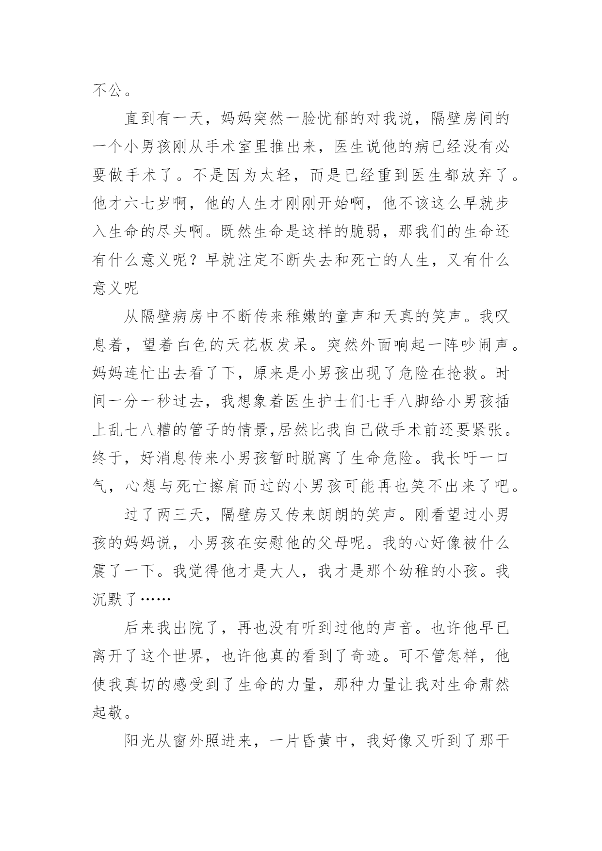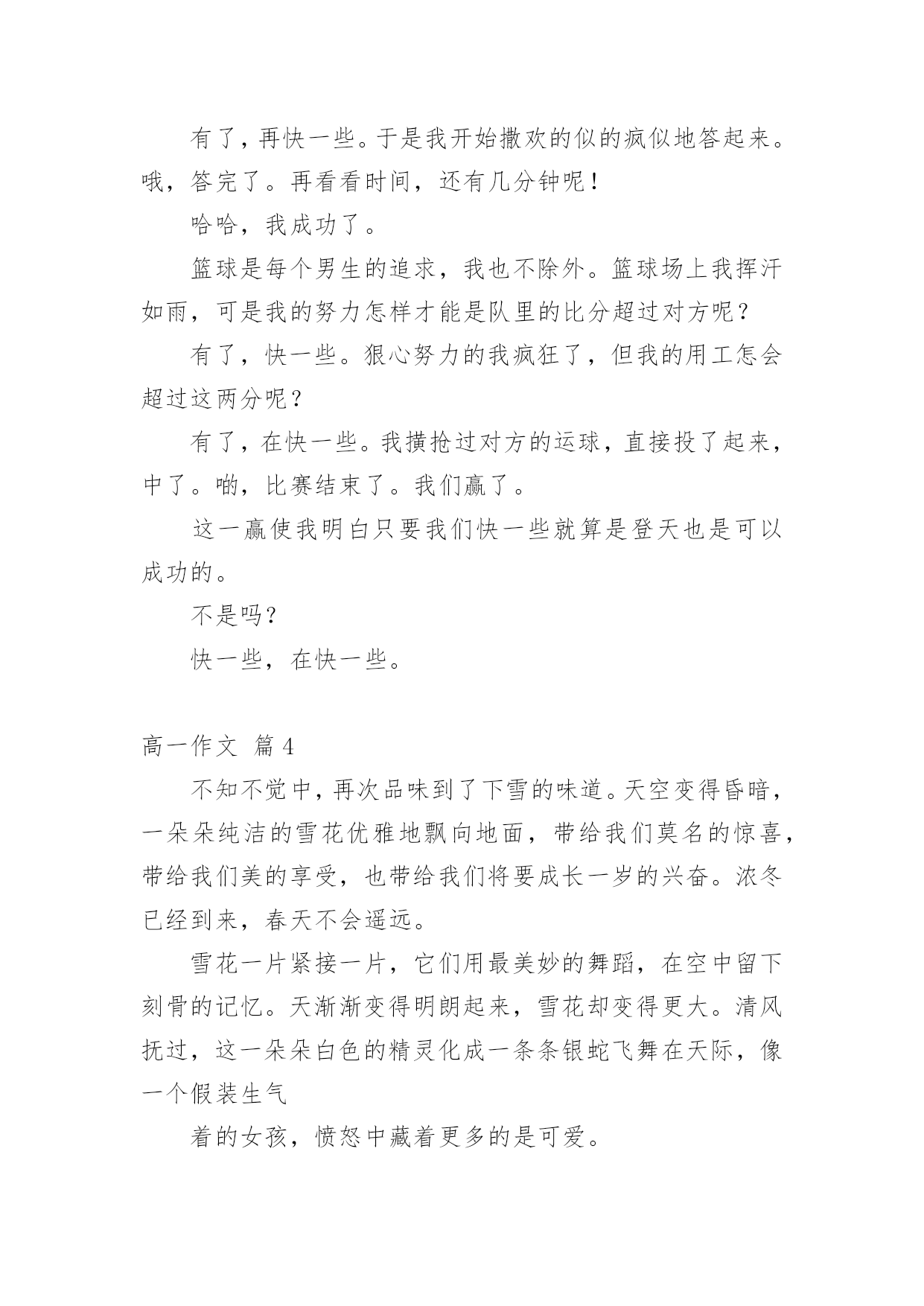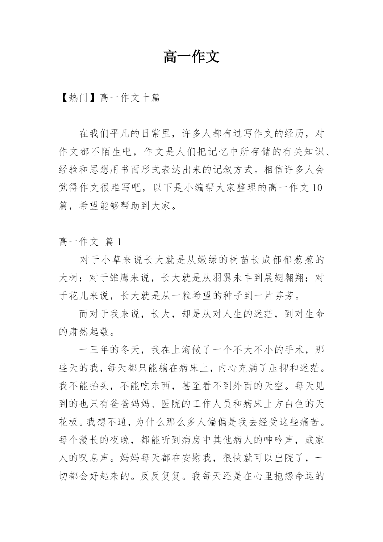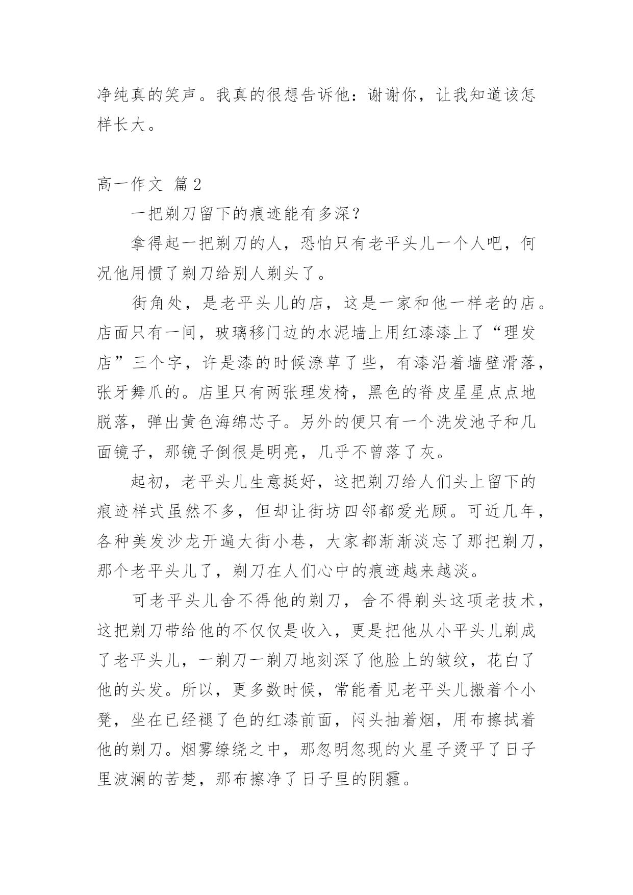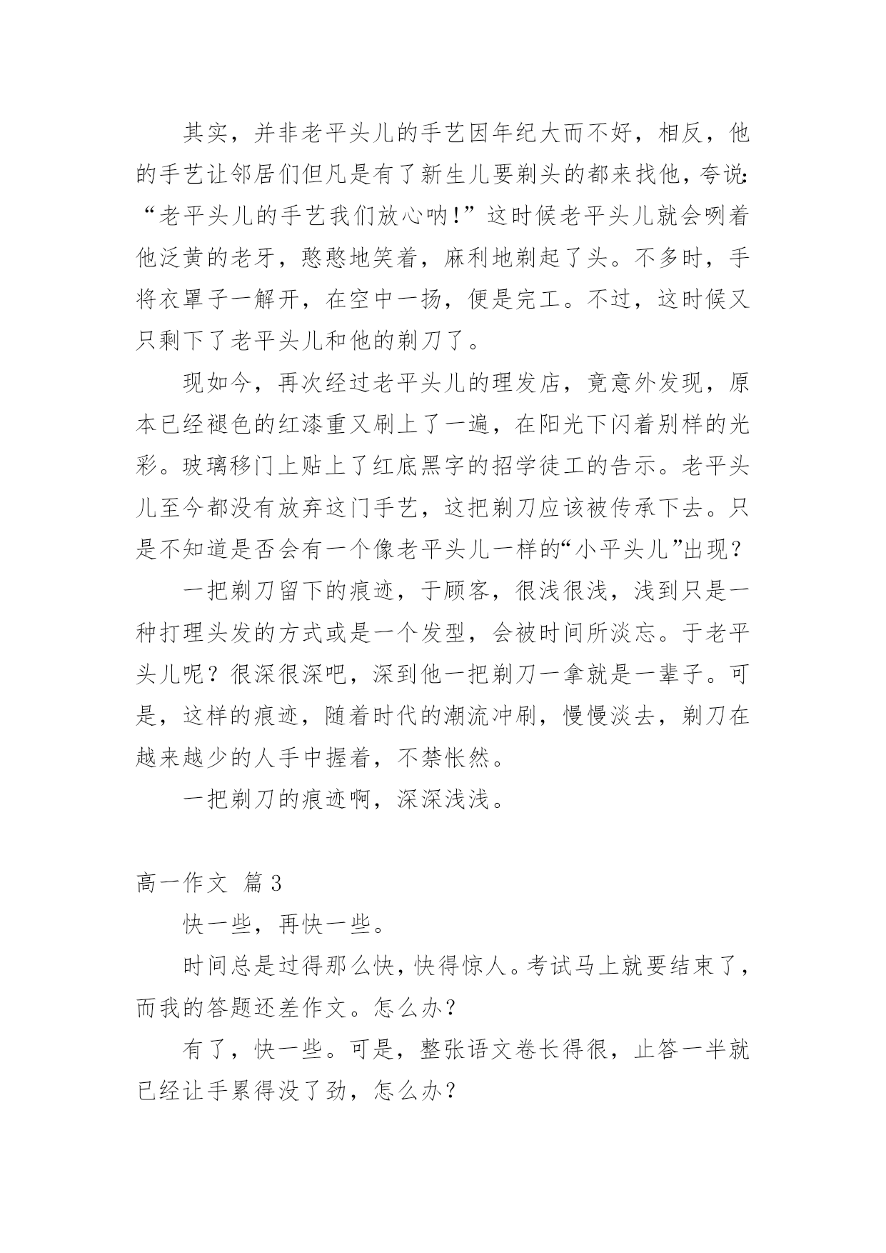 高一作文 【热门】高一作文十篇在我们平凡的日常里,许多人都有过写作文的经历,对作文都不陌生吧,作文是人们把记忆中所存储的有关知识、经验和思想用书面形式表达出来的记叙方式。相信许多人会觉得作文很难写吧,以下是小编帮大家整理的高一作文10篇,希望能够帮助到大家。高一作文篇1对于小草来说长大就是从嫩绿的树苗长成郁郁葱葱的大树;对于雏鹰来说,长大就是从羽翼未丰到展翅翱翔;对于花儿来说,长大就是从一粒希望的种子到一片芬芳。而对于我来说,长大,却是从对人生的迷茫,到对生命的肃然起敬。一三年的冬天,我在上海做了一个不大不小的手术,那些天的我,每天都只能躺在病床上,内心充满了压抑和迷茫。我不能抬头,不能吃东西,甚至看不到外面的天空。每天见到的也只有爸爸妈妈、医院的工作人员和病床上方白色的天花板。我想不通,为什么那么多人偏偏是我去经受这些痛苦。每个漫长的夜晚,都能听到病房中其他病人的呻吟声,或家人的叹息声。妈妈每天都在安慰我,很快就可以出院了,一切都会好起来的。反反复复。我每天还是在心里抱怨命运的不公。直到有一天,妈妈突然一脸忧郁的对我说,隔壁房间的一个小男孩刚从手术室里推出来,医生说他的病已经没有必要做手术了。不是因为太轻,而是已经重到医生都放弃了。他才六七岁啊,他的人生才刚刚开始啊,他不该这么早就步入生命的尽头啊。既然生命是这样的脆弱,那我们的生命还有什么意义呢?早就注定不断失去和死亡的人生,又有什么意义呢从隔壁病房中不断传来稚嫩的童声和天真的笑声。我叹息着,望着白色的天花板发呆。突然外面响起一阵吵闹声。妈妈连忙出去看了下,原来是小男孩出现了危险在抢救。时间一分一秒过去,我想象着医生护士们七手八脚给小男孩插上乱七八糟的管子的情景,居然比我自己做手术前还要紧张。终于,好消息传来小男孩暂时脱离了生命危险。我长吁一口气,心想与死亡擦肩而过的小男孩可能再也笑不出来了吧。过了两三天,隔壁房又传来朗朗的笑声。刚看望过小男孩的妈妈说,小男孩在安慰他的父母呢。我的心好像被什么震了一下。我觉得他才是大人,我才是那个幼稚的小孩。我沉默了……后来我出院了,再也没有听到过他的声音。也许他早已离开了这个世界,也许他真的看到了奇迹。可不管怎样,他使我真切的感受到了生命的力量,那种力量让我对生命肃然起敬。阳光从窗外照进来,一片昏黄中,我好像又听到了那干净纯真的笑声。我真的很想告诉他:谢谢你,让我知道该怎样长大。高一作文篇2一把剃刀留下的痕迹能有多深?拿得起一把剃刀的人,恐怕只有老平头儿一个人吧,何况他用惯了剃刀给别人剃头了。街角处,是老平头儿的店,这是一家和他一样老的店。店面只有一间,玻璃移门边的水泥墙上用红漆漆上了“理发店”三个字,许是漆的时候潦草了些,有漆沿着墙壁滑落,张牙舞爪的。店里只有两张理发椅,黑色的脊皮星星点点地脱落,弹出黄色海绵芯子。另外的便只有一个洗发池子和几面镜子,那镜子倒很是明亮,几乎不曾落了灰。起初,老平头儿生意挺好,这把剃刀给人们头上留下的痕迹样式虽然不多,但却让街坊四邻都爱光顾。可近几年,各种美发沙龙开遍大街小巷,大家都渐渐淡忘了那把剃刀,那个老平头儿了,剃刀在人们心中的痕迹越来越淡。可老平头儿舍不得他的剃刀,舍不得剃头这项老技术,这把剃刀带给他的不仅仅是收入,更是把他从小平头儿剃成了老平头儿,一剃刀一剃刀地刻深了他脸上的皱纹,花白了他的头发。所以,更多数时候,常能看见老平头儿搬着个小凳,坐在已经褪了色的红漆前面,闷头抽着烟,用布擦拭着他的剃刀。烟雾缭绕之中,那忽明忽现的火星子烫平了日子里波澜的苦楚,那布擦净了日子里的阴霾。其实,并非老平头儿的手艺因年纪大而不好,相反,他的手艺让邻居们但凡是有了新生儿要剃头的都来找他,夸说:“老平头儿的手艺我们放心呐!”这时候老平头儿就会咧着他泛黄的老牙,憨憨地笑着,麻利地剃起了头。不多时,手将衣罩子一解开,在空中一扬,便是完工。不过,这时候又只剩下了老平头儿和他的剃刀了。现如今,再次经过老平头儿的理发店,竟意外发现,原本已经褪色的红漆重又刷上了一遍,在阳光下闪着别样的光彩。玻璃移门上贴上了红底黑字的招学徒工的告示。老平头儿至今都没有放弃这门手艺,这把剃刀应该被传承下去。只是不知道是否会有一个像老平头儿一样的“小平头儿”出现?一把剃刀留下的痕迹,于顾客,很浅很浅,浅到只是一种打理头发的方式或是一个发型,会被时间所淡忘。于老平头儿呢?很深很深吧,深到他一把剃刀一拿就是一辈子。可是,这样的痕迹,随着时代的潮流冲刷,慢慢淡去,剃刀在越来越少的人手中握着,不禁怅然。一把剃刀的痕迹啊,深深浅浅。高一作文篇3快一些,再快一些。时间总是过得那么快,快得惊人。考试马上就要结束了,而我的答题还差作文。怎么办?有了,快一些。可是,整张语文卷长得很,止答一半就已经让手累得没了劲,怎么办?有了,再快一些。于是我开始撒欢的似的疯似地答