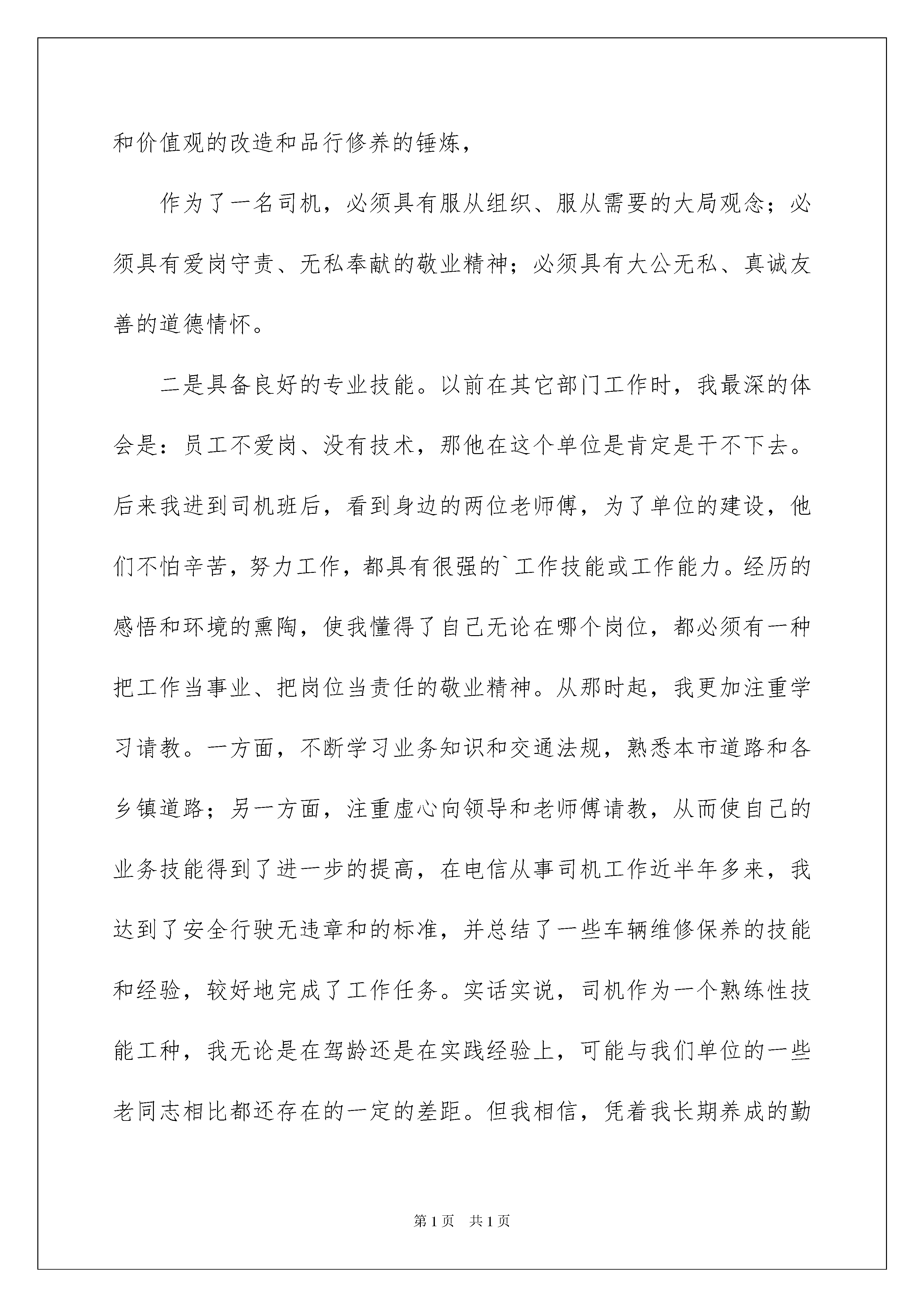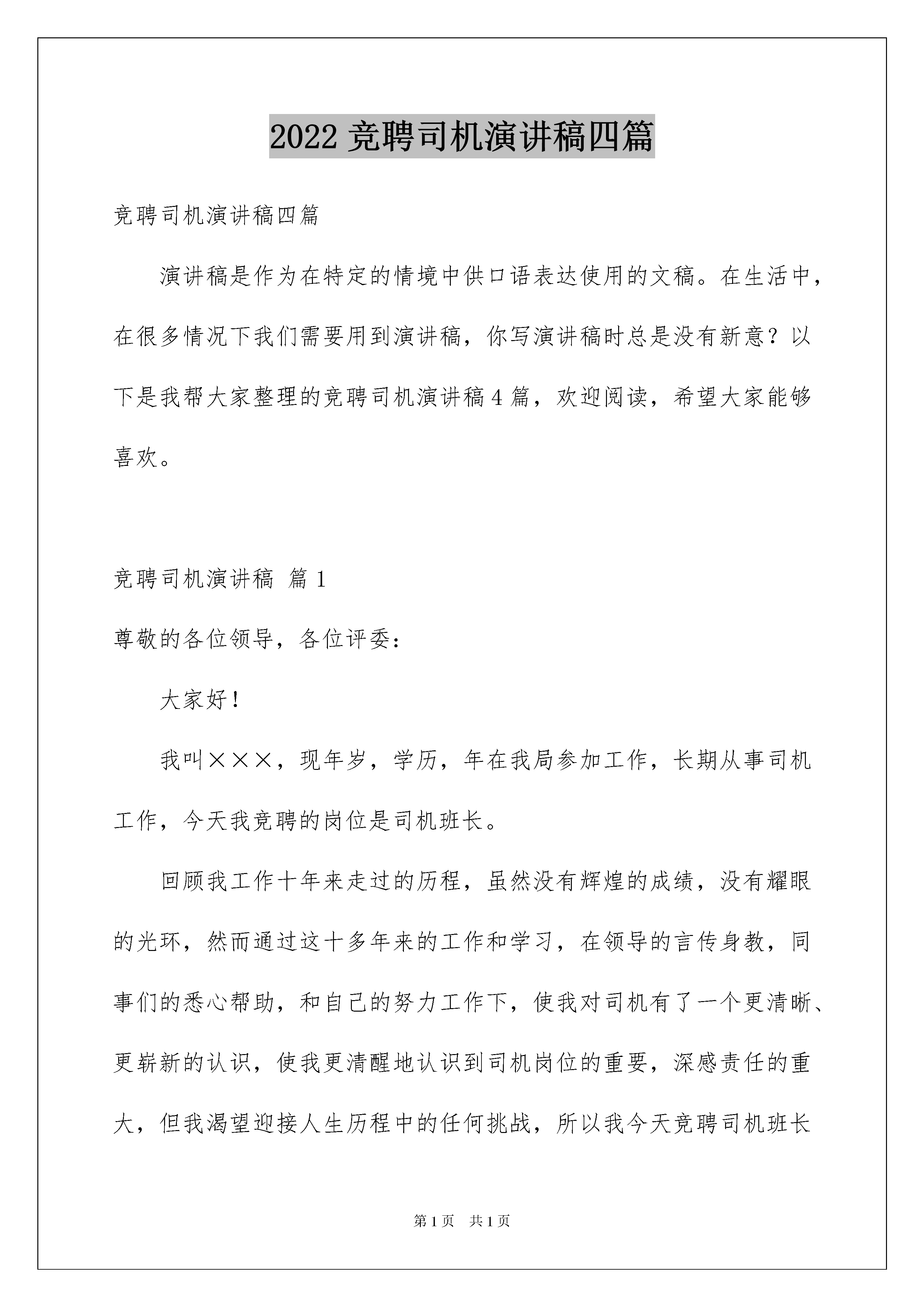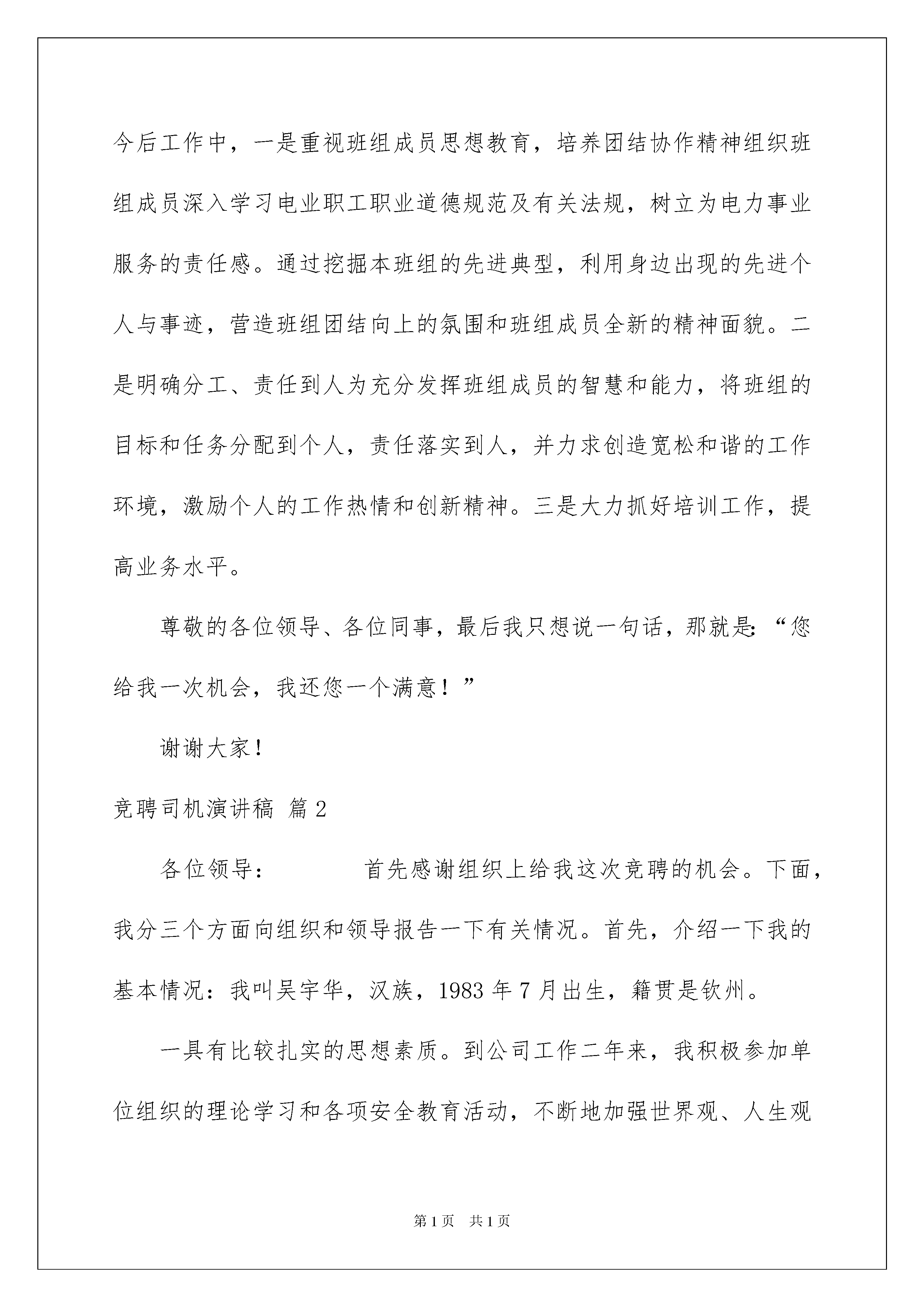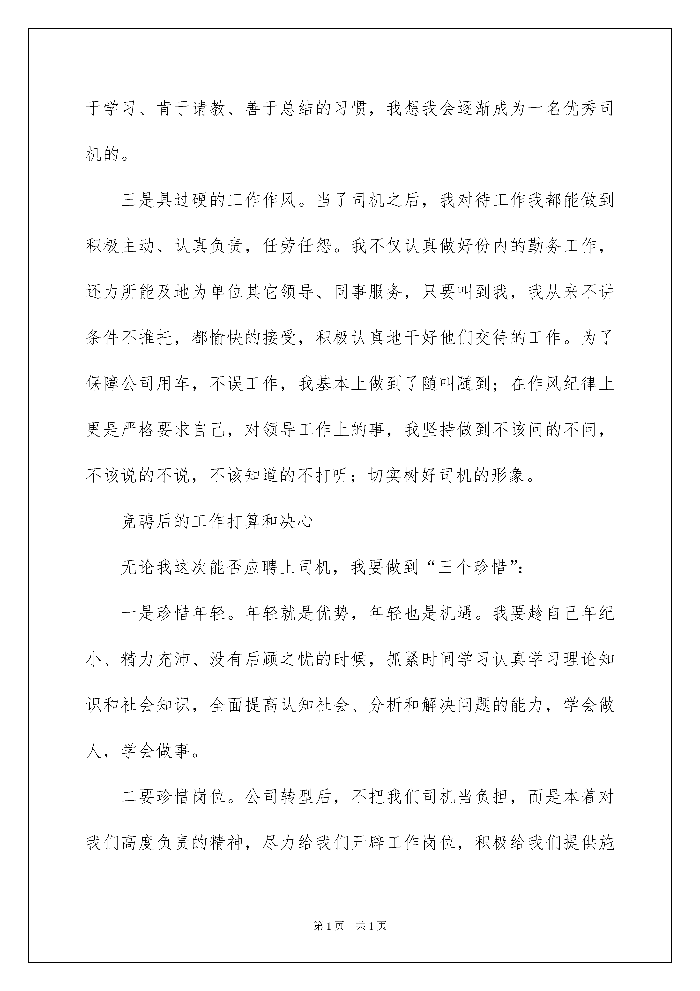 2022竞聘司机演讲稿四篇竞聘司机演讲稿四篇演讲稿是作为在特定的情境中供口语表达使用的文稿。在生活中,在很多情况下我们需要用到演讲稿,你写演讲稿时总是没有新意?以下是我帮大家整理的竞聘司机演讲稿4篇,欢迎阅读,希望大家能够喜欢。竞聘司机演讲稿篇1尊敬的各位领导,各位评委:大家好!我叫×××,现年岁,学历,年在我局参加工作,长期从事司机工作,今天我竞聘的岗位是司机班长。回顾我工作十年来走过的历程,虽然没有辉煌的成绩,没有耀眼的光环,然而通过这十多年来的工作和学习,在领导的言传身教,同事们的悉心帮助,和自己的努力工作下,使我对司机有了一个更清晰、更崭新的认识,使我更清醒地认识到司机岗位的重要,深感责任的重大,但我渴望迎接人生历程中的任何挑战,所以我今天竞聘司机班长岗位。我若有幸继续这个岗位上工作,我将一如既往在主管领导的带领下,认真履行岗位职责,以更加积极主动的态度对待工作、开展工作,对工作负责,让领导放心,让同志们满意,并重点做好以下几方面工作:第一、努力抓好班组安全管理工作。为防止交通事故的发生,力求抓好班组安全管理的每一个细节工作,把事故隐患消灭在萌芽之中。首先,我将做到有针对性地组织开展每周安全日活动,做好记录,与大家一起分析和探讨,增强班组成员间的经验交流,提高自我保护意识,变“要我安全”为“我要安全”,这样不仅有利于问题的解决更重要的是在探讨中学习了知识,提高了自己,并根据工作实际,及时向所领导并提出合理化建议;其次是多总结班组多年的经验,制定适合本班组的各种制度,并在实际使用过程中,根据遇到的新问题及时修改和完善;还要有针对性地开展每日事故预想活动;第二、努力创建一个团结向上的先进班组。班长的首要任务就是要努力创建一个团结向上的先进班组。我在今后工作中,一是重视班组成员思想教育,培养团结协作精神组织班组成员深入学习电业职工职业道德规范及有关法规,树立为电力事业服务的责任感。通过挖掘本班组的先进典型,利用身边出现的先进个人与事迹,营造班组团结向上的氛围和班组成员全新的精神面貌。二是明确分工、责任到人为充分发挥班组成员的智慧和能力,将班组的目标和任务分配到个人,责任落实到人,并力求创造宽松和谐的工作环境,激励个人的工作热情和创新精神。三是大力抓好培训工作,提高业务水平。尊敬的各位领导、各位同事,最后我只想说一句话,那就是:“您给我一次机会,我还您一个满意!”谢谢大家!竞聘司机演讲稿篇2各位领导:首先感谢组织上给我这次竞聘的机会。下面,我分三个方面向组织和领导报告一下有关情况。首先,介绍一下我的基本情况:我叫吴宇华,汉族,1983年7月出生,籍贯是钦州。一具有比较扎实的思想素质。到公司工作二年来,我积极参加单位组织的理论学习和各项安全教育活动,不断地加强世界观、人生观和价值观的改造和品行修养的锤炼,作为了一名司机,必须具有服从组织、服从需要的大局观念;必须具有爱岗守责、无私奉献的敬业精神;必须具有大公无私、真诚友善的道德情怀。二是具备良好的专业技能。以前在其它部门工作时,我最深的体会是:员工不爱岗、没有技术,那他在这个单位是肯定是干不下去。后来我进到司机班后,看到身边的两位老师傅,为了单位的建设,他们不怕辛苦,努力工作,都具有很强的`工作技能或工作能力。经历的感悟和环境的熏陶,使我懂得了自己无论在哪个岗位,都必须有一种把工作当事业、把岗位当责任的敬业精神。从那时起,我更加注重学习请教。一方面,不断学习业务知识和交通法规,熟悉本市道路和各乡镇道路;另一方面,注重虚心向领导和老师傅请教,从而使自己的业务技能得到了进一步的提高,在电信从事司机工作近半年多来,我达到了安全行驶无违章和的标准,并总结了一些车辆维修保养的技能和经验,较好地完成了工作任务。实话实说,司机作为一个熟练性技能工种,我无论是在驾龄还是在实践经验上,可能与我们单位的一些老同志相比都还存在的一定的差距。但我相信,凭着我长期养成的勤于学习、肯于请教、善于总结的习惯,我想我会逐渐成为一名优秀司机的。三是具过硬的工作作风。当了司机之后,我对待工作我都能做到积极主动、认真负责,任劳任怨。我不仅认真做好份内的勤务工作,还力所能及地为单位其它领导、同事服务,只要叫到我,我从来不讲条件不推托,都愉快的接受,积极认真地干好他们交待的工作。为了保障公司用车,不误工作,我基本上做到了随叫随到;在作风纪律上更是严格要求自己,对领导工作上的事,我坚持做到不该问的不问,不该说的不说,不该知道的不打听;切实树好司机的形象。竞聘后的工作打算和决心无论我这次能否应聘上司机,我要做到“三个珍惜”:一是珍惜年轻。年轻就是优势,年轻也是机遇。我要