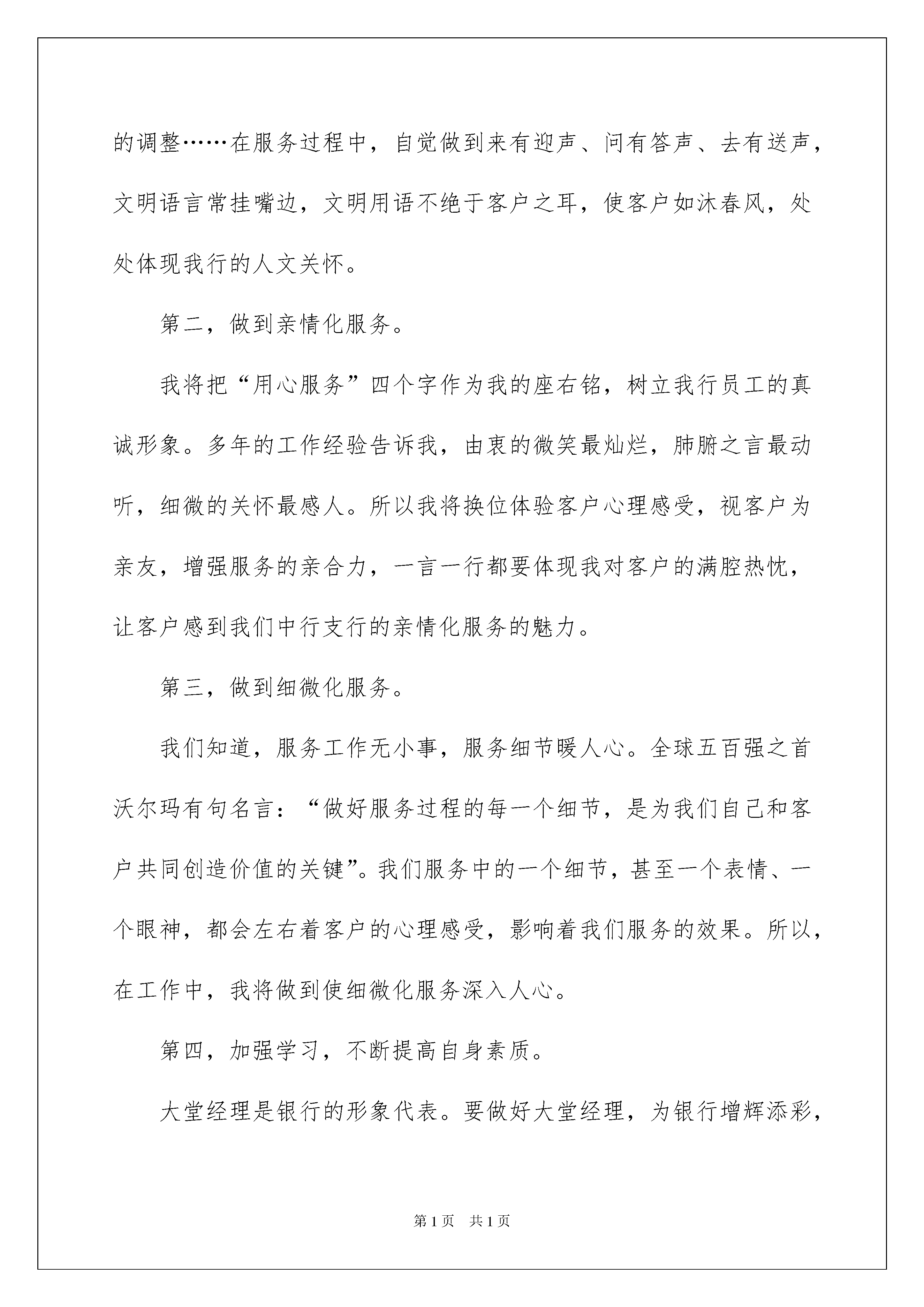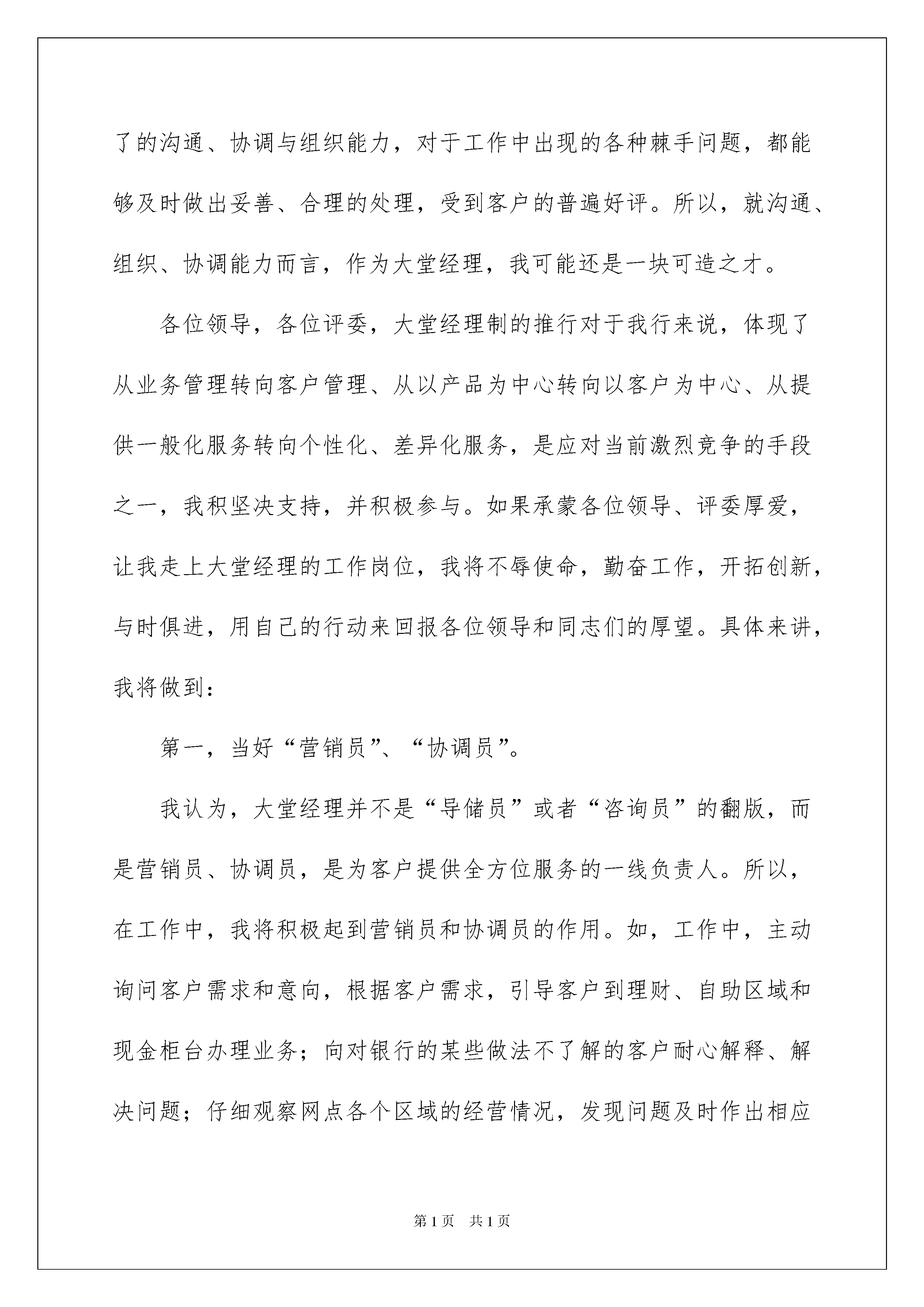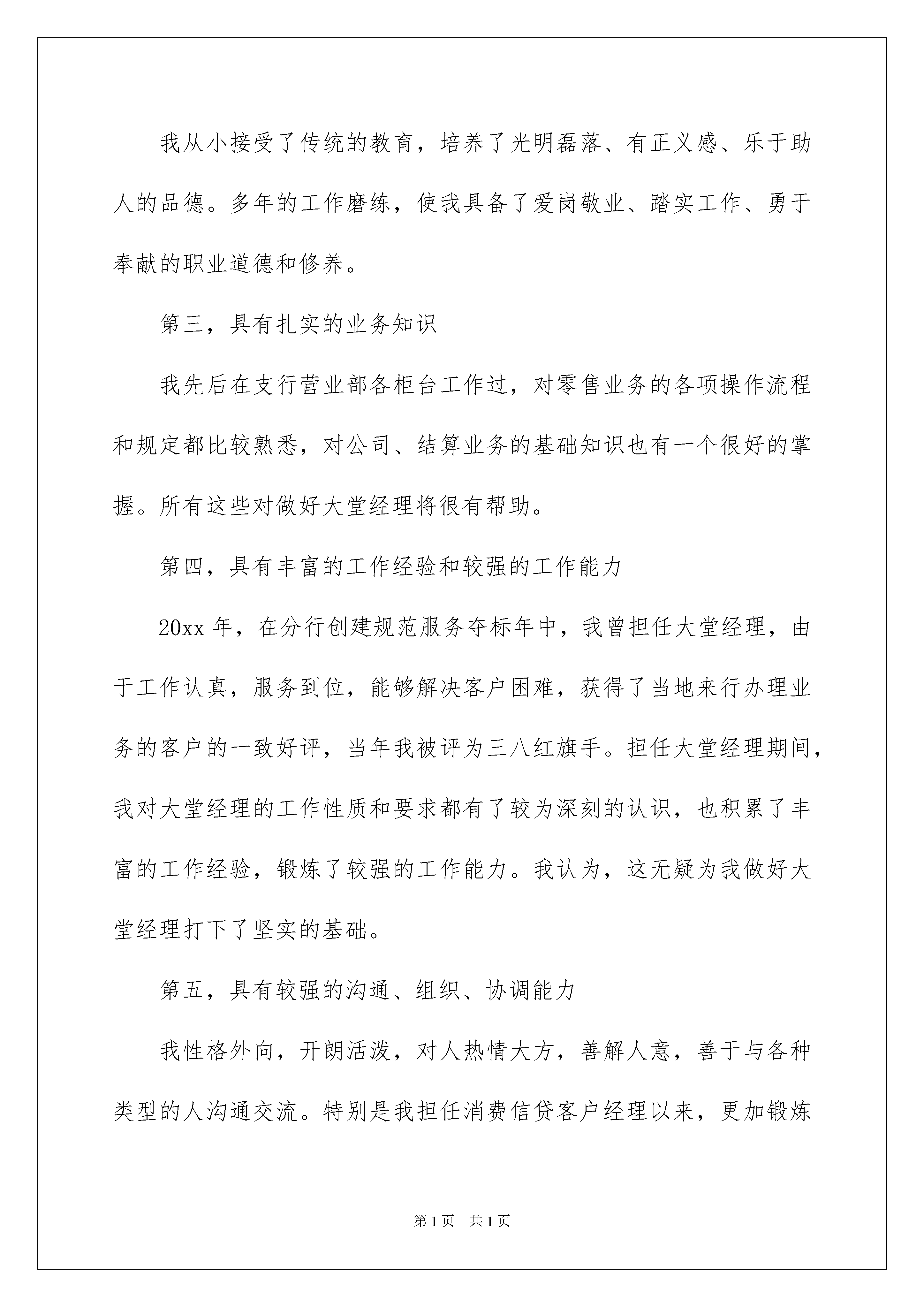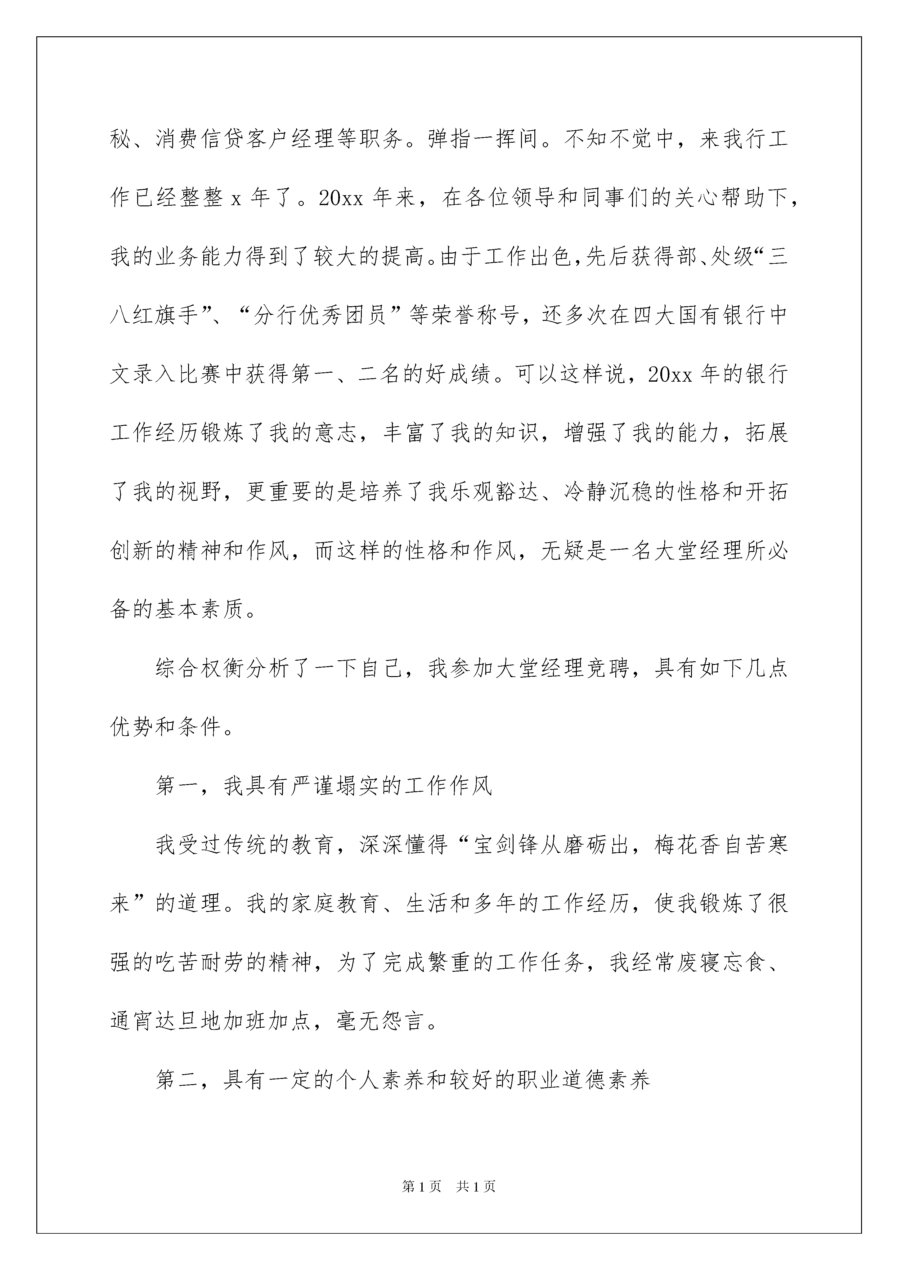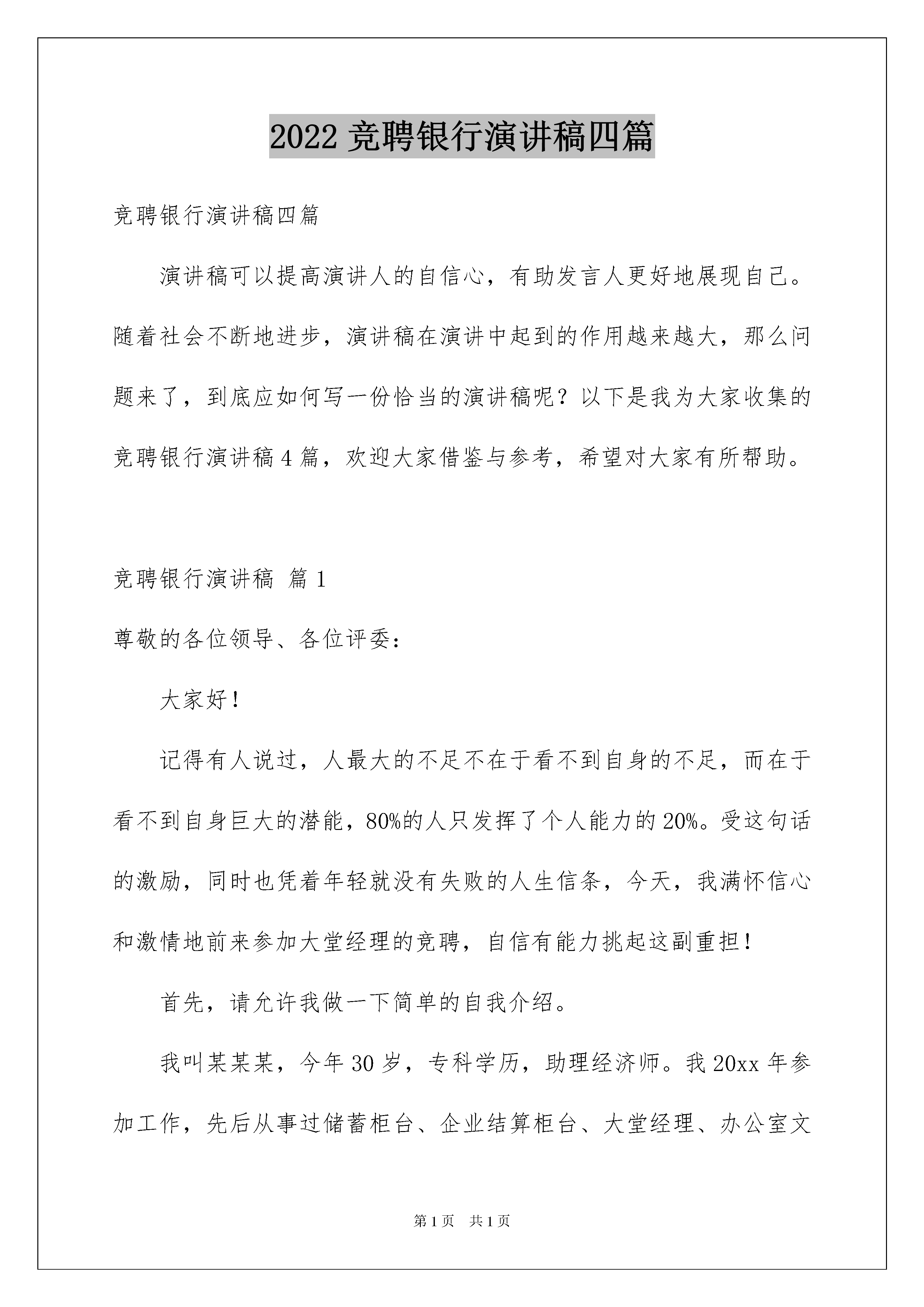 2022竞聘银行演讲稿四篇竞聘银行演讲稿四篇演讲稿可以提高演讲人的自信心,有助发言人更好地展现自己。随着社会不断地进步,演讲稿在演讲中起到的作用越来越大,那么问题来了,到底应如何写一份恰当的演讲稿呢?以下是我为大家收集的竞聘银行演讲稿4篇,欢迎大家借鉴与参考,希望对大家有所帮助。竞聘银行演讲稿篇1尊敬的各位领导、各位评委:大家好!记得有人说过,人最大的不足不在于看不到自身的不足,而在于看不到自身巨大的潜能,80%的人只发挥了个人能力的20%。受这句话的激励,同时也凭着年轻就没有失败的人生信条,今天,我满怀信心和激情地前来参加大堂经理的竞聘,自信有能力挑起这副重担!首先,请允许我做一下简单的自我介绍。我叫某某某,今年30岁,专科学历,助理经济师。我20xx年参加工作,先后从事过储蓄柜台、企业结算柜台、大堂经理、办公室文秘、消费信贷客户经理等职务。弹指一挥间。不知不觉中,来我行工作已经整整x年了。20xx年来,在各位领导和同事们的关心帮助下,我的业务能力得到了较大的提高。由于工作出色,先后获得部、处级“三八红旗手”、“分行优秀团员”等荣誉称号,还多次在四大国有银行中文录入比赛中获得第一、二名的好成绩。可以这样说,20xx年的银行工作经历锻炼了我的意志,丰富了我的知识,增强了我的能力,拓展了我的视野,更重要的是培养了我乐观豁达、冷静沉稳的性格和开拓创新的精神和作风,而这样的性格和作风,无疑是一名大堂经理所必备的基本素质。综合权衡分析了一下自己,我参加大堂经理竞聘,具有如下几点优势和条件。第一,我具有严谨塌实的工作作风我受过传统的教育,深深懂得“宝剑锋从磨砺出,梅花香自苦寒来”的道理。我的家庭教育、生活和多年的工作经历,使我锻炼了很强的吃苦耐劳的精神,为了完成繁重的工作任务,我经常废寝忘食、通宵达旦地加班加点,毫无怨言。第二,具有一定的个人素养和较好的职业道德素养我从小接受了传统的教育,培养了光明磊落、有正义感、乐于助人的品德。多年的工作磨练,使我具备了爱岗敬业、踏实工作、勇于奉献的职业道德和修养。第三,具有扎实的业务知识我先后在支行营业部各柜台工作过,对零售业务的各项操作流程和规定都比较熟悉,对公司、结算业务的基础知识也有一个很好的掌握。所有这些对做好大堂经理将很有帮助。第四,具有丰富的工作经验和较强的工作能力20xx年,在分行创建规范服务夺标年中,我曾担任大堂经理,由于工作认真,服务到位,能够解决客户困难,获得了当地来行办理业务的客户的一致好评,当年我被评为三八红旗手。担任大堂经理期间,我对大堂经理的工作性质和要求都有了较为深刻的认识,也积累了丰富的工作经验,锻炼了较强的工作能力。我认为,这无疑为我做好大堂经理打下了坚实的基础。第五,具有较强的沟通、组织、协调能力我性格外向,开朗活泼,对人热情大方,善解人意,善于与各种类型的人沟通交流。特别是我担任消费信贷客户经理以来,更加锻炼了的沟通、协调与组织能力,对于工作中出现的各种棘手问题,都能够及时做出妥善、合理的处理,受到客户的普遍好评。所以,就沟通、组织、协调能力而言,作为大堂经理,我可能还是一块可造之才。各位领导,各位评委,大堂经理制的推行对于我行来说,体现了从业务管理转向客户管理、从以产品为中心转向以客户为中心、从提供一般化服务转向个性化、差异化服务,是应对当前激烈竞争的手段之一,我积坚决支持,并积极参与。如果承蒙各位领导、评委厚爱,让我走上大堂经理的工作岗位,我将不辱使命,勤奋工作,开拓创新,与时俱进,用自己的行动来回报各位领导和同志们的厚望。具体来讲,我将做到:第一,当好“营销员”、“协调员”。我认为,大堂经理并不是“导储员”或者“咨询员”的翻版,而是营销员、协调员,是为客户提供全方位服务的一线负责人。所以,在工作中,我将积极起到营销员和协调员的作用。如,工作中,主动询问客户需求和意向,根据客户需求,引导客户到理财、自助区域和现金柜台办理业务;向对银行的某些做法不了解的客户耐心解释、解决问题;仔细观察网点各个区域的经营情况,发现问题及时作出相应的调整……在服务过程中,自觉做到来有迎声、问有答声、去有送声,文明语言常挂嘴边,文明用语不绝于客户之耳,使客户如沐春风,处处体现我行的人文关怀。第二,做到亲情化服务。我将把“用心服务”四个字作为我的座右铭,树立我行员工的真诚形象。多年的工作经验告诉我,由衷的微笑最灿烂,肺腑之言最动听,细微的关怀最感人。所以我将换位体验客户心理感受,视客户为亲友,增强服务的亲合力,一言一行都要体现我对客户的满腔热忱,让客户感到我们中行支行的亲情化服务的魅力。第三,做到细微化服务。我们知道,服务工作无