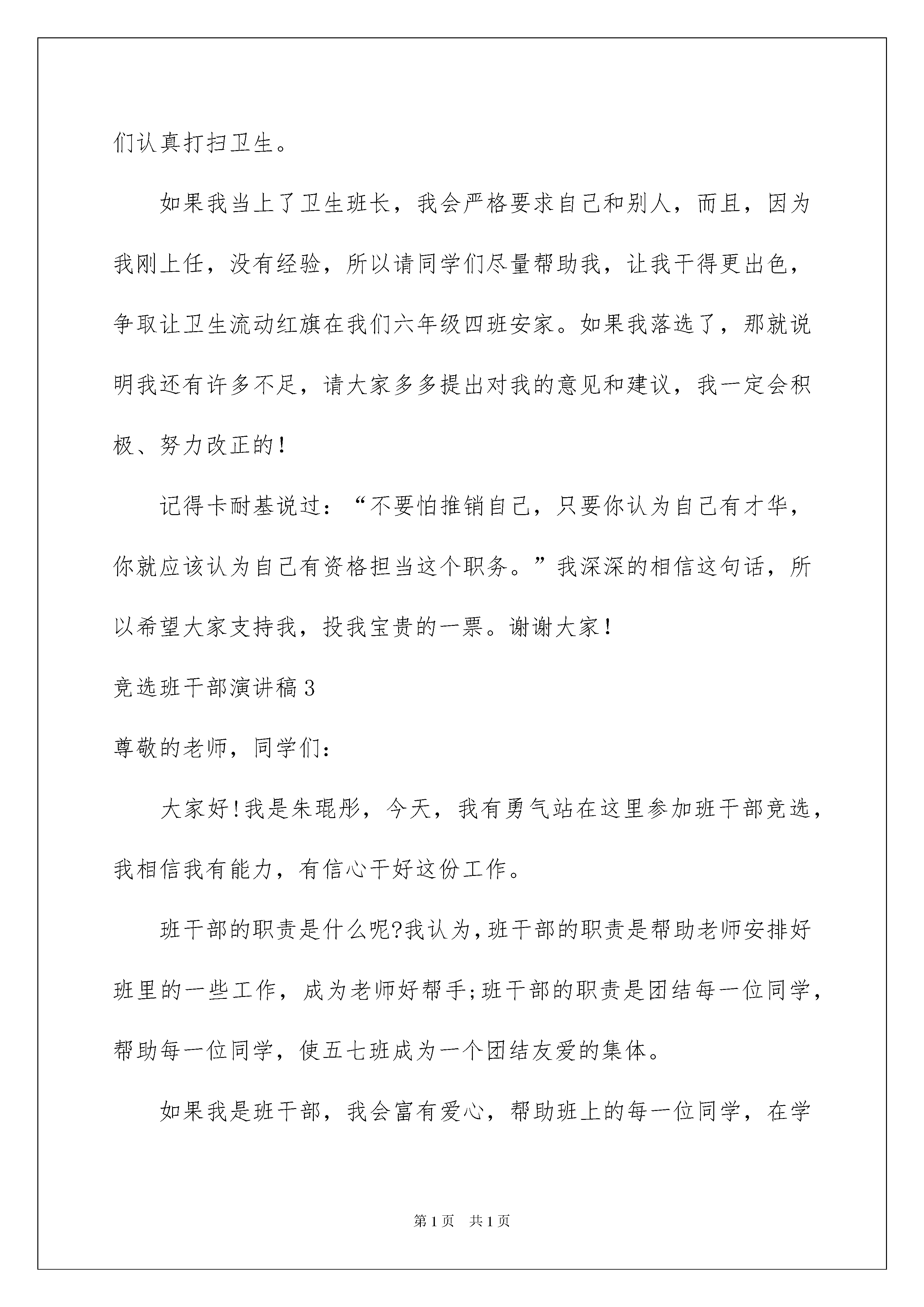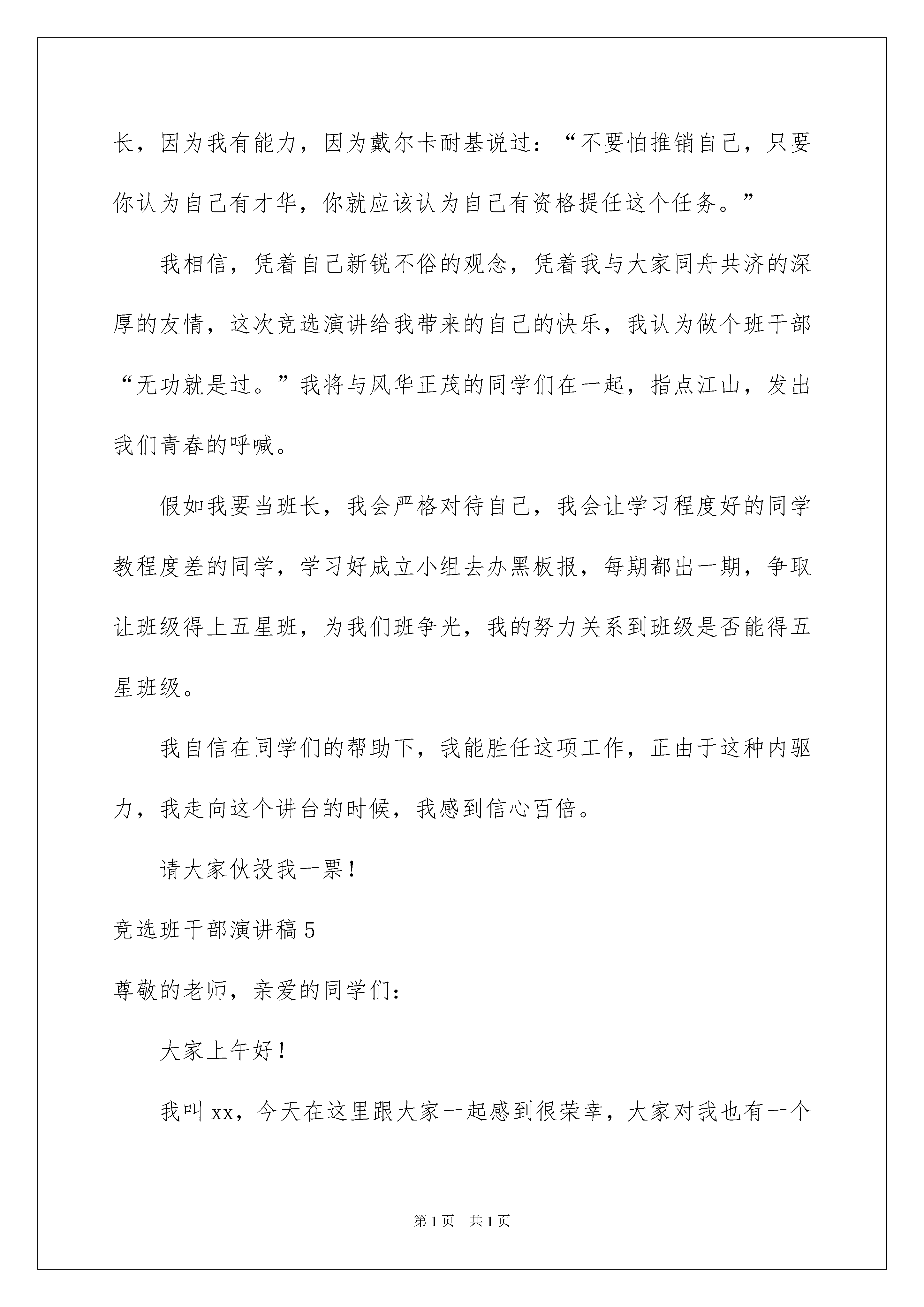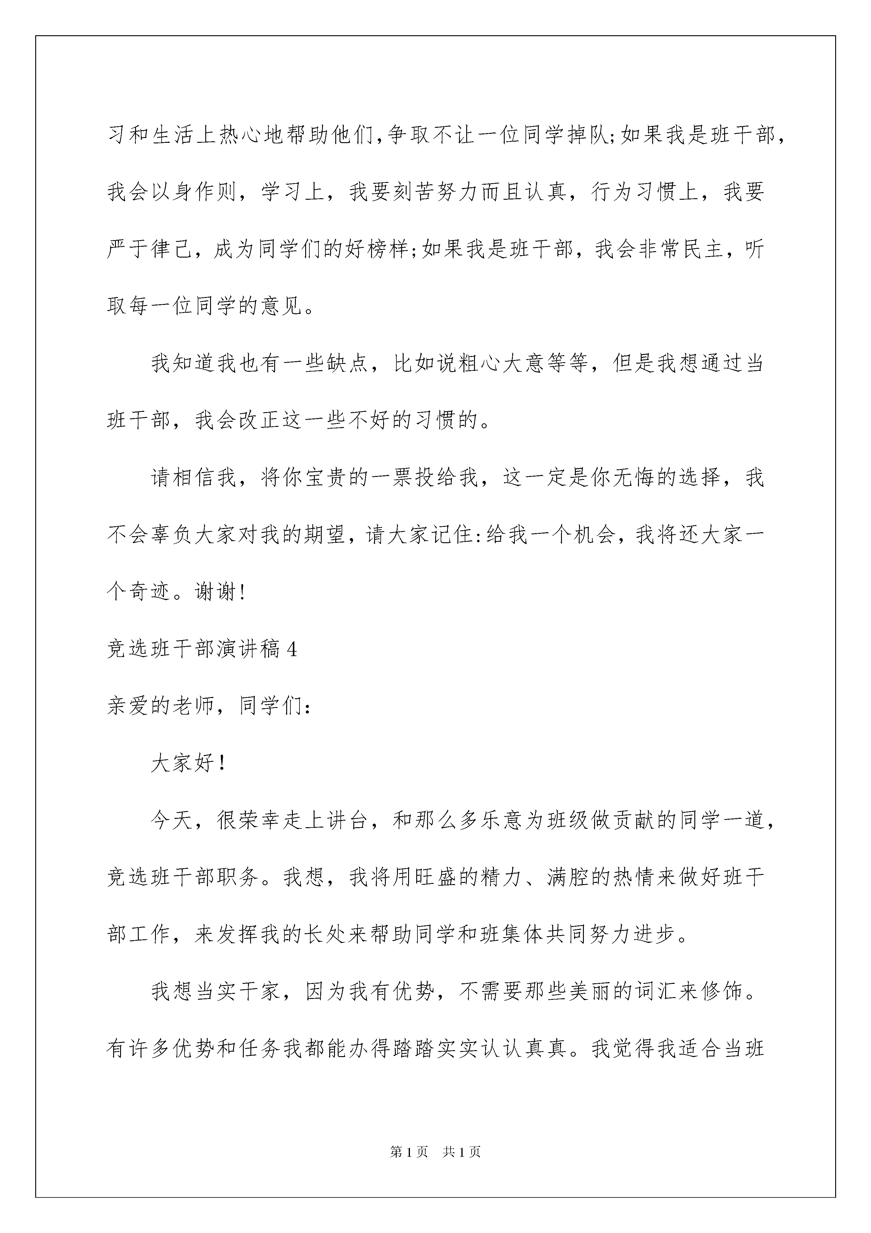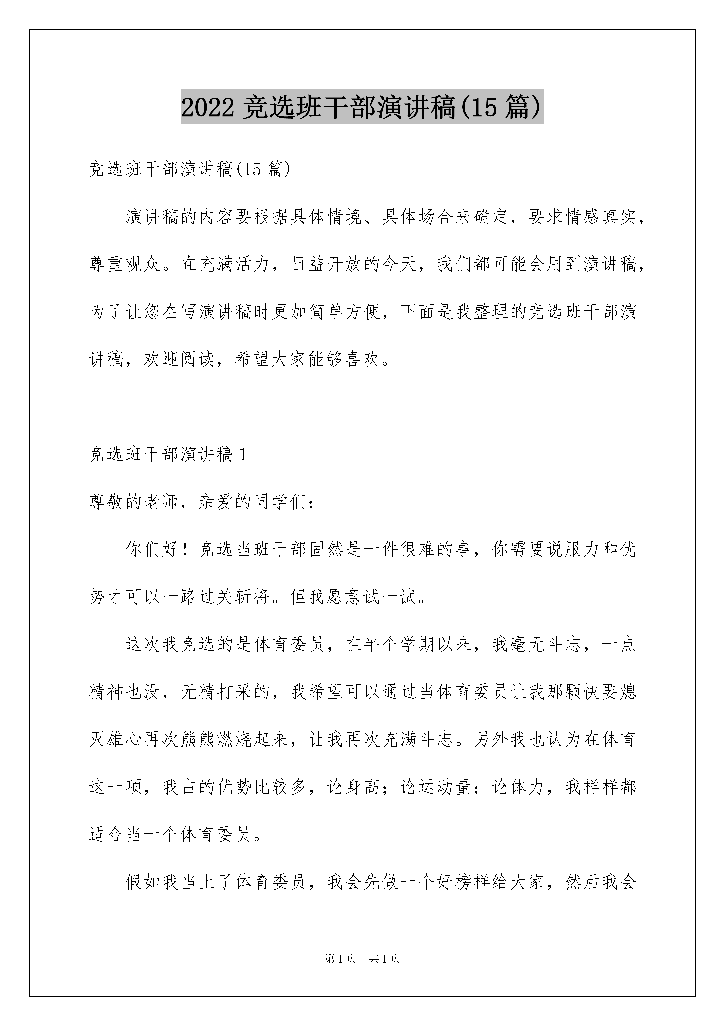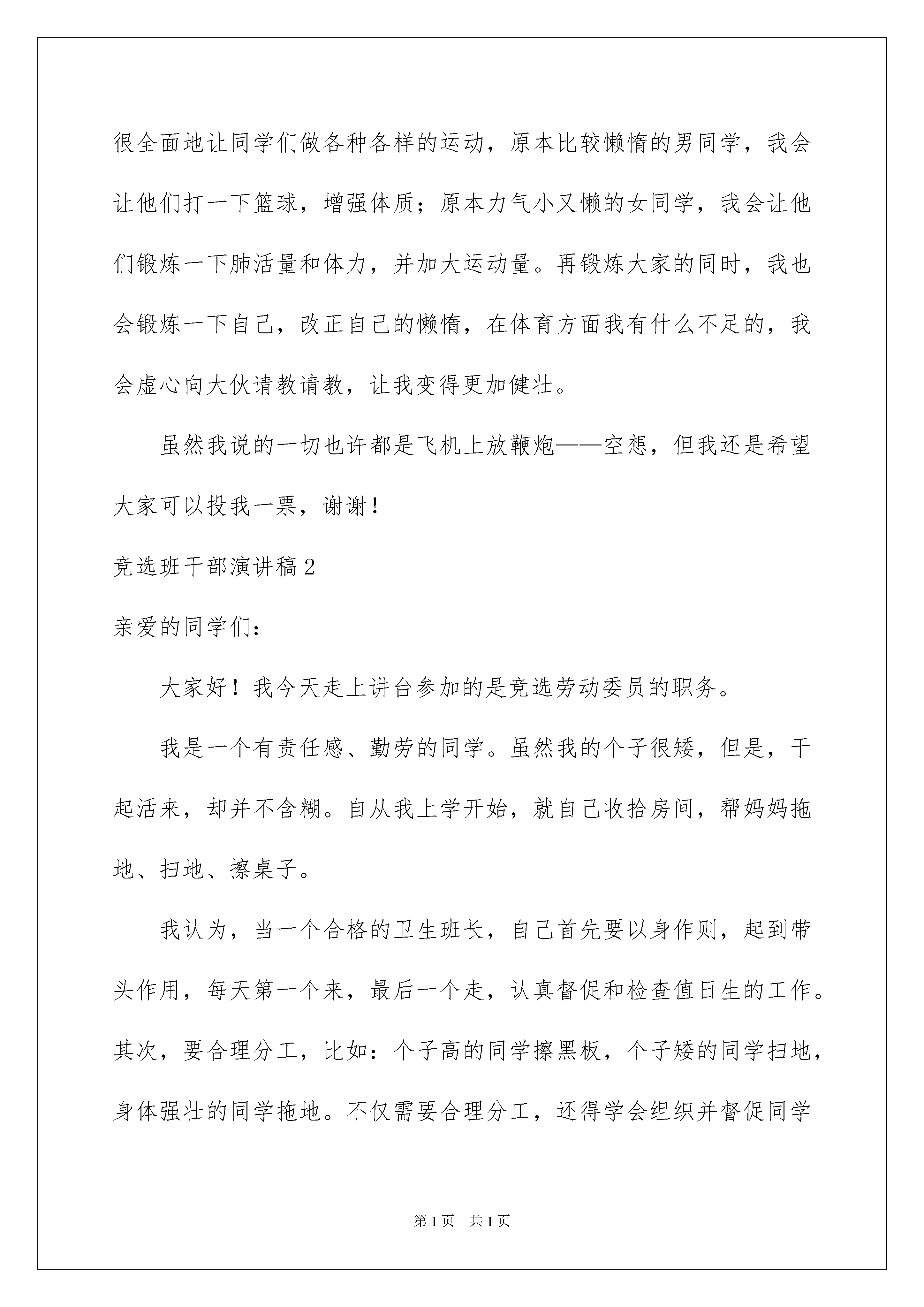 2022竞选班干部演讲稿(15篇)竞选班干部演讲稿(15篇)演讲稿的内容要根据具体情境、具体场合来确定,要求情感真实,尊重观众。在充满活力,日益开放的今天,我们都可能会用到演讲稿,为了让您在写演讲稿时更加简单方便,下面是我整理的竞选班干部演讲稿,欢迎阅读,希望大家能够喜欢。竞选班干部演讲稿1尊敬的老师,亲爱的同学们:你们好!竞选当班干部固然是一件很难的事,你需要说服力和优势才可以一路过关斩将。但我愿意试一试。这次我竞选的是体育委员,在半个学期以来,我毫无斗志,一点精神也没,无精打采的,我希望可以通过当体育委员让我那颗快要熄灭雄心再次熊熊燃烧起来,让我再次充满斗志。另外我也认为在体育这一项,我占的优势比较多,论身高;论运动量;论体力,我样样都适合当一个体育委员。假如我当上了体育委员,我会先做一个好榜样给大家,然后我会很全面地让同学们做各种各样的运动,原本比较懒惰的男同学,我会让他们打一下篮球,增强体质;原本力气小又懒的女同学,我会让他们锻炼一下肺活量和体力,并加大运动量。再锻炼大家的同时,我也会锻炼一下自己,改正自己的懒惰,在体育方面我有什么不足的,我会虚心向大伙请教请教,让我变得更加健壮。虽然我说的一切也许都是飞机上放鞭炮——空想,但我还是希望大家可以投我一票,谢谢!竞选班干部演讲稿2亲爱的同学们:大家好!我今天走上讲台参加的是竞选劳动委员的职务。我是一个有责任感、勤劳的同学。虽然我的个子很矮,但是,干起活来,却并不含糊。自从我上学开始,就自己收拾房间,帮妈妈拖地、扫地、擦桌子。我认为,当一个合格的卫生班长,自己首先要以身作则,起到带头作用,每天第一个来,最后一个走,认真督促和检查值日生的工作。其次,要合理分工,比如:个子高的同学擦黑板,个子矮的同学扫地,身体强壮的同学拖地。不仅需要合理分工,还得学会组织并督促同学们认真打扫卫生。如果我当上了卫生班长,我会严格要求自己和别人,而且,因为我刚上任,没有经验,所以请同学们尽量帮助我,让我干得更出色,争取让卫生流动红旗在我们六年级四班安家。如果我落选了,那就说明我还有许多不足,请大家多多提出对我的意见和建议,我一定会积极、努力改正的!记得卡耐基说过:“不要怕推销自己,只要你认为自己有才华,你就应该认为自己有资格担当这个职务。”我深深的相信这句话,所以希望大家支持我,投我宝贵的一票。谢谢大家!竞选班干部演讲稿3尊敬的老师,同学们:大家好!我是朱琨彤,今天,我有勇气站在这里参加班干部竞选,我相信我有能力,有信心干好这份工作。班干部的职责是什么呢?我认为,班干部的职责是帮助老师安排好班里的一些工作,成为老师好帮手;班干部的职责是团结每一位同学,帮助每一位同学,使五七班成为一个团结友爱的集体。如果我是班干部,我会富有爱心,帮助班上的每一位同学,在学习和生活上热心地帮助他们,争取不让一位同学掉队;如果我是班干部,我会以身作则,学习上,我要刻苦努力而且认真,行为习惯上,我要严于律己,成为同学们的好榜样;如果我是班干部,我会非常民主,听取每一位同学的意见。我知道我也有一些缺点,比如说粗心大意等等,但是我想通过当班干部,我会改正这一些不好的习惯的。请相信我,将你宝贵的一票投给我,这一定是你无悔的选择,我不会辜负大家对我的期望,请大家记住:给我一个机会,我将还大家一个奇迹。谢谢!竞选班干部演讲稿4亲爱的老师,同学们:大家好!今天,很荣幸走上讲台,和那么多乐意为班级做贡献的同学一道,竞选班干部职务。我想,我将用旺盛的精力、满腔的热情来做好班干部工作,来发挥我的长处来帮助同学和班集体共同努力进步。我想当实干家,因为我有优势,不需要那些美丽的词汇来修饰。有许多优势和任务我都能办得踏踏实实认认真真。我觉得我适合当班长,因为我有能力,因为戴尔卡耐基说过:“不要怕推销自己,只要你认为自己有才华,你就应该认为自己有资格提任这个任务。”我相信,凭着自己新锐不俗的观念,凭着我与大家同舟共济的深厚的友情,这次竞选演讲给我带来的自己的快乐,我认为做个班干部“无功就是过。”我将与风华正茂的同学们在一起,指点江山,发出我们青春的呼喊。假如我要当班长,我会严格对待自己,我会让学习程度好的同学教程度差的同学,学习好成立小组去办黑板报,每期都出一期,争取让班级得上五星班,为我们班争光,我的努力关系到班级是否能得五星班级。我自信在同学们的帮助下,我能胜任这项工作,正由于这种内驱力,我走向这个讲台的时候,我感到信心百倍。请大家伙投我一票!竞选班干部演讲稿5尊敬的老师,亲爱的同学们:大家上午好!我叫xx,今天在这里跟大家一起感到很荣幸,大家对我也有一个初步的了解了吧,经过十几天的军训