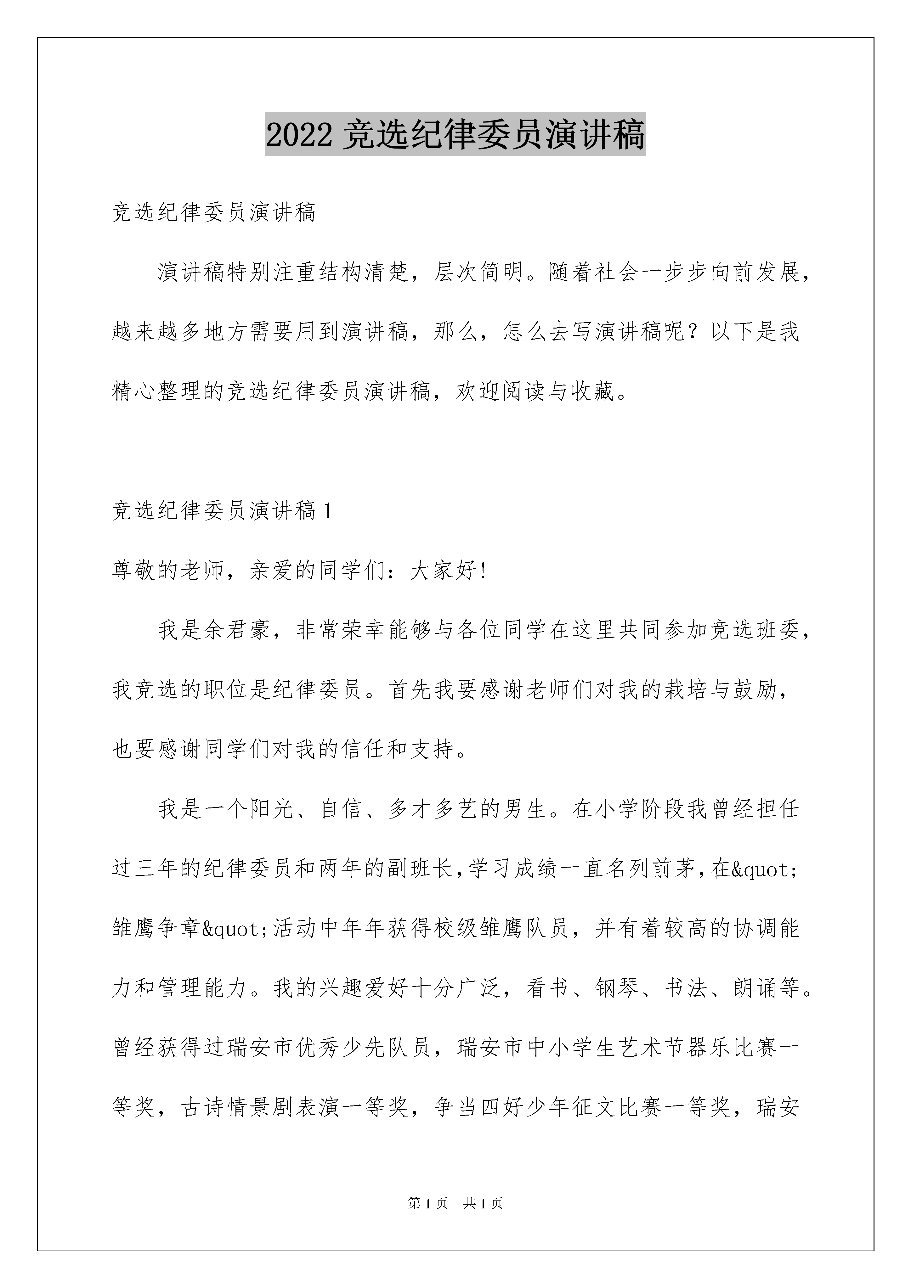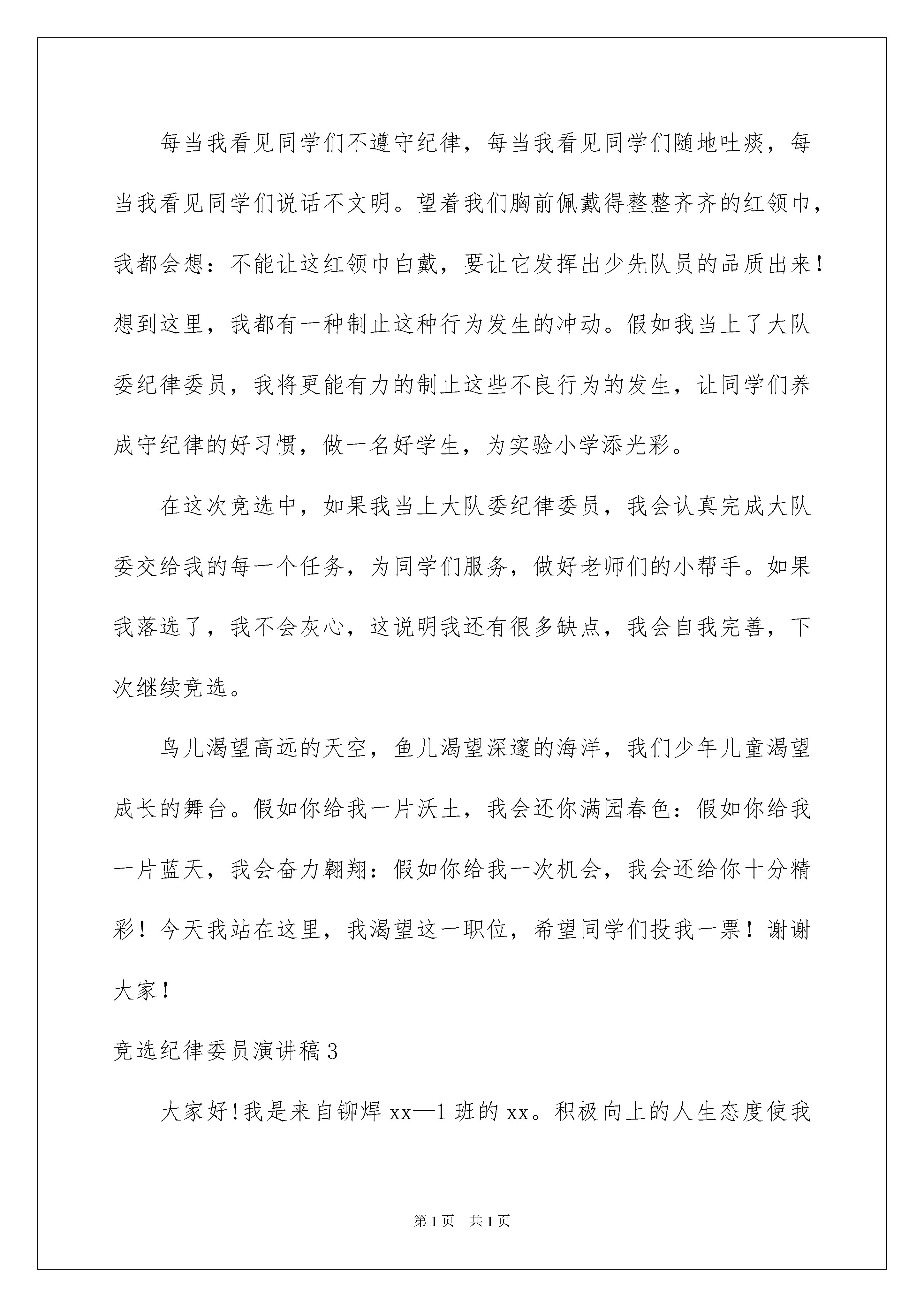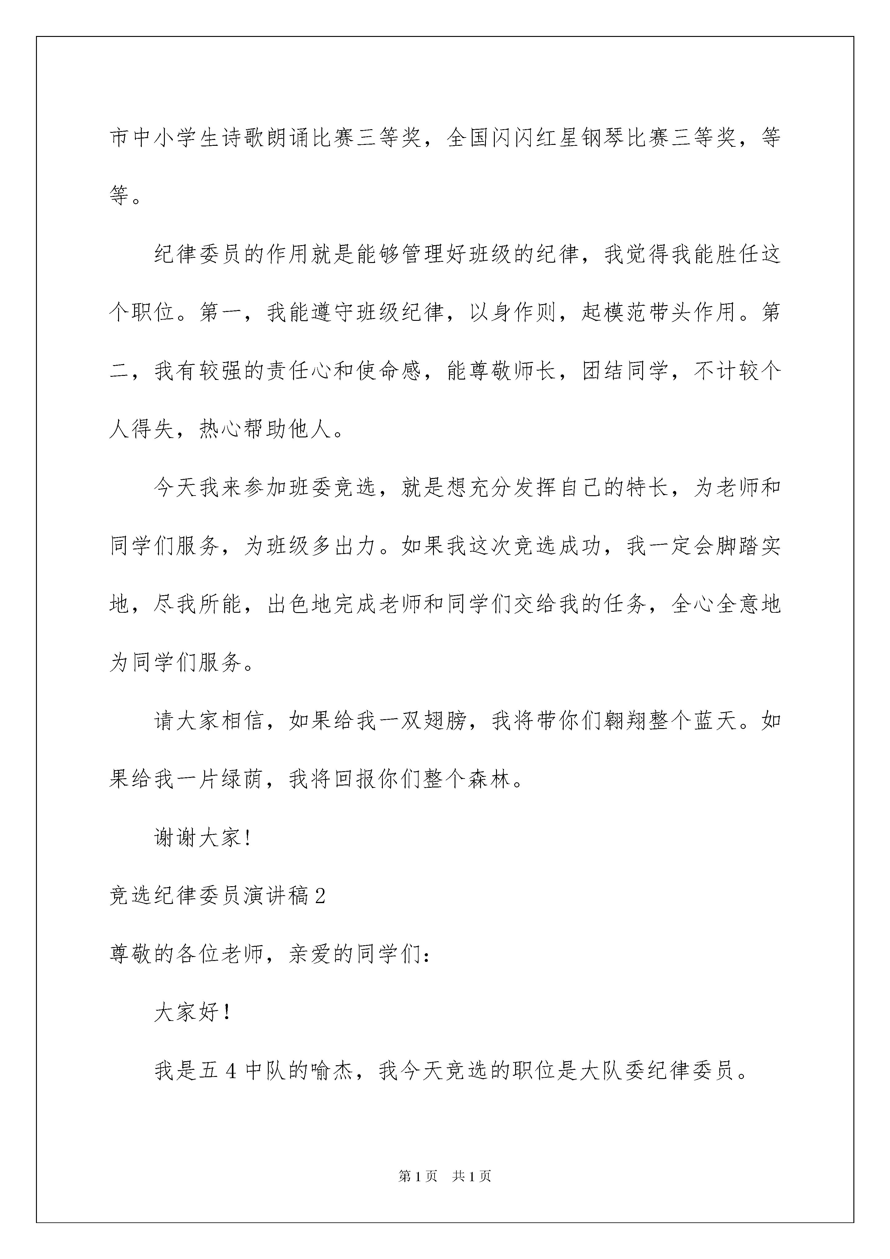 2022竞选纪律委员演讲稿竞选纪律委员演讲稿演讲稿特别注重结构清楚,层次简明。随着社会一步步向前发展,越来越多地方需要用到演讲稿,那么,怎么去写演讲稿呢?以下是我精心整理的竞选纪律委员演讲稿,欢迎阅读与收藏。竞选纪律委员演讲稿1尊敬的老师,亲爱的同学们:大家好!我是余君豪,非常荣幸能够与各位同学在这里共同参加竞选班委,我竞选的职位是纪律委员。首先我要感谢老师们对我的栽培与鼓励,也要感谢同学们对我的信任和支持。我是一个阳光、自信、多才多艺的男生。在小学阶段我曾经担任过三年的纪律委员和两年的副班长,学习成绩一直名列前茅,在"雏鹰争章"活动中年年获得校级雏鹰队员,并有着较高的协调能力和管理能力。我的兴趣爱好十分广泛,看书、钢琴、书法、朗诵等。曾经获得过瑞安市优秀少先队员,瑞安市中小学生艺术节器乐比赛一等奖,古诗情景剧表演一等奖,争当四好少年征文比赛一等奖,瑞安市中小学生诗歌朗诵比赛三等奖,全国闪闪红星钢琴比赛三等奖,等等。纪律委员的作用就是能够管理好班级的纪律,我觉得我能胜任这个职位。第一,我能遵守班级纪律,以身作则,起模范带头作用。第二,我有较强的责任心和使命感,能尊敬师长,团结同学,不计较个人得失,热心帮助他人。今天我来参加班委竞选,就是想充分发挥自己的特长,为老师和同学们服务,为班级多出力。如果我这次竞选成功,我一定会脚踏实地,尽我所能,出色地完成老师和同学们交给我的任务,全心全意地为同学们服务。请大家相信,如果给我一双翅膀,我将带你们翱翔整个蓝天。如果给我一片绿荫,我将回报你们整个森林。谢谢大家!竞选纪律委员演讲稿2尊敬的各位老师,亲爱的同学们:大家好!我是五4中队的喻杰,我今天竞选的职位是大队委纪律委员。每当我看见同学们不遵守纪律,每当我看见同学们随地吐痰,每当我看见同学们说话不文明。望着我们胸前佩戴得整整齐齐的红领巾,我都会想:不能让这红领巾白戴,要让它发挥出少先队员的品质出来!想到这里,我都有一种制止这种行为发生的冲动。假如我当上了大队委纪律委员,我将更能有力的制止这些不良行为的发生,让同学们养成守纪律的好习惯,做一名好学生,为实验小学添光彩。在这次竞选中,如果我当上大队委纪律委员,我会认真完成大队委交给我的每一个任务,为同学们服务,做好老师们的小帮手。如果我落选了,我不会灰心,这说明我还有很多缺点,我会自我完善,下次继续竞选。鸟儿渴望高远的天空,鱼儿渴望深邃的海洋,我们少年儿童渴望成长的舞台。假如你给我一片沃土,我会还你满园春色:假如你给我一片蓝天,我会奋力翱翔:假如你给我一次机会,我会还给你十分精彩!今天我站在这里,我渴望这一职位,希望同学们投我一票!谢谢大家!竞选纪律委员演讲稿3大家好!我是来自铆焊xx—1班的xx。积极向上的人生态度使我活泼开朗,兴趣广泛,积极参加并组织各种文体活动。阅读,写作和体育运动是我的特长和爱好。我在小学、初中曾担任过班长,学委等重要职务。这使我不断地锻炼自己,充实自己,完善自己。我也一向以原则办事,就像鲁迅先生说得一样:“走自己的路,让别人说去吧!”从小学到初中,我曾参加过很多活动。使我炼就了不畏艰难险阻,勇往直前,坚忍不屈的顽强性格。在繁忙的学习生活之余,我也总是组织开展各种活动。我也是一个勇于追求完美的人。我知道这世上没有十全十美的人,但我可以向着美好的方向去努力,去靠拢,那就意味着我要不断地学习,努力地去完善自己。我像萤火虫一样,需要光芒,定会发光;也像月亮一样,即使黑夜,也不会因此暗淡;因为我坚信:是金子就会发光,是星星就会闪亮!有人说,年轻是无往不胜的利器,张扬着朝气蓬勃的吸引力,而我所向往的,就是用我如火的激情去融化一切被冰封的阴霾;有人说,梦想缤纷于现实,斑斓着火红的希望,而我所追求的就是在临界点所爆发出的炽热火焰,引领我走向生命的颠峰,成就刹那的辉煌。所以,我申请加入学生会的组织纪律部。我会像水滴投入大海那样,献出自己无悔的青春,用我对待工作的满腔热忱为学生会业绩的蒸蒸日上出自己的一份力量。作为一名中专一年级的学生,我深知纪律工作的重要性。俗话说,不以规矩不成方圆。所以,纪律工作是非常重要的。当我成为组织纪律部的委员时,我将努力工作,兢兢业业,勤勤恳恳,任劳任怨;何时何地需要我,我就将会出现在何时,闪现在何地。我会好好地向高年级的学哥学姐学习。他们交给我的任务,我一定会努力去做,努力做好。不失掉每一次奉献自我,服务他人的机会;不放掉每一次锻炼自我,走向完美的机会;虽然我的能力有限,但我定会献出我最真挚的诚心!当我成为组织纪律部的委员时,我会由始至终地遵循“吃苦在前,享乐在后,有求必应”的学生会宗
