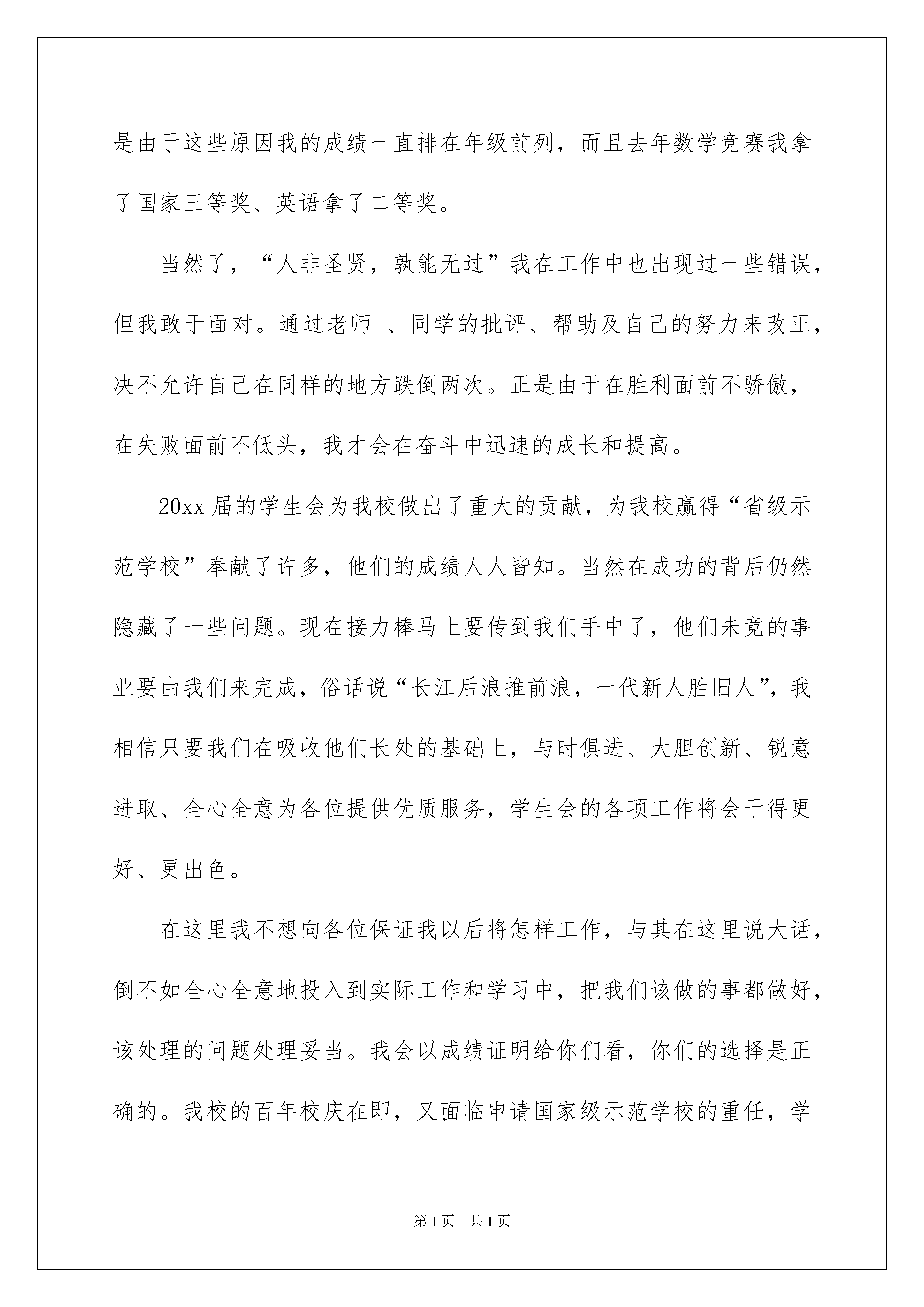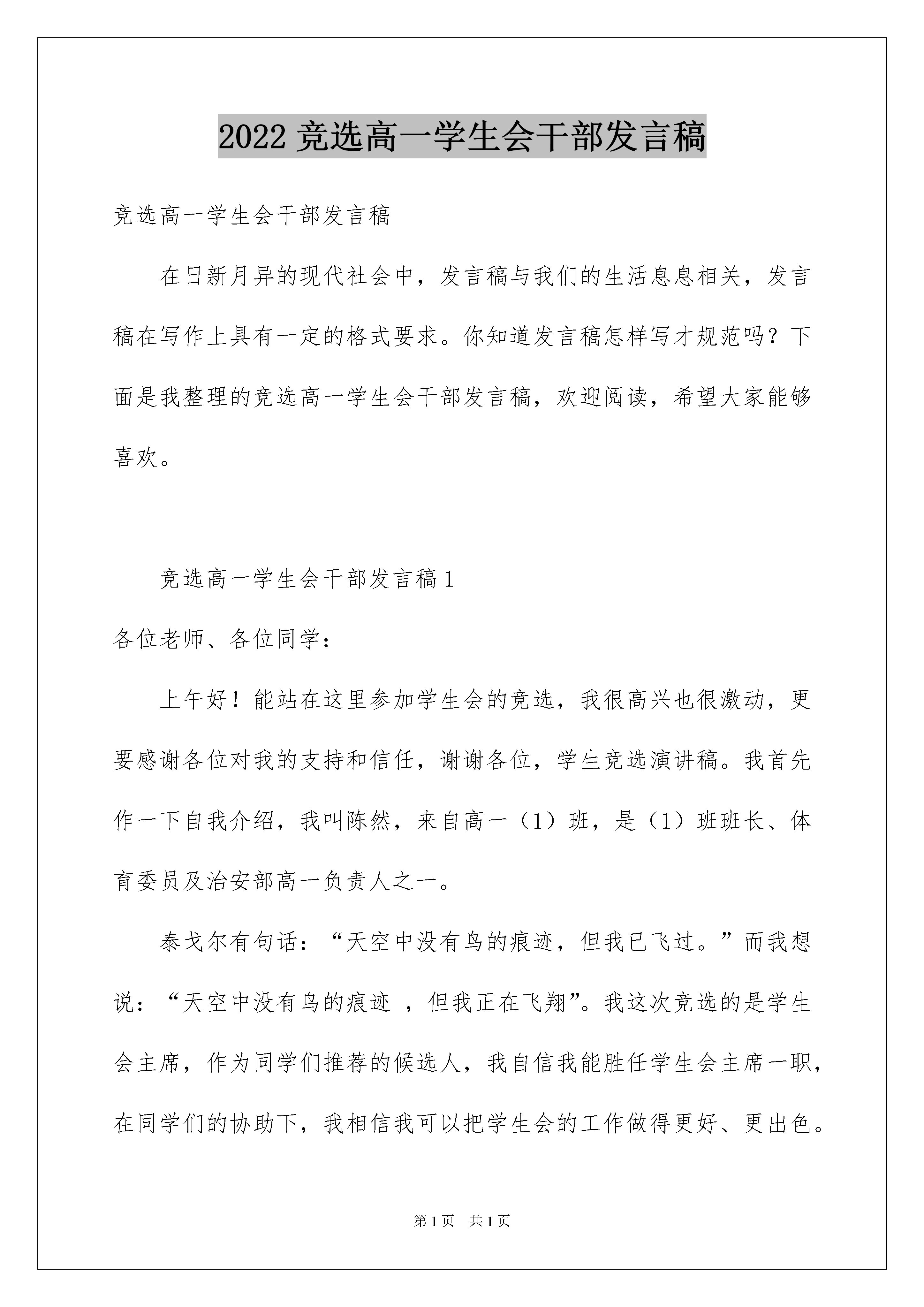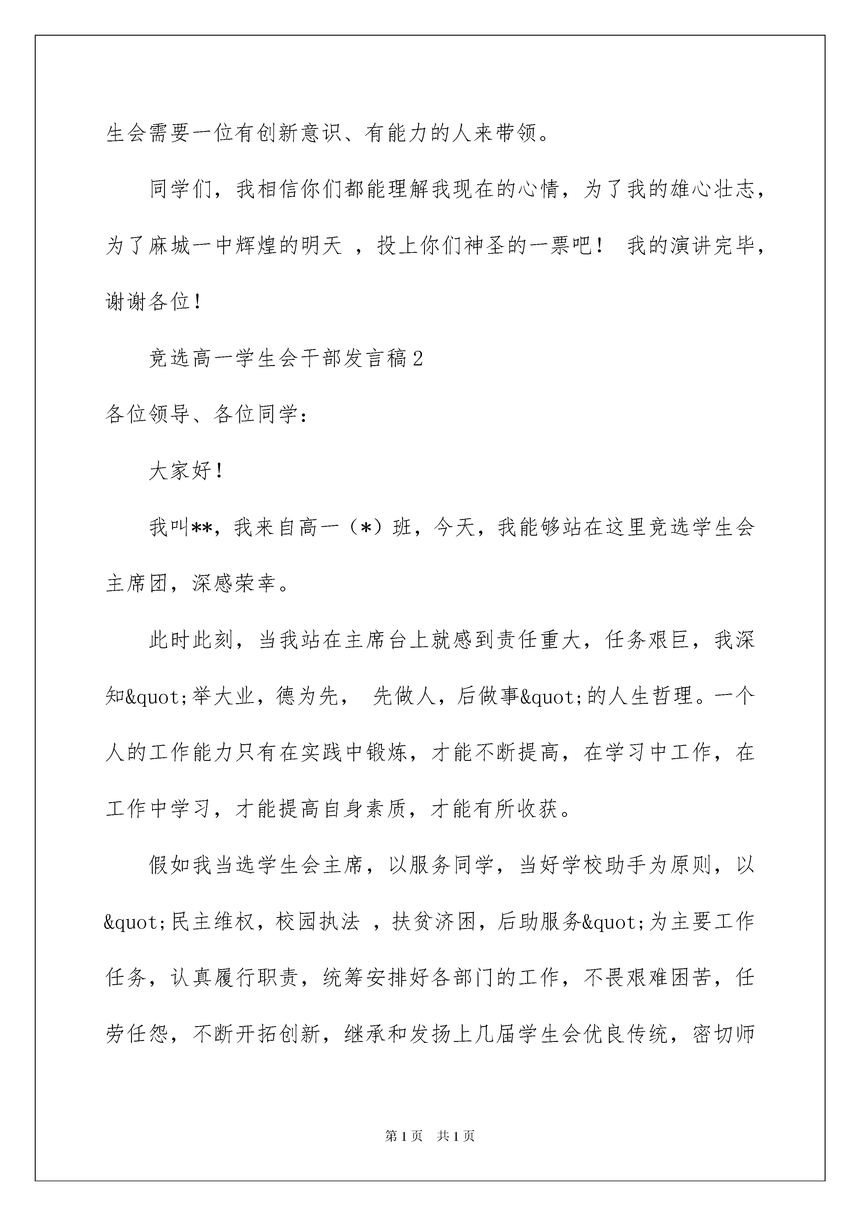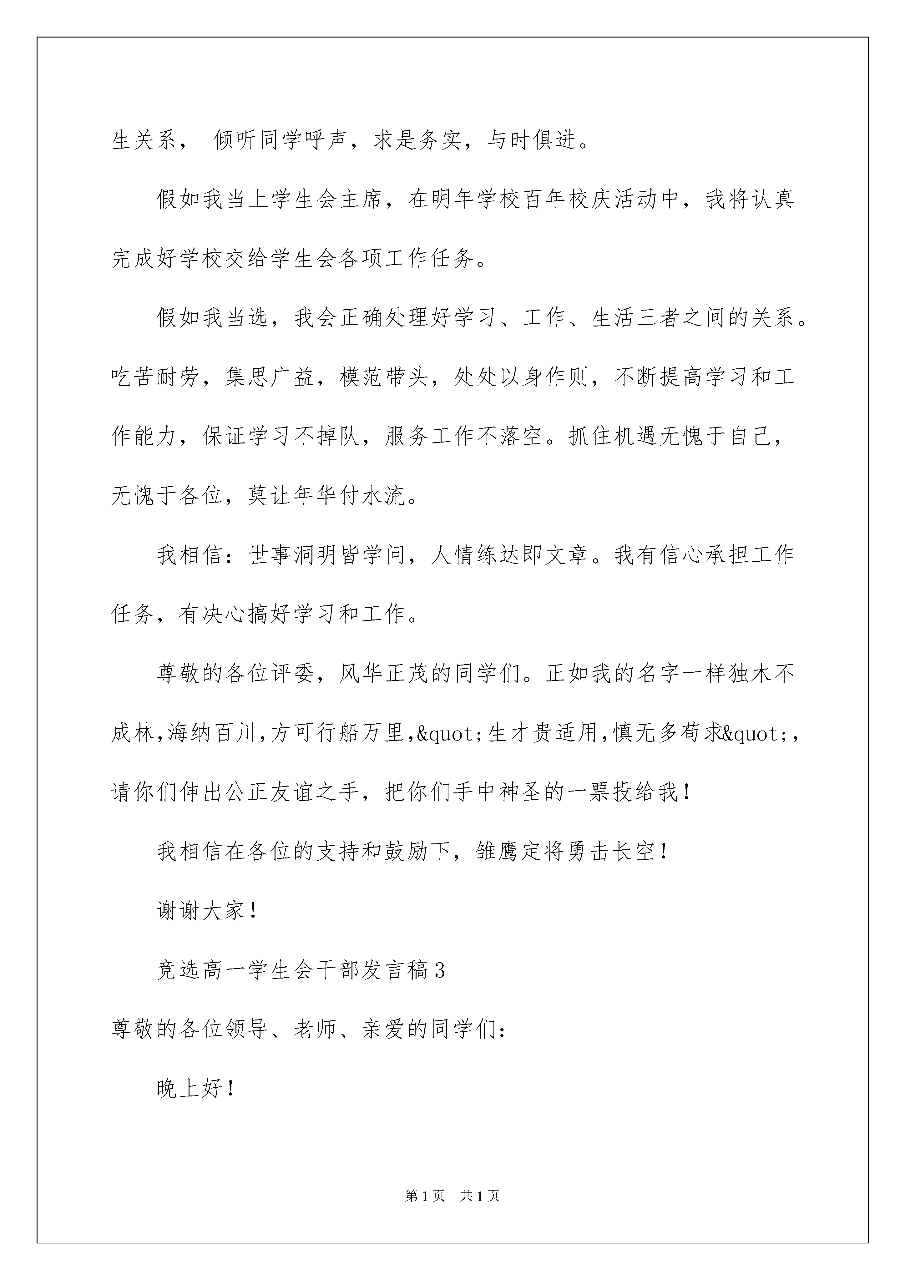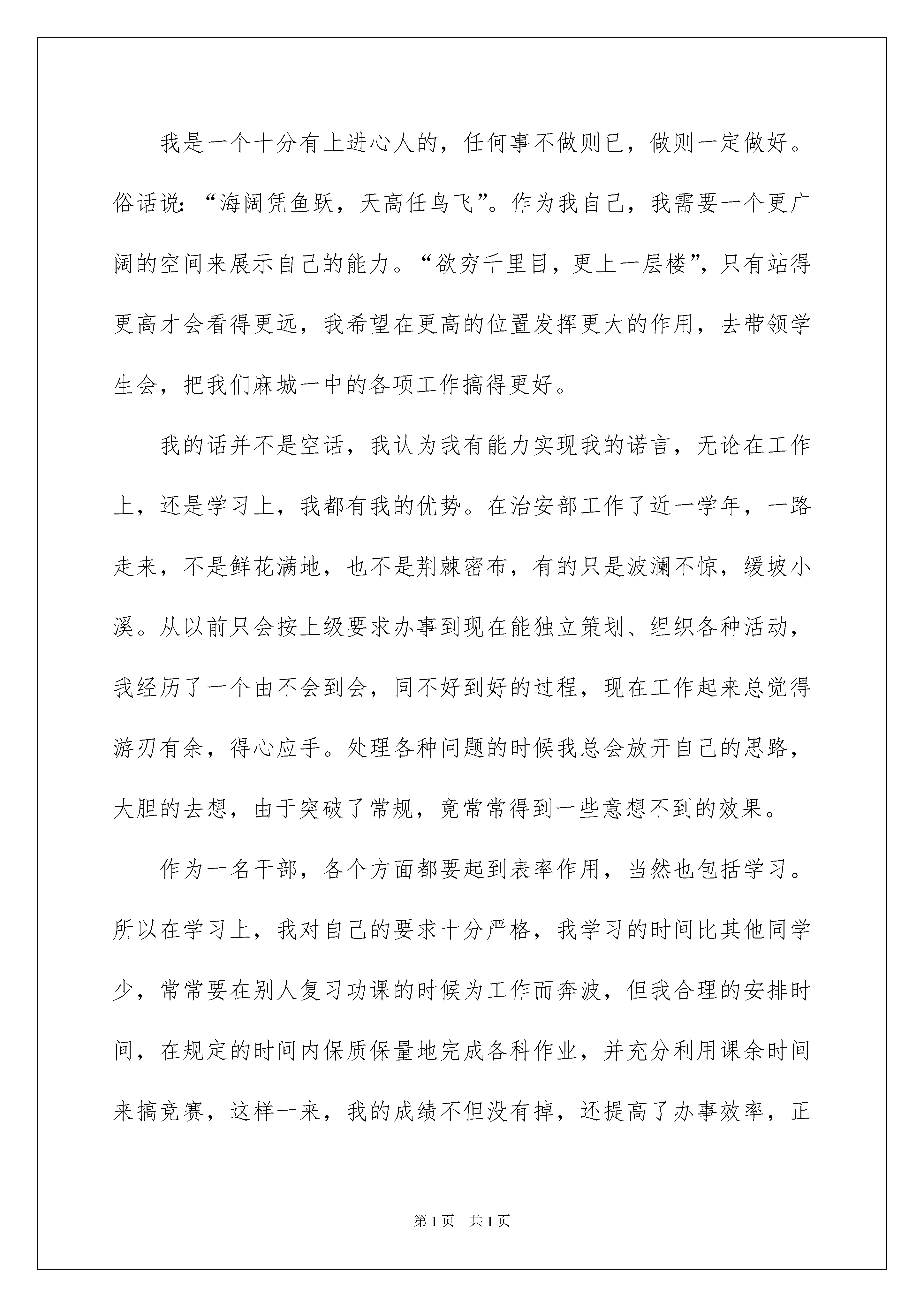 2022竞选高一学生会干部发言稿竞选高一学生会干部发言稿在日新月异的现代社会中,发言稿与我们的生活息息相关,发言稿在写作上具有一定的格式要求。你知道发言稿怎样写才规范吗?下面是我整理的竞选高一学生会干部发言稿,欢迎阅读,希望大家能够喜欢。竞选高一学生会干部发言稿1各位老师、各位同学:上午好!能站在这里参加学生会的竞选,我很高兴也很激动,更要感谢各位对我的支持和信任,谢谢各位,学生竞选演讲稿。我首先作一下自我介绍,我叫陈然,来自高一(1)班,是(1)班班长、体育委员及治安部高一负责人之一。泰戈尔有句话:“天空中没有鸟的痕迹,但我已飞过。”而我想说:“天空中没有鸟的痕迹,但我正在飞翔”。我这次竞选的是学生会主席,作为同学们推荐的候选人,我自信我能胜任学生会主席一职,在同学们的协助下,我相信我可以把学生会的工作做得更好、更出色。我是一个十分有上进心人的,任何事不做则已,做则一定做好。俗话说:“海阔凭鱼跃,天高任鸟飞”。作为我自己,我需要一个更广阔的空间来展示自己的能力。“欲穷千里目,更上一层楼”,只有站得更高才会看得更远,我希望在更高的位置发挥更大的作用,去带领学生会,把我们麻城一中的各项工作搞得更好。我的话并不是空话,我认为我有能力实现我的诺言,无论在工作上,还是学习上,我都有我的优势。在治安部工作了近一学年,一路走来,不是鲜花满地,也不是荆棘密布,有的只是波澜不惊,缓坡小溪。从以前只会按上级要求办事到现在能独立策划、组织各种活动,我经历了一个由不会到会,同不好到好的过程,现在工作起来总觉得游刃有余,得心应手。处理各种问题的时候我总会放开自己的思路,大胆的去想,由于突破了常规,竟常常得到一些意想不到的效果。作为一名干部,各个方面都要起到表率作用,当然也包括学习。所以在学习上,我对自己的要求十分严格,我学习的时间比其他同学少,常常要在别人复习功课的时候为工作而奔波,但我合理的安排时间,在规定的时间内保质保量地完成各科作业,并充分利用课余时间来搞竞赛,这样一来,我的成绩不但没有掉,还提高了办事效率,正是由于这些原因我的成绩一直排在年级前列,而且去年数学竞赛我拿了国家三等奖、英语拿了二等奖。当然了,“人非圣贤,孰能无过”我在工作中也出现过一些错误,但我敢于面对。通过老师、同学的批评、帮助及自己的努力来改正,决不允许自己在同样的地方跌倒两次。正是由于在胜利面前不骄傲,在失败面前不低头,我才会在奋斗中迅速的成长和提高。20xx届的学生会为我校做出了重大的贡献,为我校赢得“省级示范学校”奉献了许多,他们的成绩人人皆知。当然在成功的背后仍然隐藏了一些问题。现在接力棒马上要传到我们手中了,他们未竟的事业要由我们来完成,俗话说“长江后浪推前浪,一代新人胜旧人”,我相信只要我们在吸收他们长处的基础上,与时俱进、大胆创新、锐意进取、全心全意为各位提供优质服务,学生会的各项工作将会干得更好、更出色。在这里我不想向各位保证我以后将怎样工作,与其在这里说大话,倒不如全心全意地投入到实际工作和学习中,把我们该做的事都做好,该处理的问题处理妥当。我会以成绩证明给你们看,你们的选择是正确的。我校的百年校庆在即,又面临申请国家级示范学校的重任,学生会需要一位有创新意识、有能力的人来带领。同学们,我相信你们都能理解我现在的心情,为了我的雄心壮志,为了麻城一中辉煌的明天,投上你们神圣的一票吧!我的演讲完毕,谢谢各位!竞选高一学生会干部发言稿2各位领导、各位同学:大家好!我叫**,我来自高一(*)班,今天,我能够站在这里竞选学生会主席团,深感荣幸。此时此刻,当我站在主席台上就感到责任重大,任务艰巨,我深知"举大业,德为先,先做人,后做事"的人生哲理。一个人的工作能力只有在实践中锻炼,才能不断提高,在学习中工作,在工作中学习,才能提高自身素质,才能有所收获。假如我当选学生会主席,以服务同学,当好学校助手为原则,以"民主维权,校园执法,扶贫济困,后助服务"为主要工作任务,认真履行职责,统筹安排好各部门的工作,不畏艰难困苦,任劳任怨,不断开拓创新,继承和发扬上几届学生会优良传统,密切师生关系,倾听同学呼声,求是务实,与时俱进。假如我当上学生会主席,在明年学校百年校庆活动中,我将认真完成好学校交给学生会各项工作任务。假如我当选,我会正确处理好学习、工作、生活三者之间的关系。吃苦耐劳,集思广益,模范带头,处处以身作则,不断提高学习和工作能力,保证学习不掉队,服务工作不落空。抓住机遇无愧于自己,无愧于各位,莫让年华付水流。我相信:世事洞明皆学问,人情练达即文章。我有信心承担工作任务,有决心