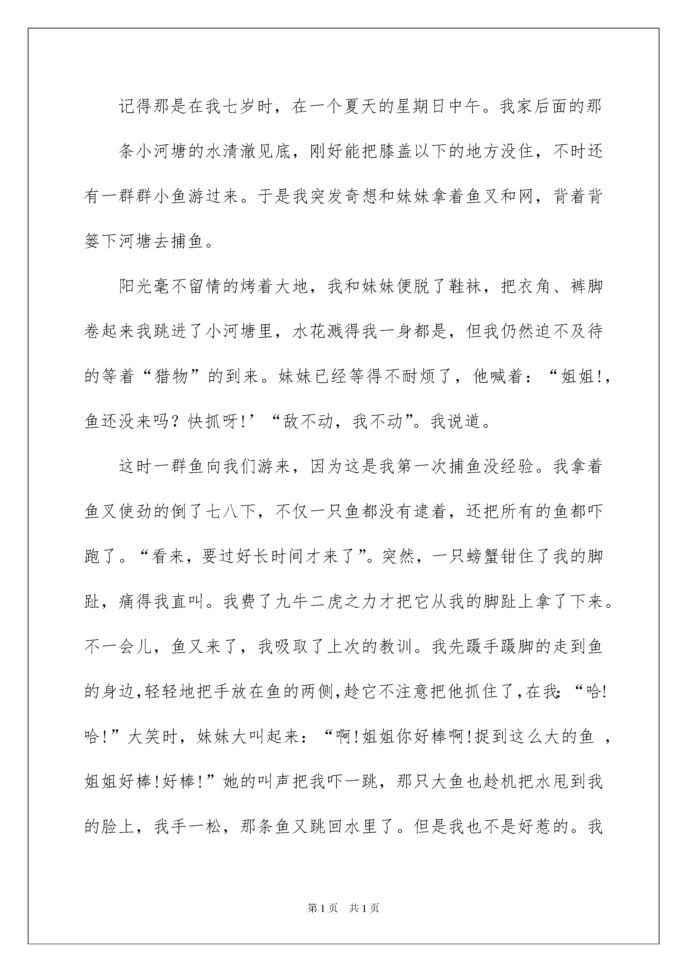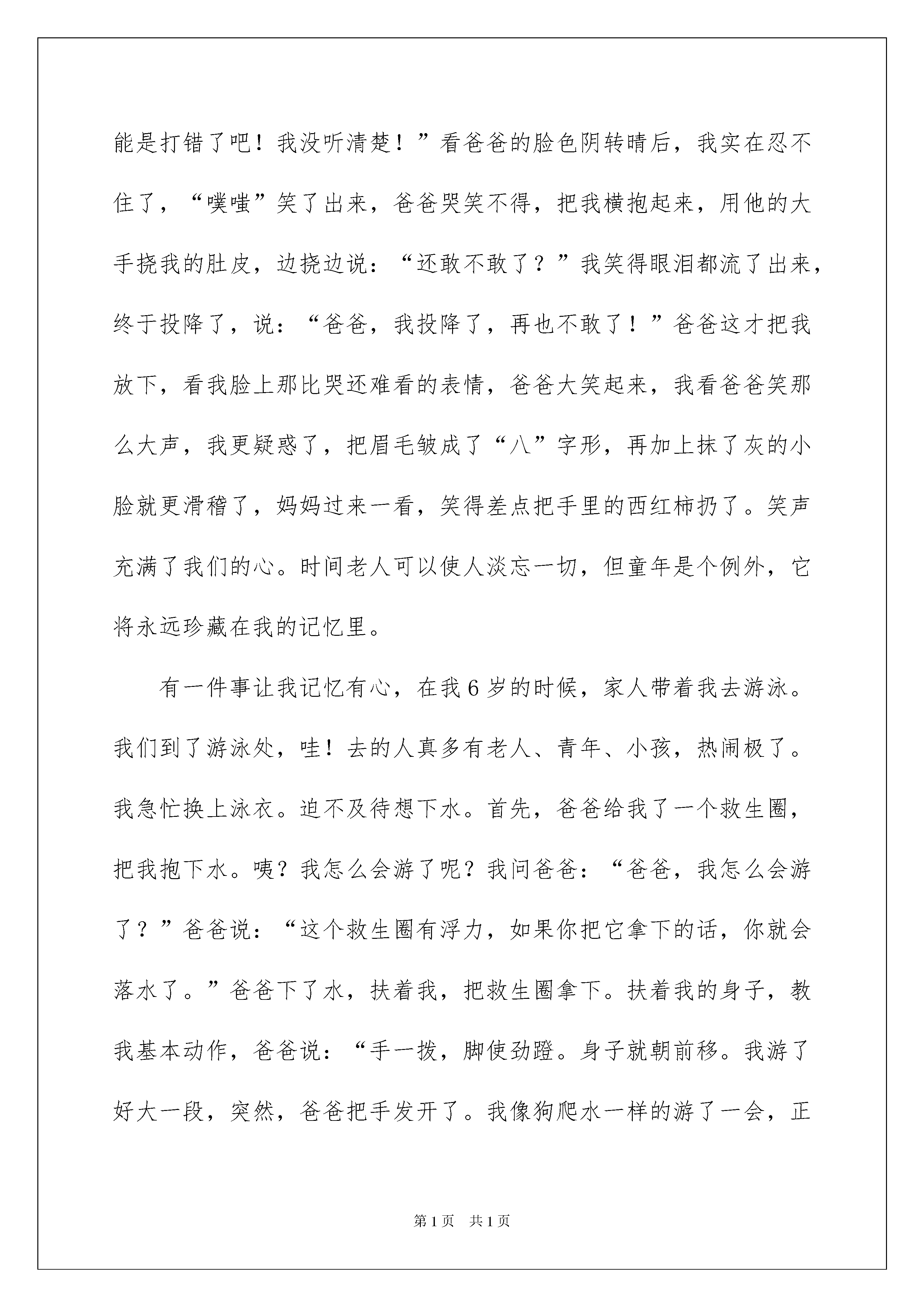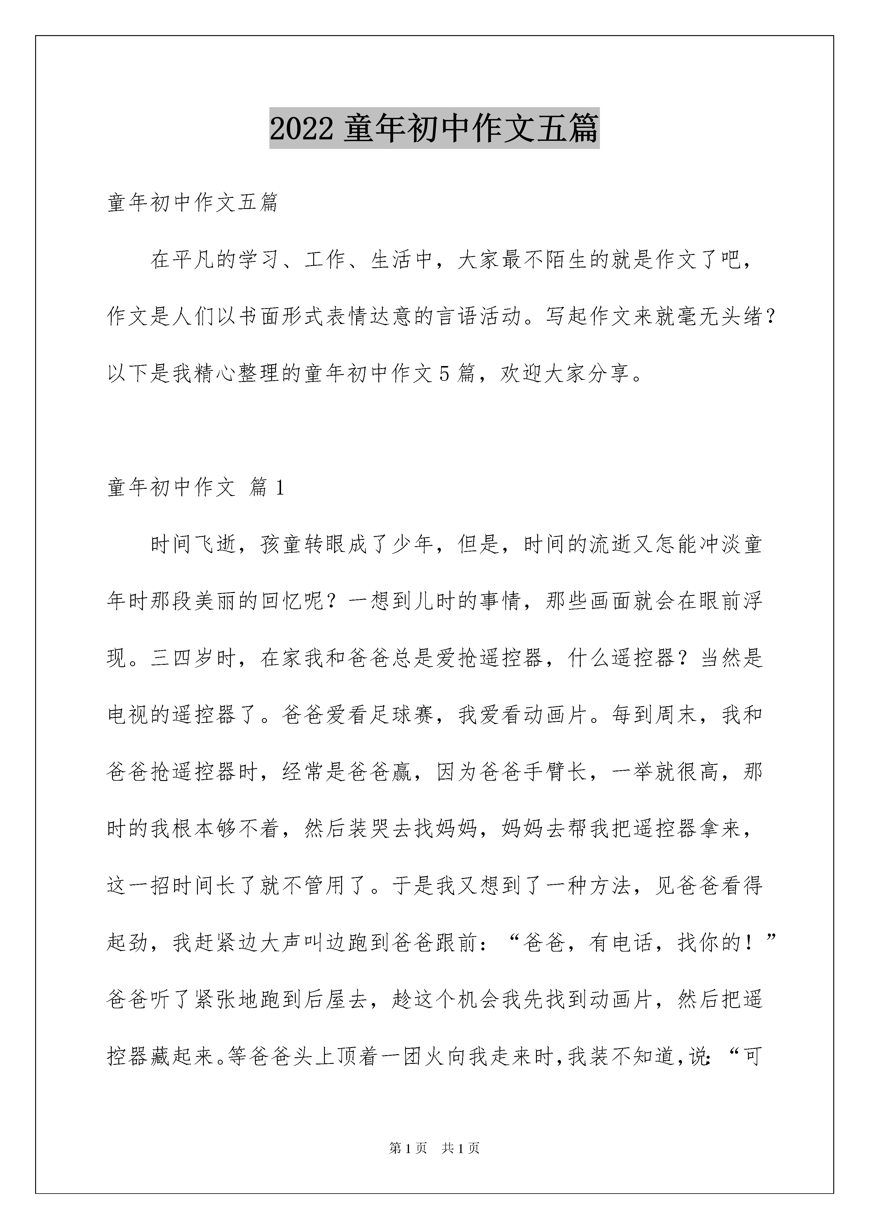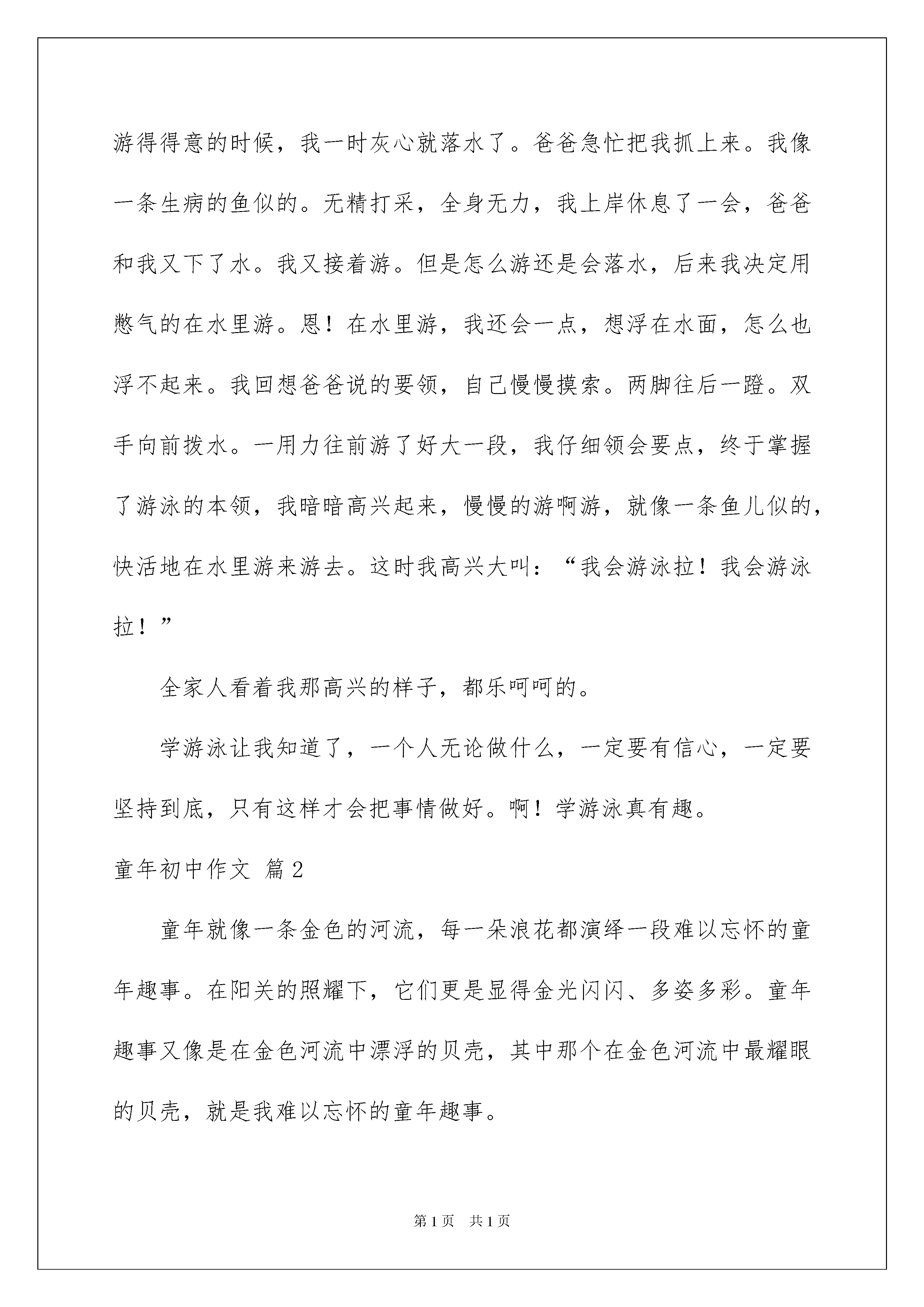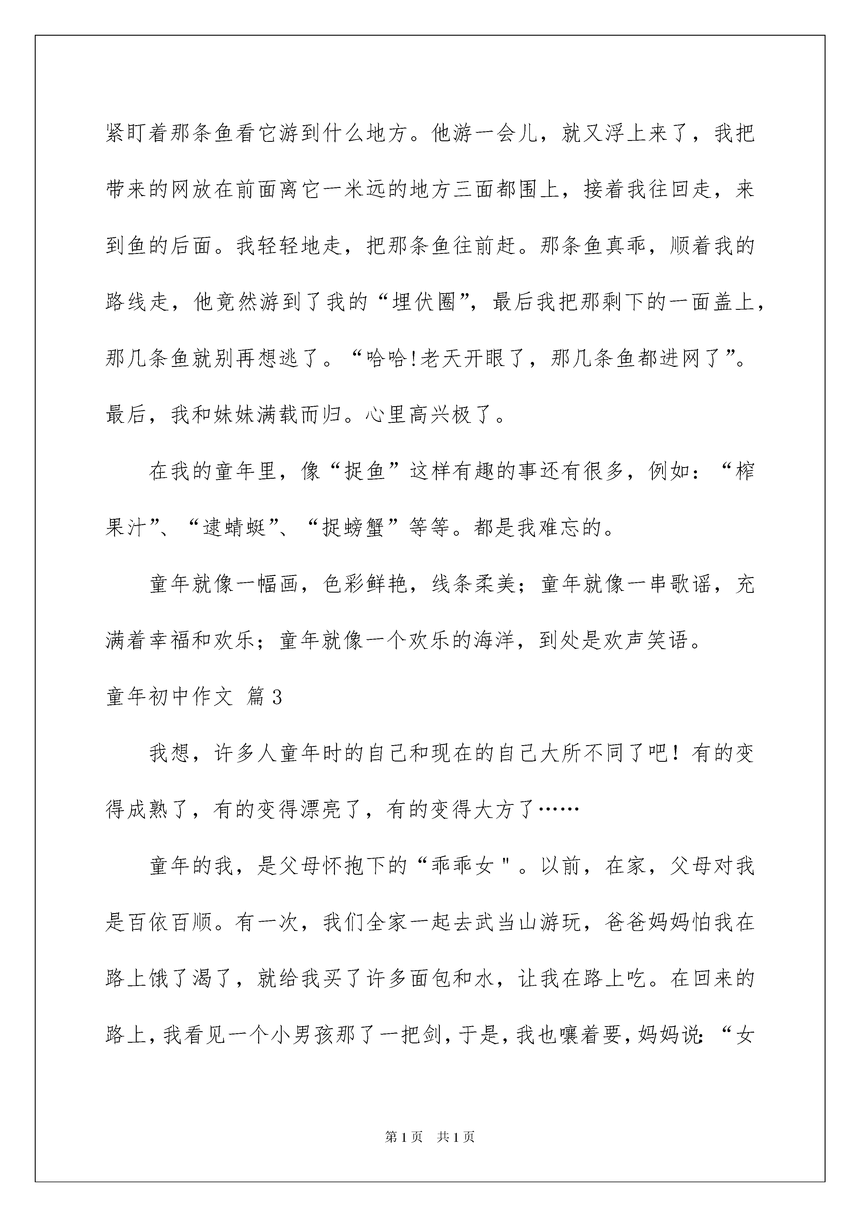 2022童年初中作文五篇童年初中作文五篇在平凡的学习、工作、生活中,大家最不陌生的就是作文了吧,作文是人们以书面形式表情达意的言语活动。写起作文来就毫无头绪?以下是我精心整理的童年初中作文5篇,欢迎大家分享。童年初中作文篇1时间飞逝,孩童转眼成了少年,但是,时间的流逝又怎能冲淡童年时那段美丽的回忆呢?一想到儿时的事情,那些画面就会在眼前浮现。三四岁时,在家我和爸爸总是爱抢遥控器,什么遥控器?当然是电视的遥控器了。爸爸爱看足球赛,我爱看动画片。每到周末,我和爸爸抢遥控器时,经常是爸爸赢,因为爸爸手臂长,一举就很高,那时的我根本够不着,然后装哭去找妈妈,妈妈去帮我把遥控器拿来,这一招时间长了就不管用了。于是我又想到了一种方法,见爸爸看得起劲,我赶紧边大声叫边跑到爸爸跟前:“爸爸,有电话,找你的!”爸爸听了紧张地跑到后屋去,趁这个机会我先找到动画片,然后把遥控器藏起来。等爸爸头上顶着一团火向我走来时,我装不知道,说:“可能是打错了吧!我没听清楚!”看爸爸的脸色阴转晴后,我实在忍不住了,“噗嗤”笑了出来,爸爸哭笑不得,把我横抱起来,用他的大手挠我的肚皮,边挠边说:“还敢不敢了?”我笑得眼泪都流了出来,终于投降了,说:“爸爸,我投降了,再也不敢了!”爸爸这才把我放下,看我脸上那比哭还难看的表情,爸爸大笑起来,我看爸爸笑那么大声,我更疑惑了,把眉毛皱成了“八”字形,再加上抹了灰的小脸就更滑稽了,妈妈过来一看,笑得差点把手里的西红柿扔了。笑声充满了我们的心。时间老人可以使人淡忘一切,但童年是个例外,它将永远珍藏在我的记忆里。有一件事让我记忆有心,在我6岁的时候,家人带着我去游泳。我们到了游泳处,哇!去的人真多有老人、青年、小孩,热闹极了。我急忙换上泳衣。迫不及待想下水。首先,爸爸给我了一个救生圈,把我抱下水。咦?我怎么会游了呢?我问爸爸:“爸爸,我怎么会游了?”爸爸说:“这个救生圈有浮力,如果你把它拿下的话,你就会落水了。”爸爸下了水,扶着我,把救生圈拿下。扶着我的身子,教我基本动作,爸爸说:“手一拨,脚使劲蹬。身子就朝前移。我游了好大一段,突然,爸爸把手发开了。我像狗爬水一样的游了一会,正游得得意的时候,我一时灰心就落水了。爸爸急忙把我抓上来。我像一条生病的鱼似的。无精打采,全身无力,我上岸休息了一会,爸爸和我又下了水。我又接着游。但是怎么游还是会落水,后来我决定用憋气的在水里游。恩!在水里游,我还会一点,想浮在水面,怎么也浮不起来。我回想爸爸说的要领,自己慢慢摸索。两脚往后一蹬。双手向前拨水。一用力往前游了好大一段,我仔细领会要点,终于掌握了游泳的本领,我暗暗高兴起来,慢慢的游啊游,就像一条鱼儿似的,快活地在水里游来游去。这时我高兴大叫:“我会游泳拉!我会游泳拉!”全家人看着我那高兴的样子,都乐呵呵的。学游泳让我知道了,一个人无论做什么,一定要有信心,一定要坚持到底,只有这样才会把事情做好。啊!学游泳真有趣。童年初中作文篇2童年就像一条金色的河流,每一朵浪花都演绎一段难以忘怀的童年趣事。在阳关的照耀下,它们更是显得金光闪闪、多姿多彩。童年趣事又像是在金色河流中漂浮的贝壳,其中那个在金色河流中最耀眼的贝壳,就是我难以忘怀的童年趣事。记得那是在我七岁时,在一个夏天的星期日中午。我家后面的那条小河塘的水清澈见底,刚好能把膝盖以下的地方没住,不时还有一群群小鱼游过来。于是我突发奇想和妹妹拿着鱼叉和网,背着背篓下河塘去捕鱼。阳光毫不留情的烤着大地,我和妹妹便脱了鞋袜,把衣角、裤脚卷起来我跳进了小河塘里,水花溅得我一身都是,但我仍然迫不及待的等着“猎物”的到来。妹妹已经等得不耐烦了,他喊着:“姐姐!,鱼还没来吗?快抓呀!’“敌不动,我不动”。我说道。这时一群鱼向我们游来,因为这是我第一次捕鱼没经验。我拿着鱼叉使劲的倒了七八下,不仅一只鱼都没有逮着,还把所有的鱼都吓跑了。“看来,要过好长时间才来了”。突然,一只螃蟹钳住了我的脚趾,痛得我直叫。我费了九牛二虎之力才把它从我的脚趾上拿了下来。不一会儿,鱼又来了,我吸取了上次的教训。我先蹑手蹑脚的走到鱼的身边,轻轻地把手放在鱼的两侧,趁它不注意把他抓住了,在我:“哈!哈!”大笑时,妹妹大叫起来:“啊!姐姐你好棒啊!捉到这么大的鱼,姐姐好棒!好棒!”她的叫声把我吓一跳,那只大鱼也趁机把水甩到我的脸上,我手一松,那条鱼又跳回水里了。但是我也不是好惹的。我紧盯着那条鱼看它游到什么地方。他游一会儿,就又浮上来了,我把带来的网放在前面离它一米远的地方三面都围上,接着我往回走,来到鱼的后面。我轻轻地走,把那条鱼往前赶。那条鱼真乖,顺着我的路线走,他竟然游到了我的“