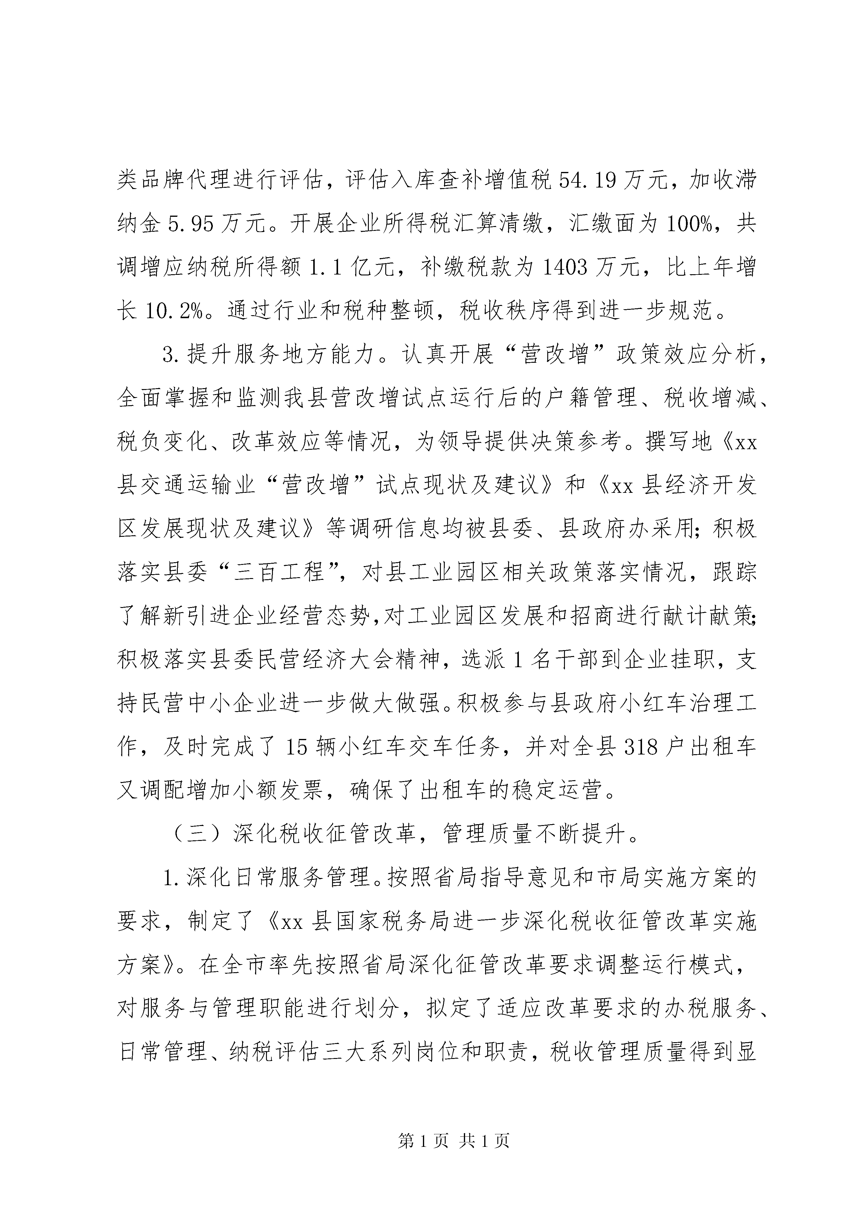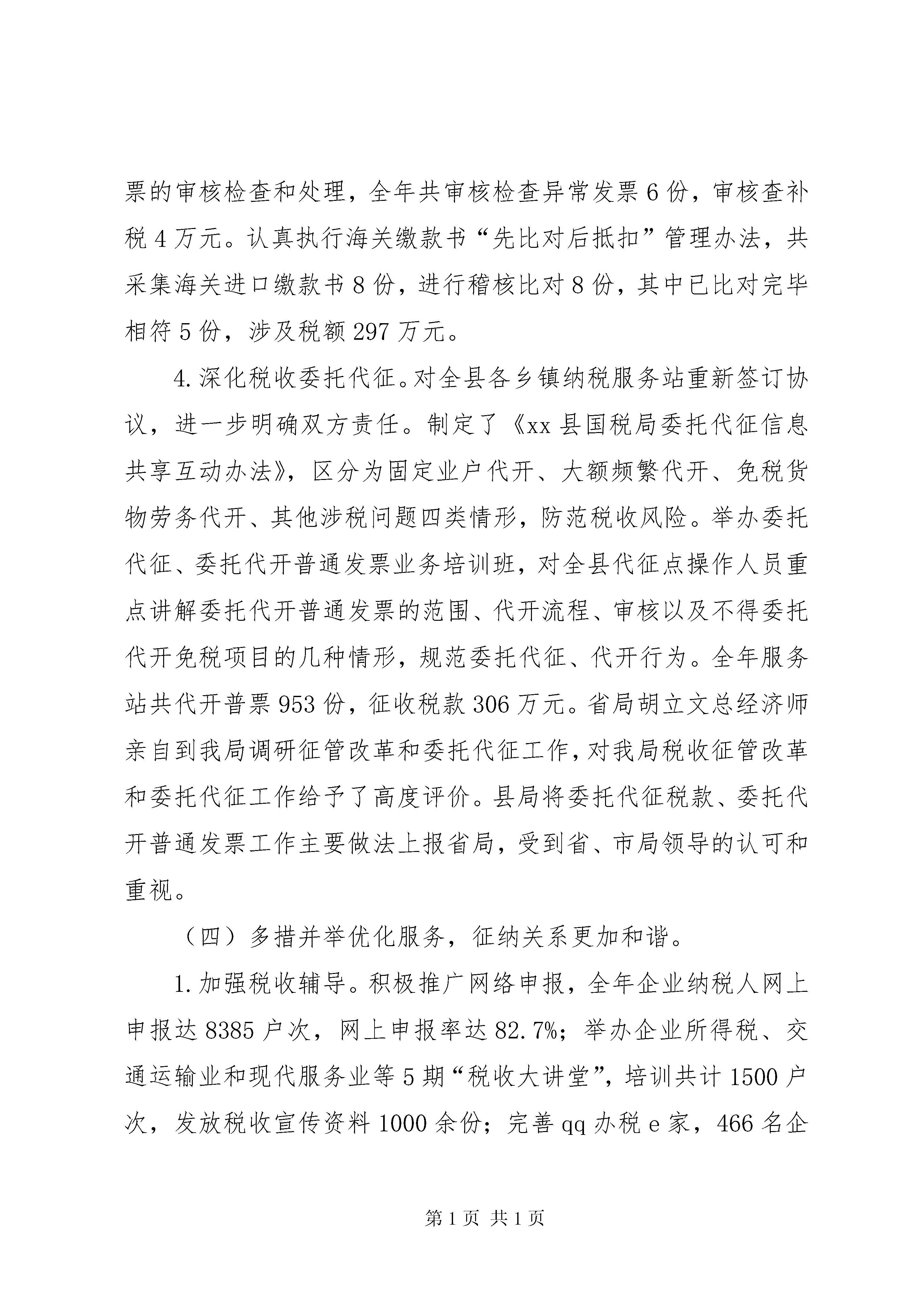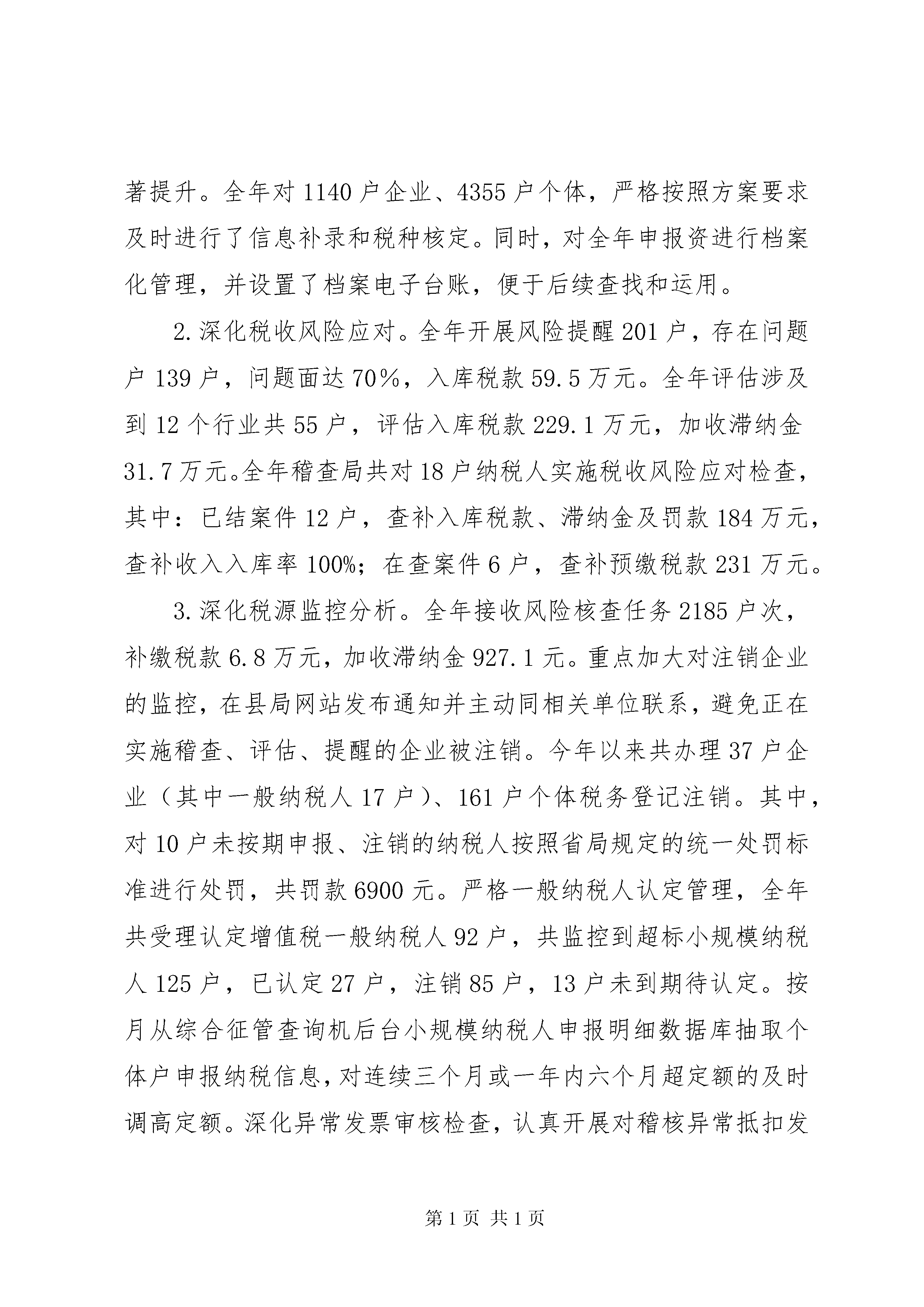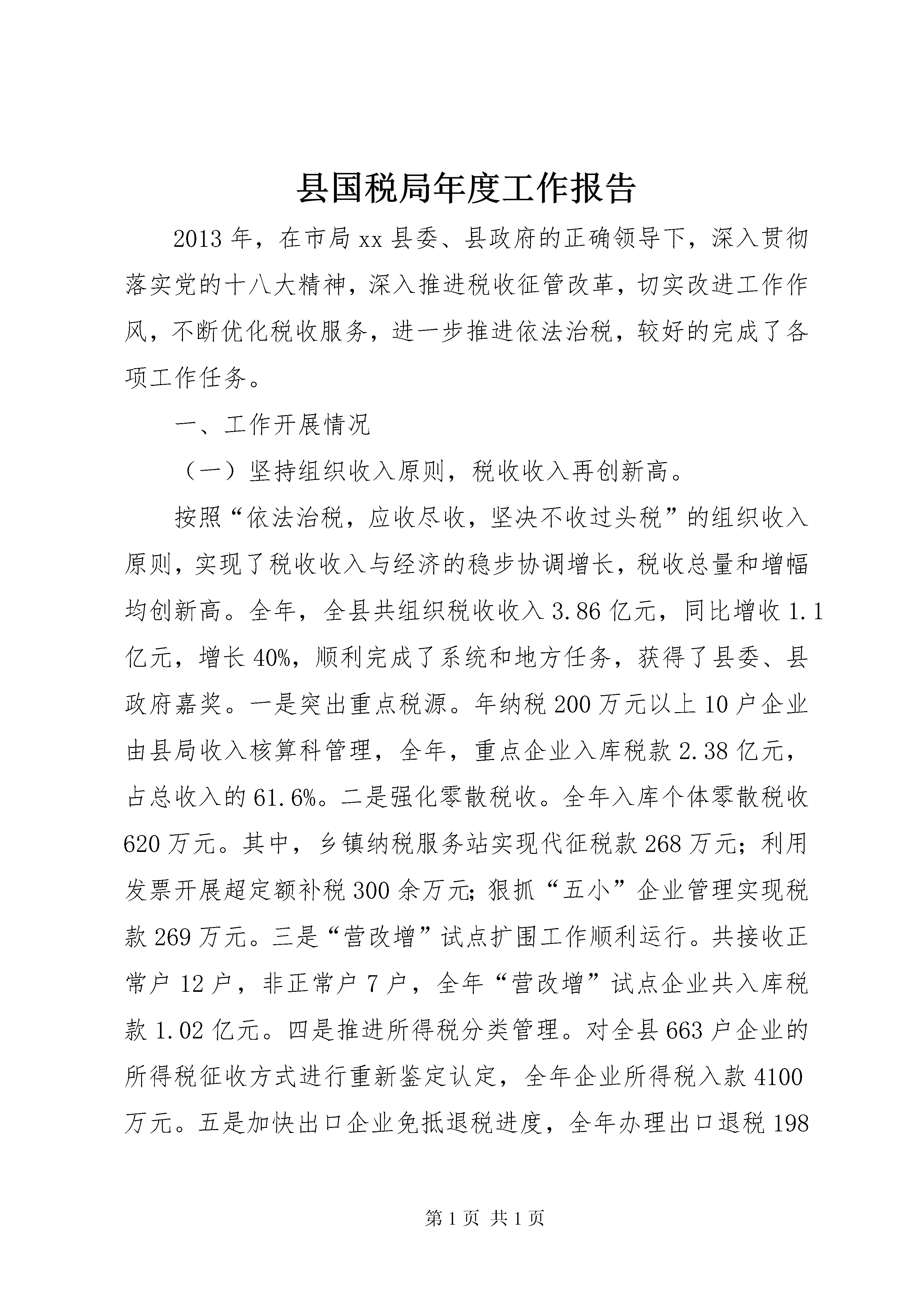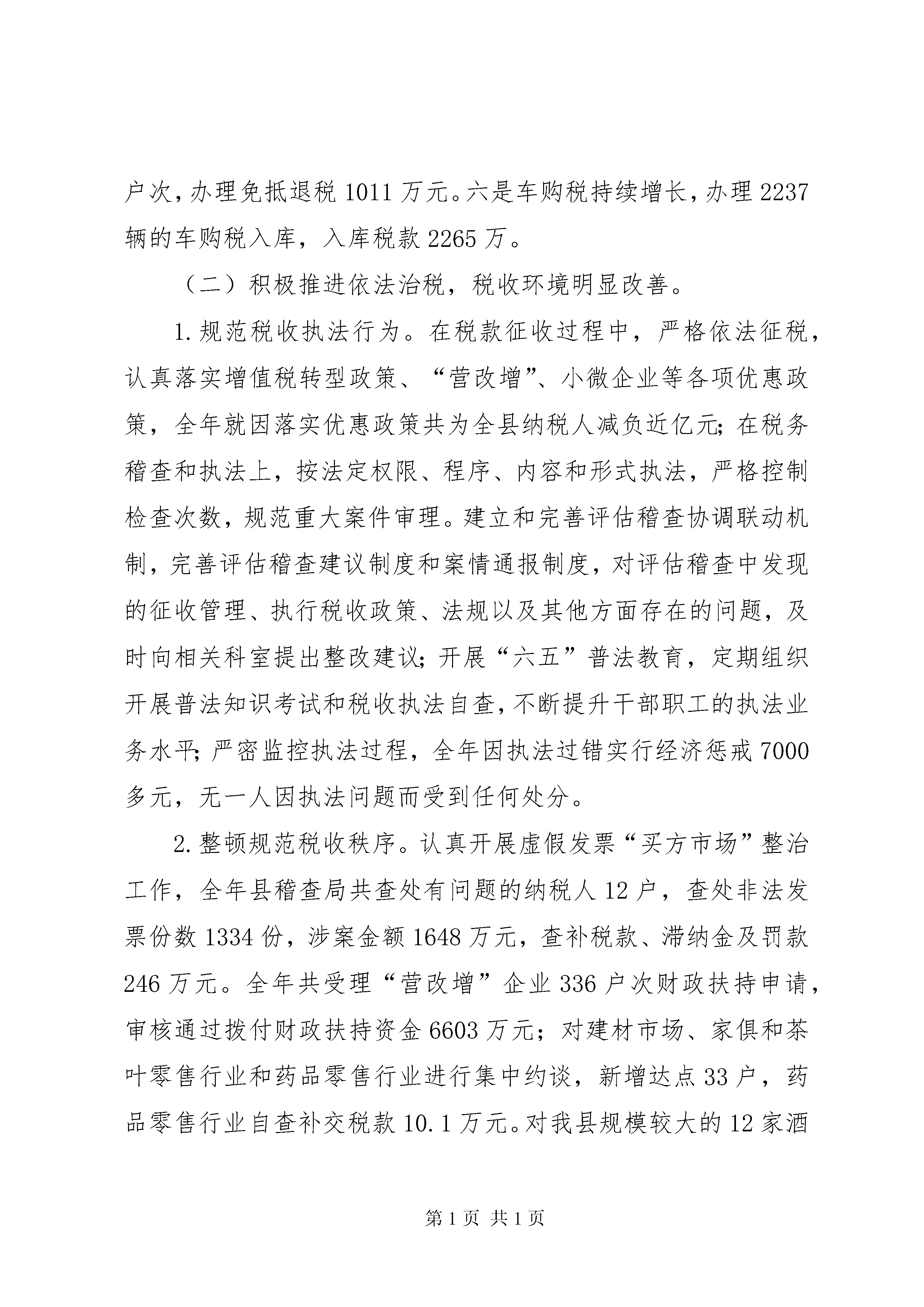 县国税局年度工作报告2013年,在市局xx县委、县政府的正确领导下,深入贯彻落实党的十八大精神,深入推进税收征管改革,切实改进工作作风,不断优化税收服务,进一步推进依法治税,较好的完成了各项工作任务。一、工作开展情况(一)坚持组织收入原则,税收收入再创新高。按照“依法治税,应收尽收,坚决不收过头税”的组织收入原则,实现了税收收入与经济的稳步协调增长,税收总量和增幅均创新高。全年,全县共组织税收收入3.86亿元,同比增收1.1亿元,增长40%,顺利完成了系统和地方任务,获得了县委、县政府嘉奖。一是突出重点税源。年纳税200万元以上10户企业由县局收入核算科管理,全年,重点企业入库税款2.38亿元,占总收入的61.6%。二是强化零散税收。全年入库个体零散税收620万元。其中,乡镇纳税服务站实现代征税款268万元;利用发票开展超定额补税300余万元;狠抓“五小”企业管理实现税款269万元。三是“营改增”试点扩围工作顺利运行。共接收正常户12户,非正常户7户,全年“营改增”试点企业共入库税款1.02亿元。四是推进所得税分类管理。对全县663户企业的所得税征收方式进行重新鉴定认定,全年企业所得税入款4100万元。五是加快出口企业免抵退税进度,全年办理出口退税198户次,办理免抵退税1011万元。六是车购税持续增长,办理2237辆的车购税入库,入库税款2265万。(二)积极推进依法治税,税收环境明显改善。1.规范税收执法行为。在税款征收过程中,严格依法征税,认真落实增值税转型政策、“营改增”、小微企业等各项优惠政策,全年就因落实优惠政策共为全县纳税人减负近亿元;在税务稽查和执法上,按法定权限、程序、内容和形式执法,严格控制检查次数,规范重大案件审理。建立和完善评估稽查协调联动机制,完善评估稽查建议制度和案情通报制度,对评估稽查中发现的征收管理、执行税收政策、法规以及其他方面存在的问题,及时向相关科室提出整改建议;开展“六五”普法教育,定期组织开展普法知识考试和税收执法自查,不断提升干部职工的执法业务水平;严密监控执法过程,全年因执法过错实行经济惩戒7000多元,无一人因执法问题而受到任何处分。2.整顿规范税收秩序。认真开展虚假发票“买方市场”整治工作,全年县稽查局共查处有问题的纳税人12户,查处非法发票份数1334份,涉案金额1648万元,查补税款、滞纳金及罚款246万元。全年共受理“营改增”企业336户次财政扶持申请,审核通过拨付财政扶持资金6603万元;对建材市场、家俱和茶叶零售行业和药品零售行业进行集中约谈,新增达点33户,药品零售行业自查补交税款10.1万元。对我县规模较大的12家酒类品牌代理进行评估,评估入库查补增值税54.19万元,加收滞纳金5.95万元。开展企业所得税汇算清缴,汇缴面为100%,共调增应纳税所得额1.1亿元,补缴税款为1403万元,比上年增长10.2%。通过行业和税种整顿,税收秩序得到进一步规范。3.提升服务地方能力。认真开展“营改增”政策效应分析,全面掌握和监测我县营改增试点运行后的户籍管理、税收增减、税负变化、改革效应等情况,为领导提供决策参考。撰写地《xx县交通运输业“营改增”试点现状及建议》和《xx县经济开发区发展现状及建议》等调研信息均被县委、县政府办采用;积极落实县委“三百工程”,对县工业园区相关政策落实情况,跟踪了解新引进企业经营态势,对工业园区发展和招商进行献计献策;积极落实县委民营经济大会精神,选派1名干部到企业挂职,支持民营中小企业进一步做大做强。积极参与县政府小红车治理工作,及时完成了15辆小红车交车任务,并对全县318户出租车又调配增加小额发票,确保了出租车的稳定运营。(三)深化税收征管改革,管理质量不断提升。1.深化日常服务管理。按照省局指导意见和市局实施方案的要求,制定了《xx县国家税务局进一步深化税收征管改革实施方案》。在全市率先按照省局深化征管改革要求调整运行模式,对服务与管理职能进行划分,拟定了适应改革要求的办税服务、日常管理、纳税评估三大系列岗位和职责,税收管理质量得到显著提升。全年对1140户企业、4355户个体,严格按照方案要求及时进行了信息补录和税种核定。同时,对全年申报资进行档案化管理,并设置了档案电子台账,便于后续查找和运用。2.深化税收风险应对。全年开展风险提醒201户,存在问题户139户,问题面达70%,入库税款59.5万元。全年评估涉及到12个行业共55户,评估入库税款229.1万元,加收滞纳金31.7万元。全年稽查局共对18户纳税人实施税收风险应对检查,其中:已结案件12户,查补入库税款、滞纳金及罚款184万元,查补收入入库率100%;在查案件6户,查补预缴税款231万元。3.深化税源监控分析。全年接收风险核查任务2185户次,补