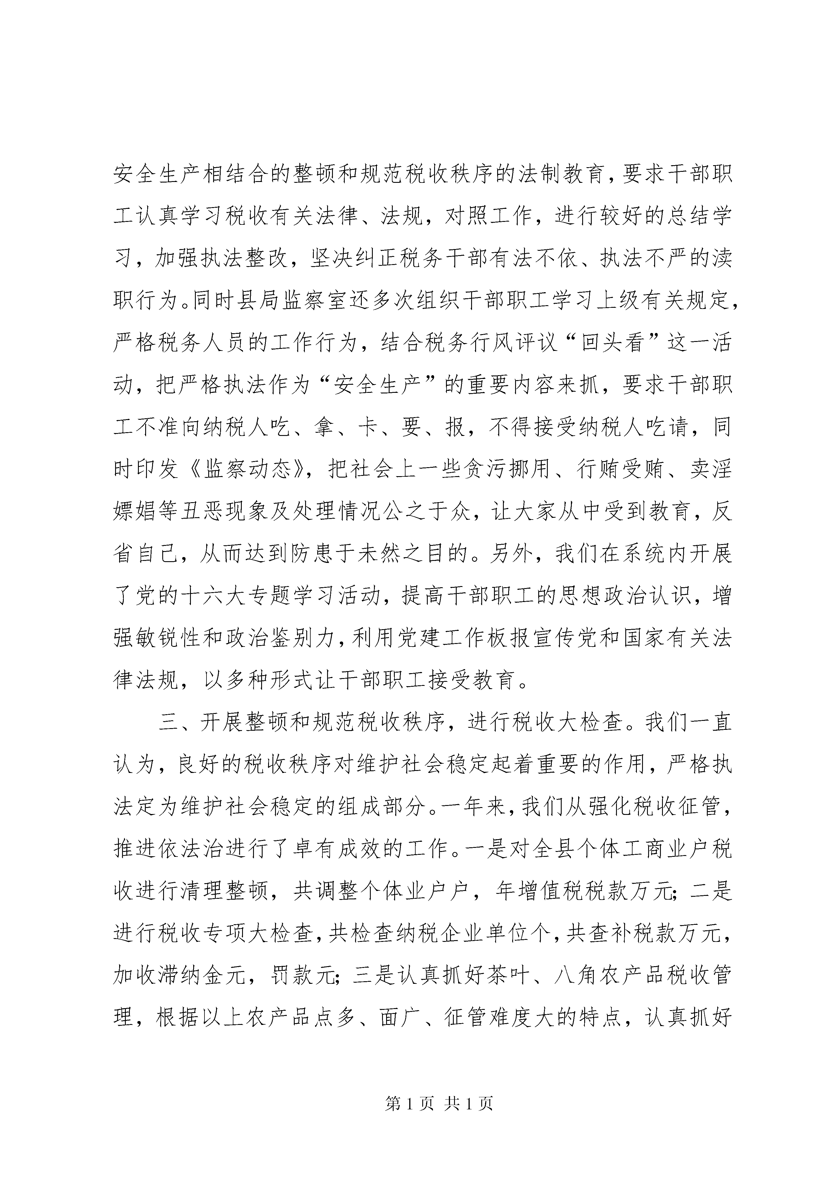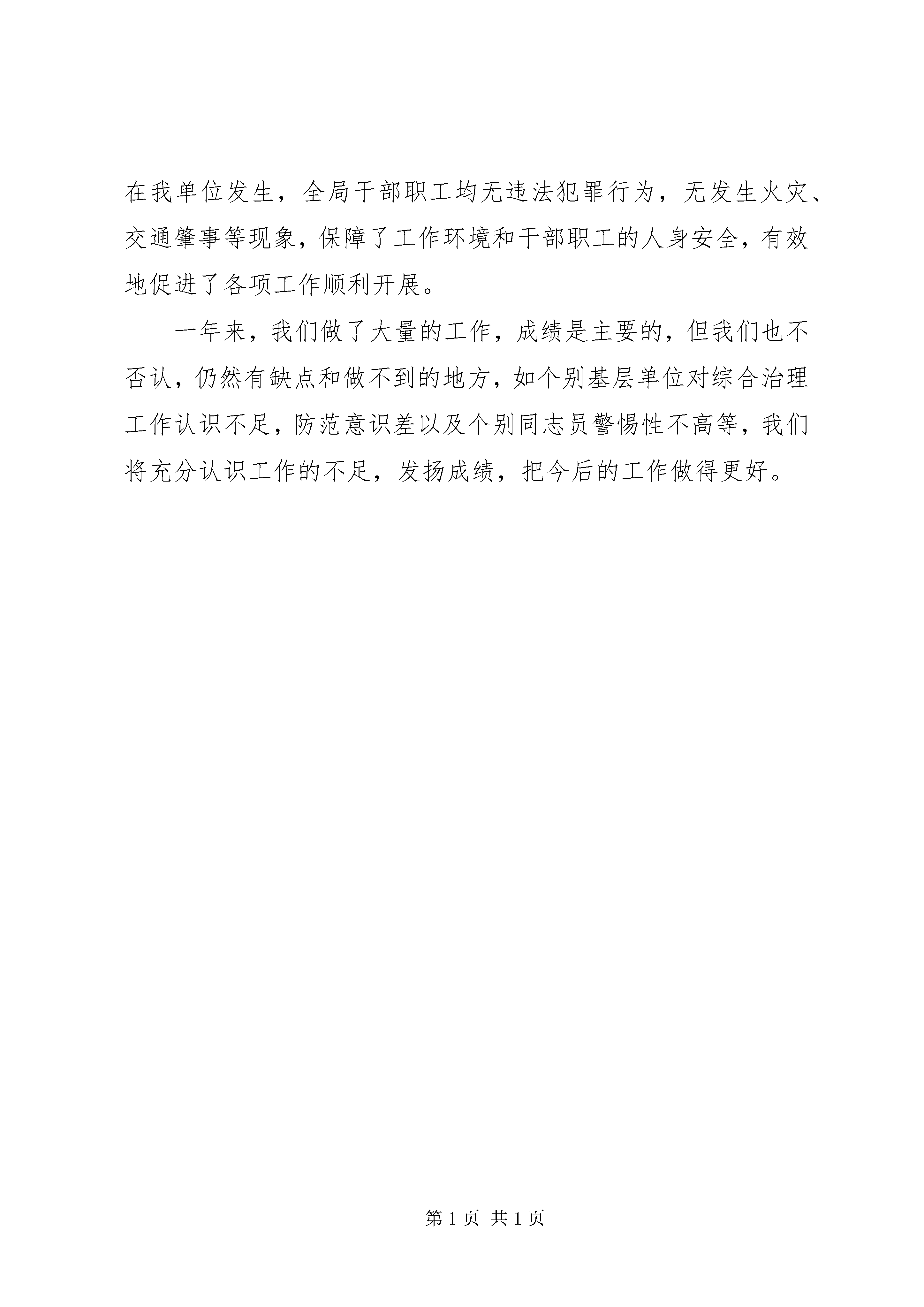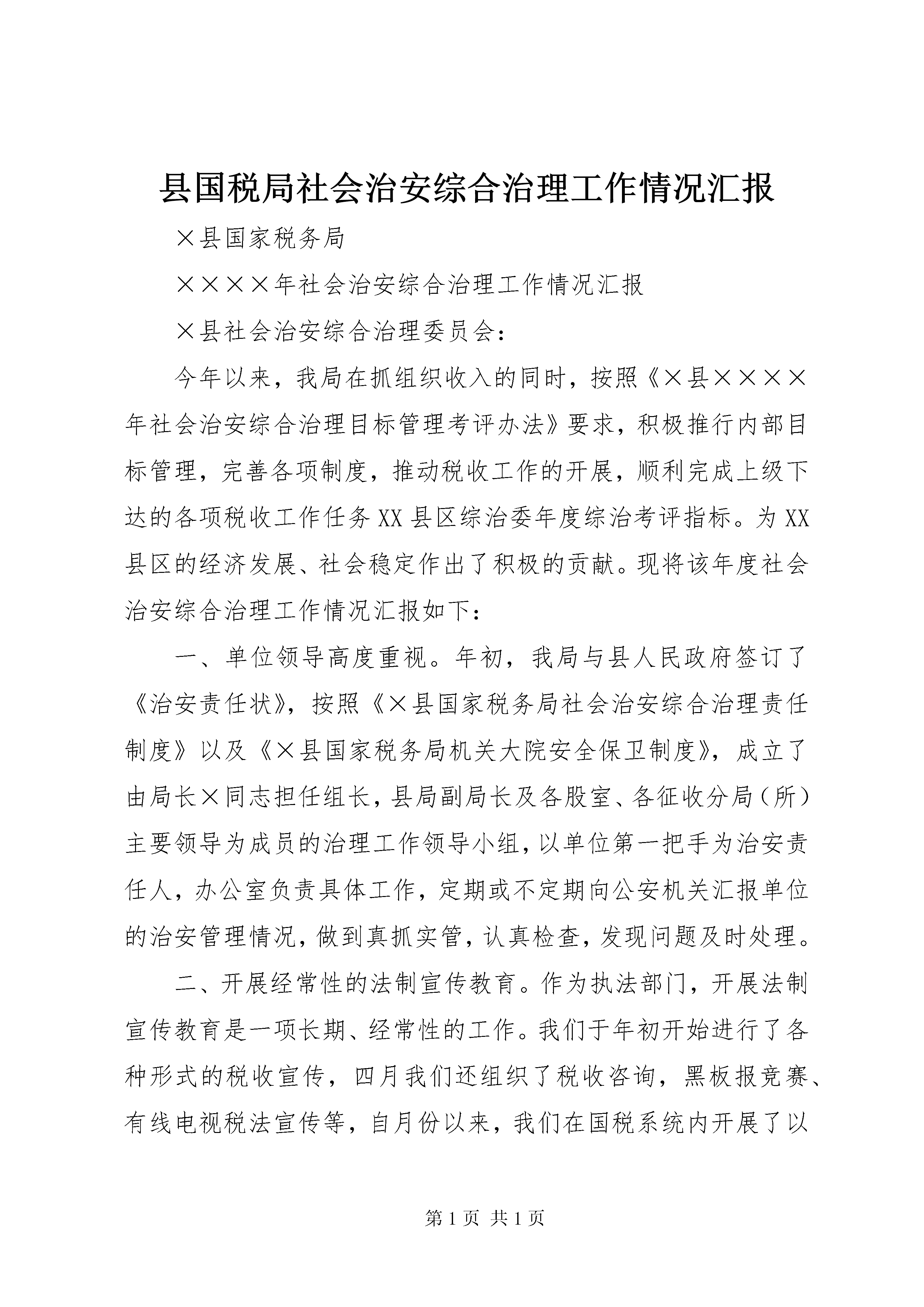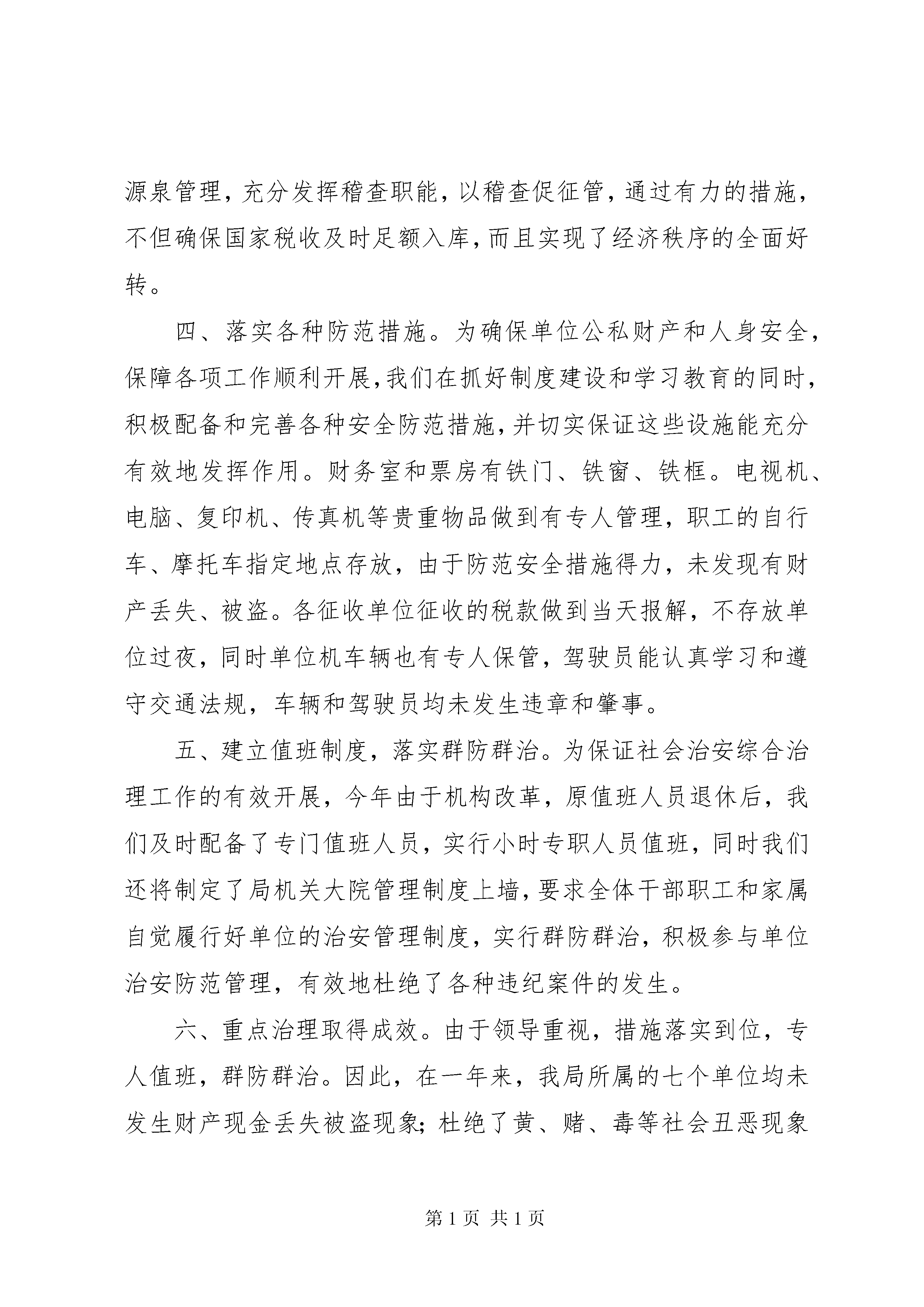 县国税局社会治安综合治理工作情况汇报×县国家税务局××××年社会治安综合治理工作情况汇报×县社会治安综合治理委员会:今年以来,我局在抓组织收入的同时,按照《×县××××年社会治安综合治理目标管理考评办法》要求,积极推行内部目标管理,完善各项制度,推动税收工作的开展,顺利完成上级下达的各项税收工作任务XX县区综治委年度综治考评指标。为XX县区的经济发展、社会稳定作出了积极的贡献。现将该年度社会治安综合治理工作情况汇报如下:一、单位领导高度重视。年初,我局与县人民政府签订了《治安责任状》,按照《×县国家税务局社会治安综合治理责任制度》以及《×县国家税务局机关大院安全保卫制度》,成立了由局长×同志担任组长,县局副局长及各股室、各征收分局(所)主要领导为成员的治理工作领导小组,以单位第一把手为治安责任人,办公室负责具体工作,定期或不定期向公安机关汇报单位的治安管理情况,做到真抓实管,认真检查,发现问题及时处理。二、开展经常性的法制宣传教育。作为执法部门,开展法制宣传教育是一项长期、经常性的工作。我们于年初开始进行了各种形式的税收宣传,四月我们还组织了税收咨询,黑板报竞赛、有线电视税法宣传等,自月份以来,我们在国税系统内开展了以安全生产相结合的整顿和规范税收秩序的法制教育,要求干部职工认真学习税收有关法律、法规,对照工作,进行较好的总结学习,加强执法整改,坚决纠正税务干部有法不依、执法不严的渎职行为。同时县局监察室还多次组织干部职工学习上级有关规定,严格税务人员的工作行为,结合税务行风评议“回头看”这一活动,把严格执法作为“安全生产”的重要内容来抓,要求干部职工不准向纳税人吃、拿、卡、要、报,不得接受纳税人吃请,同时印发《监察动态》,把社会上一些贪污挪用、行贿受贿、卖淫嫖娼等丑恶现象及处理情况公之于众,让大家从中受到教育,反省自己,从而达到防患于未然之目的。另外,我们在系统内开展了党的十六大专题学习活动,提高干部职工的思想政治认识,增强敏锐性和政治鉴别力,利用党建工作板报宣传党和国家有关法律法规,以多种形式让干部职工接受教育。三、开展整顿和规范税收秩序,进行税收大检查。我们一直认为,良好的税收秩序对维护社会稳定起着重要的作用,严格执法定为维护社会稳定的组成部分。一年来,我们从强化税收征管,推进依法治进行了卓有成效的工作。一是对全县个体工商业户税收进行清理整顿,共调整个体业户户,年增值税税款万元;二是进行税收专项大检查,共检查纳税企业单位个,共查补税款万元,加收滞纳金元,罚款元;三是认真抓好茶叶、八角农产品税收管理,根据以上农产品点多、面广、征管难度大的特点,认真抓好源泉管理,充分发挥稽查职能,以稽查促征管,通过有力的措施,不但确保国家税收及时足额入库,而且实现了经济秩序的全面好转。四、落实各种防范措施。为确保单位公私财产和人身安全,保障各项工作顺利开展,我们在抓好制度建设和学习教育的同时,积极配备和完善各种安全防范措施,并切实保证这些设施能充分有效地发挥作用。财务室和票房有铁门、铁窗、铁框。电视机、电脑、复印机、传真机等贵重物品做到有专人管理,职工的自行车、摩托车指定地点存放,由于防范安全措施得力,未发现有财产丢失、被盗。各征收单位征收的税款做到当天报解,不存放单位过夜,同时单位机车辆也有专人保管,驾驶员能认真学习和遵守交通法规,车辆和驾驶员均未发生违章和肇事。五、建立值班制度,落实群防群治。为保证社会治安综合治理工作的有效开展,今年由于机构改革,原值班人员退休后,我们及时配备了专门值班人员,实行小时专职人员值班,同时我们还将制定了局机关大院管理制度上墙,要求全体干部职工和家属自觉履行好单位的治安管理制度,实行群防群治,积极参与单位治安防范管理,有效地杜绝了各种违纪案件的发生。六、重点治理取得成效。由于领导重视,措施落实到位,专人值班,群防群治。因此,在一年来,我局所属的七个单位均未发生财产现金丢失被盗现象;杜绝了黄、赌、毒等社会丑恶现象在我单位发生,全局干部职工均无违法犯罪行为,无发生火灾、交通肇事等现象,保障了工作环境和干部职工的人身安全,有效地促进了各项工作顺利开展。一年来,我们做了大量的工作,成绩是主要的,但我们也不否认,仍然有缺点和做不到的地方,如个别基层单位对综合治理工作认识不足,防范意识差以及个别同志员警惕性不高等,我们将充分认识工作的不足,发扬成绩,把今后的工作做得更好。