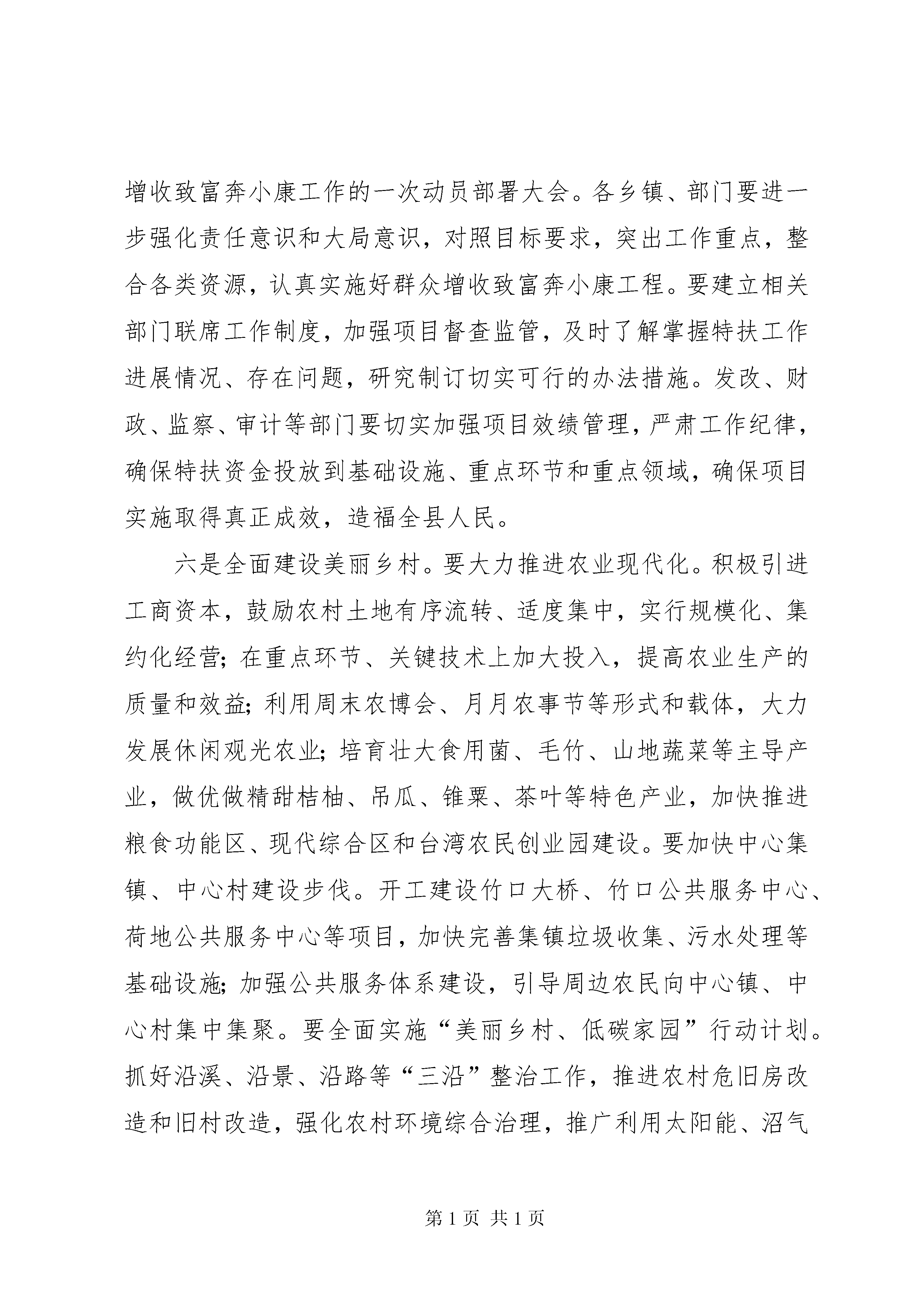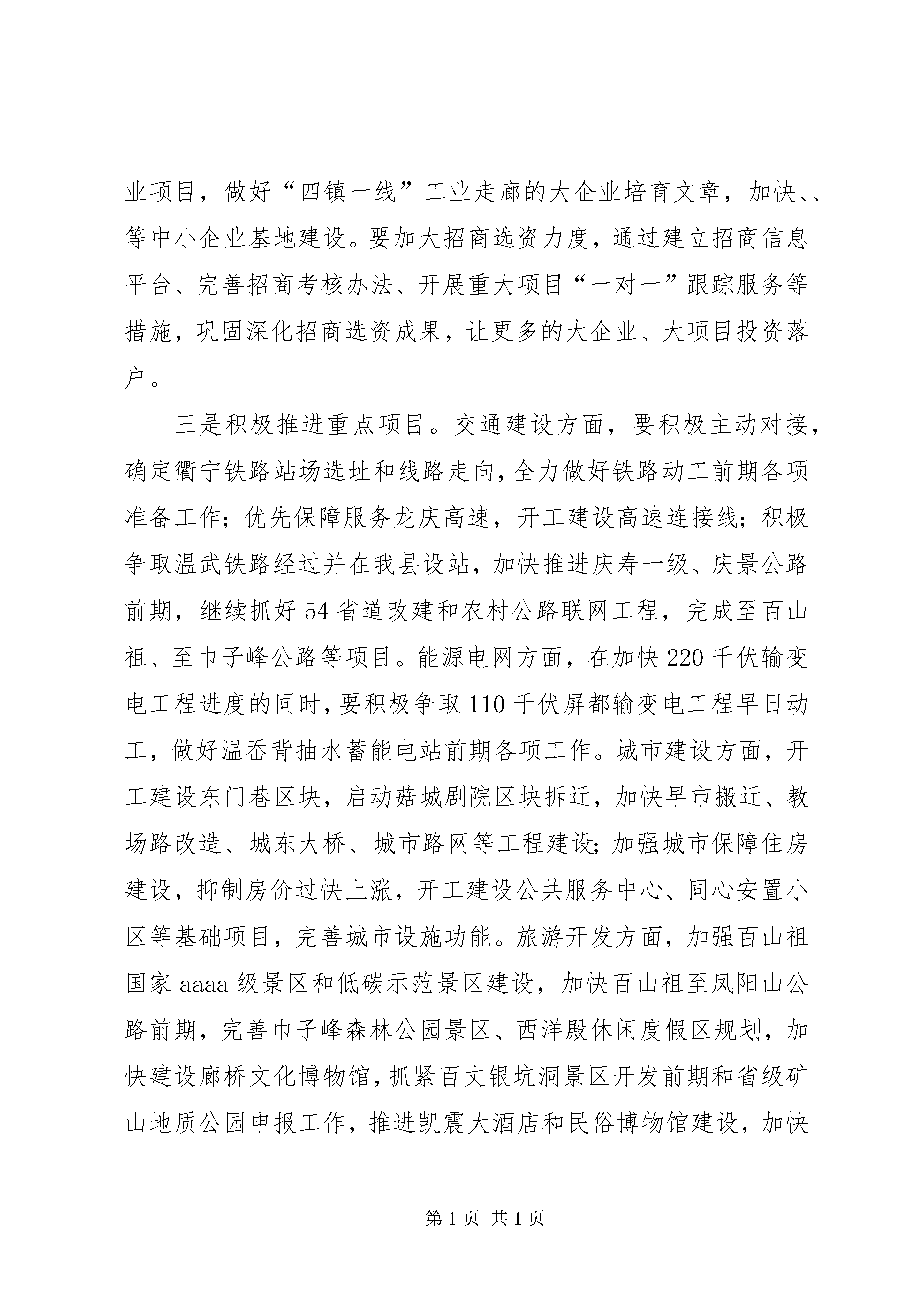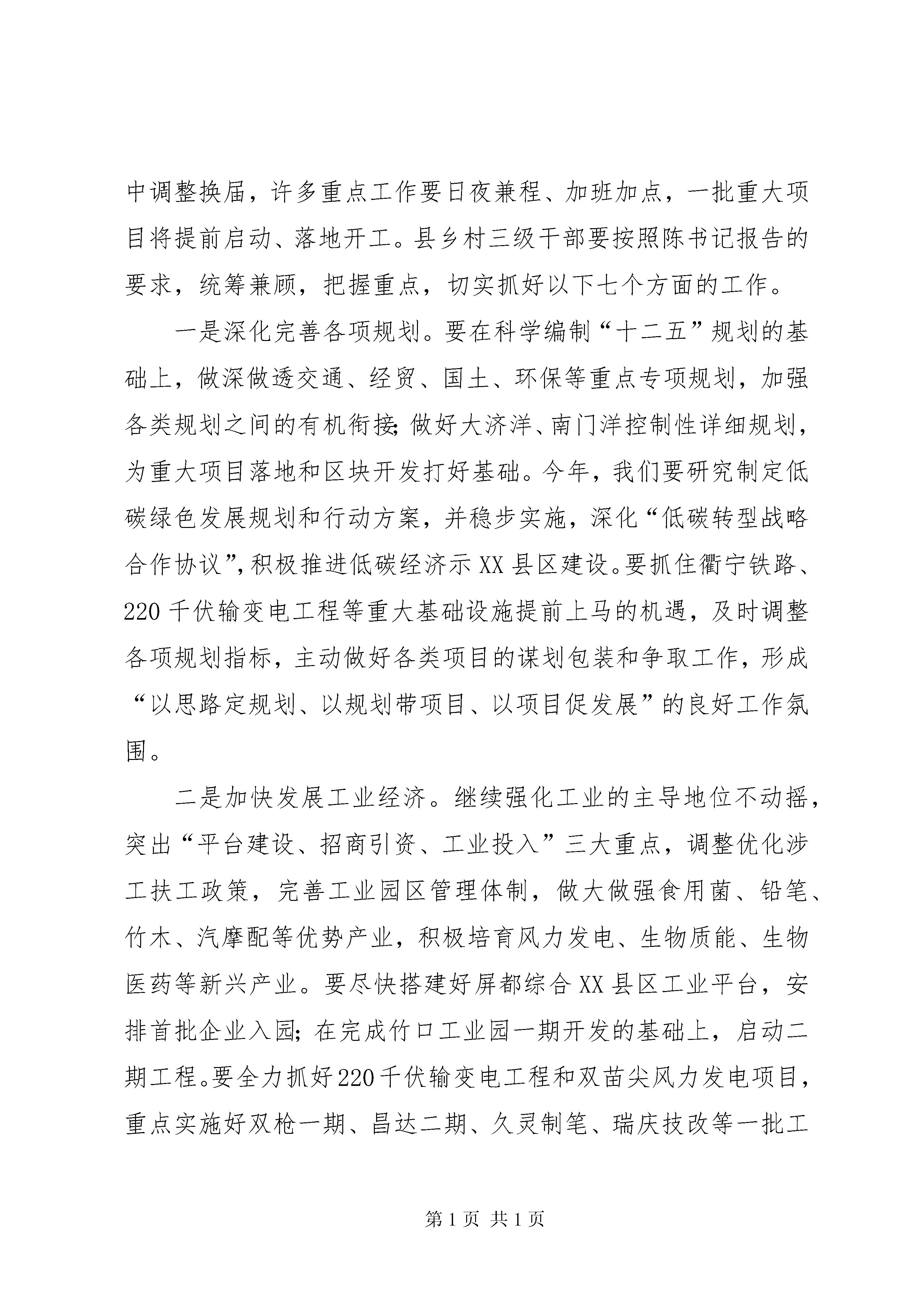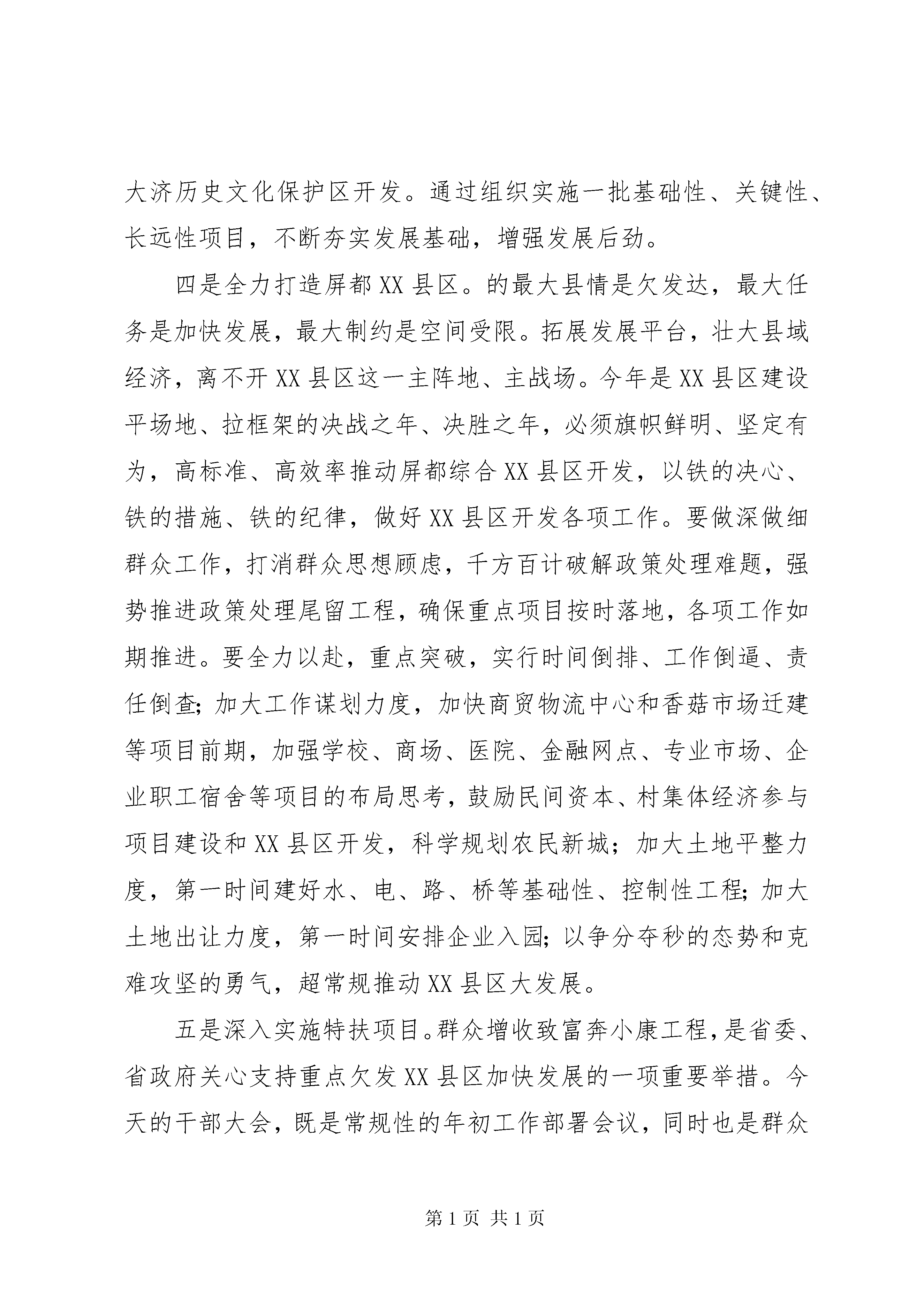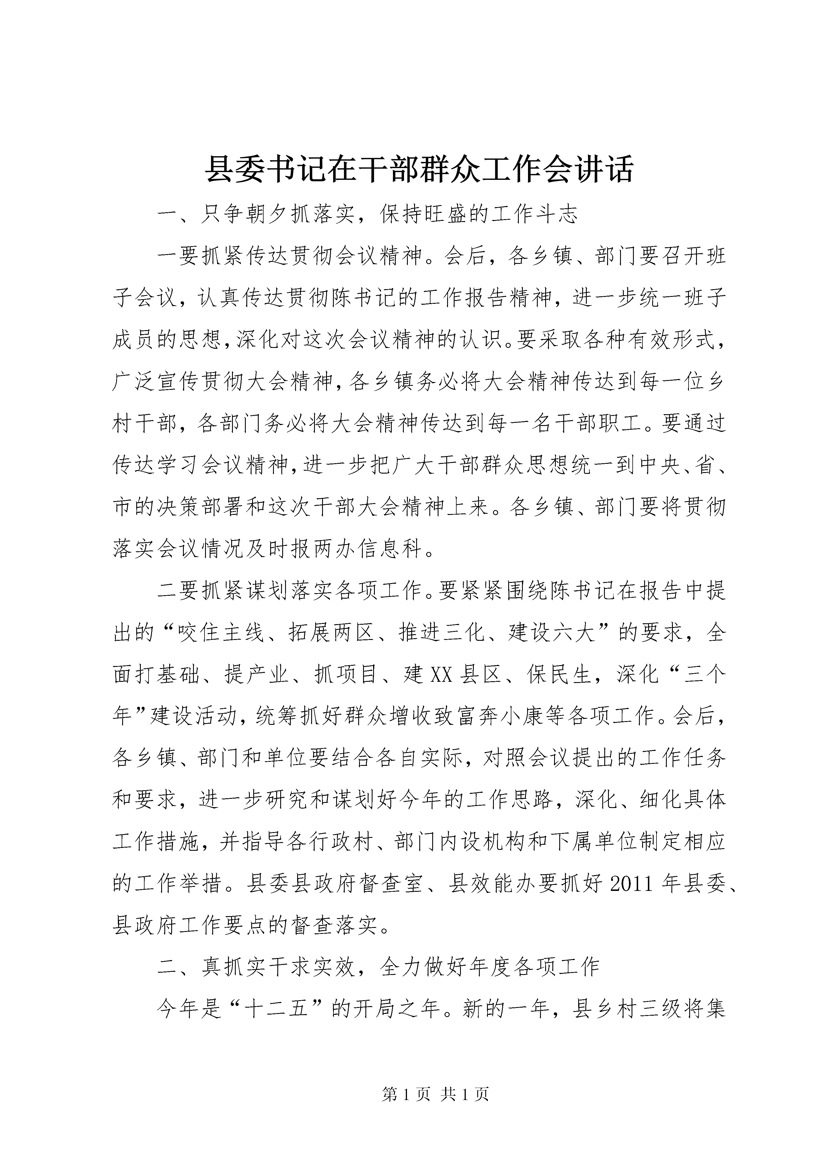 县委书记在干部群众工作会讲话一、只争朝夕抓落实,保持旺盛的工作斗志一要抓紧传达贯彻会议精神。会后,各乡镇、部门要召开班子会议,认真传达贯彻陈书记的工作报告精神,进一步统一班子成员的思想,深化对这次会议精神的认识。要采取各种有效形式,广泛宣传贯彻大会精神,各乡镇务必将大会精神传达到每一位乡村干部,各部门务必将大会精神传达到每一名干部职工。要通过传达学习会议精神,进一步把广大干部群众思想统一到中央、省、市的决策部署和这次干部大会精神上来。各乡镇、部门要将贯彻落实会议情况及时报两办信息科。二要抓紧谋划落实各项工作。要紧紧围绕陈书记在报告中提出的“咬住主线、拓展两区、推进三化、建设六大”的要求,全面打基础、提产业、抓项目、建XX县区、保民生,深化“三个年”建设活动,统筹抓好群众增收致富奔小康等各项工作。会后,各乡镇、部门和单位要结合各自实际,对照会议提出的工作任务和要求,进一步研究和谋划好今年的工作思路,深化、细化具体工作措施,并指导各行政村、部门内设机构和下属单位制定相应的工作举措。县委县政府督查室、县效能办要抓好2011年县委、县政府工作要点的督查落实。二、真抓实干求实效,全力做好年度各项工作今年是“十二五”的开局之年。新的一年,县乡村三级将集中调整换届,许多重点工作要日夜兼程、加班加点,一批重大项目将提前启动、落地开工。县乡村三级干部要按照陈书记报告的要求,统筹兼顾,把握重点,切实抓好以下七个方面的工作。一是深化完善各项规划。要在科学编制“十二五”规划的基础上,做深做透交通、经贸、国土、环保等重点专项规划,加强各类规划之间的有机衔接;做好大济洋、南门洋控制性详细规划,为重大项目落地和区块开发打好基础。今年,我们要研究制定低碳绿色发展规划和行动方案,并稳步实施,深化“低碳转型战略合作协议”,积极推进低碳经济示XX县区建设。要抓住衢宁铁路、220千伏输变电工程等重大基础设施提前上马的机遇,及时调整各项规划指标,主动做好各类项目的谋划包装和争取工作,形成“以思路定规划、以规划带项目、以项目促发展”的良好工作氛围。二是加快发展工业经济。继续强化工业的主导地位不动摇,突出“平台建设、招商引资、工业投入”三大重点,调整优化涉工扶工政策,完善工业园区管理体制,做大做强食用菌、铅笔、竹木、汽摩配等优势产业,积极培育风力发电、生物质能、生物医药等新兴产业。要尽快搭建好屏都综合XX县区工业平台,安排首批企业入园;在完成竹口工业园一期开发的基础上,启动二期工程。要全力抓好220千伏输变电工程和双苗尖风力发电项目,重点实施好双枪一期、昌达二期、久灵制笔、瑞庆技改等一批工业项目,做好“四镇一线”工业走廊的大企业培育文章,加快、、等中小企业基地建设。要加大招商选资力度,通过建立招商信息平台、完善招商考核办法、开展重大项目“一对一”跟踪服务等措施,巩固深化招商选资成果,让更多的大企业、大项目投资落户。三是积极推进重点项目。交通建设方面,要积极主动对接,确定衢宁铁路站场选址和线路走向,全力做好铁路动工前期各项准备工作;优先保障服务龙庆高速,开工建设高速连接线;积极争取温武铁路经过并在我县设站,加快推进庆寿一级、庆景公路前期,继续抓好54省道改建和农村公路联网工程,完成至百山祖、至巾子峰公路等项目。能源电网方面,在加快220千伏输变电工程进度的同时,要积极争取110千伏屏都输变电工程早日动工,做好温岙背抽水蓄能电站前期各项工作。城市建设方面,开工建设东门巷区块,启动菇城剧院区块拆迁,加快早市搬迁、教场路改造、城东大桥、城市路网等工程建设;加强城市保障住房建设,抑制房价过快上涨,开工建设公共服务中心、同心安置小区等基础项目,完善城市设施功能。旅游开发方面,加强百山祖国家aaaa级景区和低碳示范景区建设,加快百山祖至凤阳山公路前期,完善巾子峰森林公园景区、西洋殿休闲度假区规划,加快建设廊桥文化博物馆,抓紧百丈银坑洞景区开发前期和省级矿山地质公园申报工作,推进凯震大酒店和民俗博物馆建设,加快大济历史文化保护区开发。通过组织实施一批基础性、关键性、长远性项目,不断夯实发展基础,增强发展后劲。四是全力打造屏都XX县区。的最大县情是欠发达,最大任务是加快发展,最大制约是空间受限。拓展发展平台,壮大县域经济,离不开XX县区这一主阵地、主战场。今年是XX县区建设平场地、拉框架的决战之年、决胜之年,必须旗帜鲜明、坚定有为,高标准、高效率推动屏都综合XX县区开发,以铁的决心、铁的措施、铁的纪律,做好XX县区开发各项工作。要做深做细群众工作,打消群众思想顾虑,千方百计破解政策处理难题,强势推进政策处理尾留工程,确保重点项目按时落地,各项工作如期推进。要全力以赴,重点突破,实行时间倒排、工作倒逼、责任倒查;加大工作谋划力度,加快商贸物流中心和香菇市场迁建等项目