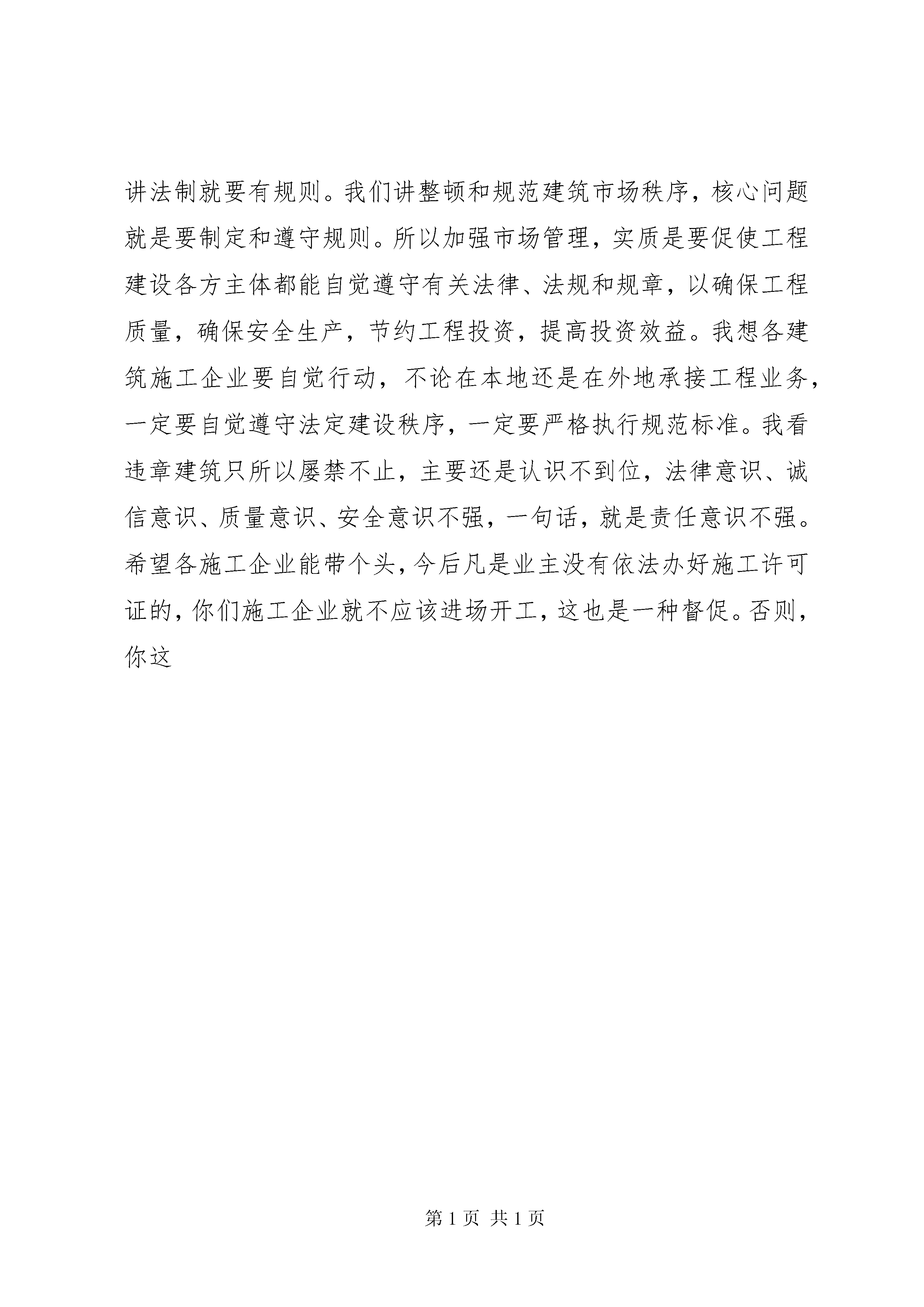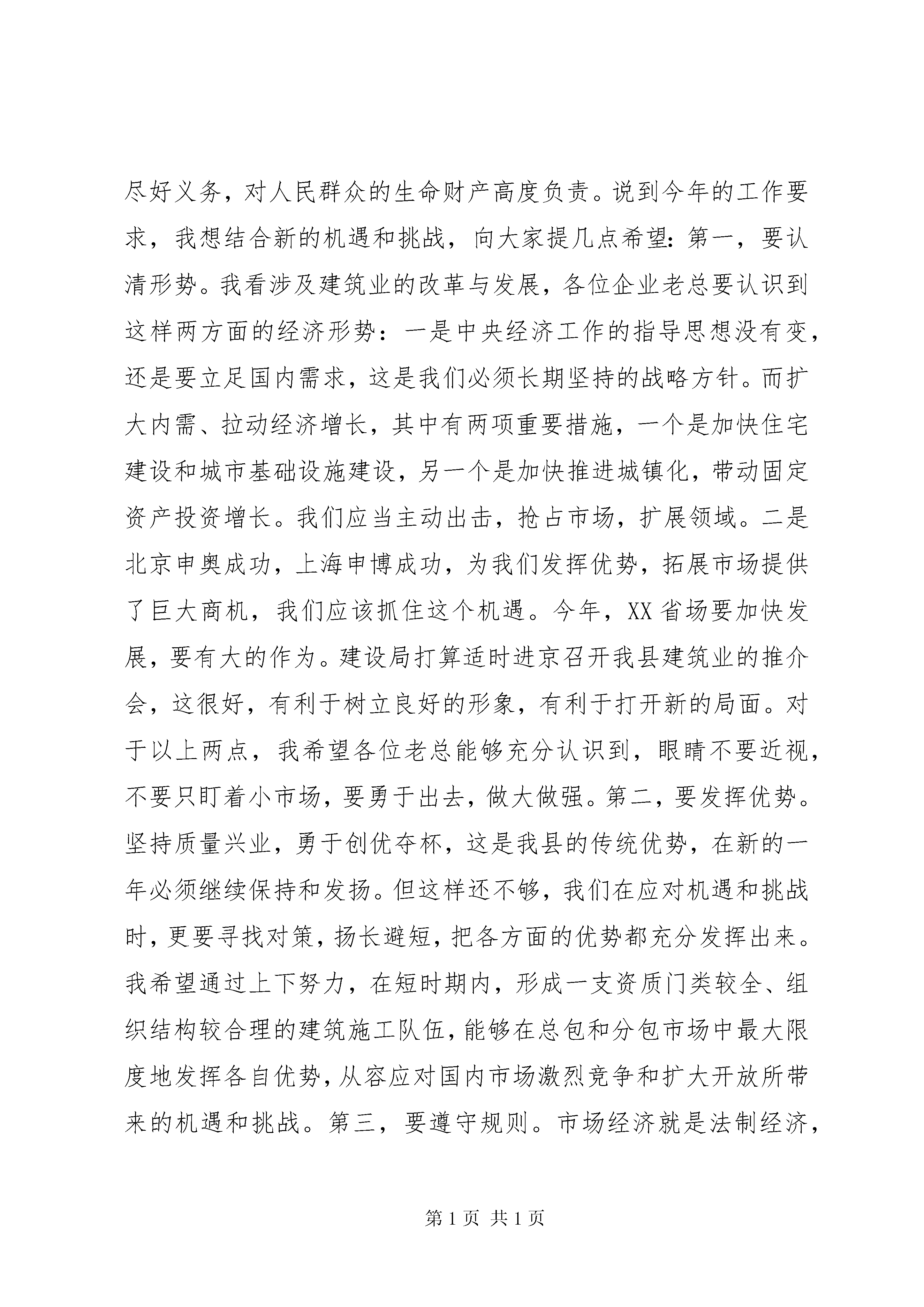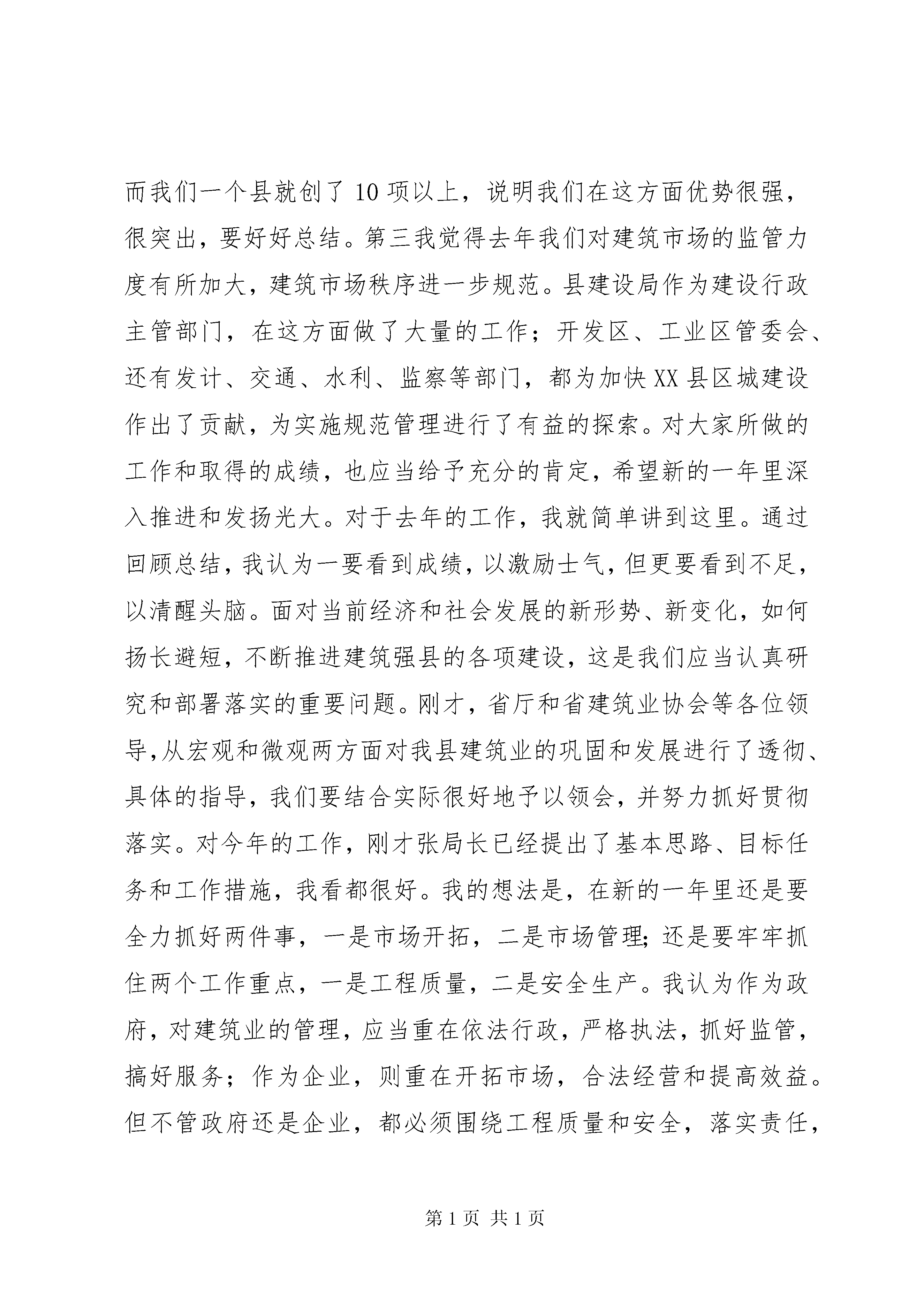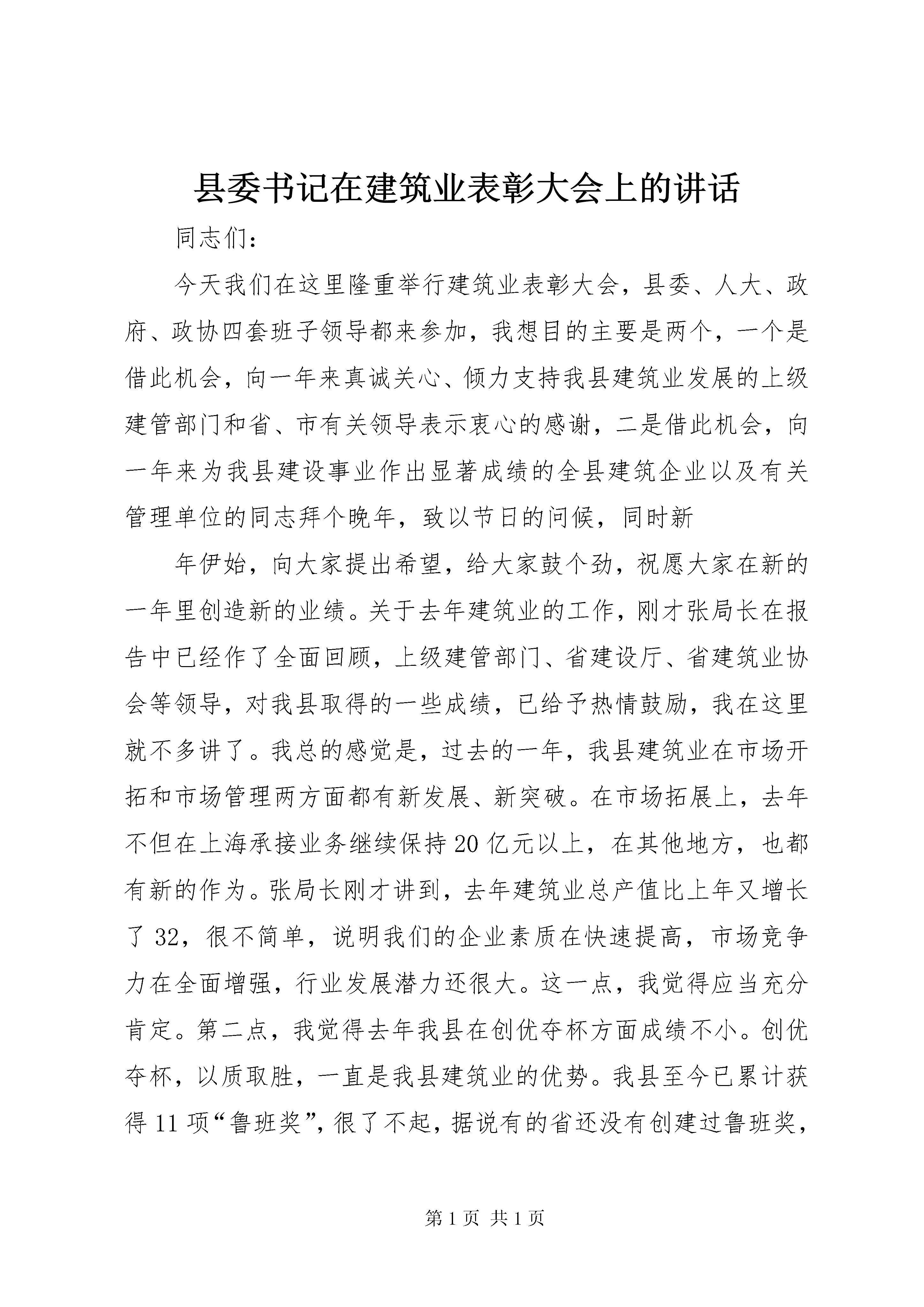 县委书记在建筑业表彰大会上的讲话同志们:今天我们在这里隆重举行建筑业表彰大会,县委、人大、政府、政协四套班子领导都来参加,我想目的主要是两个,一个是借此机会,向一年来真诚关心、倾力支持我县建筑业发展的上级建管部门和省、市有关领导表示衷心的感谢,二是借此机会,向一年来为我县建设事业作出显著成绩的全县建筑企业以及有关管理单位的同志拜个晚年,致以节日的问候,同时新年伊始,向大家提出希望,给大家鼓个劲,祝愿大家在新的一年里创造新的业绩。关于去年建筑业的工作,刚才张局长在报告中已经作了全面回顾,上级建管部门、省建设厅、省建筑业协会等领导,对我县取得的一些成绩,已给予热情鼓励,我在这里就不多讲了。我总的感觉是,过去的一年,我县建筑业在市场开拓和市场管理两方面都有新发展、新突破。在市场拓展上,去年不但在上海承接业务继续保持20亿元以上,在其他地方,也都有新的作为。张局长刚才讲到,去年建筑业总产值比上年又增长了32,很不简单,说明我们的企业素质在快速提高,市场竞争力在全面增强,行业发展潜力还很大。这一点,我觉得应当充分肯定。第二点,我觉得去年我县在创优夺杯方面成绩不小。创优夺杯,以质取胜,一直是我县建筑业的优势。我县至今已累计获得11项“鲁班奖”,很了不起,据说有的省还没有创建过鲁班奖,而我们一个县就创了10项以上,说明我们在这方面优势很强,很突出,要好好总结。第三我觉得去年我们对建筑市场的监管力度有所加大,建筑市场秩序进一步规范。县建设局作为建设行政主管部门,在这方面做了大量的工作;开发区、工业区管委会、还有发计、交通、水利、监察等部门,都为加快XX县区城建设作出了贡献,为实施规范管理进行了有益的探索。对大家所做的工作和取得的成绩,也应当给予充分的肯定,希望新的一年里深入推进和发扬光大。对于去年的工作,我就简单讲到这里。通过回顾总结,我认为一要看到成绩,以激励士气,但更要看到不足,以清醒头脑。面对当前经济和社会发展的新形势、新变化,如何扬长避短,不断推进建筑强县的各项建设,这是我们应当认真研究和部署落实的重要问题。刚才,省厅和省建筑业协会等各位领导,从宏观和微观两方面对我县建筑业的巩固和发展进行了透彻、具体的指导,我们要结合实际很好地予以领会,并努力抓好贯彻落实。对今年的工作,刚才张局长已经提出了基本思路、目标任务和工作措施,我看都很好。我的想法是,在新的一年里还是要全力抓好两件事,一是市场开拓,二是市场管理;还是要牢牢抓住两个工作重点,一是工程质量,二是安全生产。我认为作为政府,对建筑业的管理,应当重在依法行政,严格执法,抓好监管,搞好服务;作为企业,则重在开拓市场,合法经营和提高效益。但不管政府还是企业,都必须围绕工程质量和安全,落实责任,尽好义务,对人民群众的生命财产高度负责。说到今年的工作要求,我想结合新的机遇和挑战,向大家提几点希望:第一,要认清形势。我看涉及建筑业的改革与发展,各位企业老总要认识到这样两方面的经济形势:一是中央经济工作的指导思想没有变,还是要立足国内需求,这是我们必须长期坚持的战略方针。而扩大内需、拉动经济增长,其中有两项重要措施,一个是加快住宅建设和城市基础设施建设,另一个是加快推进城镇化,带动固定资产投资增长。我们应当主动出击,抢占市场,扩展领域。二是北京申奥成功,上海申博成功,为我们发挥优势,拓展市场提供了巨大商机,我们应该抓住这个机遇。今年,XX省场要加快发展,要有大的作为。建设局打算适时进京召开我县建筑业的推介会,这很好,有利于树立良好的形象,有利于打开新的局面。对于以上两点,我希望各位老总能够充分认识到,眼睛不要近视,不要只盯着小市场,要勇于出去,做大做强。第二,要发挥优势。坚持质量兴业,勇于创优夺杯,这是我县的传统优势,在新的一年必须继续保持和发扬。但这样还不够,我们在应对机遇和挑战时,更要寻找对策,扬长避短,把各方面的优势都充分发挥出来。我希望通过上下努力,在短时期内,形成一支资质门类较全、组织结构较合理的建筑施工队伍,能够在总包和分包市场中最大限度地发挥各自优势,从容应对国内市场激烈竞争和扩大开放所带来的机遇和挑战。第三,要遵守规则。市场经济就是法制经济,讲法制就要有规则。我们讲整顿和规范建筑市场秩序,核心问题就是要制定和遵守规则。所以加强市场管理,实质是要促使工程建设各方主体都能自觉遵守有关法律、法规和规章,以确保工程质量,确保安全生产,节约工程投资,提高投资效益。我想各建筑施工企业要自觉行动,不论在本地还是在外地承接工程业务,一定要自觉遵守法定建设秩序,一定要严格执行规范标准。我看违章建筑只所以屡禁不止,主要还是认识不到位,法律意识、诚信意识、质量意识、安全意识不强,一句话,就是责任意识不强。希望各施工企业能带个头,今后凡是业主没有依法办好施工许可证的,你们施工企业