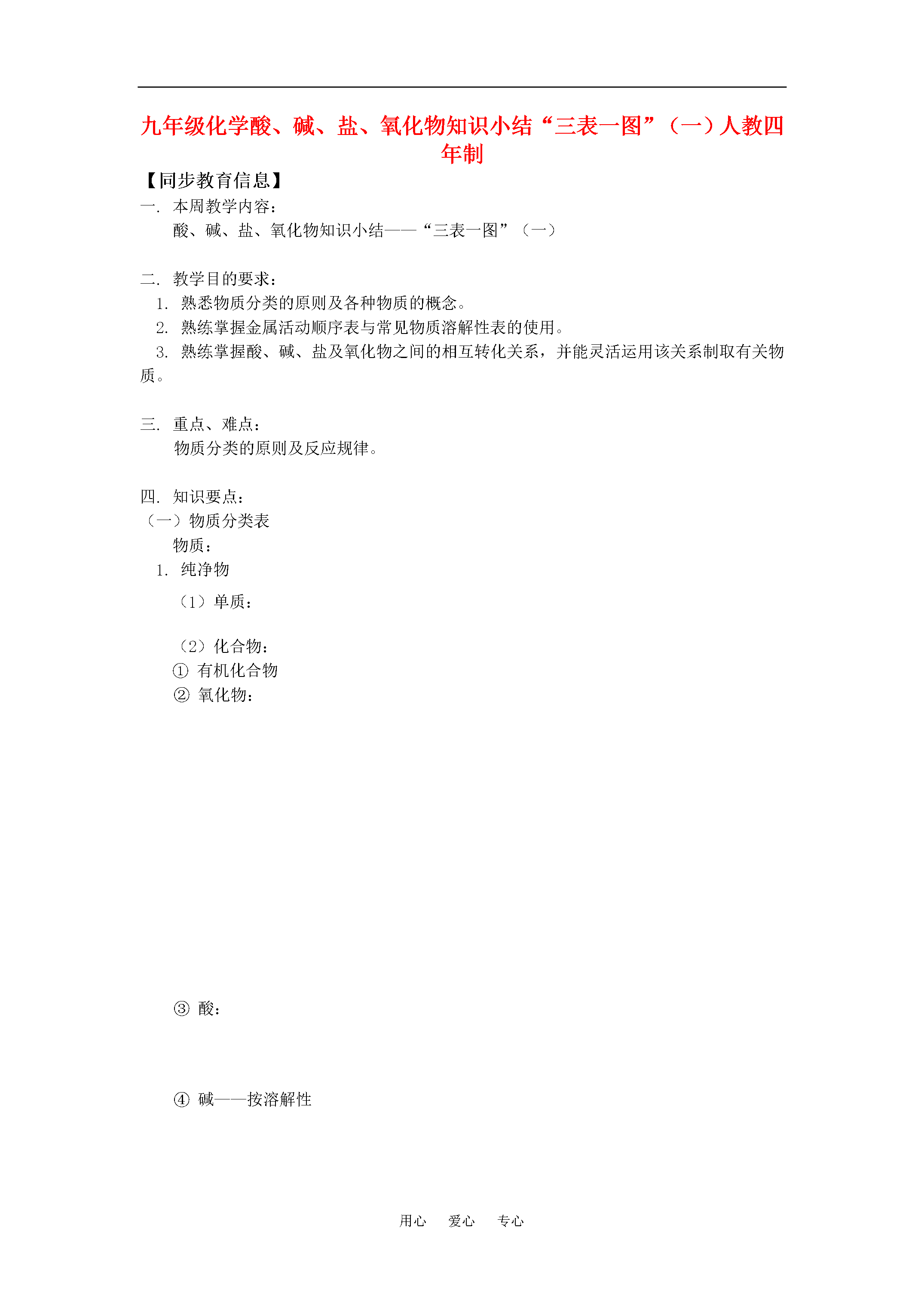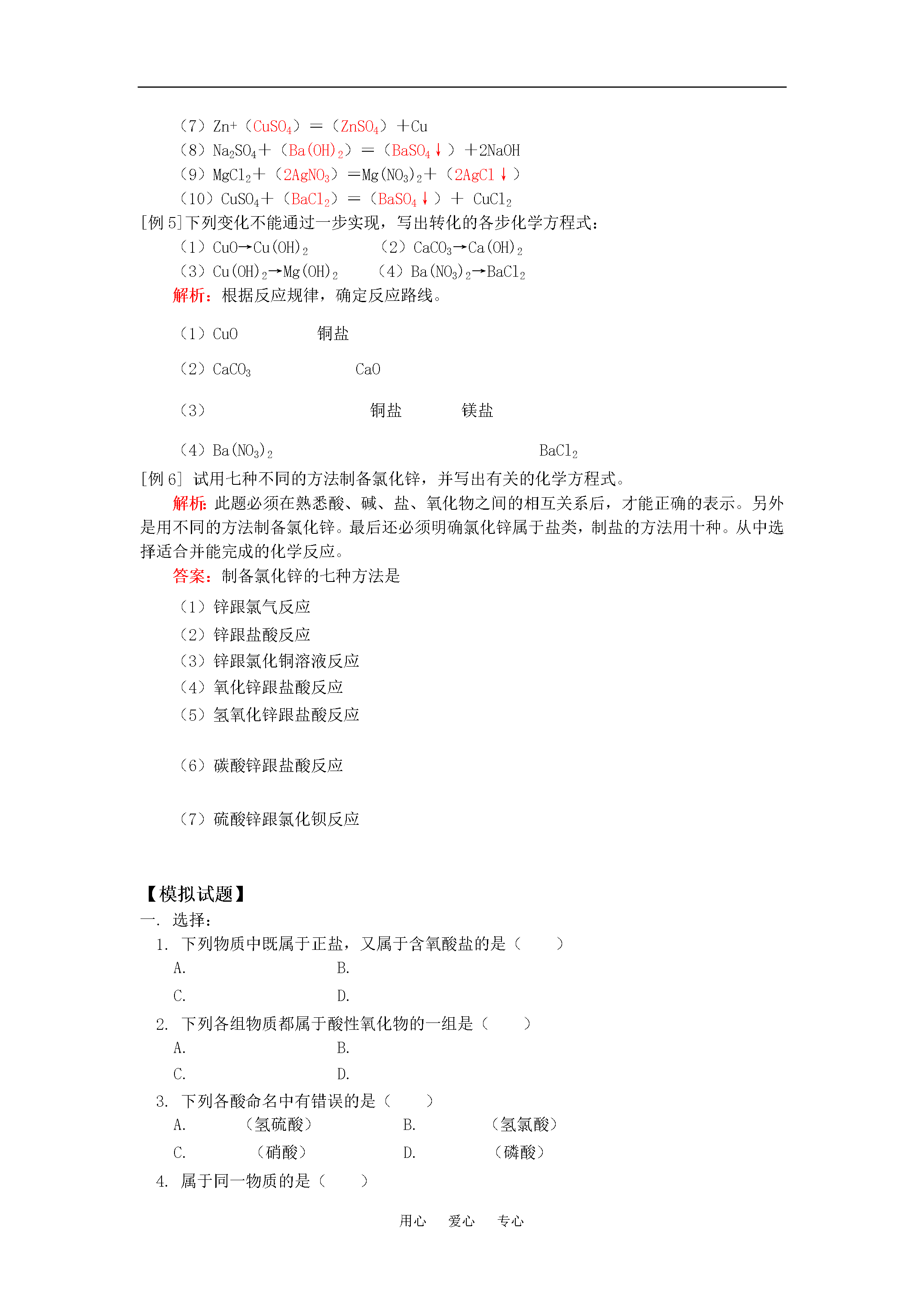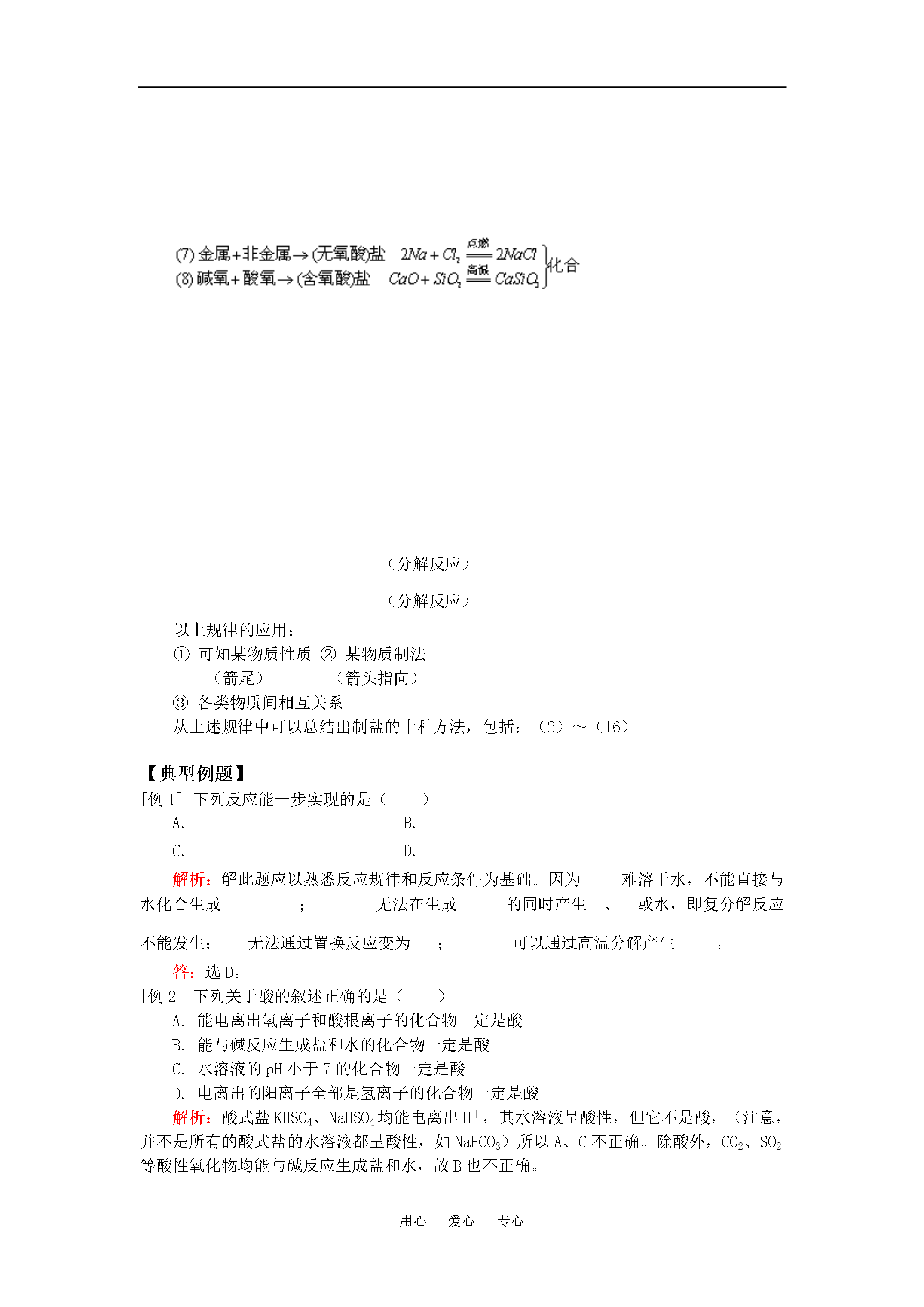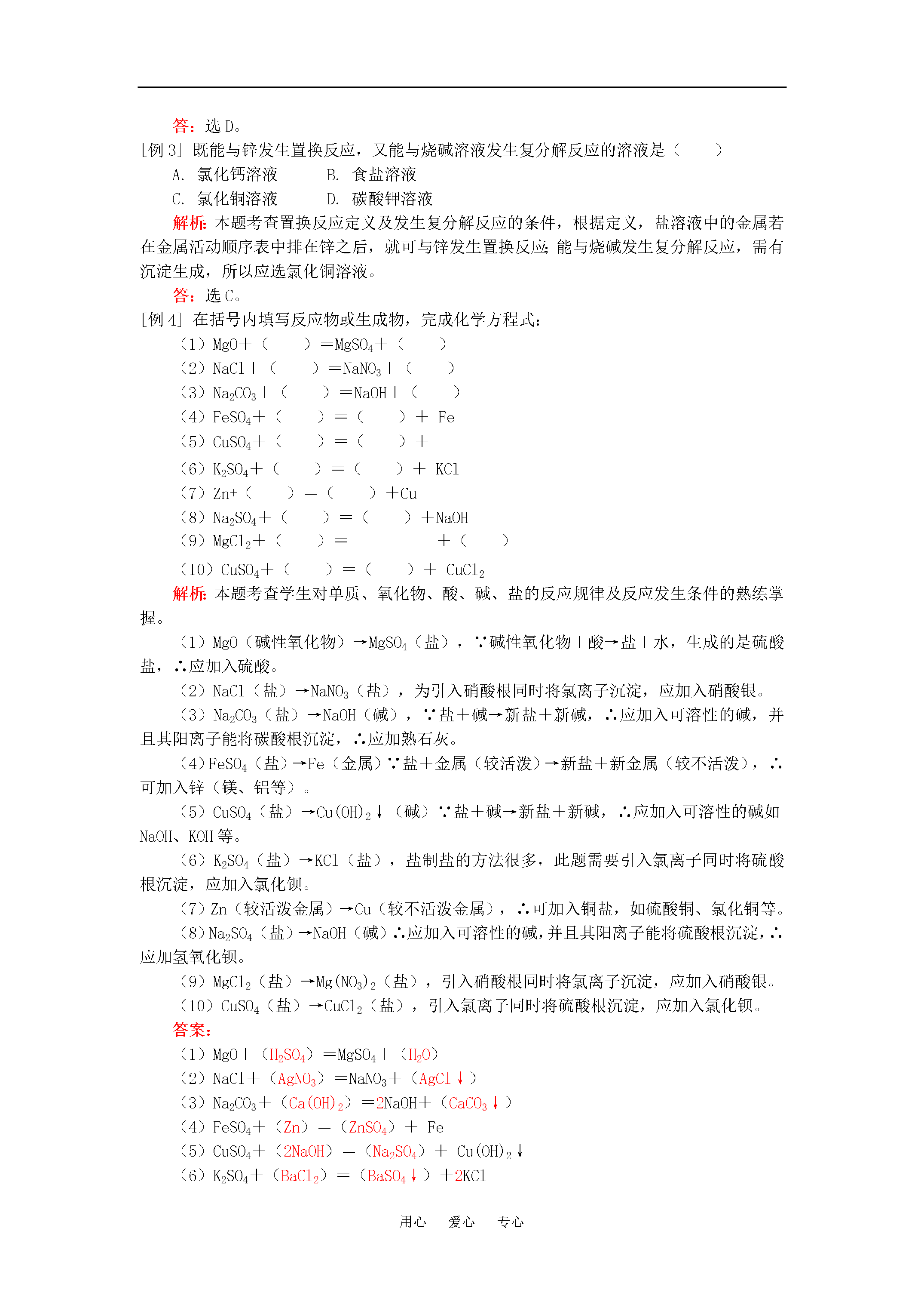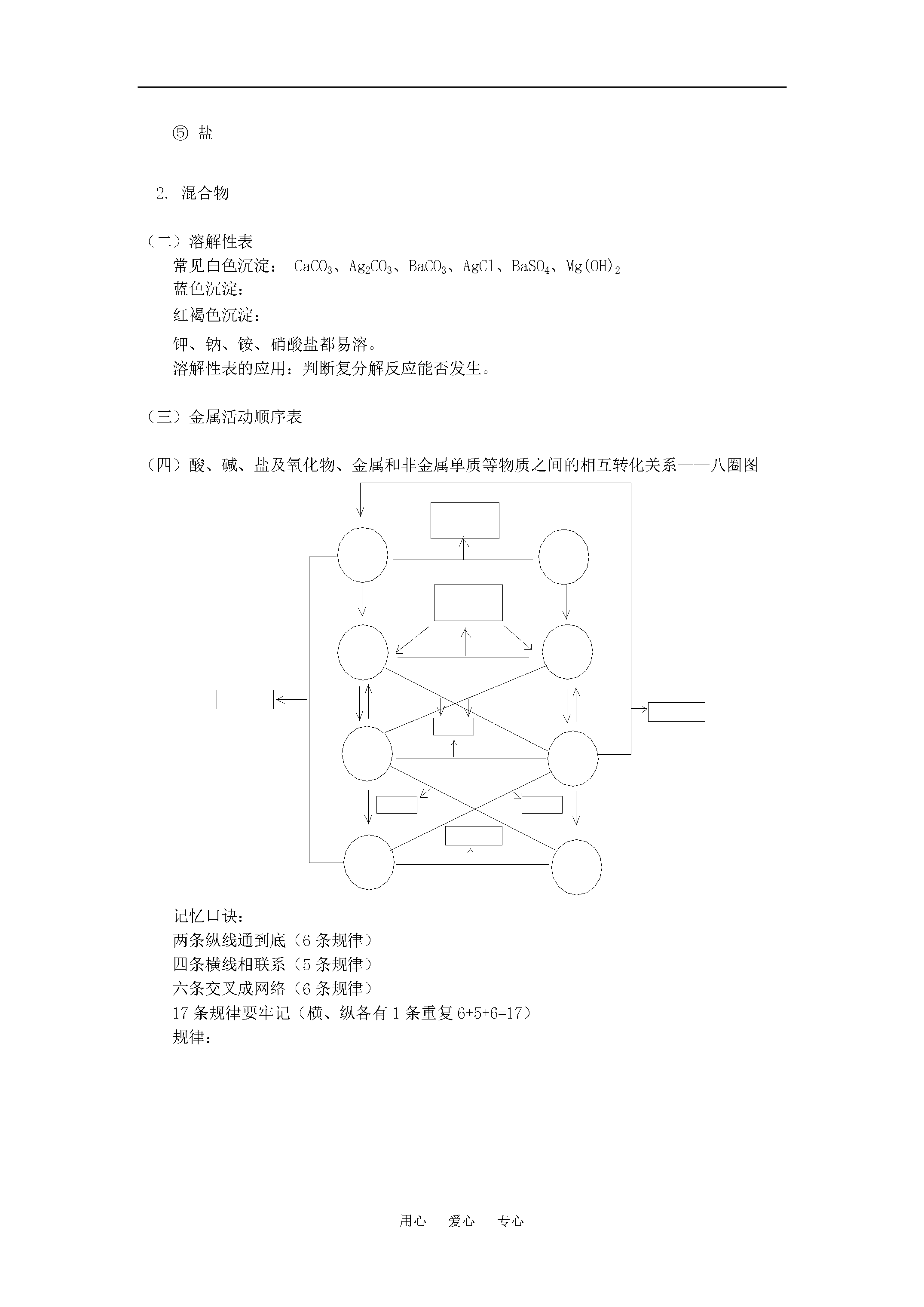 用心爱心专心九年级化学酸、碱、盐、氧化物知识小结“三表一图”(一)人教四年制【同步教育信息】一.本周教学内容:酸、碱、盐、氧化物知识小结——“三表一图”(一)二.教学目的要求:1.熟悉物质分类的原则及各种物质的概念。2.熟练掌握金属活动顺序表与常见物质溶解性表的使用。3.熟练掌握酸、碱、盐及氧化物之间的相互转化关系,并能灵活运用该关系制取有关物质。三.重点、难点:物质分类的原则及反应规律。四.知识要点:(一)物质分类表物质:1.纯净物(1)单质:(2)化合物:①有机化合物②氧化物:③酸:④碱——按溶解性⑤盐2.混合物(二)溶解性表常见白色沉淀:CaCO3、Ag2CO3、BaCO3、AgCl、BaSO4、Mg(OH)2蓝色沉淀:红褐色沉淀:钾、钠、铵、硝酸盐都易溶。溶解性表的应用:判断复分解反应能否发生。(三)金属活动顺序表(四)酸、碱、盐及氧化物、金属和非金属单质等物质之间的相互转化关系——八圈图记忆口诀:两条纵线通到底(6条规律)四条横线相联系(5条规律)六条交叉成网络(6条规律)17条规律要牢记(横、纵各有1条重复6+5+6=17)规律:(分解反应)(分解反应)以上规律的应用:①可知某物质性质②某物质制法(箭尾)(箭头指向)③各类物质间相互关系从上述规律中可以总结出制盐的十种方法,包括:(2)~(16)【典型例题】[例1]下列反应能一步实现的是()A.B.C.D.解析:解此题应以熟悉反应规律和反应条件为基础。因为难溶于水,不能直接与水化合生成;无法在生成的同时产生、或水,即复分解反应不能发生;无法通过置换反应变为;可以通过高温分解产生。答:选D。[例2]下列关于酸的叙述正确的是()A.能电离出氢离子和酸根离子的化合物一定是酸B.能与碱反应生成盐和水的化合物一定是酸C.水溶液的pH小于7的化合物一定是酸D.电离出的阳离子全部是氢离子的化合物一定是酸解析:酸式盐KHSO4、NaHSO4均能电离出H+,其水溶液呈酸性,但它不是酸,(注意,并不是所有的酸式盐的水溶液都呈酸性,如NaHCO3)所以A、C不正确。除酸外,CO2、SO2等酸性氧化物均能与碱反应生成盐和水,故B也不正确。答:选D。[例3]既能与锌发生置换反应,又能与烧碱溶液发生复分解反应的溶液是()A.氯化钙溶液B.食盐溶液C.氯化铜溶液D.碳酸钾溶液解析:本题考查置换反应定义及发生复分解反应的条件,根据定义,盐溶液中的金属若在金属活动顺序表中排在锌之后,就可与锌发生置换反应;能与烧碱发生复分解反应,需有沉淀生成,所以应选氯化铜溶液。答:选C。[例4]在括号内填写反应物或生成物,完成化学方程式:(1)MgO+()=MgSO4+()(2)NaCl+()=NaNO3+()(3)Na2CO3+()=NaOH+()(4)FeSO4+()=()+Fe(5)CuSO4+()=()+(6)K2SO4+()=()+KCl(7)Zn+()=()+Cu(8)Na2SO4+()=()+NaOH(9)MgCl2+()=+()(10)CuSO4+()=()+CuCl2解析:本题考查学生对单质、氧化物、酸、碱、盐的反应规律及反应发生条件的熟练掌握。(1)MgO(碱性氧化物)→MgSO4(盐),∵碱性氧化物+酸→盐+水,生成的是硫酸盐,∴应加入硫酸。(2)NaCl(盐)→NaNO3(盐),为引入硝酸根同时将氯离子沉淀,应加入硝酸银。(3)Na2CO3(盐)→NaOH(碱),∵盐+碱→新盐+新碱,∴应加入可溶性的碱,并且其阳离子能将碳酸根沉淀,∴应加熟石灰。(4)FeSO4(盐)→Fe(金属)∵盐+金属(较活泼)→新盐+新金属(较不活泼),∴可加入锌(镁、铝等)。(5)CuSO4(盐)→Cu(OH)2↓(碱)∵盐+碱→新盐+新碱,∴应加入可溶性的碱如NaOH、KOH等。(6)K2SO4(盐)→KCl(盐),盐制盐的方法很多,此题需要引入氯离子同时将硫酸根沉淀,应加入氯化钡。(7)Zn(较活泼金属)→Cu(较不活泼金属),∴可加入铜盐,如硫酸铜、氯化铜等。(8)Na2SO4(盐)→NaOH(碱)∴应加入可溶性的碱,并且其阳离子能将硫酸根沉淀,∴应加氢氧化钡。(9)MgCl2(盐)→Mg(NO3)2(盐),引入硝酸根同时将氯离子沉淀,应加入硝酸银。(10)CuSO4(盐)→CuCl2(盐),引入氯离子同时将硫酸根沉淀,应加入氯化钡。答案:(1)MgO+(H2SO4)=MgSO4+(H2O)(2)NaCl+(AgNO3)=NaNO3+(AgCl↓)(3)Na2CO3+(Ca(OH)2)=2NaOH+(CaCO3↓)(4)FeSO4+(Zn)=(ZnSO4)+Fe(5)CuSO4+(2NaOH)=(Na2SO4)+Cu(OH)2↓(6)K2SO4+(BaCl2)=(BaSO4↓)+2KCl(7)Zn+(CuSO