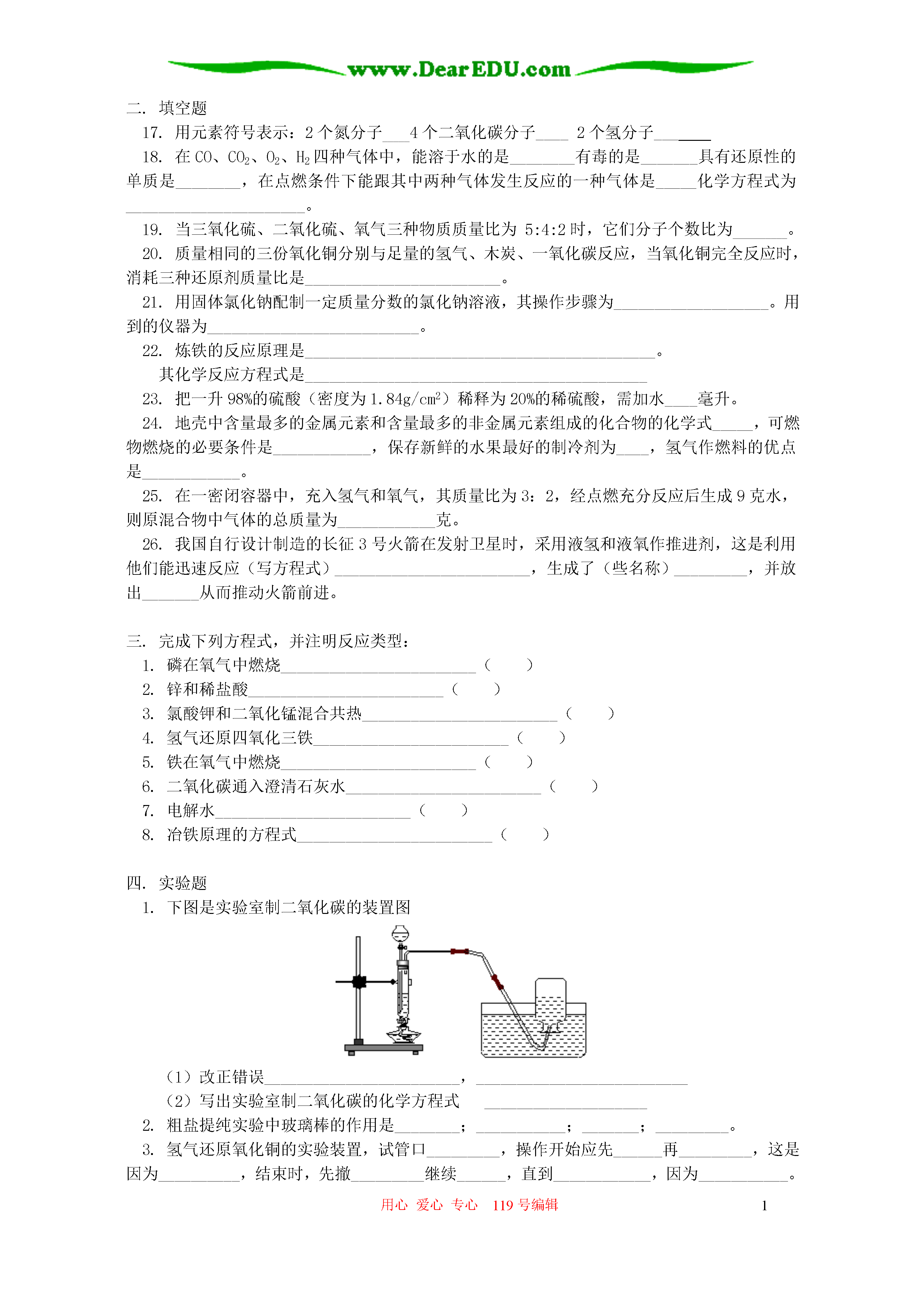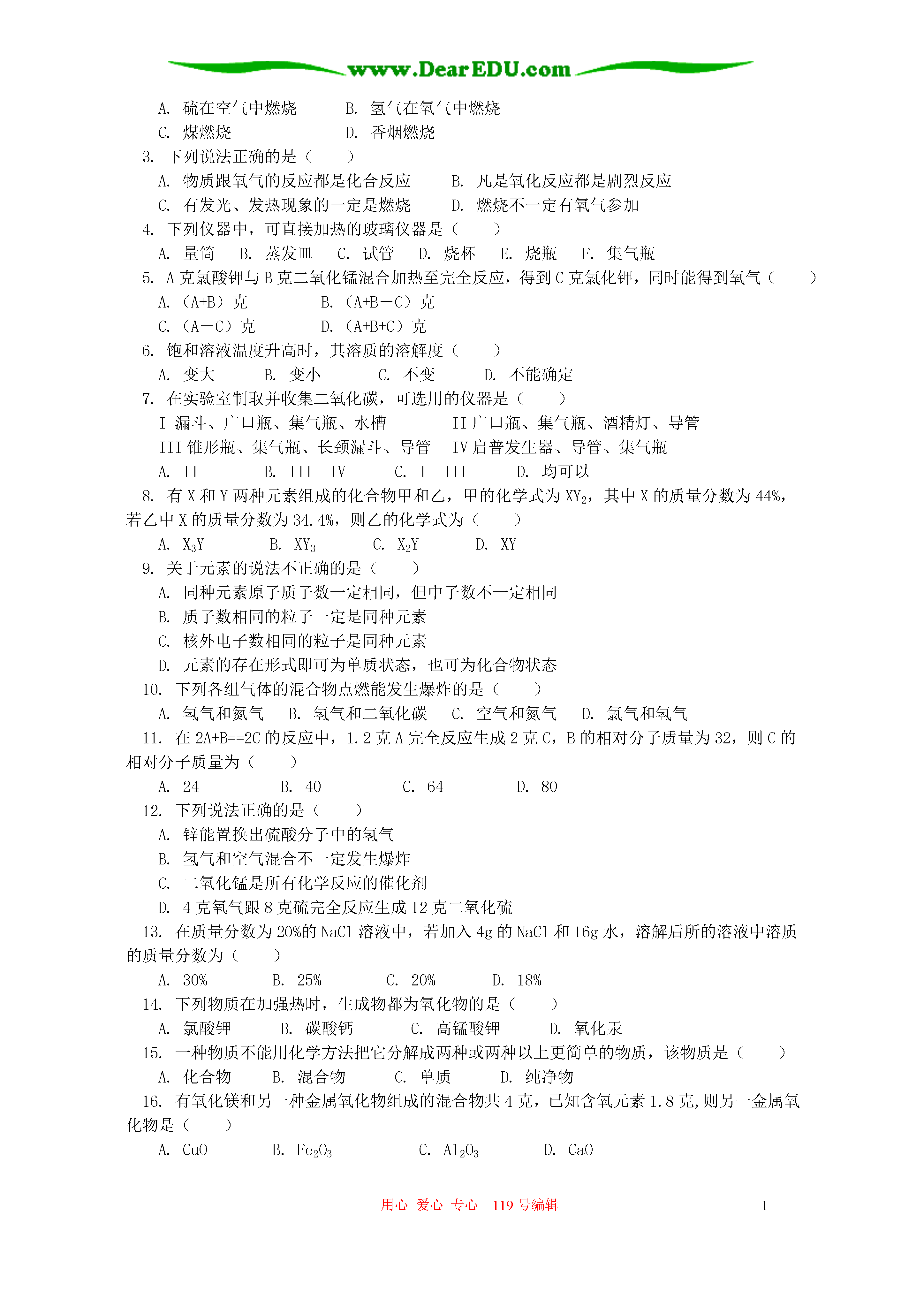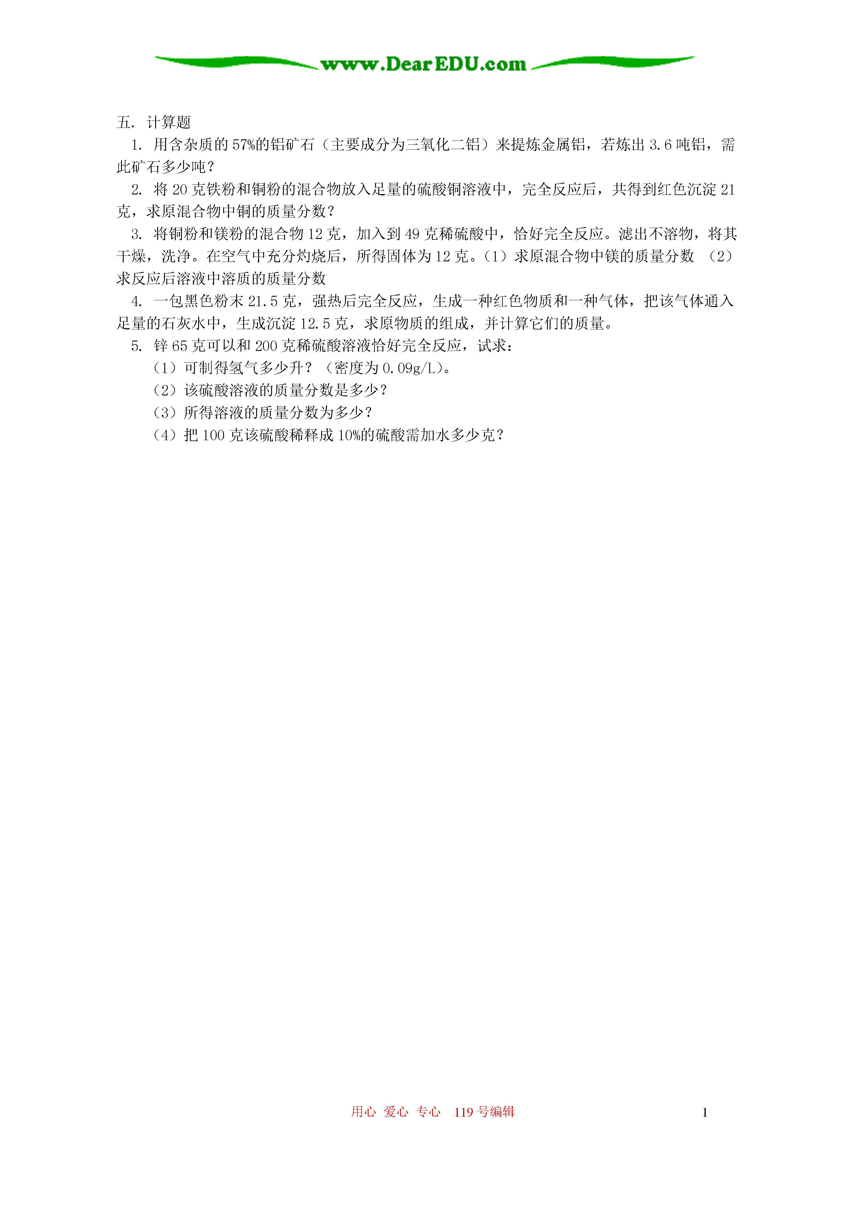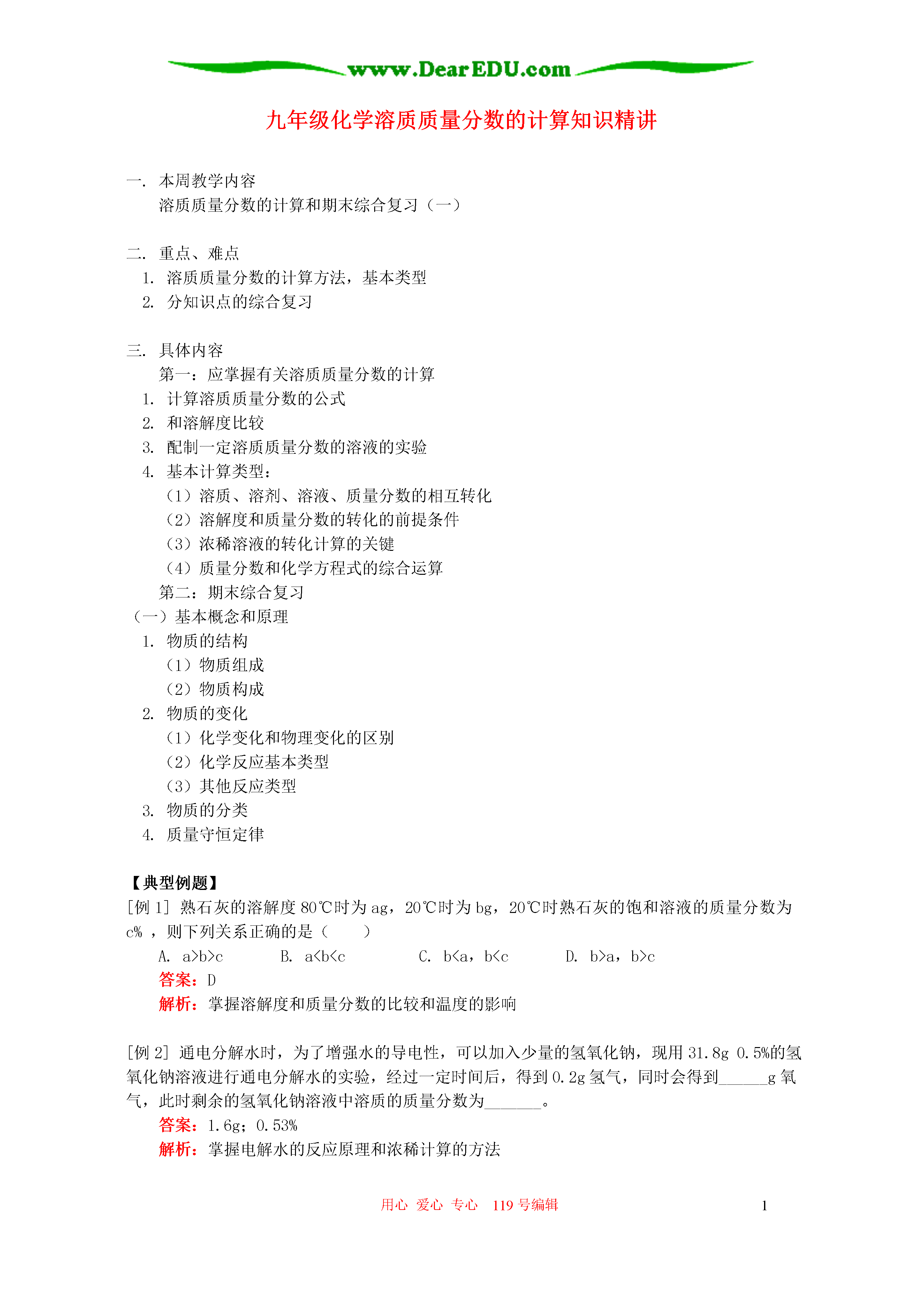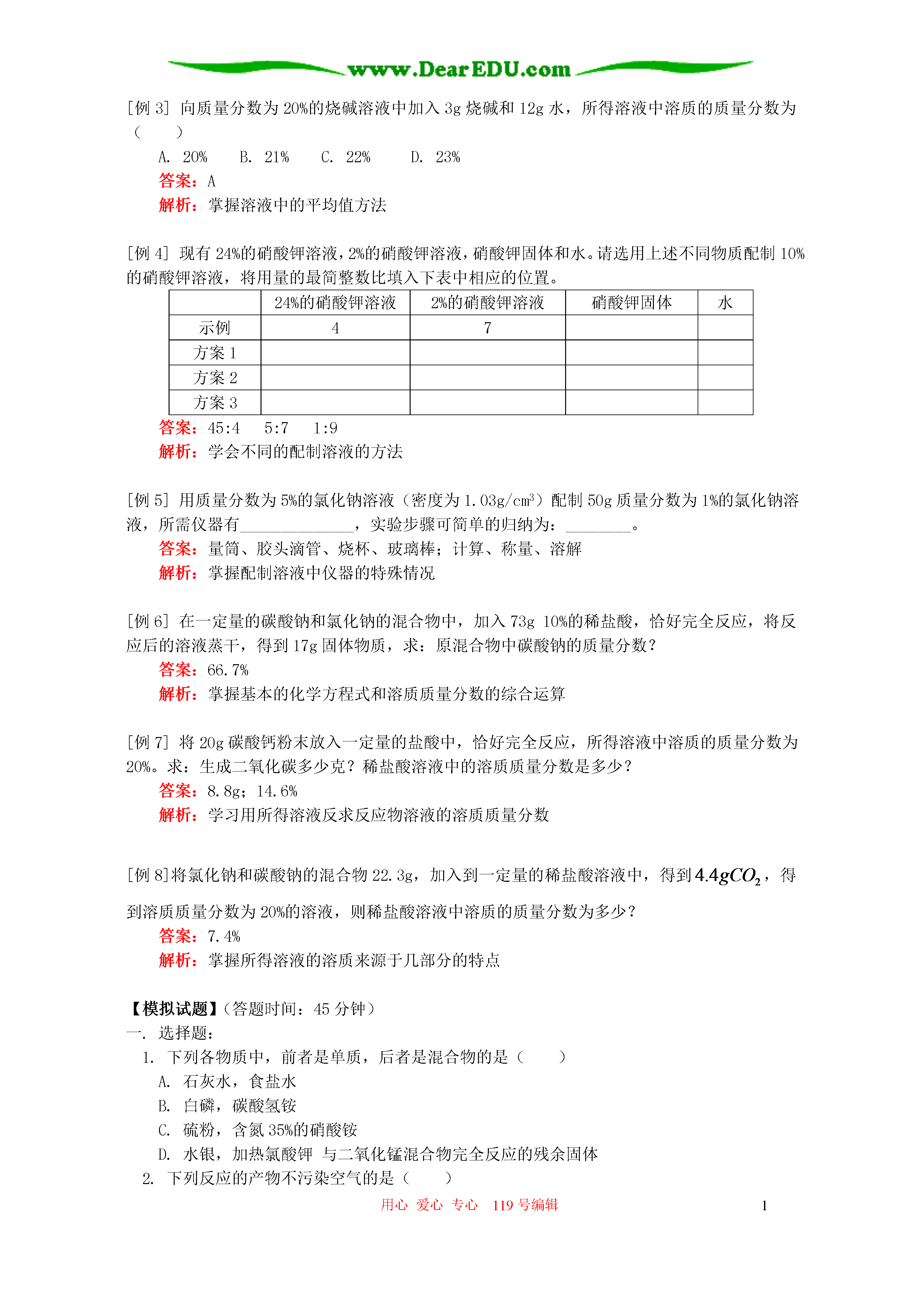 用心爱心专心119号编辑1九年级化学溶质质量分数的计算知识精讲一.本周教学内容溶质质量分数的计算和期末综合复习(一)二.重点、难点1.溶质质量分数的计算方法,基本类型2.分知识点的综合复习三.具体内容第一:应掌握有关溶质质量分数的计算1.计算溶质质量分数的公式2.和溶解度比较3.配制一定溶质质量分数的溶液的实验4.基本计算类型:(1)溶质、溶剂、溶液、质量分数的相互转化(2)溶解度和质量分数的转化的前提条件(3)浓稀溶液的转化计算的关键(4)质量分数和化学方程式的综合运算第二:期末综合复习(一)基本概念和原理1.物质的结构(1)物质组成(2)物质构成2.物质的变化(1)化学变化和物理变化的区别(2)化学反应基本类型(3)其他反应类型3.物质的分类4.质量守恒定律【典型例题】[例1]熟石灰的溶解度80℃时为ag,20℃时为bg,20℃时熟石灰的饱和溶液的质量分数为c%,则下列关系正确的是()A.a>b>cB.a<b<cC.b<a,b<cD.b>a,b>c答案:D解析:掌握溶解度和质量分数的比较和温度的影响[例2]通电分解水时,为了增强水的导电性,可以加入少量的氢氧化钠,现用31.8g0.5%的氢氧化钠溶液进行通电分解水的实验,经过一定时间后,得到0.2g氢气,同时会得到______g氧气,此时剩余的氢氧化钠溶液中溶质的质量分数为_______。答案:1.6g;0.53%解析:掌握电解水的反应原理和浓稀计算的方法[例3]向质量分数为20%的烧碱溶液中加入3g烧碱和12g水,所得溶液中溶质的质量分数为()A.20%B.21%C.22%D.23%答案:A解析:掌握溶液中的平均值方法[例4]现有24%的硝酸钾溶液,2%的硝酸钾溶液,硝酸钾固体和水。请选用上述不同物质配制10%的硝酸钾溶液,将用量的最简整数比填入下表中相应的位置。24%的硝酸钾溶液2%的硝酸钾溶液硝酸钾固体水示例47方案1方案2方案3答案:45:45:71:9解析:学会不同的配制溶液的方法[例5]用质量分数为5%的氯化钠溶液(密度为1.03g/cm3)配制50g质量分数为1%的氯化钠溶液,所需仪器有______________,实验步骤可简单的归纳为:________。答案:量筒、胶头滴管、烧杯、玻璃棒;计算、称量、溶解解析:掌握配制溶液中仪器的特殊情况[例6]在一定量的碳酸钠和氯化钠的混合物中,加入73g10%的稀盐酸,恰好完全反应,将反应后的溶液蒸干,得到17g固体物质,求:原混合物中碳酸钠的质量分数?答案:66.7%解析:掌握基本的化学方程式和溶质质量分数的综合运算[例7]将20g碳酸钙粉末放入一定量的盐酸中,恰好完全反应,所得溶液中溶质的质量分数为20%。求:生成二氧化碳多少克?稀盐酸溶液中的溶质质量分数是多少?答案:8.8g;14.6%解析:学习用所得溶液反求反应物溶液的溶质质量分数[例8]将氯化钠和碳酸钠的混合物22.3g,加入到一定量的稀盐酸溶液中,得到,得到溶质质量分数为20%的溶液,则稀盐酸溶液中溶质的质量分数为多少?答案:7.4%解析:掌握所得溶液的溶质来源于几部分的特点【模拟试题】(答题时间:45分钟)一.选择题:1.下列各物质中,前者是单质,后者是混合物的是()A.石灰水,食盐水B.白磷,碳酸氢铵C.硫粉,含氮35%的硝酸铵D.水银,加热氯酸钾与二氧化锰混合物完全反应的残余固体2.下列反应的产物不污染空气的是()A.硫在空气中燃烧B.氢气在氧气中燃烧C.煤燃烧D.香烟燃烧3.下列说法正确的是()A.物质跟氧气的反应都是化合反应B.凡是氧化反应都是剧烈反应C.有发光、发热现象的一定是燃烧D.燃烧不一定有氧气参加4.下列仪器中,可直接加热的玻璃仪器是()A.量筒B.蒸发皿C.试管D.烧杯E.烧瓶F.集气瓶5.A克氯酸钾与B克二氧化锰混合加热至完全反应,得到C克氯化钾,同时能得到氧气()A.(A+B)克B.(A+B-C)克C.(A-C)克D.(A+B+C)克6.饱和溶液温度升高时,其溶质的溶解度()A.变大B.变小C.不变D.不能确定7.在实验室制取并收集二氧化碳,可选用的仪器是()I漏斗、广口瓶、集气瓶、水槽II广口瓶、集气瓶、酒精灯、导管III锥形瓶、集气瓶、长颈漏斗、导管IV启普发生器、导管、集气瓶A.IIB.IIIIVC.IIIID.均可以8.有X和Y两种元素组成的化合物甲和乙,甲的化学式为XY2,其中X的质量分数为44%,若乙中X的质量分数为34.4%,则乙的化学式为()A.X3YB.XY3C.X2YD.XY9.关于元素的说法不正确的是()A.同种元素原