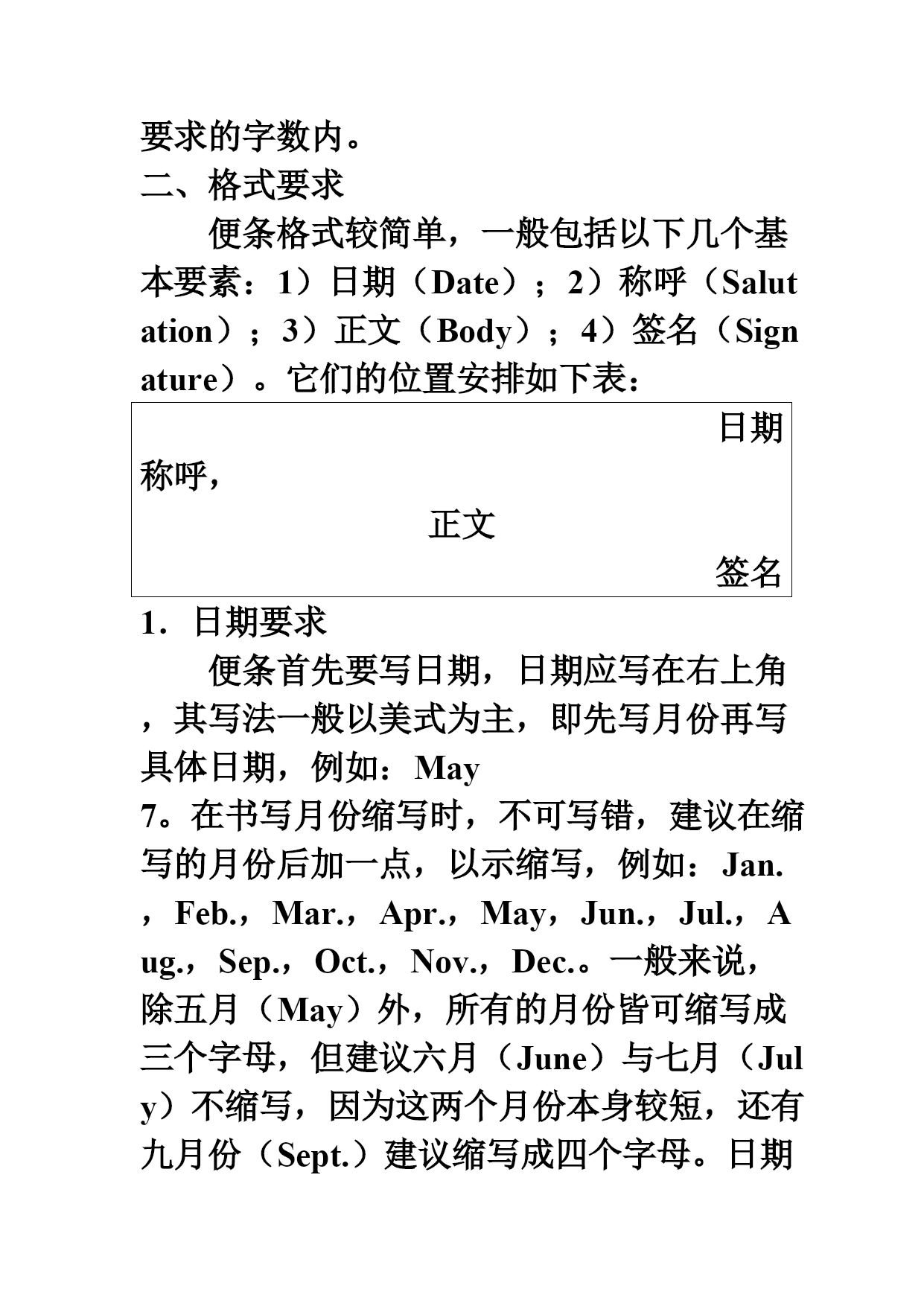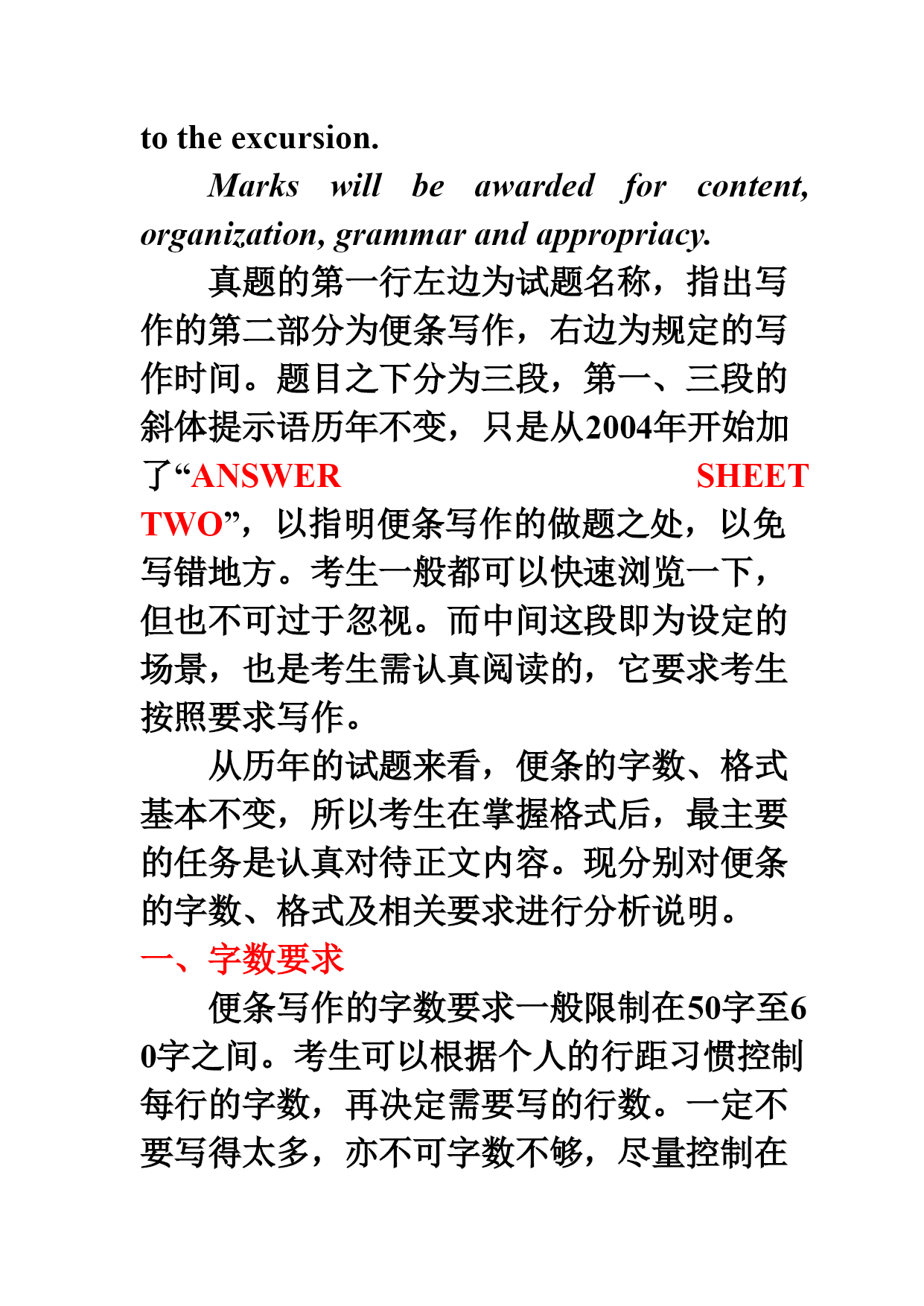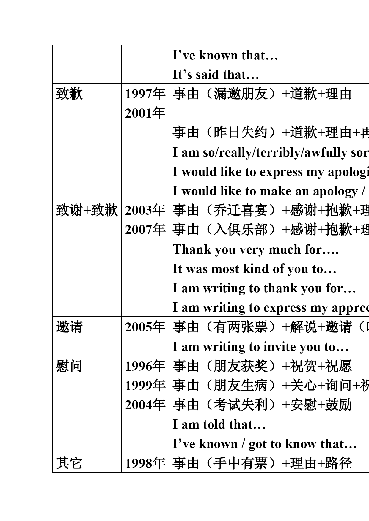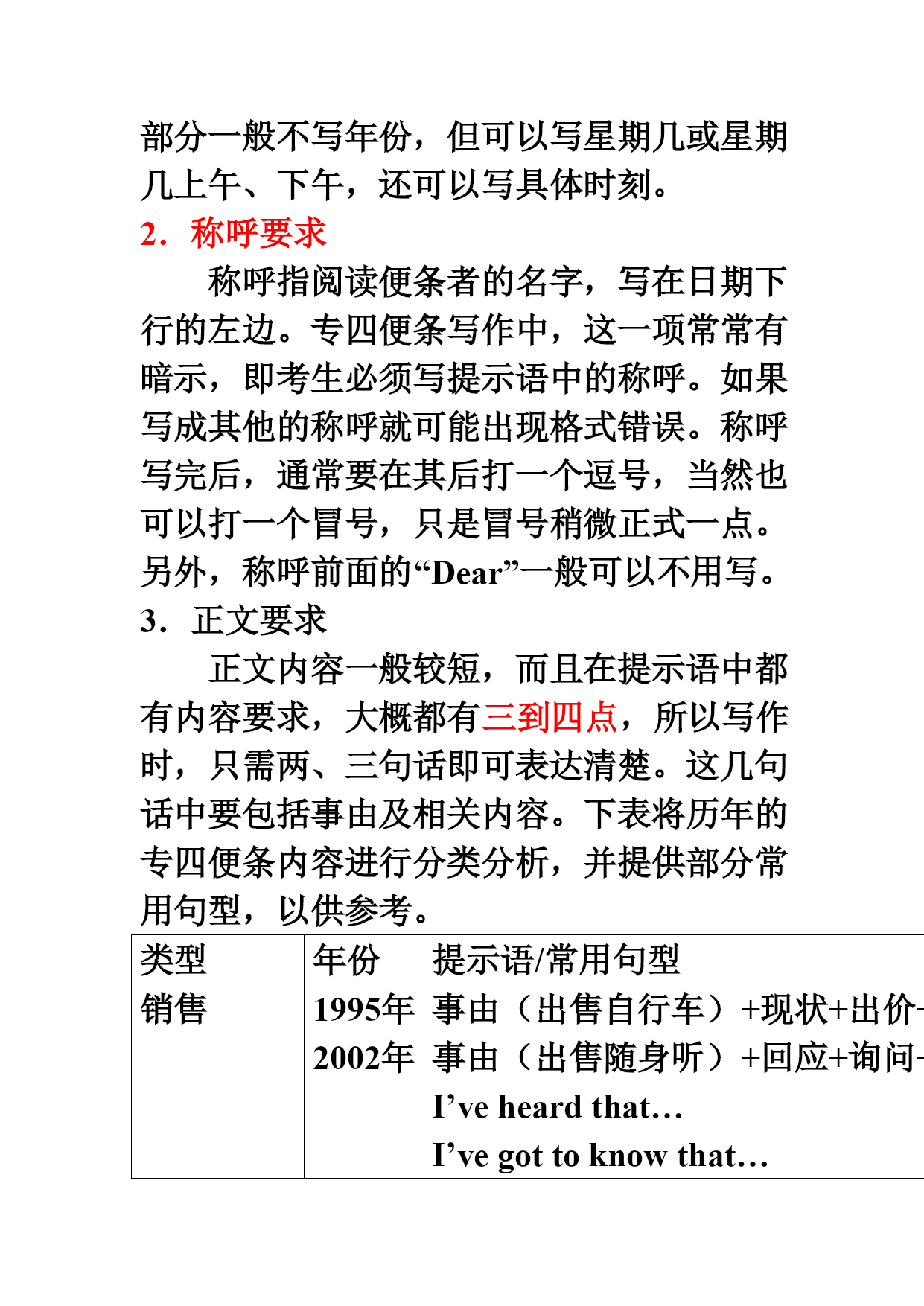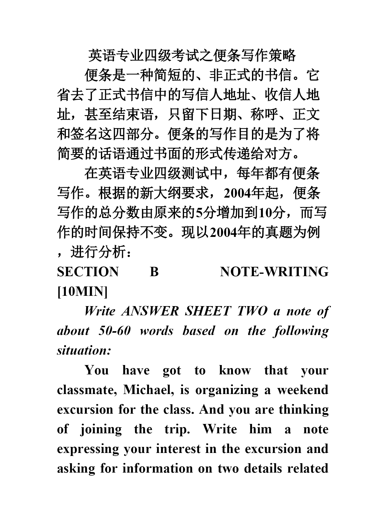英语专业四级考试之便条写作策略 便条是一种简短的、非正式的书信。它省去了正式书信中的写信人地址、收信人地址,甚至结束语,只留下日期、称呼、正文和签名这四部分。便条的写作目的是为了将简要的话语通过书面的形式传递给对方。 在英语专业四级测试中,每年都有便条写作。根据的新大纲要求,2004年起,便条写作的总分数由原来的5分增加到10分,而写作的时间保持不变。现以2004年的真题为例,进行分析: SECTIONBNOTE-WRITING[10MIN] WriteANSWERSHEETTWOanoteofabout50-60wordsbasedonthefollowingsituation: Youhavegottoknowthatyourclassmate,Michael,isorganizingaweekendexcursionfortheclass.Andyouarethinkingofjoiningthetrip.Writehimanoteexpressingyourinterestintheexcursionandaskingforinformationontwodetailsrelatedtotheexcursion. Markswillbeawardedforcontent,organization,grammarandappropriacy. 真题的第一行左边为试题名称,指出写作的第二部分为便条写作,右边为规定的写作时间。题目之下分为三段,第一、三段的斜体提示语历年不变,只是从2004年开始加了“ANSWERSHEETTWO”,以指明便条写作的做题之处,以免写错地方。考生一般都可以快速浏览一下,但也不可过于忽视。而中间这段即为设定的场景,也是考生需认真阅读的,它要求考生按照要求写作。 从历年的试题来看,便条的字数、格式基本不变,所以考生在掌握格式后,最主要的任务是认真对待正文内容。现分别对便条的字数、格式及相关要求进行分析说明。 一、字数要求 便条写作的字数要求一般限制在50字至60字之间。考生可以根据个人的行距习惯控制每行的字数,再决定需要写的行数。一定不要写得太多,亦不可字数不够,尽量控制在要求的字数内。 二、格式要求 便条格式较简单,一般包括以下几个基本要素:1)日期(Date);2)称呼(Salutation);3)正文(Body);4)签名(Signature)。它们的位置安排如下表: 日期 称呼, 正文 签名1.日期要求 便条首先要写日期,日期应写在右上角,其写法一般以美式为主,即先写月份再写具体日期,例如:May7。在书写月份缩写时,不可写错,建议在缩写的月份后加一点,以示缩写,例如:Jan.,Feb.,Mar.,Apr.,May,Jun.,Jul.,Aug.,Sep.,Oct.,Nov.,Dec.。一般来说,除五月(May)外,所有的月份皆可缩写成三个字母,但建议六月(June)与七月(July)不缩写,因为这两个月份本身较短,还有九月份(Sept.)建议缩写成四个字母。日期部分一般不写年份,但可以写星期几或星期几上午、下午,还可以写具体时刻。 2.称呼要求 称呼指阅读便条者的名字,写在日期下行的左边。专四便条写作中,这一项常常有暗示,即考生必须写提示语中的称呼。如果写成其他的称呼就可能出现格式错误。称呼写完后,通常要在其后打一个逗号,当然也可以打一个冒号,只是冒号稍微正式一点。另外,称呼前面的“Dear”一般可以不用写。 3.正文要求 正文内容一般较短,而且在提示语中都有内容要求,大概都有三到四点,所以写作时,只需两、三句话即可表达清楚。这几句话中要包括事由及相关内容。下表将历年的专四便条内容进行分类分析,并提供部分常用句型,以供参考。 类型年份提示语/常用句型销售1995年 2002年事由(出售自行车)+现状+出价+联系 事由(出售随身听)+回应+询问+出价 I’veheardthat… I’vegottoknowthat… I’veknownthat… It’ssaidthat…致歉1997年 2001年事由(漏邀朋友)+道歉+理由 事由(昨日失约)+道歉+理由+再约(建议时间)Iamso/really/terribly/awfullysorrythat… Iwouldliketoexpressmyapologiesfor… Iwouldliketomakeanapology/apologizefor…致谢+致歉2003年 2007年事由(乔迁喜宴)+感谢+抱歉+理由+祝愿 事由(入俱乐部)+感谢+抱歉+理由Thankyouverymuchfor…. Itwasmostkindofyouto… Iamwritingtothankyoufor… Iamwritingtoexpressmyapprec