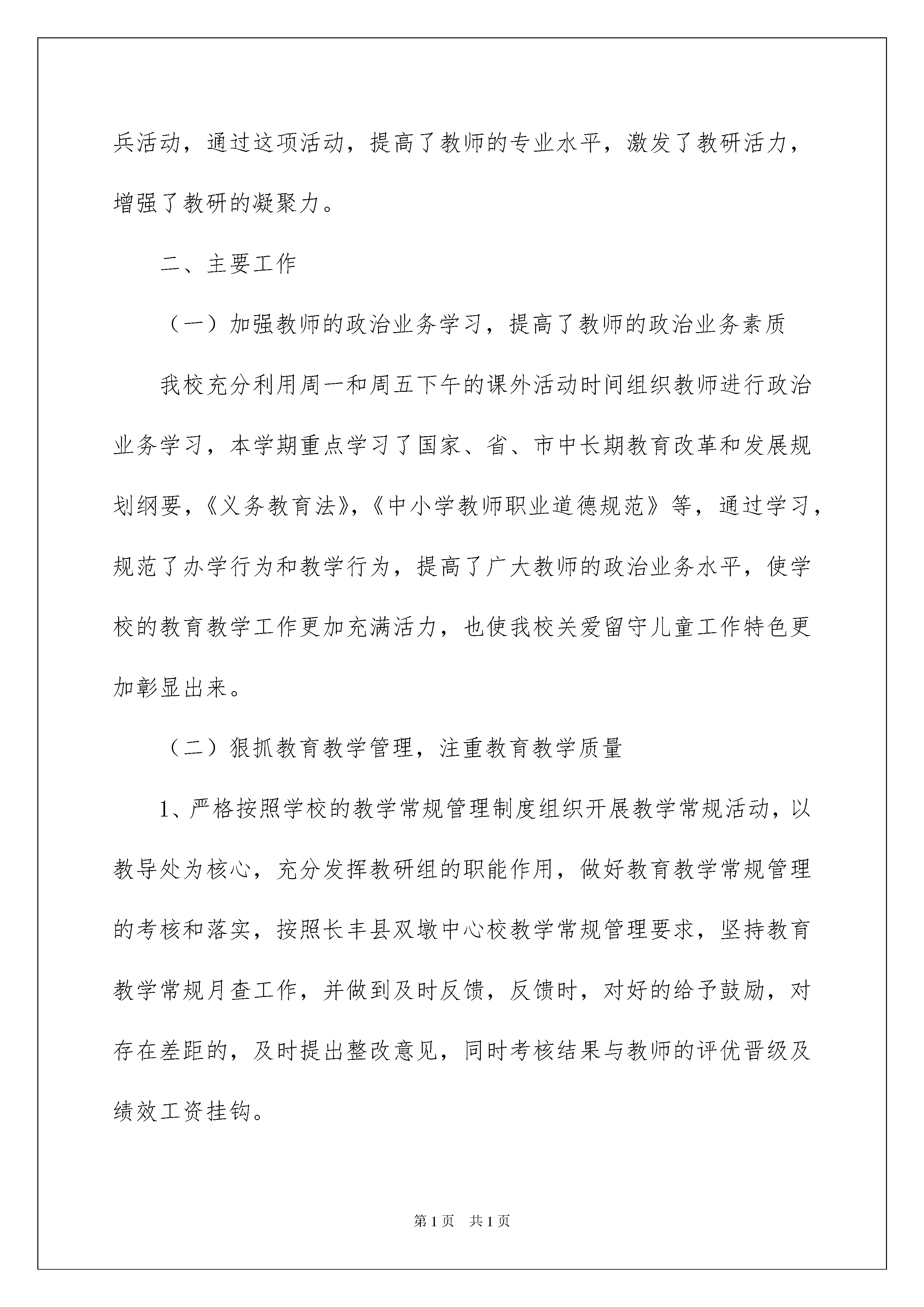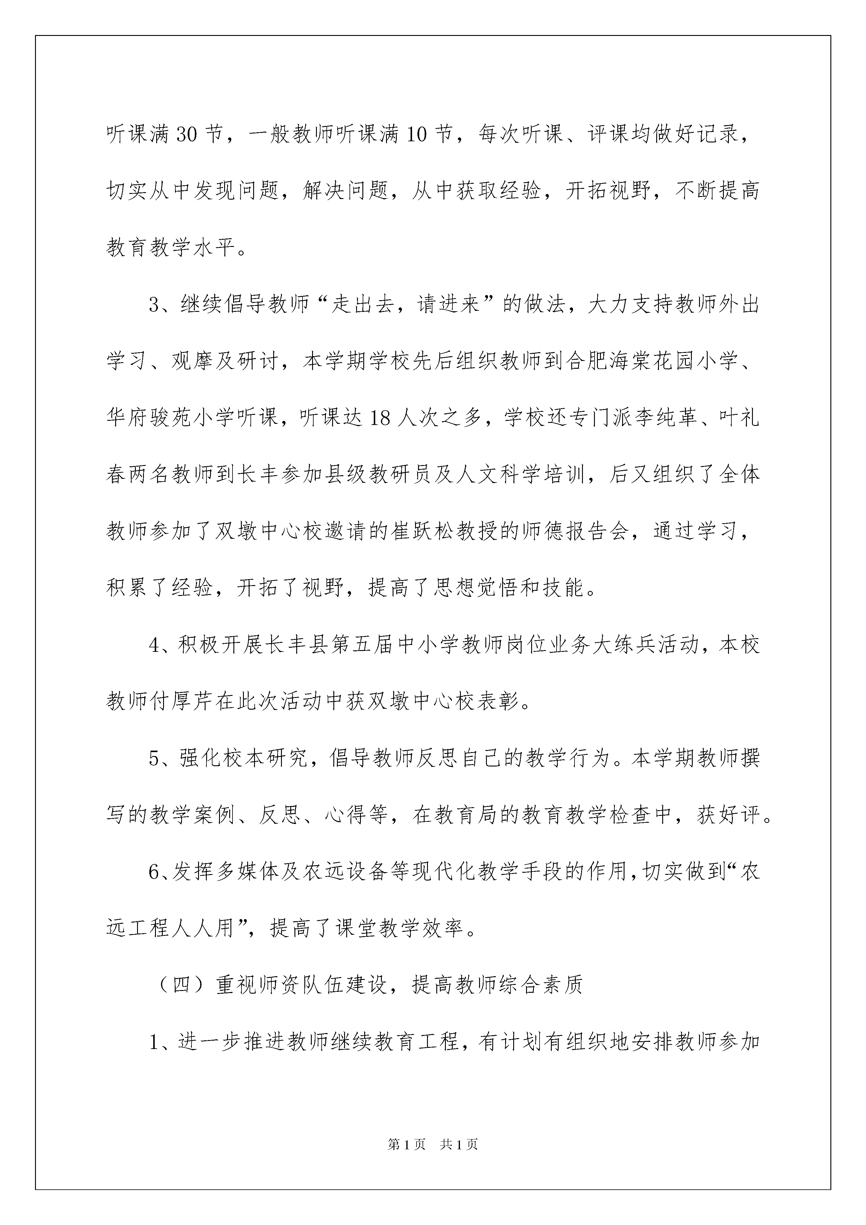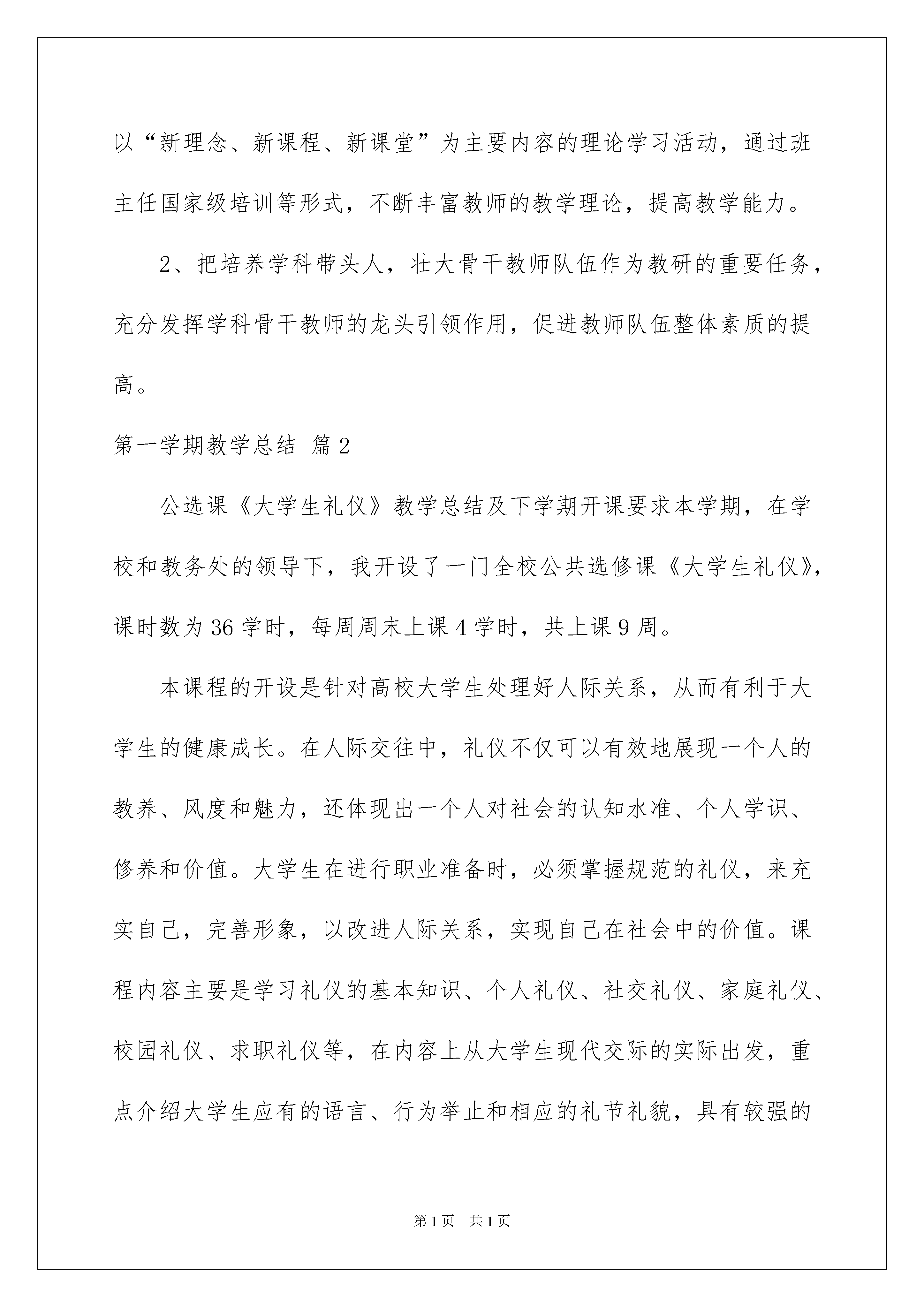 2022第一学期教学总结10篇第一学期教学总结10篇总结是指社会团体、企业单位和个人对某一阶段的学习、工作或其完成情况加以回顾和分析,得出教训和一些规律性认识的一种书面材料,它能帮我们理顺知识结构,突出重点,突破难点,让我们抽出时间写写总结吧。那么我们该怎么去写总结呢?以下是我收集整理的第一学期教学总结10篇,希望对大家有所帮助。第一学期教学总结篇1一、总体概况本学期,我校能积极贯彻党的教育方针、路线和政策,坚持以国家、省、市中长期教育改革和发展规划纲要为指导,积极推进基础教育课程改革,坚持以育人为本,全面实施素质教育,通过全体教师的努力,现已完成了各项教育教学任务,全校教育教学质量有了稳步提升,特别是关爱留守儿童工作方面,成效显着,现我校创办长丰县农村(关爱留守儿童)特色学校亟待验收,本学期,我校能积极响应长丰县教研室的号召,积极开展长丰县第五届中小学教师岗位业务大练兵活动,通过这项活动,提高了教师的专业水平,激发了教研活力,增强了教研的凝聚力。二、主要工作(一)加强教师的政治业务学习,提高了教师的政治业务素质我校充分利用周一和周五下午的课外活动时间组织教师进行政治业务学习,本学期重点学习了国家、省、市中长期教育改革和发展规划纲要,《义务教育法》,《中小学教师职业道德规范》等,通过学习,规范了办学行为和教学行为,提高了广大教师的政治业务水平,使学校的教育教学工作更加充满活力,也使我校关爱留守儿童工作特色更加彰显出来。(二)狠抓教育教学管理,注重教育教学质量1、严格按照学校的教学常规管理制度组织开展教学常规活动,以教导处为核心,充分发挥教研组的职能作用,做好教育教学常规管理的考核和落实,按照长丰县双墩中心校教学常规管理要求,坚持教育教学常规月查工作,并做到及时反馈,反馈时,对好的给予鼓励,对存在差距的,及时提出整改意见,同时考核结果与教师的评优晋级及绩效工资挂钩。2、以课堂教学为主阵地,重点改革课堂教学行为和方法,努力构建教与学互动和谐的生命课堂,注重课堂教学的效率和效果。本学期,我校共组织了12次公开教学活动,本校四十五周岁以下教师全部用多媒体上课,通过这些渠道,提高了教师的上课、评课技能,提高了每一堂课的效益。3、进一步做好关爱留守儿童工作,建立“关爱留守儿童”工作记录袋,及时对关爱留守儿童工作进行总结和改进,对表现好的给予表彰和奖励。4、开展留守儿童问卷调查活动,通过走访、问卷、回访等,积累经验,改进方法,关注关爱留守儿童的效果和社会效益。(三)强化校本教研,促进校本教研的制度化、规范化1、发挥教研组的职能作用,通过集体备课、经验交流会等,共同解决教学中的疑难问题,培养教师的团体精神和协作意识,做到相互取长补短,促进教学水平的全面提高。2、坚持开展听课与评课一体化活动。每位教师做到一学期上一节公开课,四十五周岁以下的教师均利用多媒体或农远设备进行教学设计及上课,学校领导在教研中起到带头作用,校长、教导主任一学期听课满30节,一般教师听课满10节,每次听课、评课均做好记录,切实从中发现问题,解决问题,从中获取经验,开拓视野,不断提高教育教学水平。3、继续倡导教师“走出去,请进来”的做法,大力支持教师外出学习、观摩及研讨,本学期学校先后组织教师到合肥海棠花园小学、华府骏苑小学听课,听课达18人次之多,学校还专门派李纯革、叶礼春两名教师到长丰参加县级教研员及人文科学培训,后又组织了全体教师参加了双墩中心校邀请的崔跃松教授的师德报告会,通过学习,积累了经验,开拓了视野,提高了思想觉悟和技能。4、积极开展长丰县第五届中小学教师岗位业务大练兵活动,本校教师付厚芹在此次活动中获双墩中心校表彰。5、强化校本研究,倡导教师反思自己的教学行为。本学期教师撰写的教学案例、反思、心得等,在教育局的教育教学检查中,获好评。6、发挥多媒体及农远设备等现代化教学手段的作用,切实做到“农远工程人人用”,提高了课堂教学效率。(四)重视师资队伍建设,提高教师综合素质1、进一步推进教师继续教育工程,有计划有组织地安排教师参加以“新理念、新课程、新课堂”为主要内容的理论学习活动,通过班主任国家级培训等形式,不断丰富教师的教学理论,提高教学能力。2、把培养学科带头人,壮大骨干教师队伍作为教研的重要任务,充分发挥学科骨干教师的龙头引领作用,促进教师队伍整体素质的提高。第一学期教学总结篇2公选课《大学生礼仪》教学总结及下学期开课要求本学期,在学校和教务处的领导下,我开设了一门全校公共选修课《大学生礼仪》,课时数为36学时,每周周末上课4学时,共上课9周。本课程的开设是针对高校大学生处理好人际关系,从而有利于大学