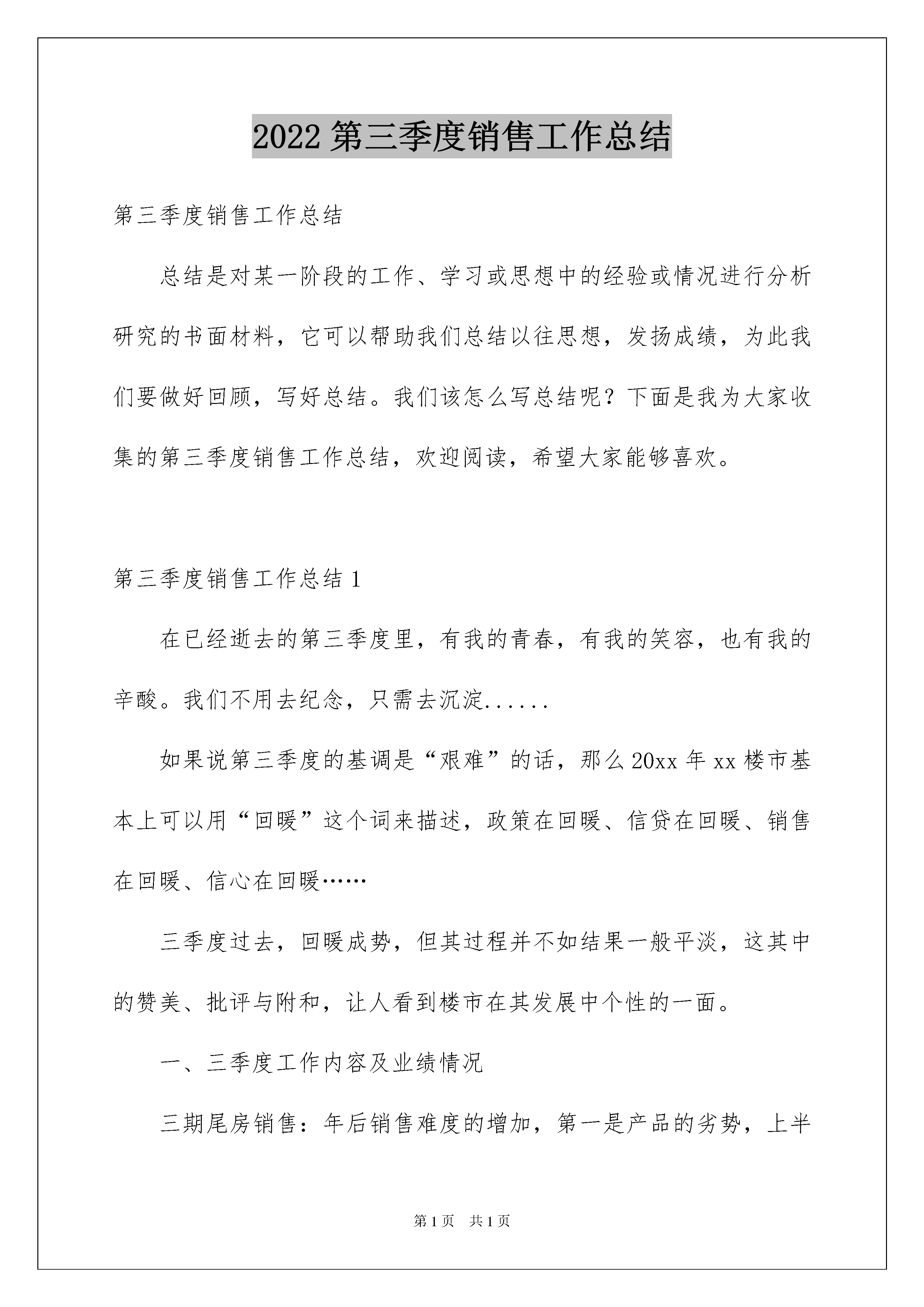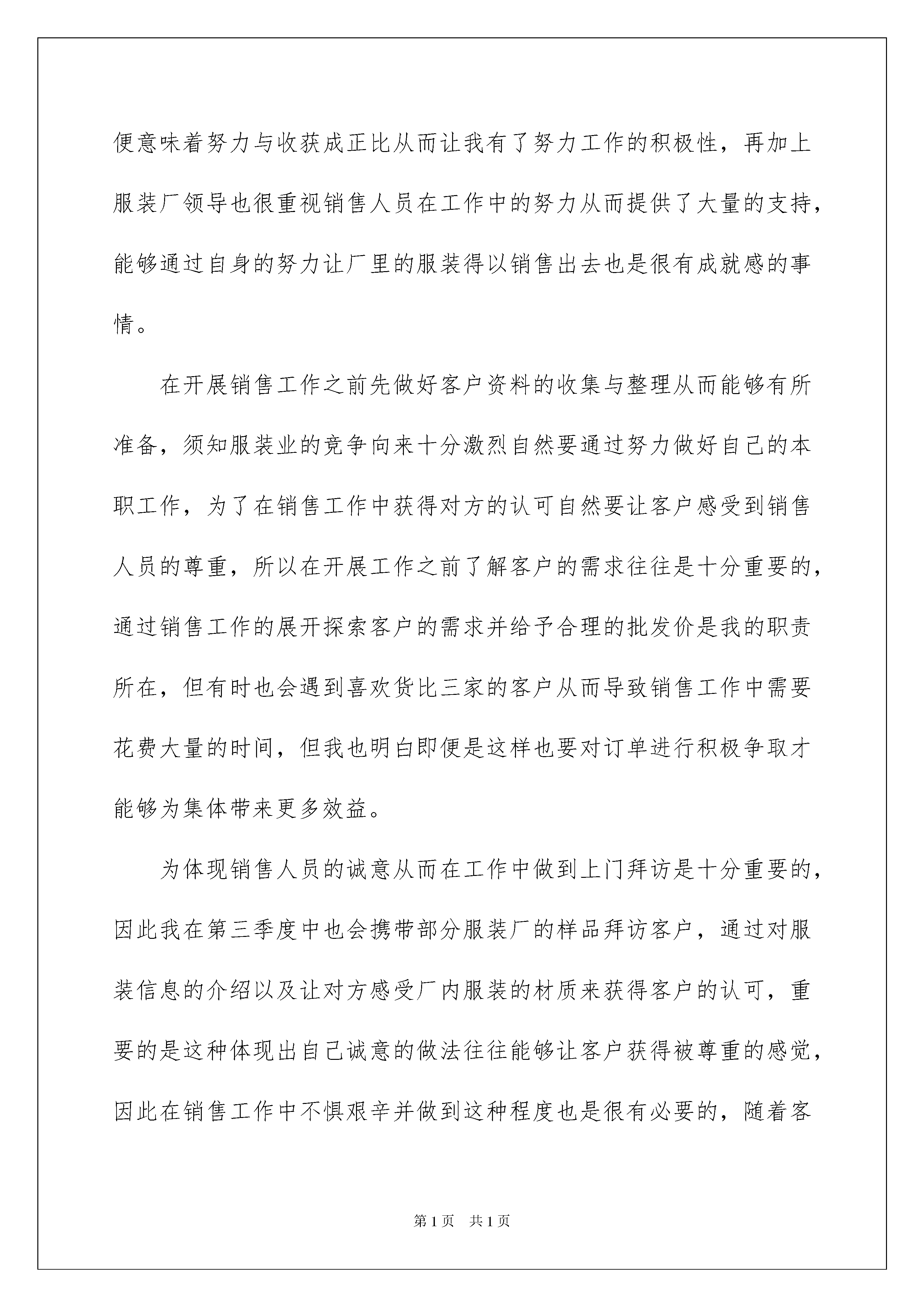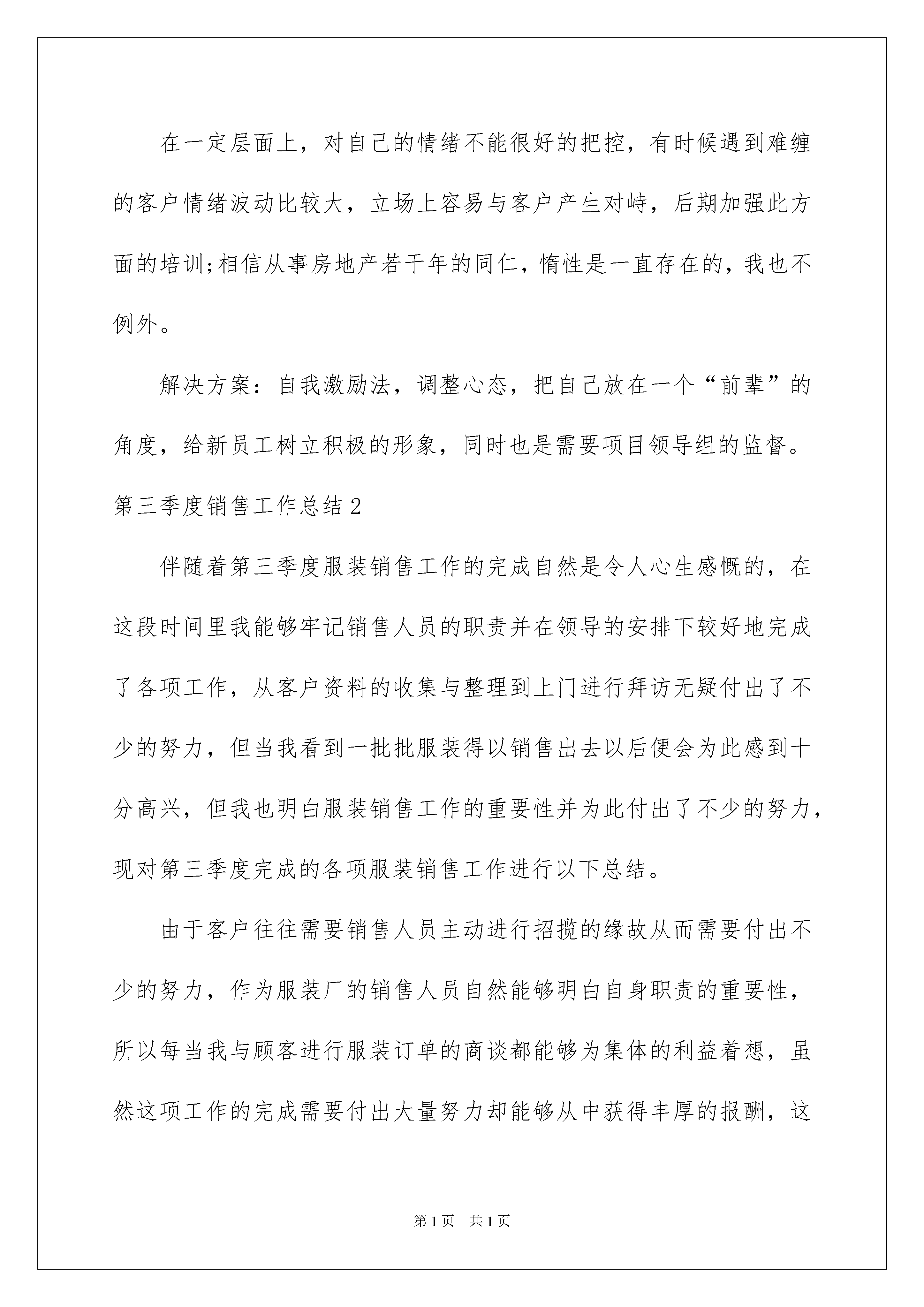 2022第三季度销售工作总结第三季度销售工作总结总结是对某一阶段的工作、学习或思想中的经验或情况进行分析研究的书面材料,它可以帮助我们总结以往思想,发扬成绩,为此我们要做好回顾,写好总结。我们该怎么写总结呢?下面是我为大家收集的第三季度销售工作总结,欢迎阅读,希望大家能够喜欢。第三季度销售工作总结1在已经逝去的第三季度里,有我的青春,有我的笑容,也有我的辛酸。我们不用去纪念,只需去沉淀......如果说第三季度的基调是“艰难”的话,那么20xx年xx楼市基本上可以用“回暖”这个词来描述,政策在回暖、信贷在回暖、销售在回暖、信心在回暖……三季度过去,回暖成势,但其过程并不如结果一般平淡,这其中的赞美、批评与附和,让人看到楼市在其发展中个性的一面。一、三季度工作内容及业绩情况三期尾房销售:年后销售难度的增加,第一是产品的劣势,上半年在售的三期剩余房源主要是客厅朝北的G4,客户对此户型的抗性普遍较大;第二就是价格,上半年周边各大楼盘推出的打折促销活动层出不穷,客户要的优惠也水涨船高,往往一个意向客户谈价格的时间可以是1个小时,也可以是半天,甚至是1天,交定之后真的可以说是身心疲惫,而正是因为这些刁钻的客户,磨练了我不屈不挠的迎刃而上的精神三期顺利交房:三期于8月底的顺利开展交房工作,并且无重大质量问题。五期预约开盘:今年的销售工作中,最重要的内容就是五期“享寓”盛大开盘,从8月5日开始预约至8月25日正式开盘,仅是这短短20天的准备时间用1天的开盘时间见证我们之前所有的付出与努力。开盘当天认购58套,排案场第三名,在后续的持续销售中,全面完成销售面积5796.35㎡,销售金额53863083万;为迎合预计下半年的开盘的五期第二批,参加公司培训:公司今年开始组织一线销售人员参加一系列的培训,雄鹰训练营、精英训练营、核心专业团队,进公司近3年以来,第一次参加这样如此集中、含金量极高的培训活动,包括有:案前作业操作流程、商务礼仪、定价策略、高端住宅销售,涉及的知识面较广,对于扮演承上启下角色的我们,受益匪浅。二、工作中的得失在这个项目服务也有近3年多了,回顾自己的工作,主要在以下几个方面有所进步:专业方面---今年参加公司举办的《精英训练营》一系列的专业培训,从项目前期、案前作业流程到团队建设管理以及定价策略,自己深知这种福利,我没有落下一个课时,获益匪浅;自我管理---在这个项目已经近三年了,销售疲劳也随之而来,这个时候自我管理尤其重要,今年8月底五期顺利开盘后,即使案场第三的业绩下,我开始回访从去年开始的所以没有购买的客户,也为后续的销售注入新的血液,也为新同事树立了榜样;团队建设---作为案场扮演承上启下的角色,在自我管理的同时也注重团队建设,无论是新同事还是上级领导都配合无间。在对自己取得的进步感到欣慰的同时,更多的则是惭愧,因为自己并没有达到作为一个从事房地产多年老员工应该拥有的综合素质,工作中存在着些许不足之处,主要有以下几点:在一定层面上,对自己的情绪不能很好的把控,有时候遇到难缠的客户情绪波动比较大,立场上容易与客户产生对峙,后期加强此方面的培训;相信从事房地产若干年的同仁,惰性是一直存在的,我也不例外。解决方案:自我激励法,调整心态,把自己放在一个“前辈”的角度,给新员工树立积极的形象,同时也是需要项目领导组的监督。第三季度销售工作总结2伴随着第三季度服装销售工作的完成自然是令人心生感慨的,在这段时间里我能够牢记销售人员的职责并在领导的安排下较好地完成了各项工作,从客户资料的收集与整理到上门进行拜访无疑付出了不少的努力,但当我看到一批批服装得以销售出去以后便会为此感到十分高兴,但我也明白服装销售工作的重要性并为此付出了不少的努力,现对第三季度完成的各项服装销售工作进行以下总结。由于客户往往需要销售人员主动进行招揽的缘故从而需要付出不少的努力,作为服装厂的销售人员自然能够明白自身职责的重要性,所以每当我与顾客进行服装订单的商谈都能够为集体的利益着想,虽然这项工作的完成需要付出大量努力却能够从中获得丰厚的报酬,这便意味着努力与收获成正比从而让我有了努力工作的积极性,再加上服装厂领导也很重视销售人员在工作中的努力从而提供了大量的支持,能够通过自身的努力让厂里的服装得以销售出去也是很有成就感的事情。在开展销售工作之前先做好客户资料的收集与整理从而能够有所准备,须知服装业的竞争向来十分激烈自然要通过努力做好自己的本职工作,为了在销售工作中获得对方的认可自然要让客户感受到销售人员的尊重,所以在开展工作之前了解客户的需求往往是十分重要的,通过销售工作的展开探索客户的需求并给予合理