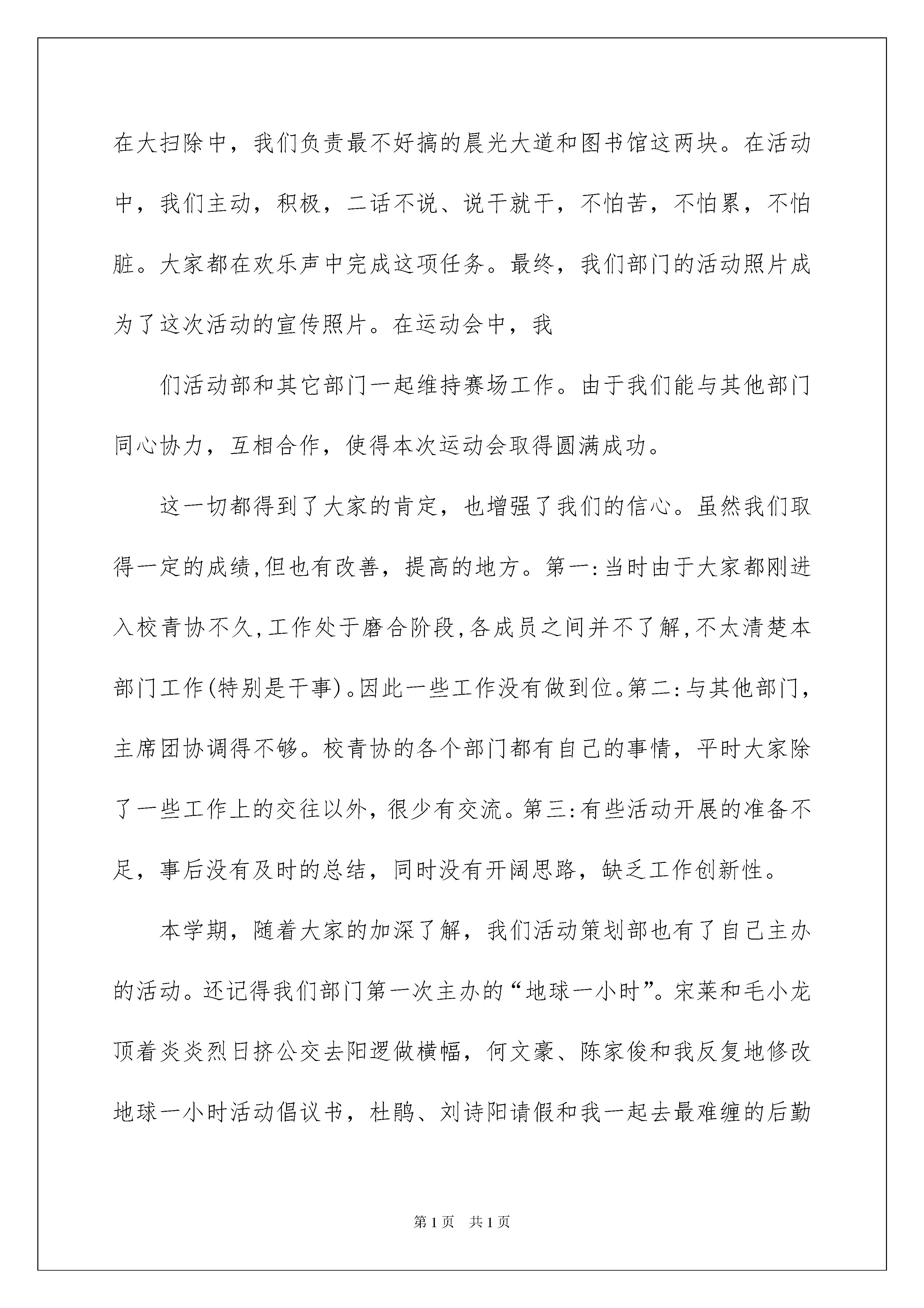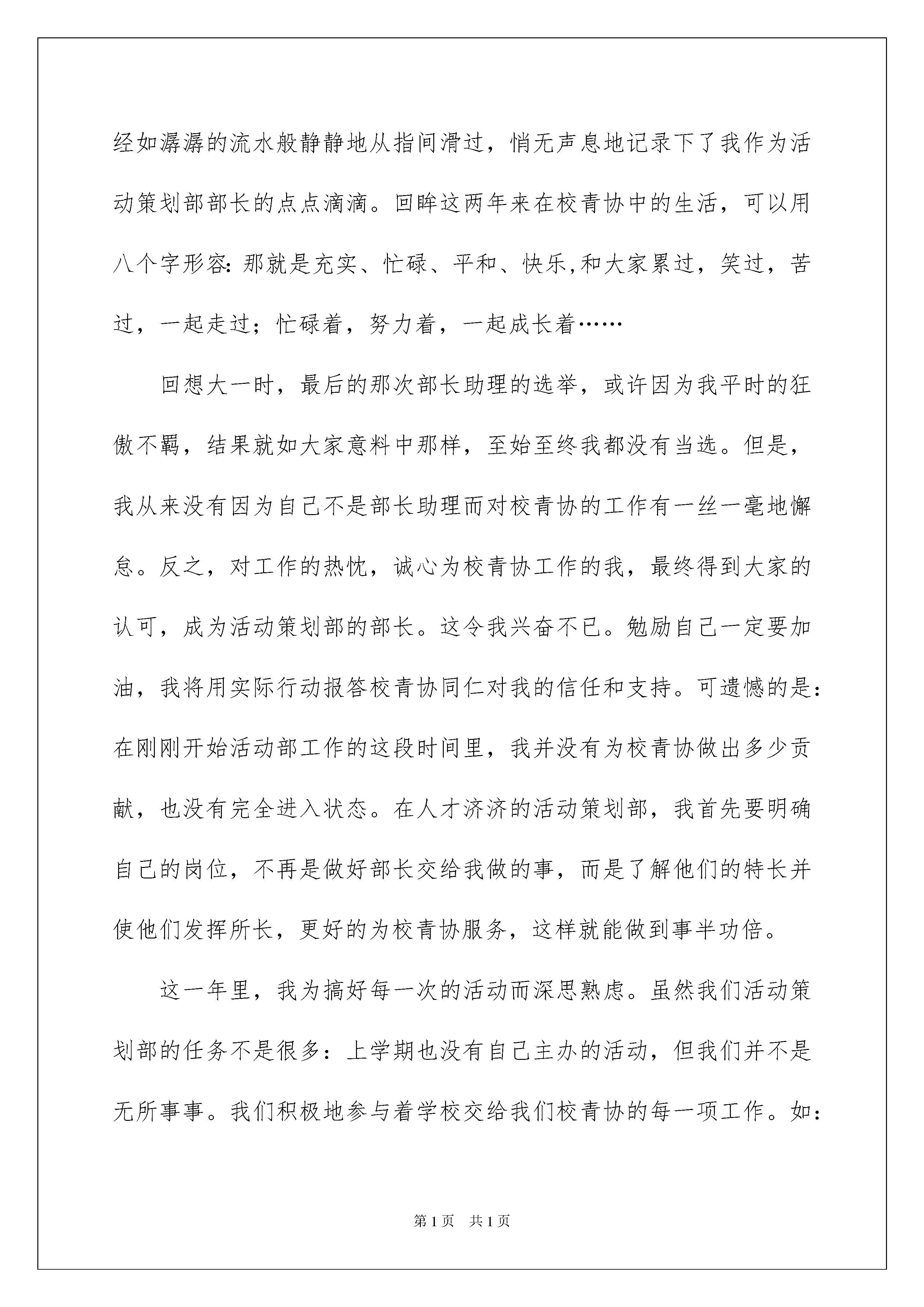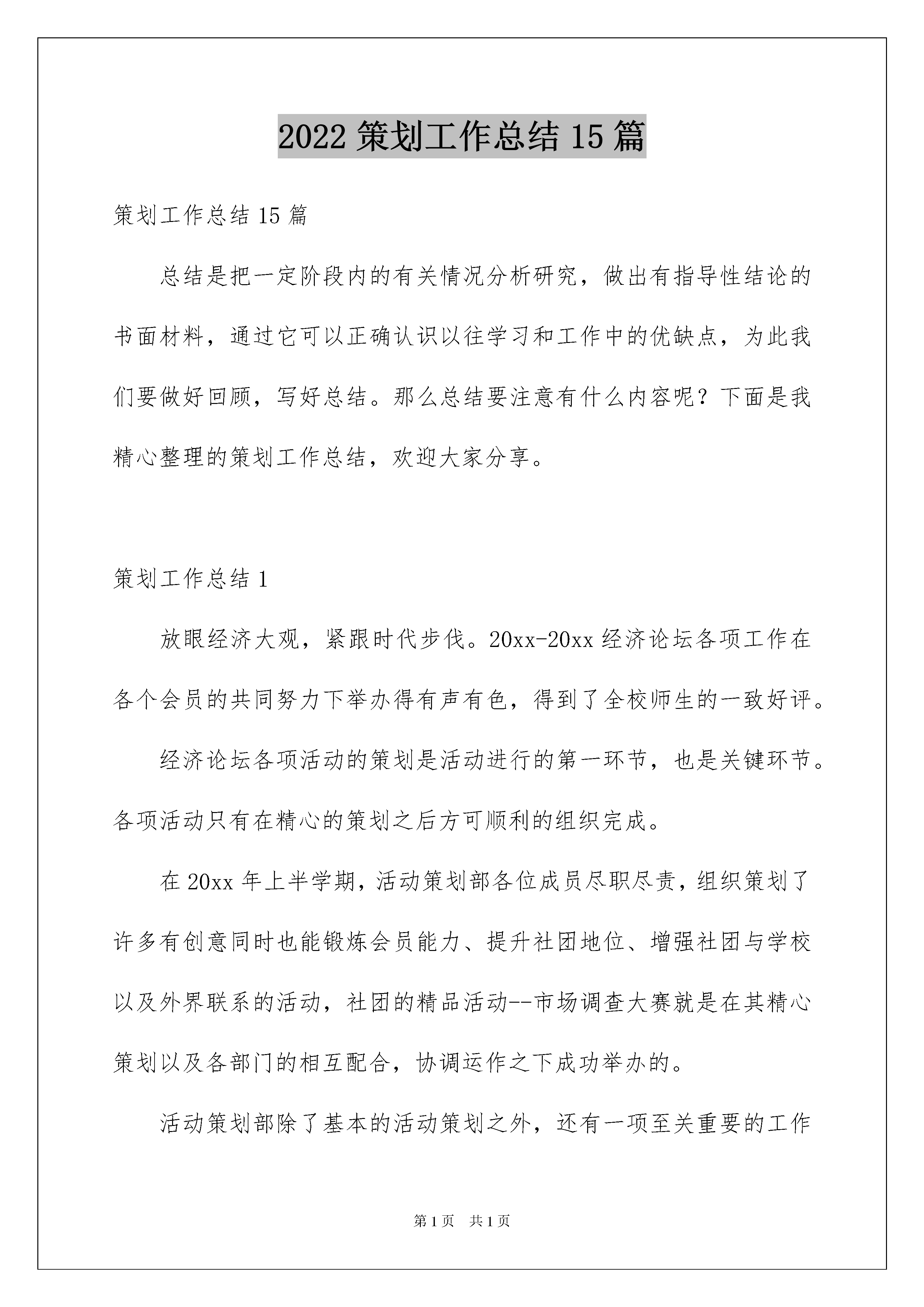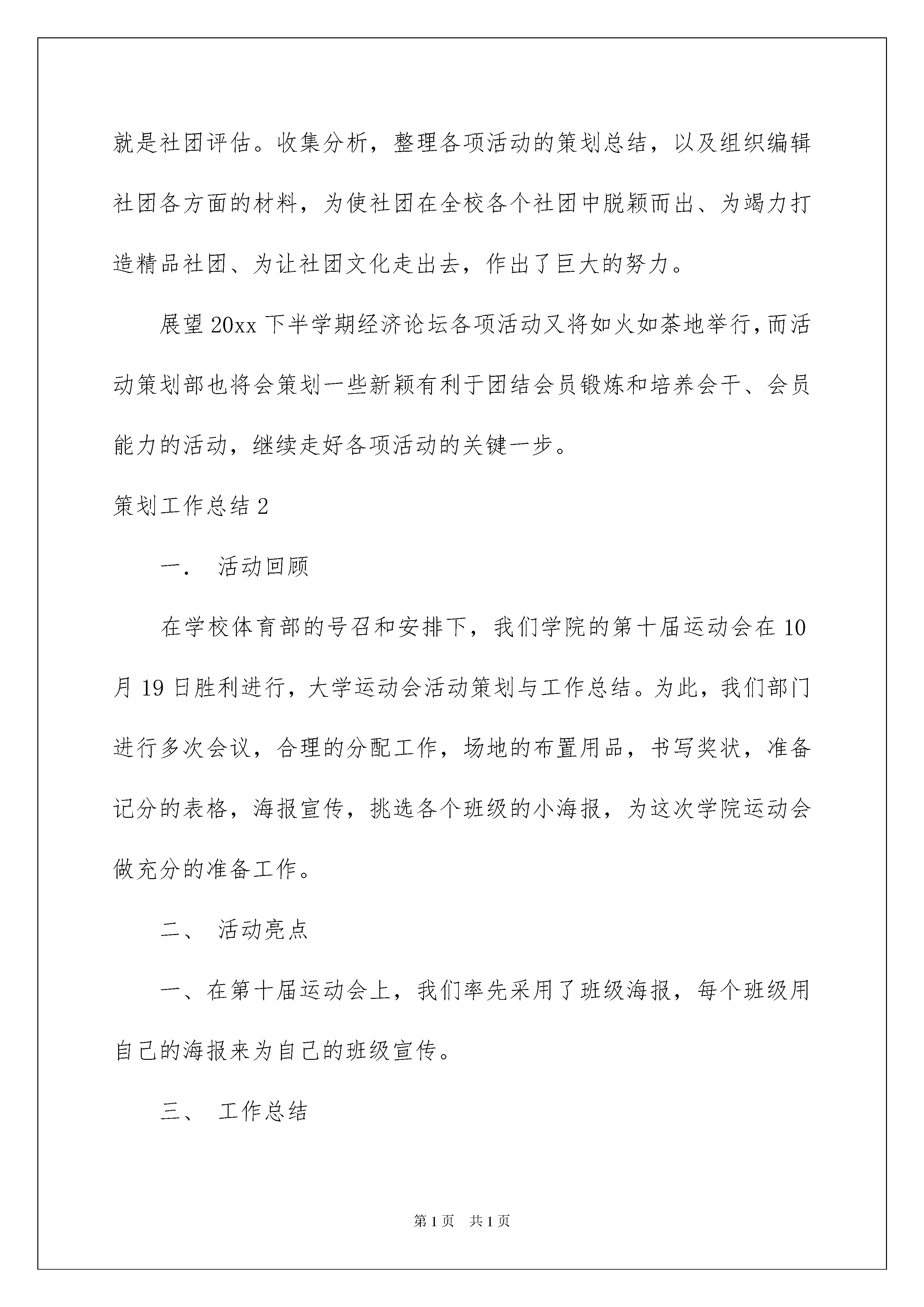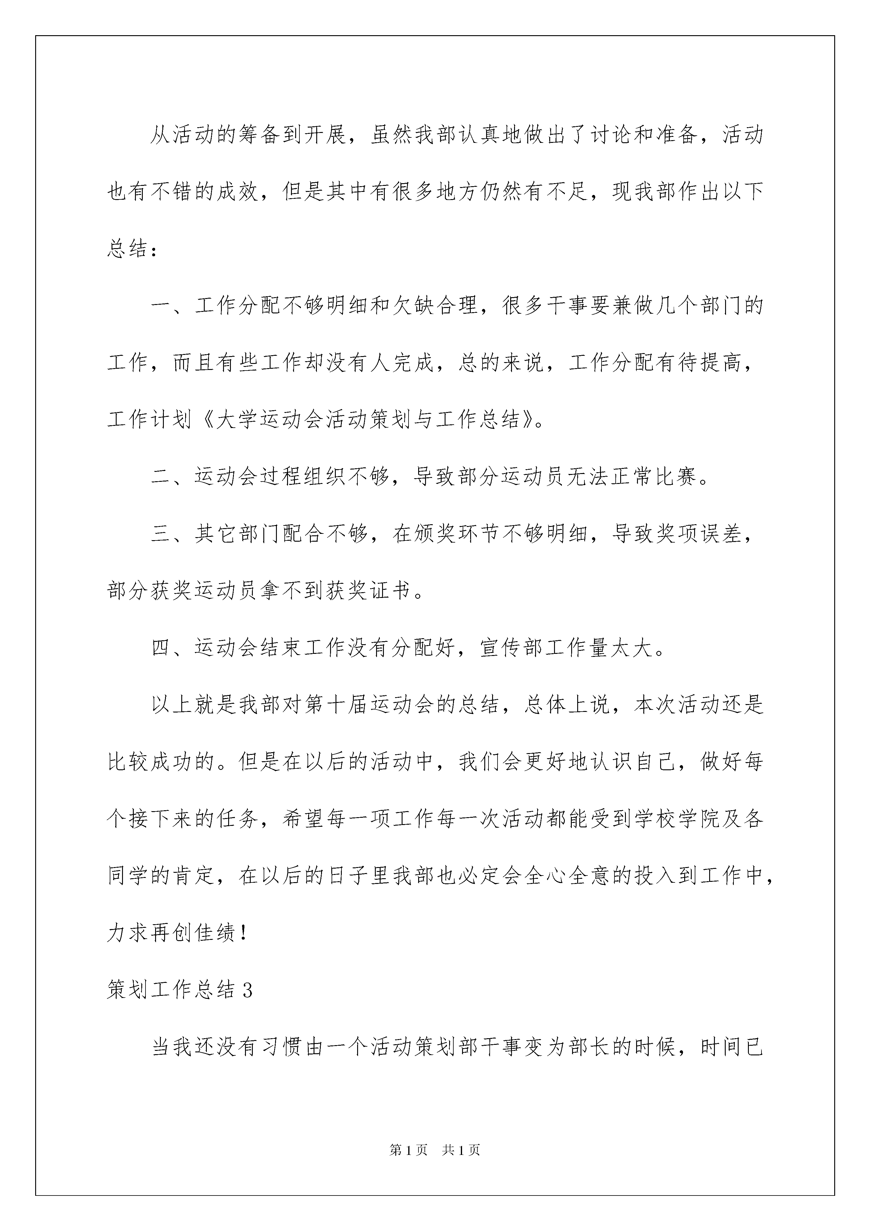 2022策划工作总结15篇策划工作总结15篇总结是把一定阶段内的有关情况分析研究,做出有指导性结论的书面材料,通过它可以正确认识以往学习和工作中的优缺点,为此我们要做好回顾,写好总结。那么总结要注意有什么内容呢?下面是我精心整理的策划工作总结,欢迎大家分享。策划工作总结1放眼经济大观,紧跟时代步伐。20xx-20xx经济论坛各项工作在各个会员的共同努力下举办得有声有色,得到了全校师生的一致好评。经济论坛各项活动的策划是活动进行的第一环节,也是关键环节。各项活动只有在精心的策划之后方可顺利的组织完成。在20xx年上半学期,活动策划部各位成员尽职尽责,组织策划了许多有创意同时也能锻炼会员能力、提升社团地位、增强社团与学校以及外界联系的活动,社团的精品活动--市场调查大赛就是在其精心策划以及各部门的相互配合,协调运作之下成功举办的。活动策划部除了基本的活动策划之外,还有一项至关重要的工作就是社团评估。收集分析,整理各项活动的策划总结,以及组织编辑社团各方面的材料,为使社团在全校各个社团中脱颖而出、为竭力打造精品社团、为让社团文化走出去,作出了巨大的努力。展望20xx下半学期经济论坛各项活动又将如火如荼地举行,而活动策划部也将会策划一些新颖有利于团结会员锻炼和培养会干、会员能力的活动,继续走好各项活动的关键一步。策划工作总结2一.活动回顾在学校体育部的号召和安排下,我们学院的第十届运动会在10月19日胜利进行,大学运动会活动策划与工作总结。为此,我们部门进行多次会议,合理的分配工作,场地的布置用品,书写奖状,准备记分的表格,海报宣传,挑选各个班级的小海报,为这次学院运动会做充分的准备工作。二、活动亮点一、在第十届运动会上,我们率先采用了班级海报,每个班级用自己的海报来为自己的班级宣传。三、工作总结从活动的筹备到开展,虽然我部认真地做出了讨论和准备,活动也有不错的成效,但是其中有很多地方仍然有不足,现我部作出以下总结:一、工作分配不够明细和欠缺合理,很多干事要兼做几个部门的工作,而且有些工作却没有人完成,总的来说,工作分配有待提高,工作计划《大学运动会活动策划与工作总结》。二、运动会过程组织不够,导致部分运动员无法正常比赛。三、其它部门配合不够,在颁奖环节不够明细,导致奖项误差,部分获奖运动员拿不到获奖证书。四、运动会结束工作没有分配好,宣传部工作量太大。以上就是我部对第十届运动会的总结,总体上说,本次活动还是比较成功的。但是在以后的活动中,我们会更好地认识自己,做好每个接下来的任务,希望每一项工作每一次活动都能受到学校学院及各同学的肯定,在以后的日子里我部也必定会全心全意的投入到工作中,力求再创佳绩!策划工作总结3当我还没有习惯由一个活动策划部干事变为部长的时候,时间已经如潺潺的流水般静静地从指间滑过,悄无声息地记录下了我作为活动策划部部长的点点滴滴。回眸这两年来在校青协中的生活,可以用八个字形容:那就是充实、忙碌、平和、快乐,和大家累过,笑过,苦过,一起走过;忙碌着,努力着,一起成长着……回想大一时,最后的那次部长助理的选举,或许因为我平时的狂傲不羁,结果就如大家意料中那样,至始至终我都没有当选。但是,我从来没有因为自己不是部长助理而对校青协的工作有一丝一毫地懈怠。反之,对工作的热忱,诚心为校青协工作的我,最终得到大家的认可,成为活动策划部的部长。这令我兴奋不已。勉励自己一定要加油,我将用实际行动报答校青协同仁对我的信任和支持。可遗憾的是:在刚刚开始活动部工作的这段时间里,我并没有为校青协做出多少贡献,也没有完全进入状态。在人才济济的活动策划部,我首先要明确自己的岗位,不再是做好部长交给我做的事,而是了解他们的特长并使他们发挥所长,更好的为校青协服务,这样就能做到事半功倍。这一年里,我为搞好每一次的活动而深思熟虑。虽然我们活动策划部的任务不是很多:上学期也没有自己主办的活动,但我们并不是无所事事。我们积极地参与着学校交给我们校青协的每一项工作。如:在大扫除中,我们负责最不好搞的晨光大道和图书馆这两块。在活动中,我们主动,积极,二话不说、说干就干,不怕苦,不怕累,不怕脏。大家都在欢乐声中完成这项任务。最终,我们部门的活动照片成为了这次活动的宣传照片。在运动会中,我们活动部和其它部门一起维持赛场工作。由于我们能与其他部门同心协力,互相合作,使得本次运动会取得圆满成功。这一切都得到了大家的肯定,也增强了我们的信心。虽然我们取得一定的成绩,但也有改善,提高的地方。第一:当时由于大家都刚进入校青协不久,工作处于磨合阶段,各成员之间并不了解,不太清楚本部门工作(特别是干事)。因此一些工作没