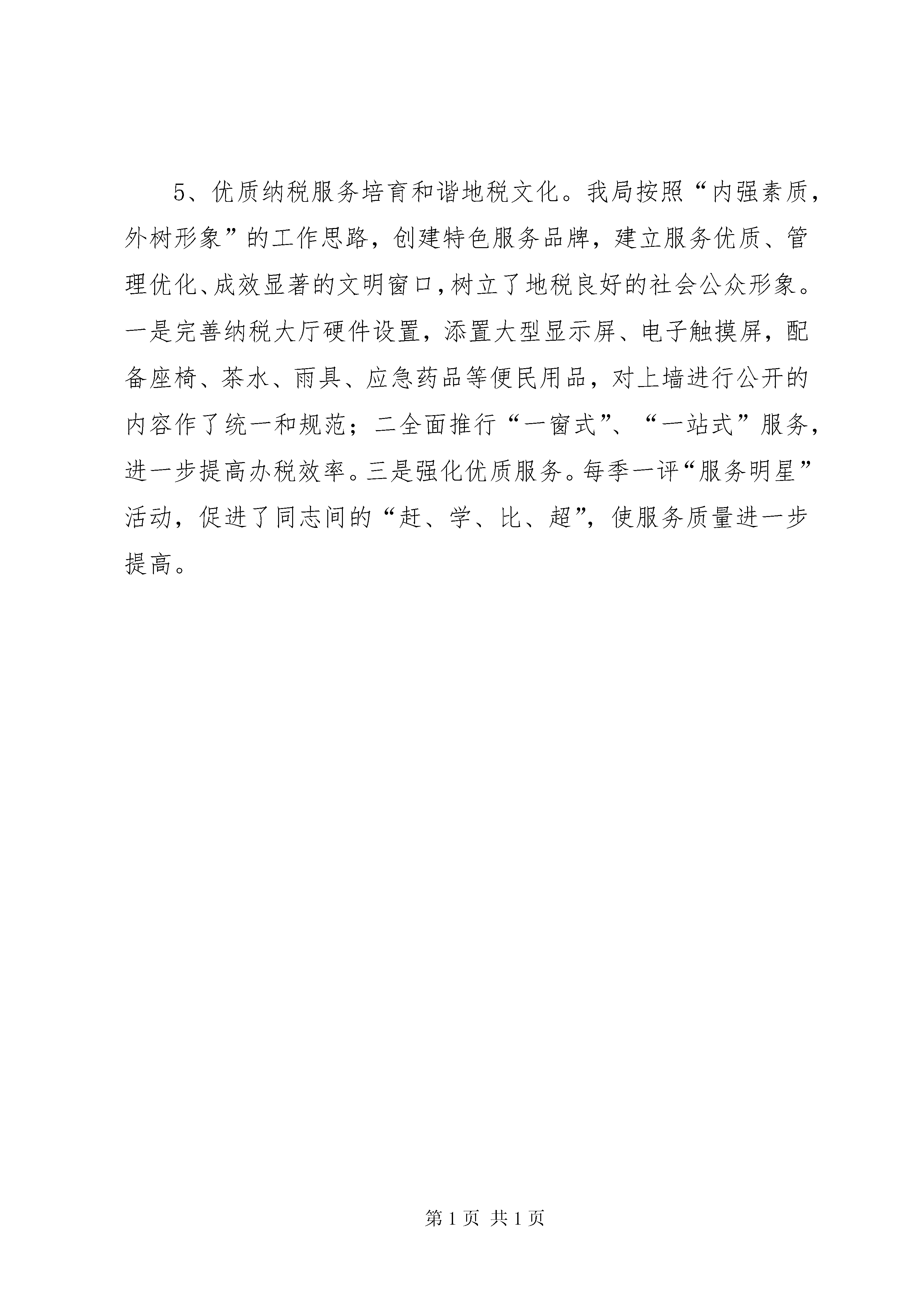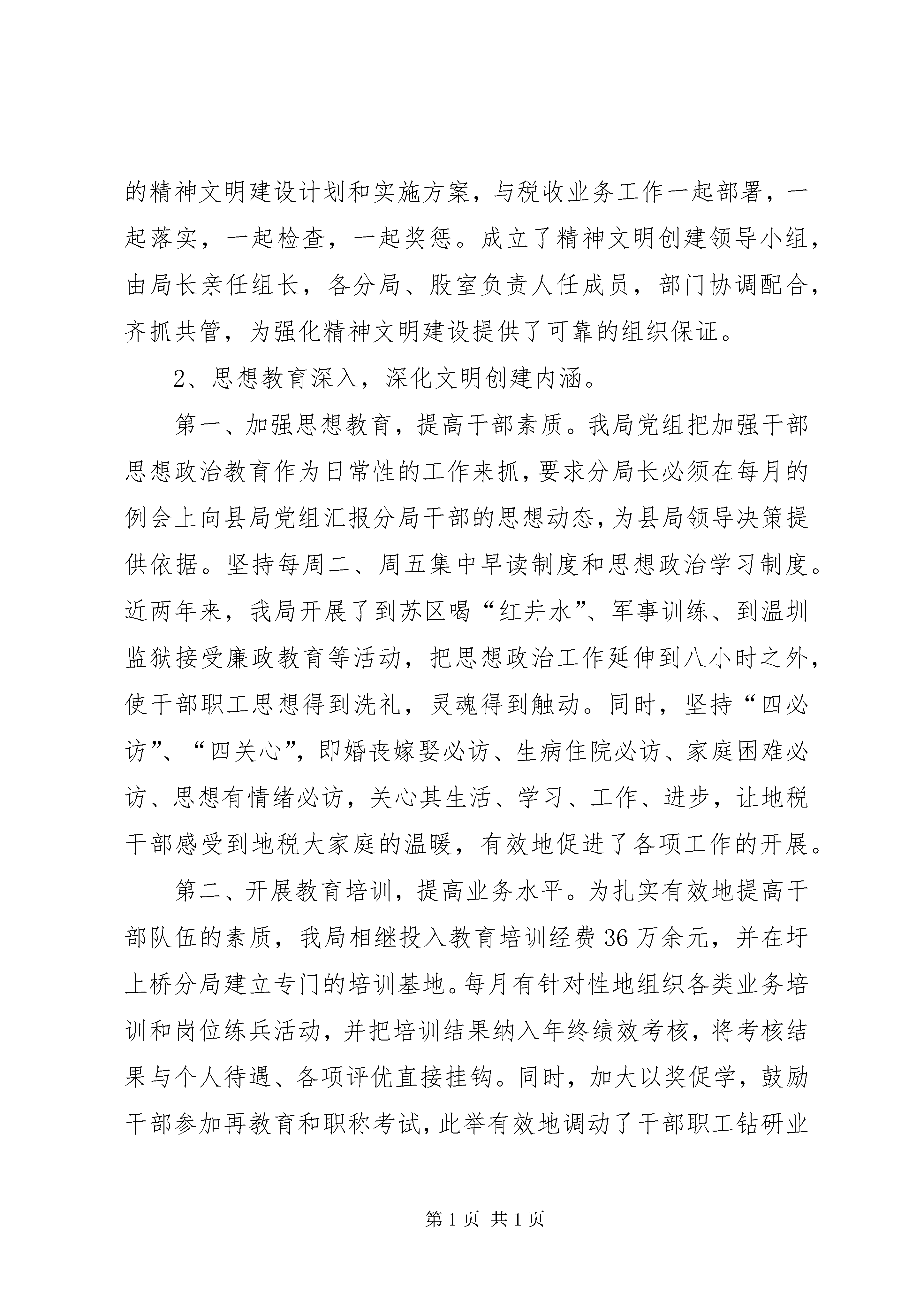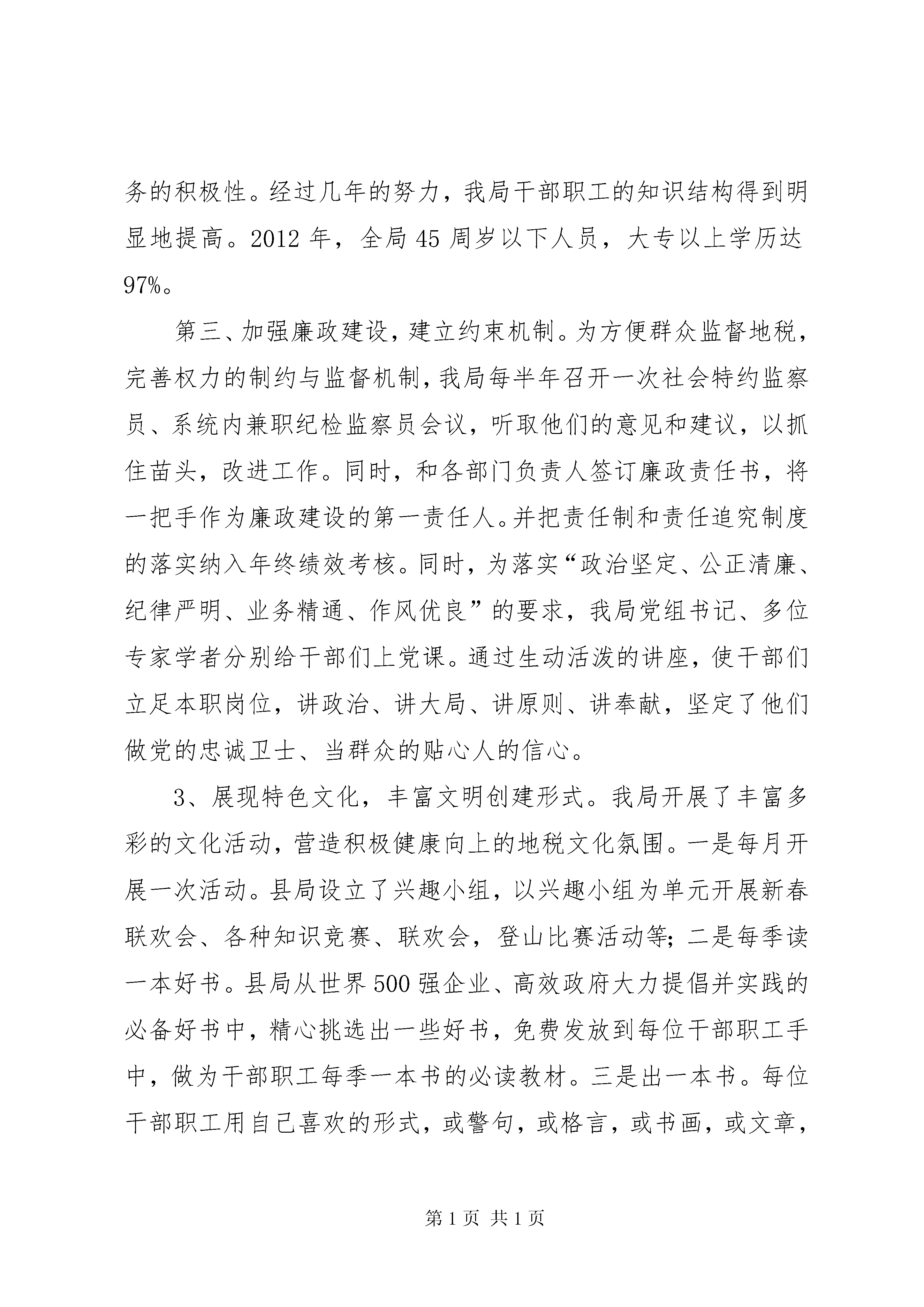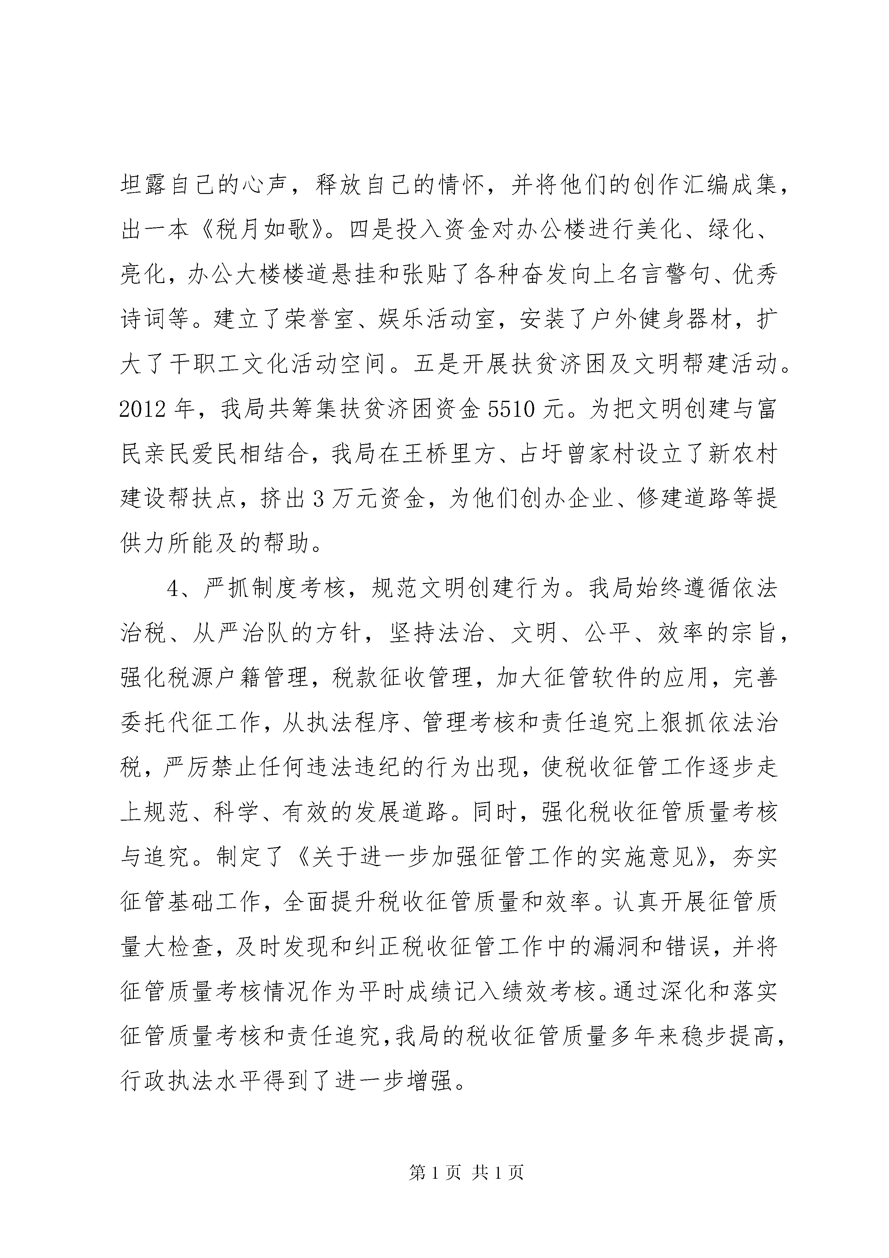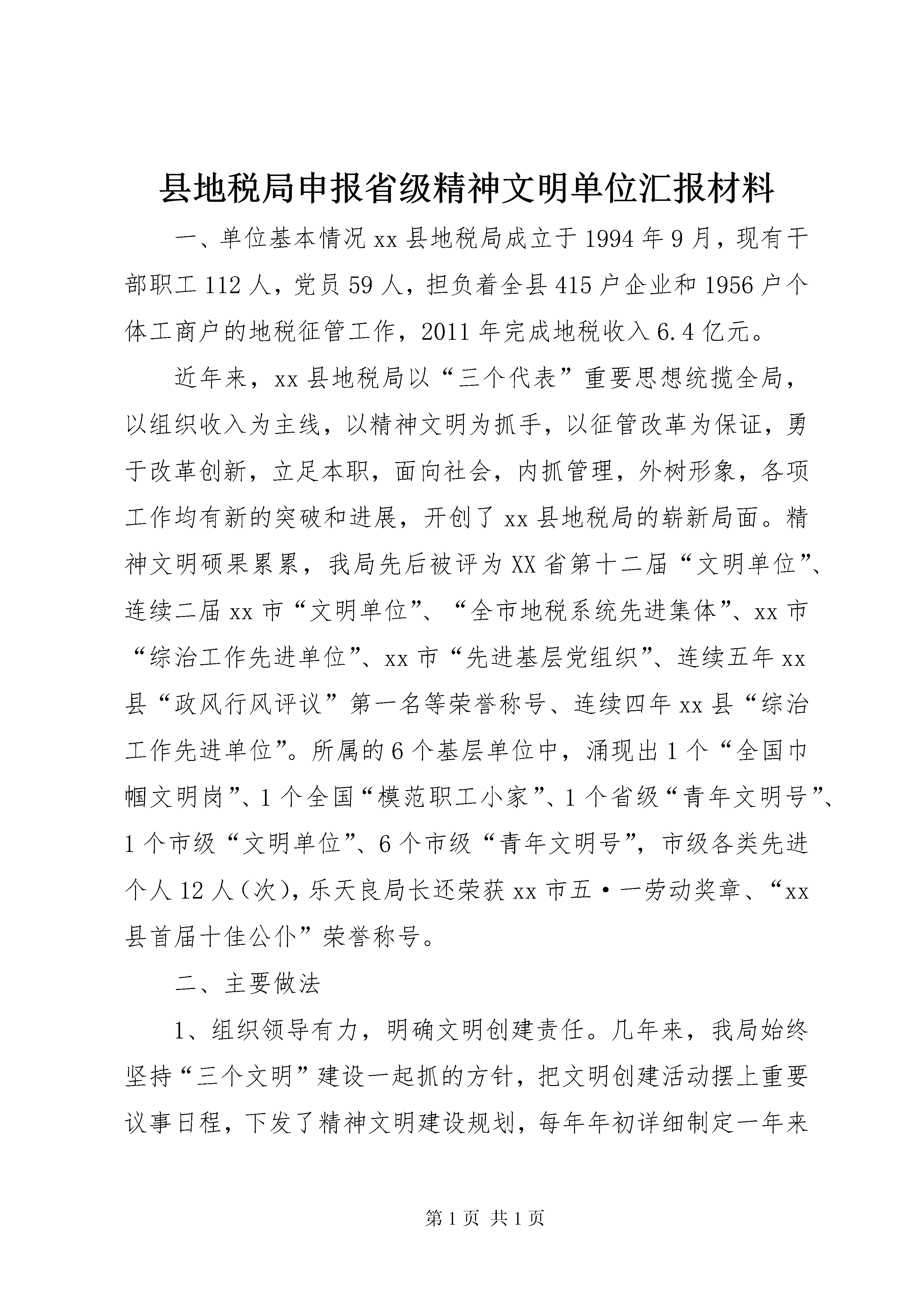 县地税局申报省级精神文明单位汇报材料一、单位基本情况xx县地税局成立于1994年9月,现有干部职工112人,党员59人,担负着全县415户企业和1956户个体工商户的地税征管工作,2011年完成地税收入6.4亿元。近年来,xx县地税局以“三个代表”重要思想统揽全局,以组织收入为主线,以精神文明为抓手,以征管改革为保证,勇于改革创新,立足本职,面向社会,内抓管理,外树形象,各项工作均有新的突破和进展,开创了xx县地税局的崭新局面。精神文明硕果累累,我局先后被评为XX省第十二届“文明单位”、连续二届xx市“文明单位”、“全市地税系统先进集体”、xx市“综治工作先进单位”、xx市“先进基层党组织”、连续五年xx县“政风行风评议”第一名等荣誉称号、连续四年xx县“综治工作先进单位”。所属的6个基层单位中,涌现出1个“全国巾帼文明岗”、1个全国“模范职工小家”、1个省级“青年文明号”、1个市级“文明单位”、6个市级“青年文明号”,市级各类先进个人12人(次),乐天良局长还荣获xx市五·一劳动奖章、“xx县首届十佳公仆”荣誉称号。二、主要做法1、组织领导有力,明确文明创建责任。几年来,我局始终坚持“三个文明”建设一起抓的方针,把文明创建活动摆上重要议事日程,下发了精神文明建设规划,每年年初详细制定一年来的精神文明建设计划和实施方案,与税收业务工作一起部署,一起落实,一起检查,一起奖惩。成立了精神文明创建领导小组,由局长亲任组长,各分局、股室负责人任成员,部门协调配合,齐抓共管,为强化精神文明建设提供了可靠的组织保证。2、思想教育深入,深化文明创建内涵。第一、加强思想教育,提高干部素质。我局党组把加强干部思想政治教育作为日常性的工作来抓,要求分局长必须在每月的例会上向县局党组汇报分局干部的思想动态,为县局领导决策提供依据。坚持每周二、周五集中早读制度和思想政治学习制度。近两年来,我局开展了到苏区喝“红井水”、军事训练、到温圳监狱接受廉政教育等活动,把思想政治工作延伸到八小时之外,使干部职工思想得到洗礼,灵魂得到触动。同时,坚持“四必访”、“四关心”,即婚丧嫁娶必访、生病住院必访、家庭困难必访、思想有情绪必访,关心其生活、学习、工作、进步,让地税干部感受到地税大家庭的温暖,有效地促进了各项工作的开展。第二、开展教育培训,提高业务水平。为扎实有效地提高干部队伍的素质,我局相继投入教育培训经费36万余元,并在圩上桥分局建立专门的培训基地。每月有针对性地组织各类业务培训和岗位练兵活动,并把培训结果纳入年终绩效考核,将考核结果与个人待遇、各项评优直接挂钩。同时,加大以奖促学,鼓励干部参加再教育和职称考试,此举有效地调动了干部职工钻研业务的积极性。经过几年的努力,我局干部职工的知识结构得到明显地提高。2012年,全局45周岁以下人员,大专以上学历达97%。第三、加强廉政建设,建立约束机制。为方便群众监督地税,完善权力的制约与监督机制,我局每半年召开一次社会特约监察员、系统内兼职纪检监察员会议,听取他们的意见和建议,以抓住苗头,改进工作。同时,和各部门负责人签订廉政责任书,将一把手作为廉政建设的第一责任人。并把责任制和责任追究制度的落实纳入年终绩效考核。同时,为落实“政治坚定、公正清廉、纪律严明、业务精通、作风优良”的要求,我局党组书记、多位专家学者分别给干部们上党课。通过生动活泼的讲座,使干部们立足本职岗位,讲政治、讲大局、讲原则、讲奉献,坚定了他们做党的忠诚卫士、当群众的贴心人的信心。3、展现特色文化,丰富文明创建形式。我局开展了丰富多彩的文化活动,营造积极健康向上的地税文化氛围。一是每月开展一次活动。县局设立了兴趣小组,以兴趣小组为单元开展新春联欢会、各种知识竞赛、联欢会,登山比赛活动等;二是每季读一本好书。县局从世界500强企业、高效政府大力提倡并实践的必备好书中,精心挑选出一些好书,免费发放到每位干部职工手中,做为干部职工每季一本书的必读教材。三是出一本书。每位干部职工用自己喜欢的形式,或警句,或格言,或书画,或文章,坦露自己的心声,释放自己的情怀,并将他们的创作汇编成集,出一本《税月如歌》。四是投入资金对办公楼进行美化、绿化、亮化,办公大楼楼道悬挂和张贴了各种奋发向上名言警句、优秀诗词等。建立了荣誉室、娱乐活动室,安装了户外健身器材,扩大了干职工文化活动空间。五是开展扶贫济困及文明帮建活动。2012年,我局共筹集扶贫济困资金5510元。为把文明创建与富民亲民爱民相结合,我局在王桥里方、占圩曾家村设立了新农村建设帮扶点,挤出3万元资金,为他们创办企业、修建道路等提供力所能及的帮助。4、严抓制度考核,规范文明创建行为。我局始终遵循依法治税、从严治队的方针,坚持法治、文明、公平、效率的宗旨,强化税源户籍管理,税款征收管理,