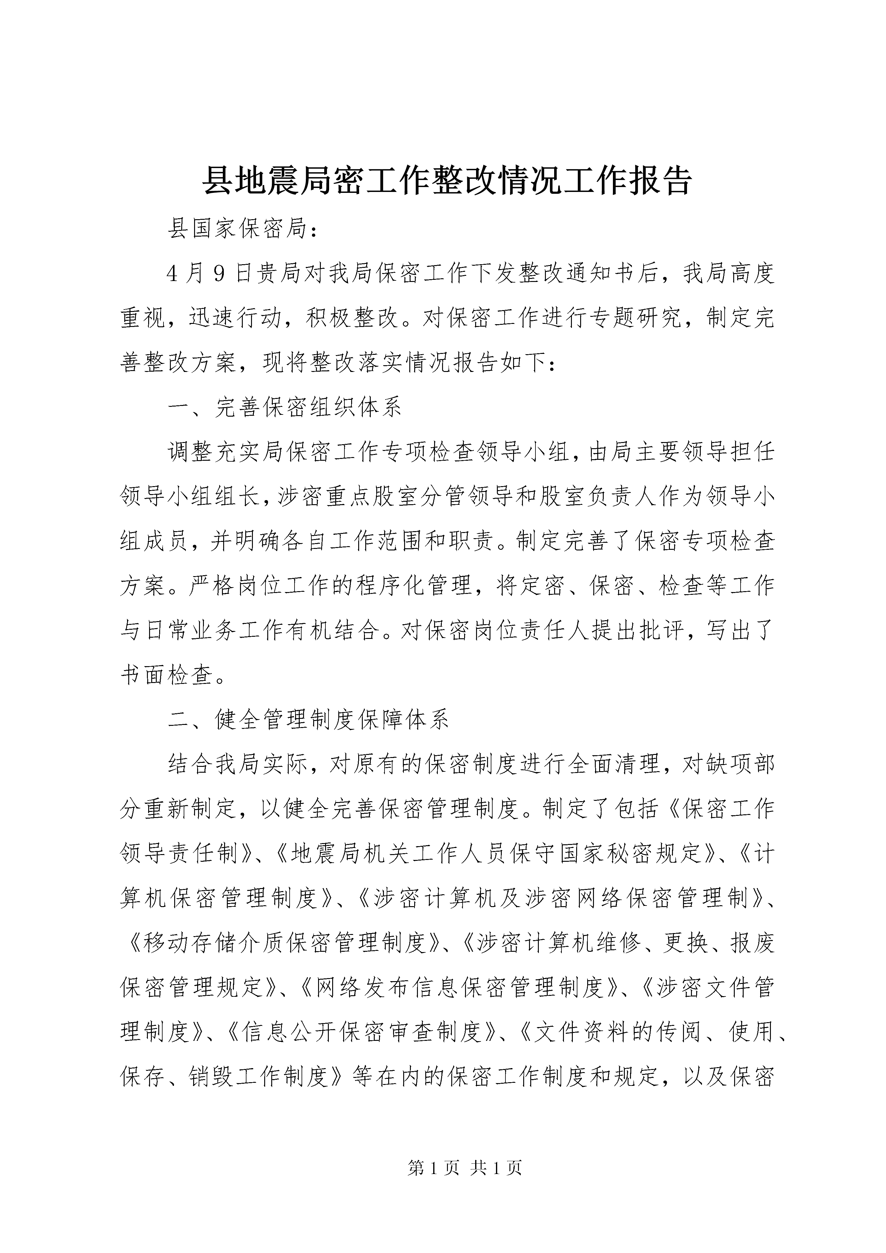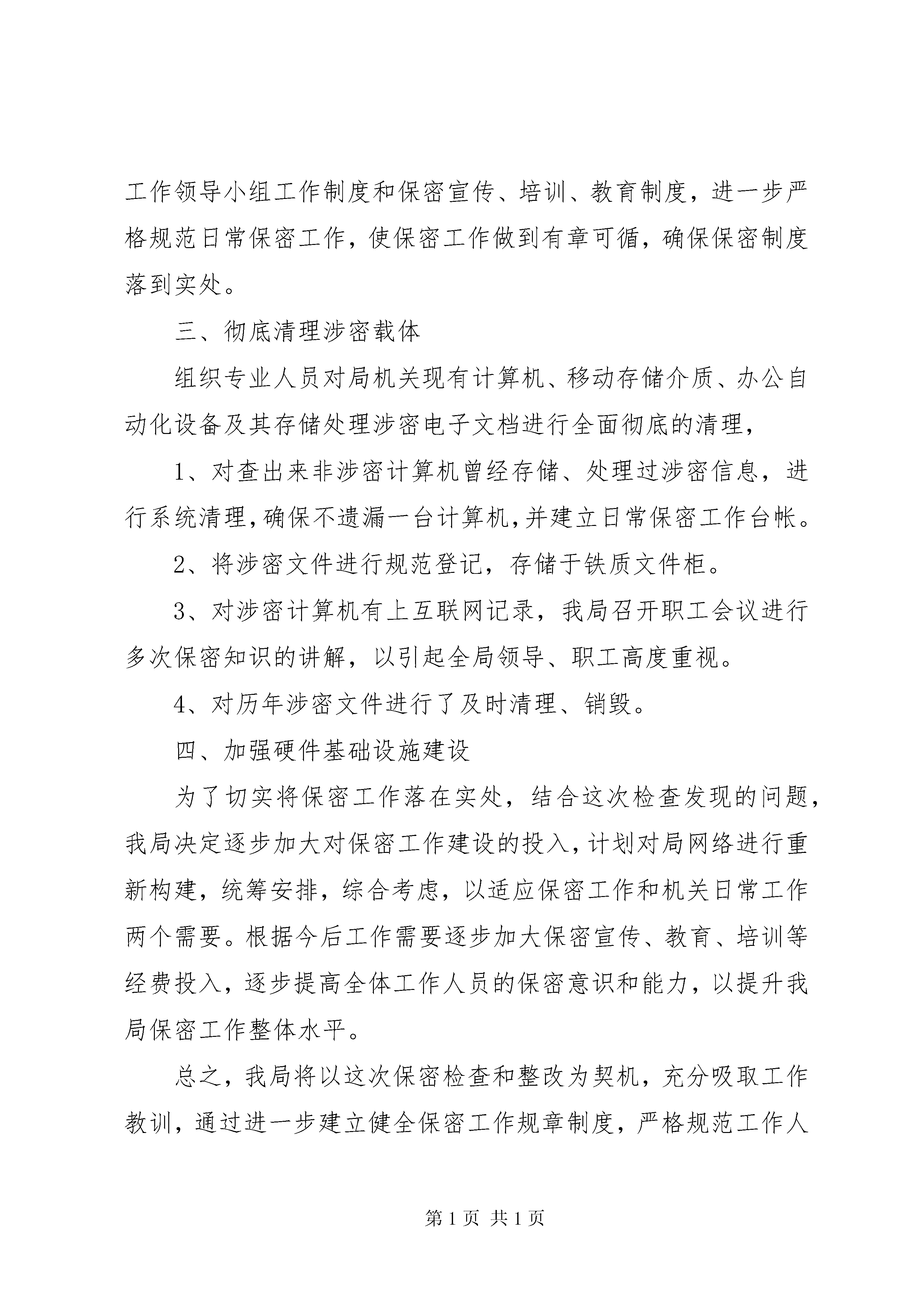 县地震局密工作整改情况工作报告县国家保密局:4月9日贵局对我局保密工作下发整改通知书后,我局高度重视,迅速行动,积极整改。对保密工作进行专题研究,制定完善整改方案,现将整改落实情况报告如下:一、完善保密组织体系调整充实局保密工作专项检查领导小组,由局主要领导担任领导小组组长,涉密重点股室分管领导和股室负责人作为领导小组成员,并明确各自工作范围和职责。制定完善了保密专项检查方案。严格岗位工作的程序化管理,将定密、保密、检查等工作与日常业务工作有机结合。对保密岗位责任人提出批评,写出了书面检查。二、健全管理制度保障体系结合我局实际,对原有的保密制度进行全面清理,对缺项部分重新制定,以健全完善保密管理制度。制定了包括《保密工作领导责任制》、《地震局机关工作人员保守国家秘密规定》、《计算机保密管理制度》、《涉密计算机及涉密网络保密管理制》、《移动存储介质保密管理制度》、《涉密计算机维修、更换、报废保密管理规定》、《网络发布信息保密管理制度》、《涉密文件管理制度》、《信息公开保密审查制度》、《文件资料的传阅、使用、保存、销毁工作制度》等在内的保密工作制度和规定,以及保密工作领导小组工作制度和保密宣传、培训、教育制度,进一步严格规范日常保密工作,使保密工作做到有章可循,确保保密制度落到实处。三、彻底清理涉密载体组织专业人员对局机关现有计算机、移动存储介质、办公自动化设备及其存储处理涉密电子文档进行全面彻底的清理,1、对查出来非涉密计算机曾经存储、处理过涉密信息,进行系统清理,确保不遗漏一台计算机,并建立日常保密工作台帐。2、将涉密文件进行规范登记,存储于铁质文件柜。3、对涉密计算机有上互联网记录,我局召开职工会议进行多次保密知识的讲解,以引起全局领导、职工高度重视。4、对历年涉密文件进行了及时清理、销毁。四、加强硬件基础设施建设为了切实将保密工作落在实处,结合这次检查发现的问题,我局决定逐步加大对保密工作建设的投入,计划对局网络进行重新构建,统筹安排,综合考虑,以适应保密工作和机关日常工作两个需要。根据今后工作需要逐步加大保密宣传、教育、培训等经费投入,逐步提高全体工作人员的保密意识和能力,以提升我局保密工作整体水平。总之,我局将以这次保密检查和整改为契机,充分吸取工作教训,通过进一步建立健全保密工作规章制度,严格规范工作人员保密行为,不断强化工作人员保密意识,努力提高保密工作软硬件保障水平,切实将保密工作落实到各项工作的实际中去。