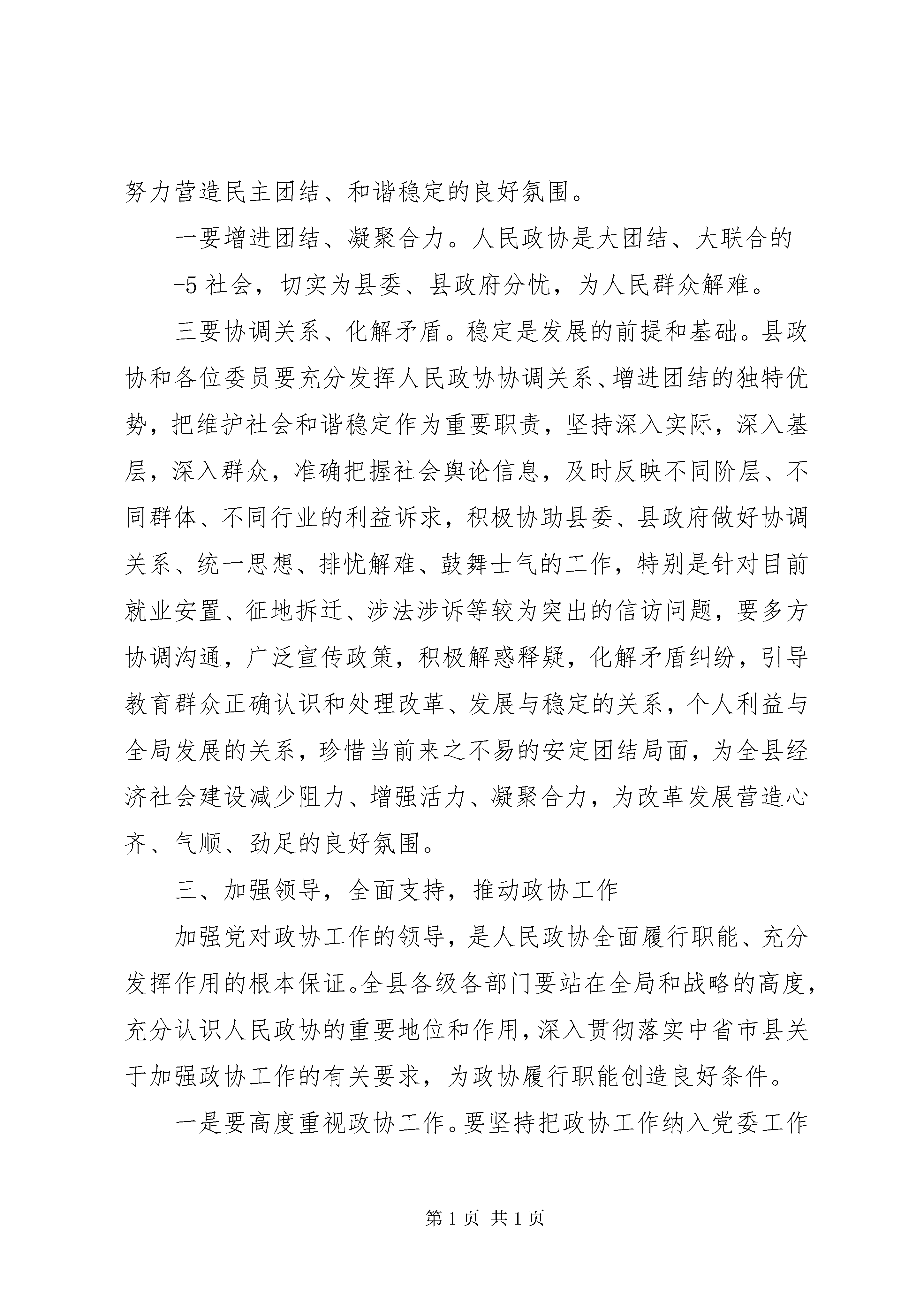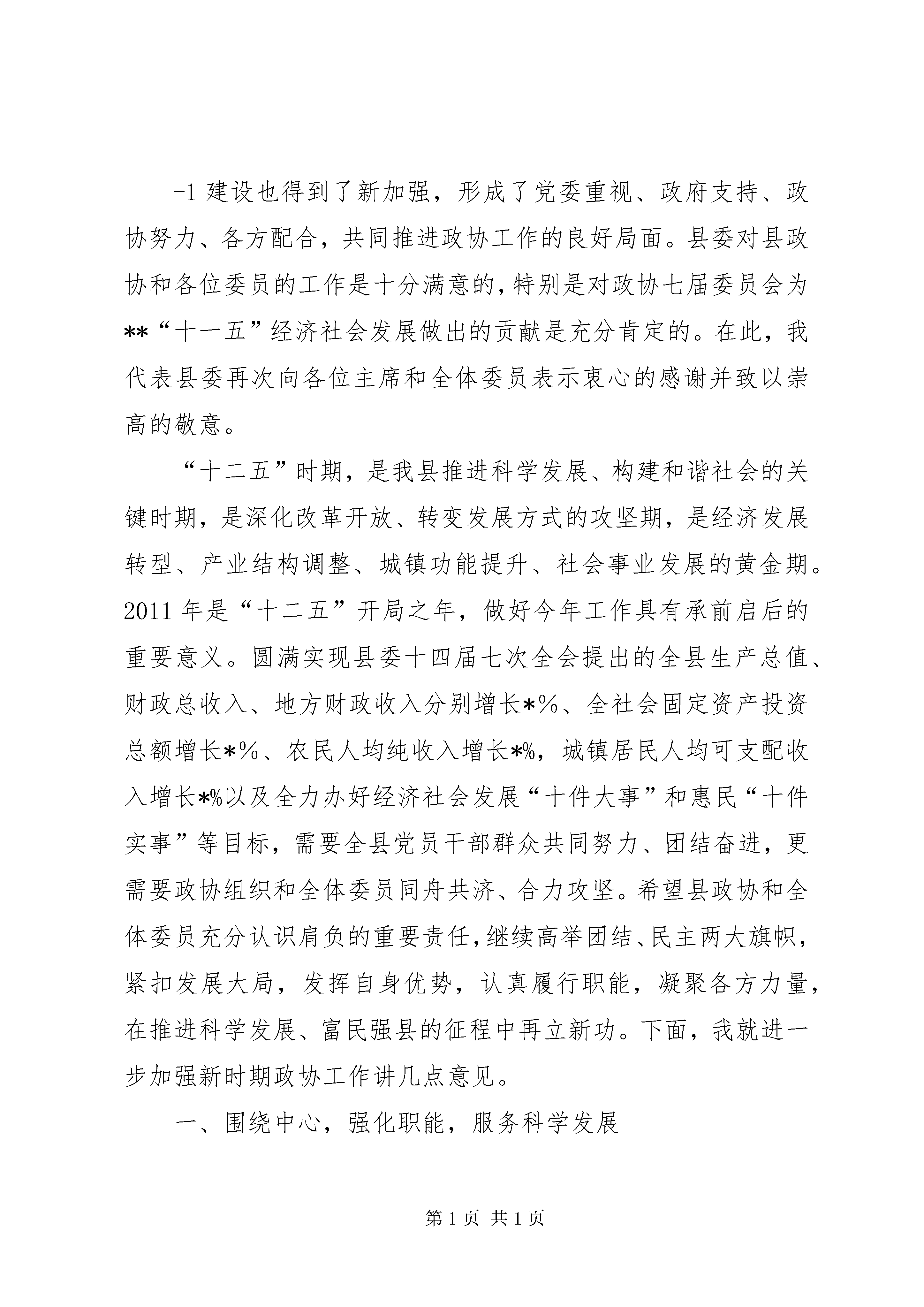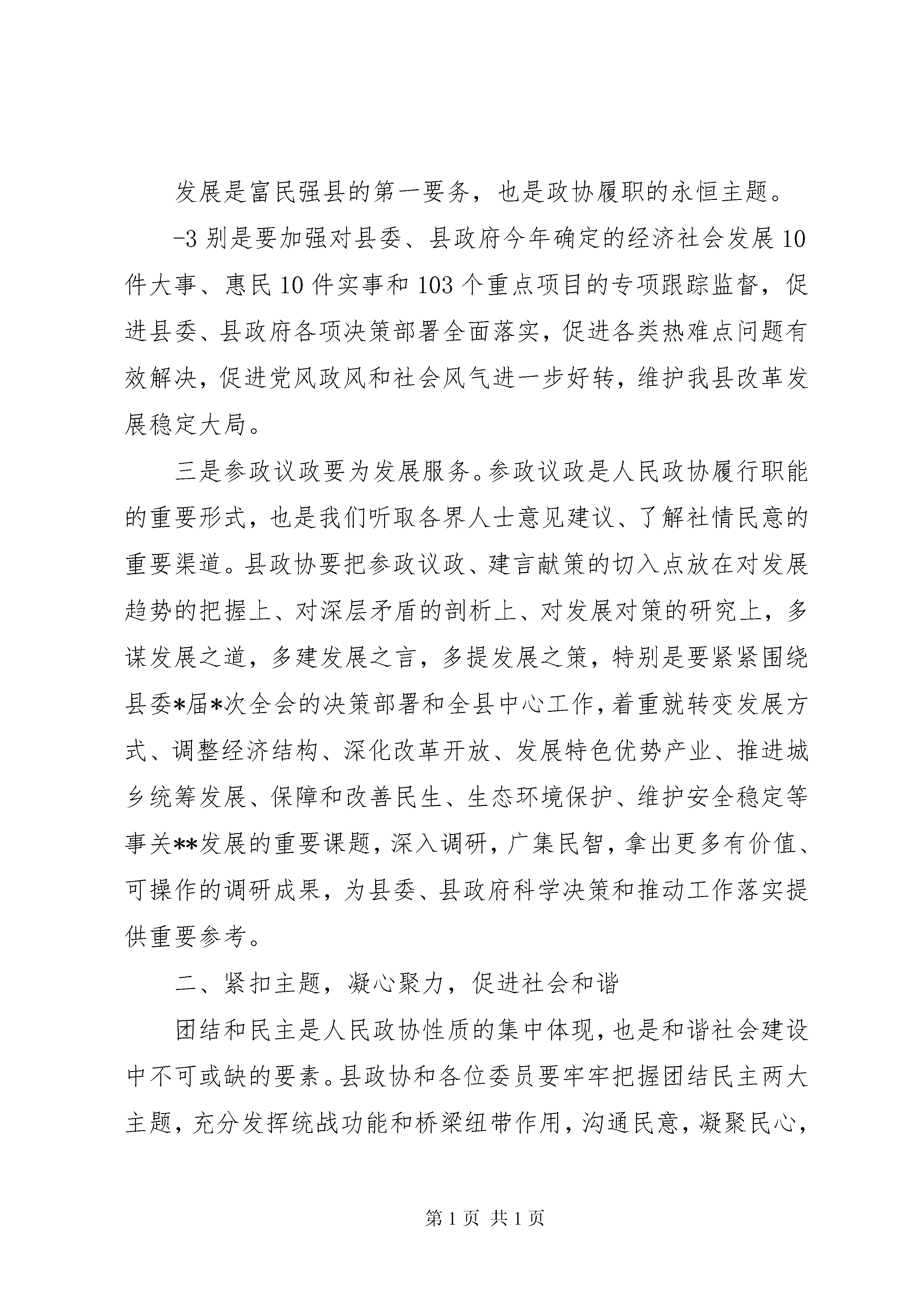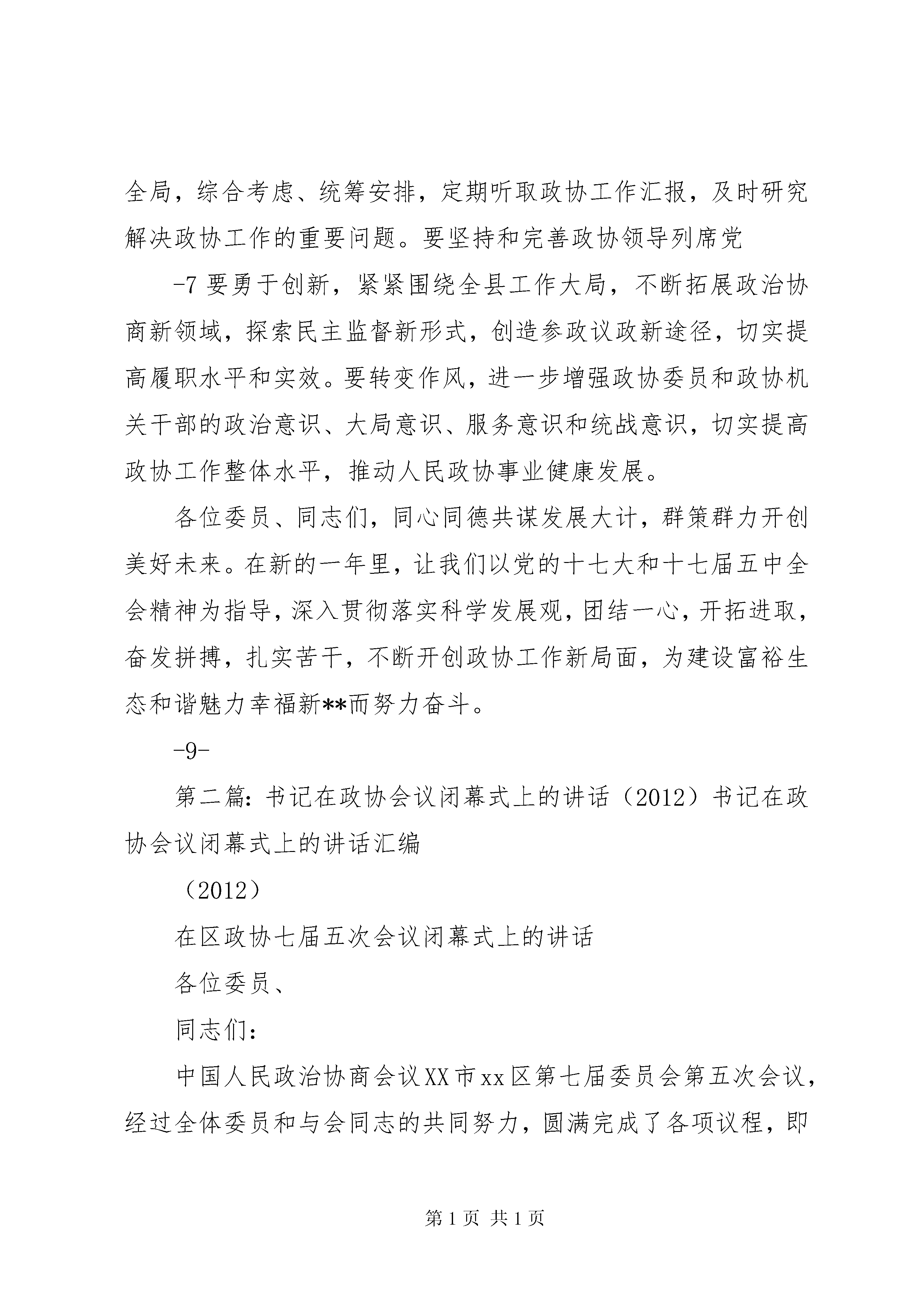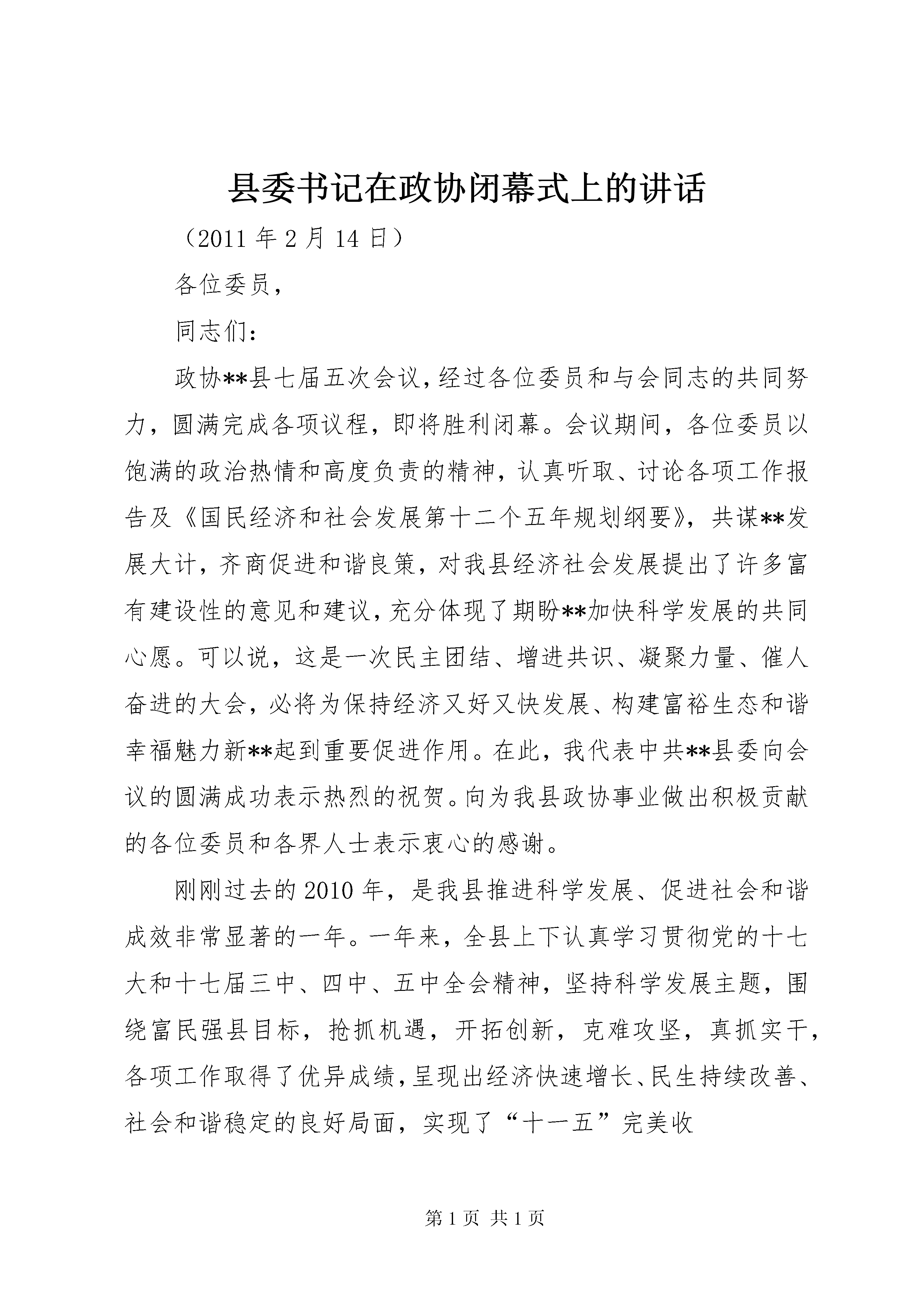 县委书记在政协闭幕式上的讲话(2011年2月14日)各位委员,同志们:政协**县七届五次会议,经过各位委员和与会同志的共同努力,圆满完成各项议程,即将胜利闭幕。会议期间,各位委员以饱满的政治热情和高度负责的精神,认真听取、讨论各项工作报告及《国民经济和社会发展第十二个五年规划纲要》,共谋**发展大计,齐商促进和谐良策,对我县经济社会发展提出了许多富有建设性的意见和建议,充分体现了期盼**加快科学发展的共同心愿。可以说,这是一次民主团结、增进共识、凝聚力量、催人奋进的大会,必将为保持经济又好又快发展、构建富裕生态和谐幸福魅力新**起到重要促进作用。在此,我代表中共**县委向会议的圆满成功表示热烈的祝贺。向为我县政协事业做出积极贡献的各位委员和各界人士表示衷心的感谢。刚刚过去的2010年,是我县推进科学发展、促进社会和谐成效非常显著的一年。一年来,全县上下认真学习贯彻党的十七大和十七届三中、四中、五中全会精神,坚持科学发展主题,围绕富民强县目标,抢抓机遇,开拓创新,克难攻坚,真抓实干,各项工作取得了优异成绩,呈现出经济快速增长、民生持续改善、社会和谐稳定的良好局面,实现了“十一五”完美收-1建设也得到了新加强,形成了党委重视、政府支持、政协努力、各方配合,共同推进政协工作的良好局面。县委对县政协和各位委员的工作是十分满意的,特别是对政协七届委员会为**“十一五”经济社会发展做出的贡献是充分肯定的。在此,我代表县委再次向各位主席和全体委员表示衷心的感谢并致以崇高的敬意。“十二五”时期,是我县推进科学发展、构建和谐社会的关键时期,是深化改革开放、转变发展方式的攻坚期,是经济发展转型、产业结构调整、城镇功能提升、社会事业发展的黄金期。2011年是“十二五”开局之年,做好今年工作具有承前启后的重要意义。圆满实现县委十四届七次全会提出的全县生产总值、财政总收入、地方财政收入分别增长*%、全社会固定资产投资总额增长*%、农民人均纯收入增长*%,城镇居民人均可支配收入增长*%以及全力办好经济社会发展“十件大事”和惠民“十件实事”等目标,需要全县党员干部群众共同努力、团结奋进,更需要政协组织和全体委员同舟共济、合力攻坚。希望县政协和全体委员充分认识肩负的重要责任,继续高举团结、民主两大旗帜,紧扣发展大局,发挥自身优势,认真履行职能,凝聚各方力量,在推进科学发展、富民强县的征程中再立新功。下面,我就进一步加强新时期政协工作讲几点意见。一、围绕中心,强化职能,服务科学发展发展是富民强县的第一要务,也是政协履职的永恒主题。-3别是要加强对县委、县政府今年确定的经济社会发展10件大事、惠民10件实事和103个重点项目的专项跟踪监督,促进县委、县政府各项决策部署全面落实,促进各类热难点问题有效解决,促进党风政风和社会风气进一步好转,维护我县改革发展稳定大局。三是参政议政要为发展服务。参政议政是人民政协履行职能的重要形式,也是我们听取各界人士意见建议、了解社情民意的重要渠道。县政协要把参政议政、建言献策的切入点放在对发展趋势的把握上、对深层矛盾的剖析上、对发展对策的研究上,多谋发展之道,多建发展之言,多提发展之策,特别是要紧紧围绕县委*届*次全会的决策部署和全县中心工作,着重就转变发展方式、调整经济结构、深化改革开放、发展特色优势产业、推进城乡统筹发展、保障和改善民生、生态环境保护、维护安全稳定等事关**发展的重要课题,深入调研,广集民智,拿出更多有价值、可操作的调研成果,为县委、县政府科学决策和推动工作落实提供重要参考。二、紧扣主题,凝心聚力,促进社会和谐团结和民主是人民政协性质的集中体现,也是和谐社会建设中不可或缺的要素。县政协和各位委员要牢牢把握团结民主两大主题,充分发挥统战功能和桥梁纽带作用,沟通民意,凝聚民心,努力营造民主团结、和谐稳定的良好氛围。一要增进团结、凝聚合力。人民政协是大团结、大联合的-5社会,切实为县委、县政府分忧,为人民群众解难。三要协调关系、化解矛盾。稳定是发展的前提和基础。县政协和各位委员要充分发挥人民政协协调关系、增进团结的独特优势,把维护社会和谐稳定作为重要职责,坚持深入实际,深入基层,深入群众,准确把握社会舆论信息,及时反映不同阶层、不同群体、不同行业的利益诉求,积极协助县委、县政府做好协调关系、统一思想、排忧解难、鼓舞士气的工作,特别是针对目前就业安置、征地拆迁、涉法涉诉等较为突出的信访问题,要多方协调沟通,广泛宣传政策,积极解惑释疑,化解矛盾纠纷,引导教育群众正确认识和处理改革、发展与稳定的关系,个人利益与全局发展的关系,珍惜当前来之不易的安定团结局面,为全县经济社会建设减少阻力、增强活力、凝聚合力,为改革发展营造心齐、气顺、劲足的良好氛围。三、加强领导,全面支持,推动政协工作加强党对政协工作