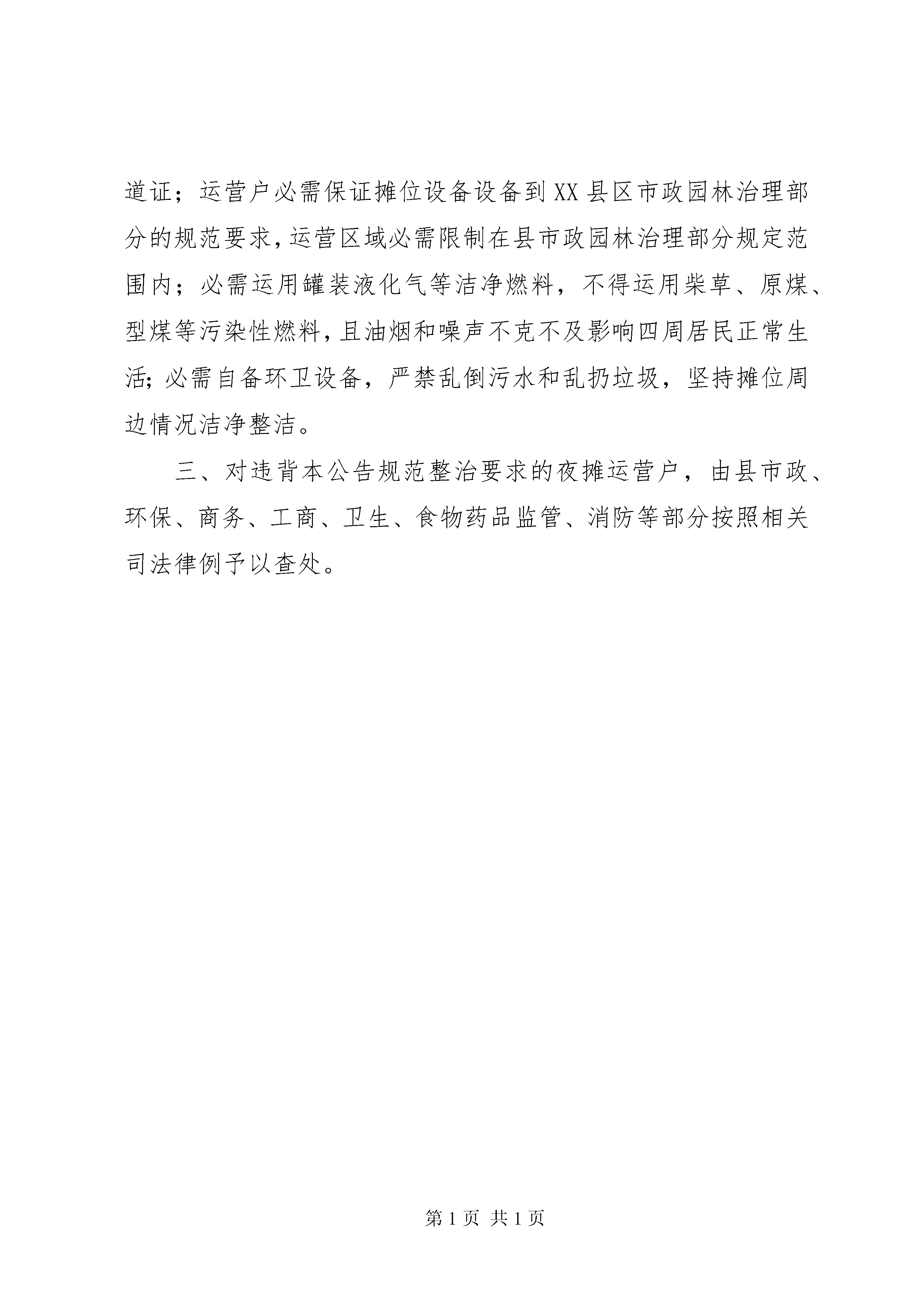 县城夜摊经营整治工作汇报为加速推进“五城联创”工作,改善城市形象,提高广大市民生活质量,着力处XX县区城建成区夜摊不规范运营带来的情况污染、噪音扰民等问题,依据《市市容情况卫生治理条例》等司法律例的规则,经县人民县政府研讨,决定对县城建成区夜摊运营行为进行规范。现将有关事项公告如下:一、整治规范时间县城建成区不规范运营夜摊必需在年月日提高行规范,月日后为稳固提高阶段。二、整治规范要求(一)有固定门面的夜摊。雇主必需持证运营,一切运营用物品必需归入店内,不得超出门店范围运营和占道运营;必需运用洁净燃料,不得运用柴草、原煤、型煤等污染性燃料,且油烟和噪声不克不及影响四周居民正常生活;必需自备环卫设备,严禁乱倒污水和乱扔垃圾,坚持门面周边情况洁净整洁。(二)无固定门面的夜摊。运营户必需进入固定门面内规范运营或统一进入县市政园林局统一规定的暂时夜摊运营场合运营(暂时夜摊运营场合地址选在滨河路低坝子段)。一切规划的摊位均属暂时摊位,县市政治理法律部分将依据城市建立治理需求合时予以取缔。凡请求从事夜摊运营的运营户,必需持证运营,由运营户请求,经县市政园林治理部分同意处理收费治理暂时占道证;运营户必需保证摊位设备设备到XX县区市政园林治理部分的规范要求,运营区域必需限制在县市政园林治理部分规定范围内;必需运用罐装液化气等洁净燃料,不得运用柴草、原煤、型煤等污染性燃料,且油烟和噪声不克不及影响四周居民正常生活;必需自备环卫设备,严禁乱倒污水和乱扔垃圾,坚持摊位周边情况洁净整洁。三、对违背本公告规范整治要求的夜摊运营户,由县市政、环保、商务、工商、卫生、食物药品监管、消防等部分按照相关司法律例予以查处。