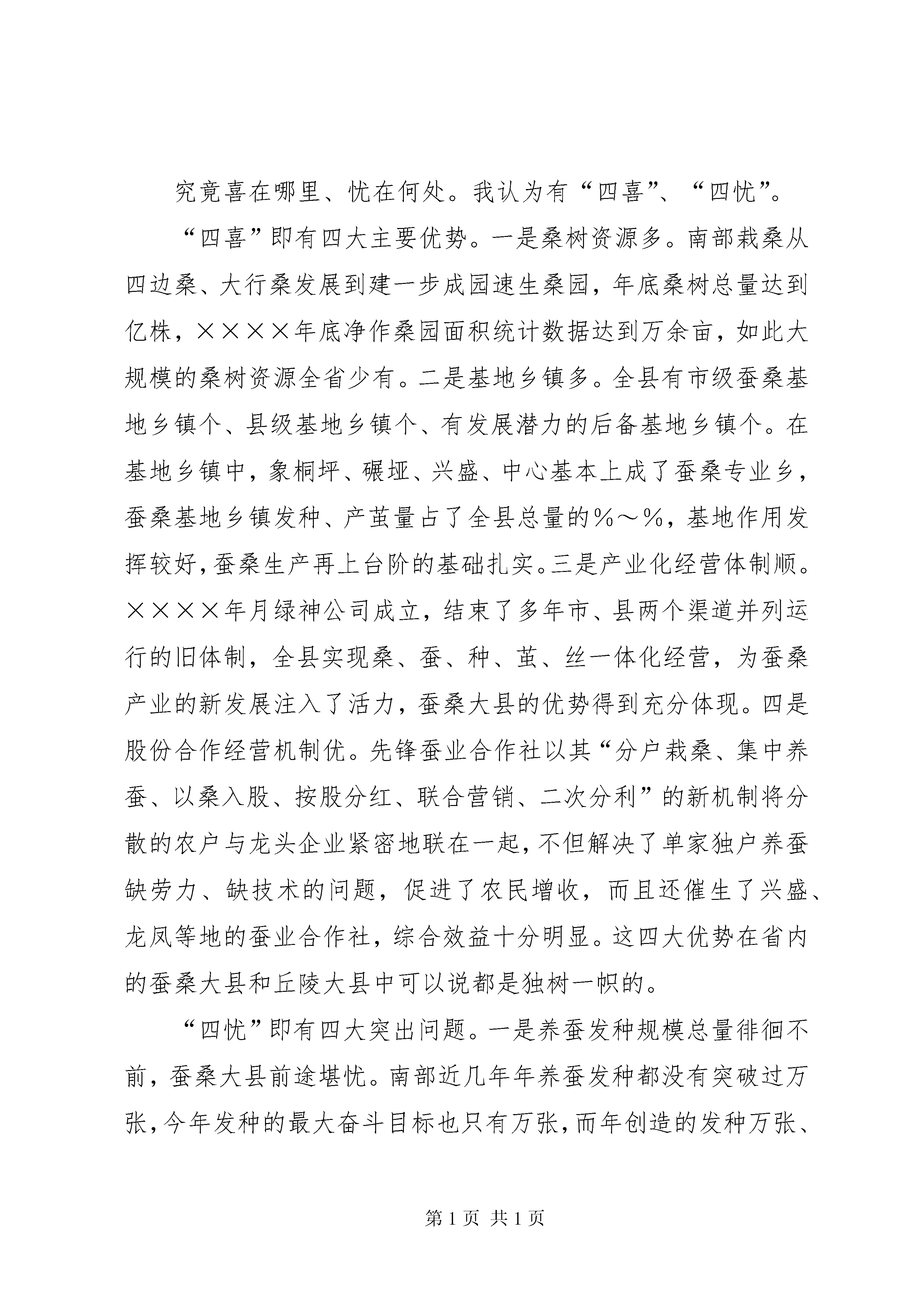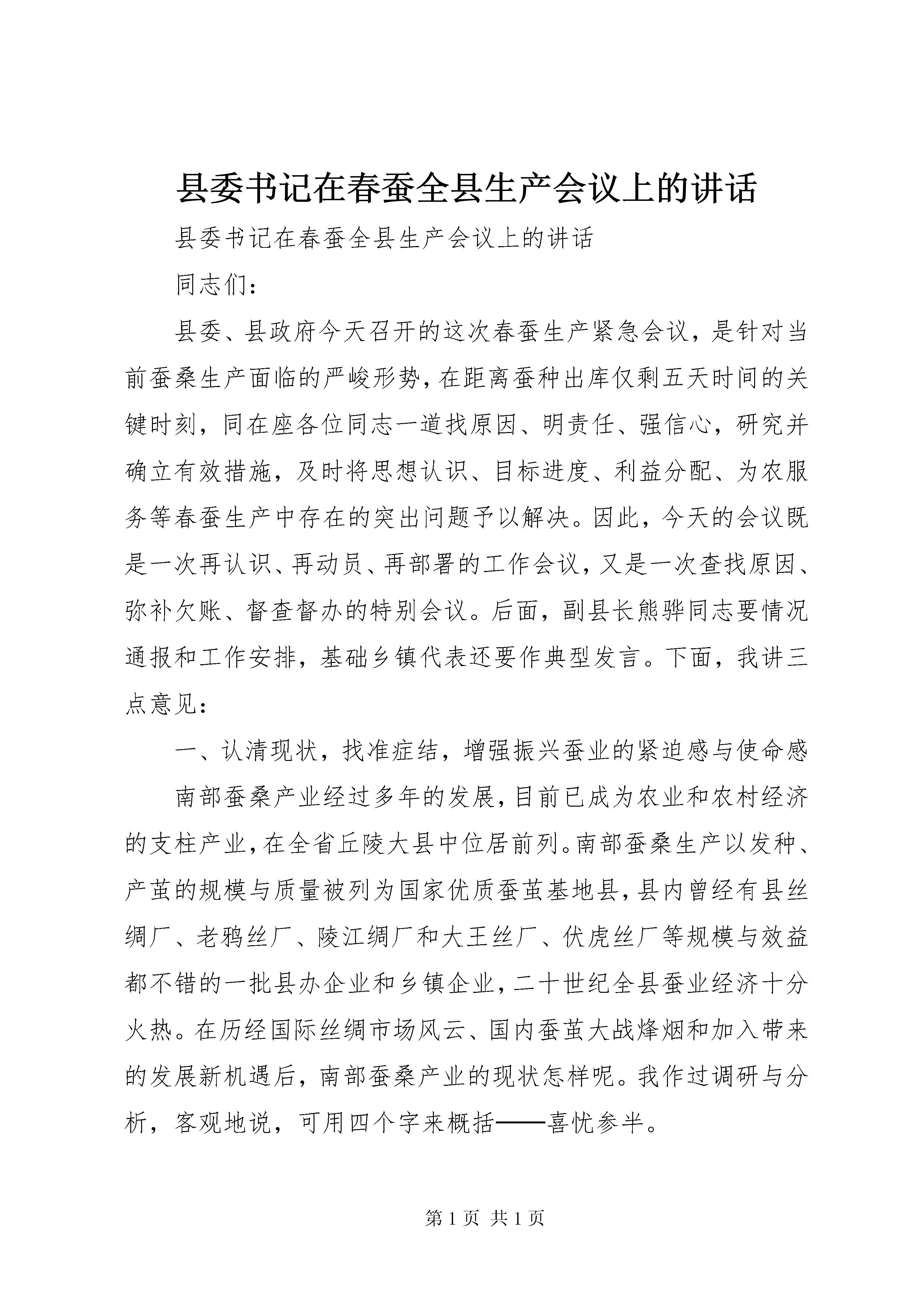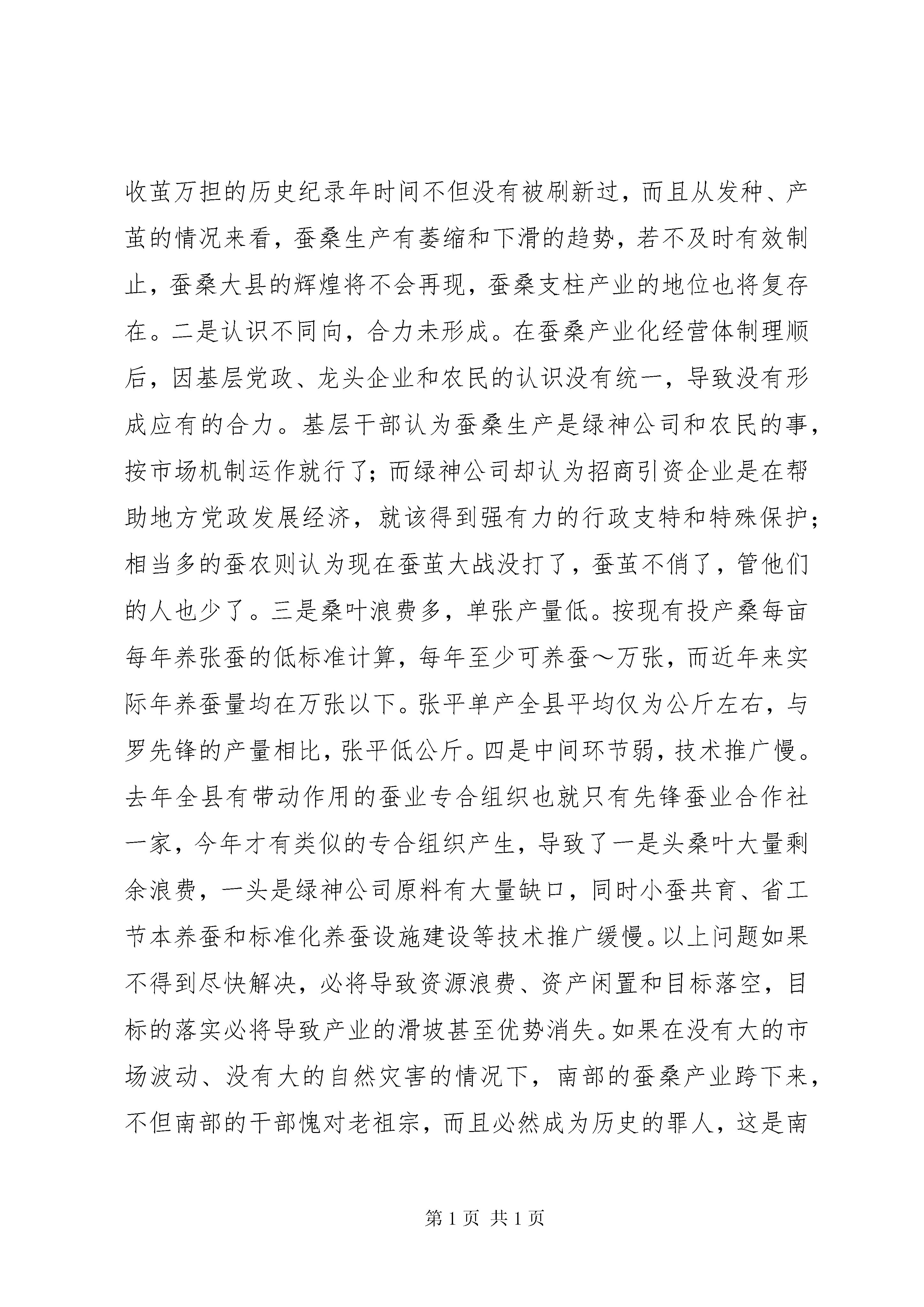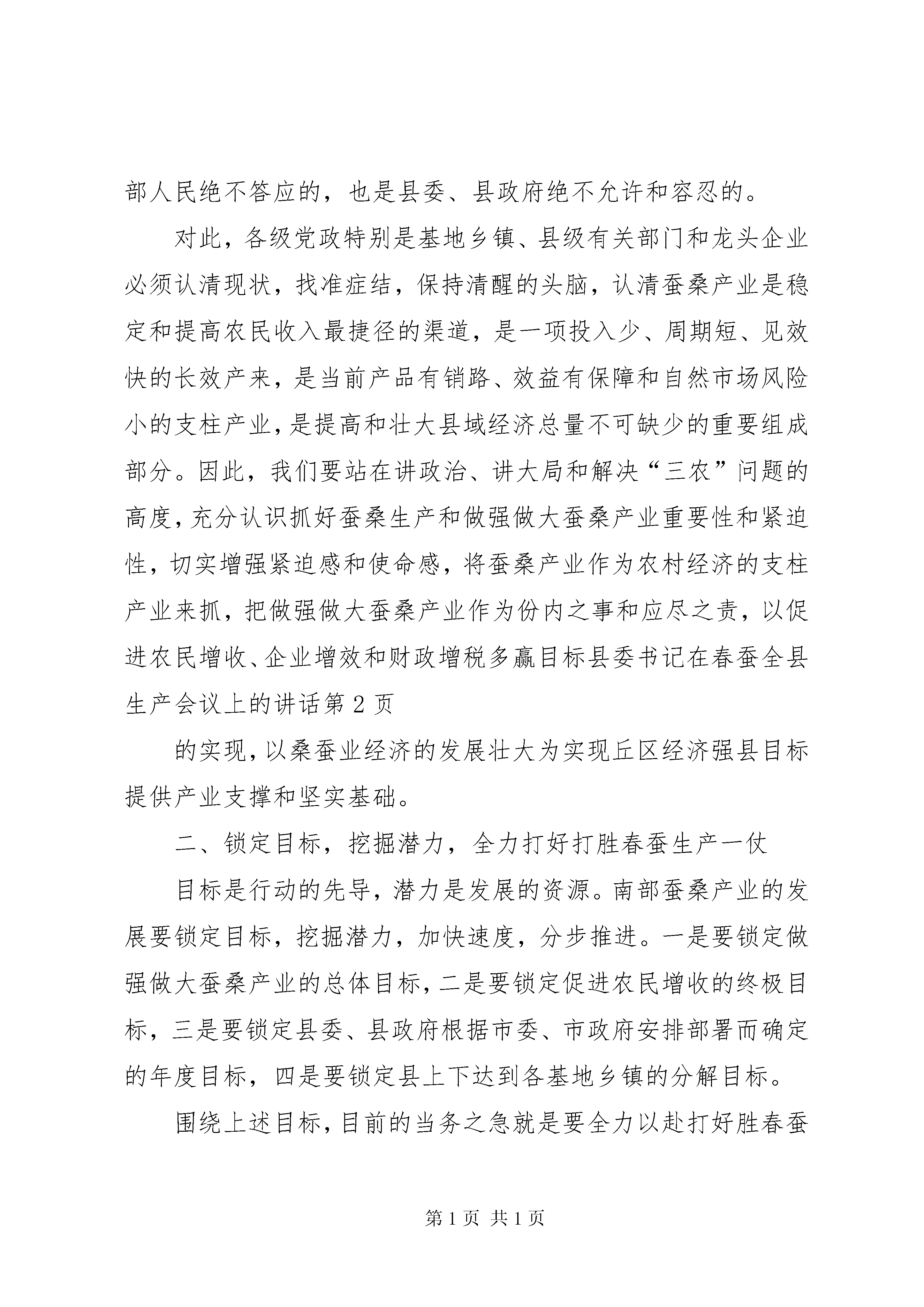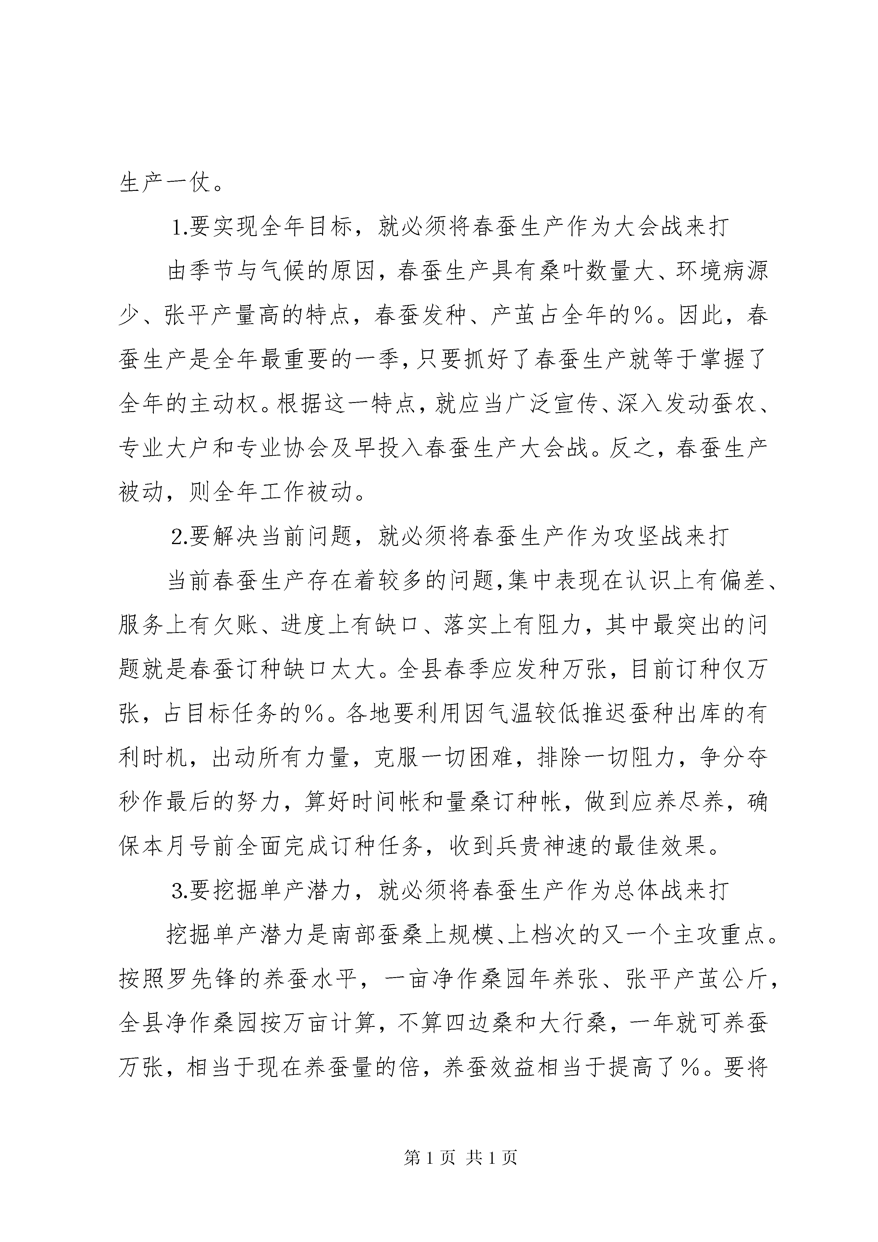 县委书记在春蚕全县生产会议上的讲话县委书记在春蚕全县生产会议上的讲话同志们:县委、县政府今天召开的这次春蚕生产紧急会议,是针对当前蚕桑生产面临的严峻形势,在距离蚕种出库仅剩五天时间的关键时刻,同在座各位同志一道找原因、明责任、强信心,研究并确立有效措施,及时将思想认识、目标进度、利益分配、为农服务等春蚕生产中存在的突出问题予以解决。因此,今天的会议既是一次再认识、再动员、再部署的工作会议,又是一次查找原因、弥补欠账、督查督办的特别会议。后面,副县长熊骅同志要情况通报和工作安排,基础乡镇代表还要作典型发言。下面,我讲三点意见:一、认清现状,找准症结,增强振兴蚕业的紧迫感与使命感南部蚕桑产业经过多年的发展,目前已成为农业和农村经济的支柱产业,在全省丘陵大县中位居前列。南部蚕桑生产以发种、产茧的规模与质量被列为国家优质蚕茧基地县,县内曾经有县丝绸厂、老鸦丝厂、陵江绸厂和大王丝厂、伏虎丝厂等规模与效益都不错的一批县办企业和乡镇企业,二十世纪全县蚕业经济十分火热。在历经国际丝绸市场风云、国内蚕茧大战烽烟和加入带来的发展新机遇后,南部蚕桑产业的现状怎样呢。我作过调研与分析,客观地说,可用四个字来概括──喜忧参半。究竟喜在哪里、忧在何处。我认为有“四喜”、“四忧”。“四喜”即有四大主要优势。一是桑树资源多。南部栽桑从四边桑、大行桑发展到建一步成园速生桑园,年底桑树总量达到亿株,××××年底净作桑园面积统计数据达到万余亩,如此大规模的桑树资源全省少有。二是基地乡镇多。全县有市级蚕桑基地乡镇个、县级基地乡镇个、有发展潜力的后备基地乡镇个。在基地乡镇中,象桐坪、碾垭、兴盛、中心基本上成了蚕桑专业乡,蚕桑基地乡镇发种、产茧量占了全县总量的%~%,基地作用发挥较好,蚕桑生产再上台阶的基础扎实。三是产业化经营体制顺。××××年月绿神公司成立,结束了多年市、县两个渠道并列运行的旧体制,全县实现桑、蚕、种、茧、丝一体化经营,为蚕桑产业的新发展注入了活力,蚕桑大县的优势得到充分体现。四是股份合作经营机制优。先锋蚕业合作社以其“分户栽桑、集中养蚕、以桑入股、按股分红、联合营销、二次分利”的新机制将分散的农户与龙头企业紧密地联在一起,不但解决了单家独户养蚕缺劳力、缺技术的问题,促进了农民增收,而且还催生了兴盛、龙凤等地的蚕业合作社,综合效益十分明显。这四大优势在省内的蚕桑大县和丘陵大县中可以说都是独树一帜的。“四忧”即有四大突出问题。一是养蚕发种规模总量徘徊不前,蚕桑大县前途堪忧。南部近几年年养蚕发种都没有突破过万张,今年发种的最大奋斗目标也只有万张,而年创造的发种万张、收茧万担的历史纪录年时间不但没有被刷新过,而且从发种、产茧的情况来看,蚕桑生产有萎缩和下滑的趋势,若不及时有效制止,蚕桑大县的辉煌将不会再现,蚕桑支柱产业的地位也将复存在。二是认识不同向,合力未形成。在蚕桑产业化经营体制理顺后,因基层党政、龙头企业和农民的认识没有统一,导致没有形成应有的合力。基层干部认为蚕桑生产是绿神公司和农民的事,按市场机制运作就行了;而绿神公司却认为招商引资企业是在帮助地方党政发展经济,就该得到强有力的行政支特和特殊保护;相当多的蚕农则认为现在蚕茧大战没打了,蚕茧不俏了,管他们的人也少了。三是桑叶浪费多,单张产量低。按现有投产桑每亩每年养张蚕的低标准计算,每年至少可养蚕~万张,而近年来实际年养蚕量均在万张以下。张平单产全县平均仅为公斤左右,与罗先锋的产量相比,张平低公斤。四是中间环节弱,技术推广慢。去年全县有带动作用的蚕业专合组织也就只有先锋蚕业合作社一家,今年才有类似的专合组织产生,导致了一是头桑叶大量剩余浪费,一头是绿神公司原料有大量缺口,同时小蚕共育、省工节本养蚕和标准化养蚕设施建设等技术推广缓慢。以上问题如果不得到尽快解决,必将导致资源浪费、资产闲置和目标落空,目标的落实必将导致产业的滑坡甚至优势消失。如果在没有大的市场波动、没有大的自然灾害的情况下,南部的蚕桑产业跨下来,不但南部的干部愧对老祖宗,而且必然成为历史的罪人,这是南部人民绝不答应的,也是县委、县政府绝不允许和容忍的。对此,各级党政特别是基地乡镇、县级有关部门和龙头企业必须认清现状,找准症结,保持清醒的头脑,认清蚕桑产业是稳定和提高农民收入最捷径的渠道,是一项投入少、周期短、见效快的长效产来,是当前产品有销路、效益有保障和自然市场风险小的支柱产业,是提高和壮大县域经济总量不可缺少的重要组成部分。因此,我们要站在讲政治、讲大局和解决“三农”问题的高度,充分认识抓好蚕桑生产和做强做大蚕桑产业重要性和紧迫性,切实增强紧迫感和使命感,将蚕桑产业作为农村经济的支柱产业来抓,把做强做大蚕桑产业作为份内之事和应尽之责,以促进农民增收、企业增效和财政增税多赢目标县委书记在春蚕全县生产会议上的讲话