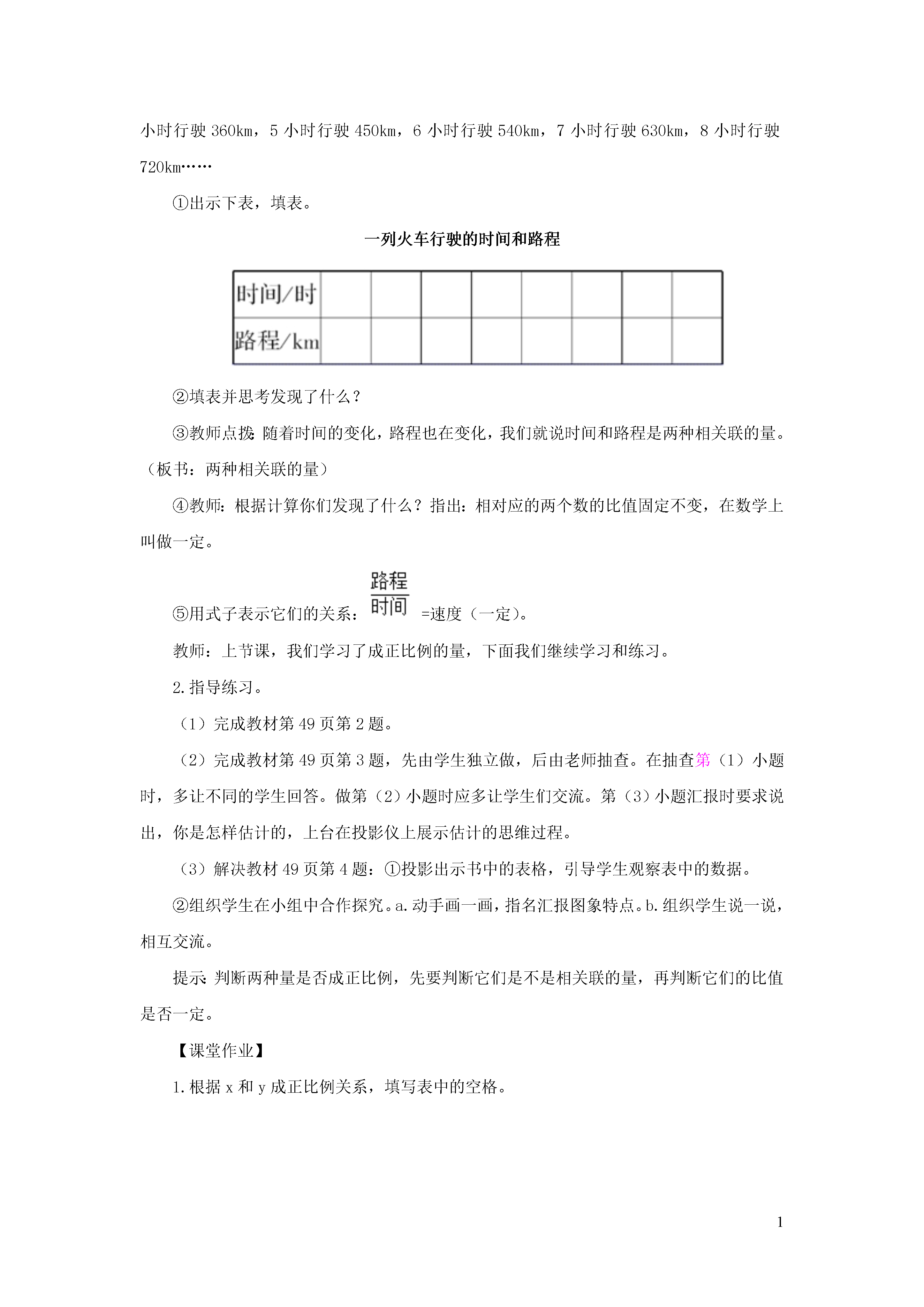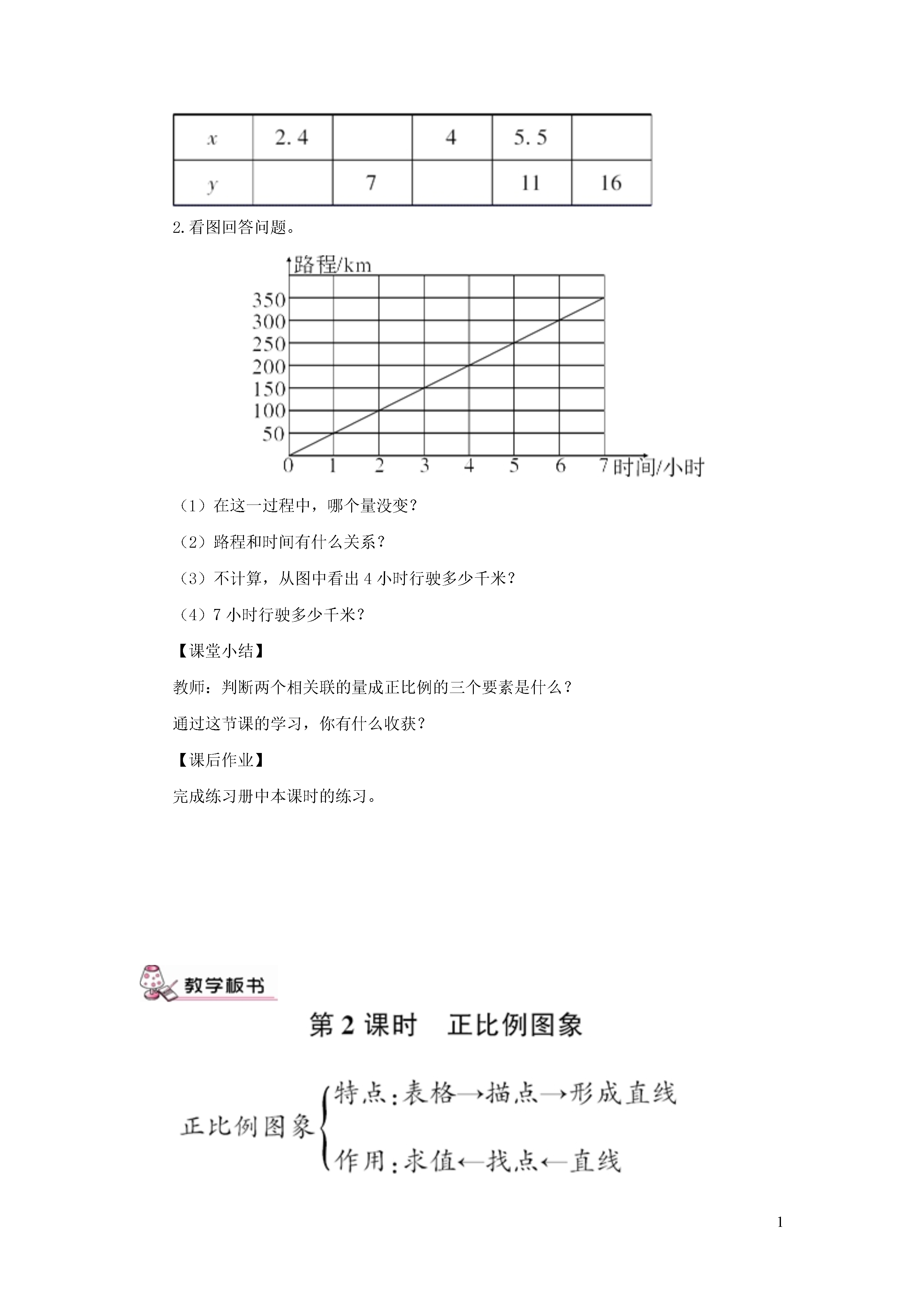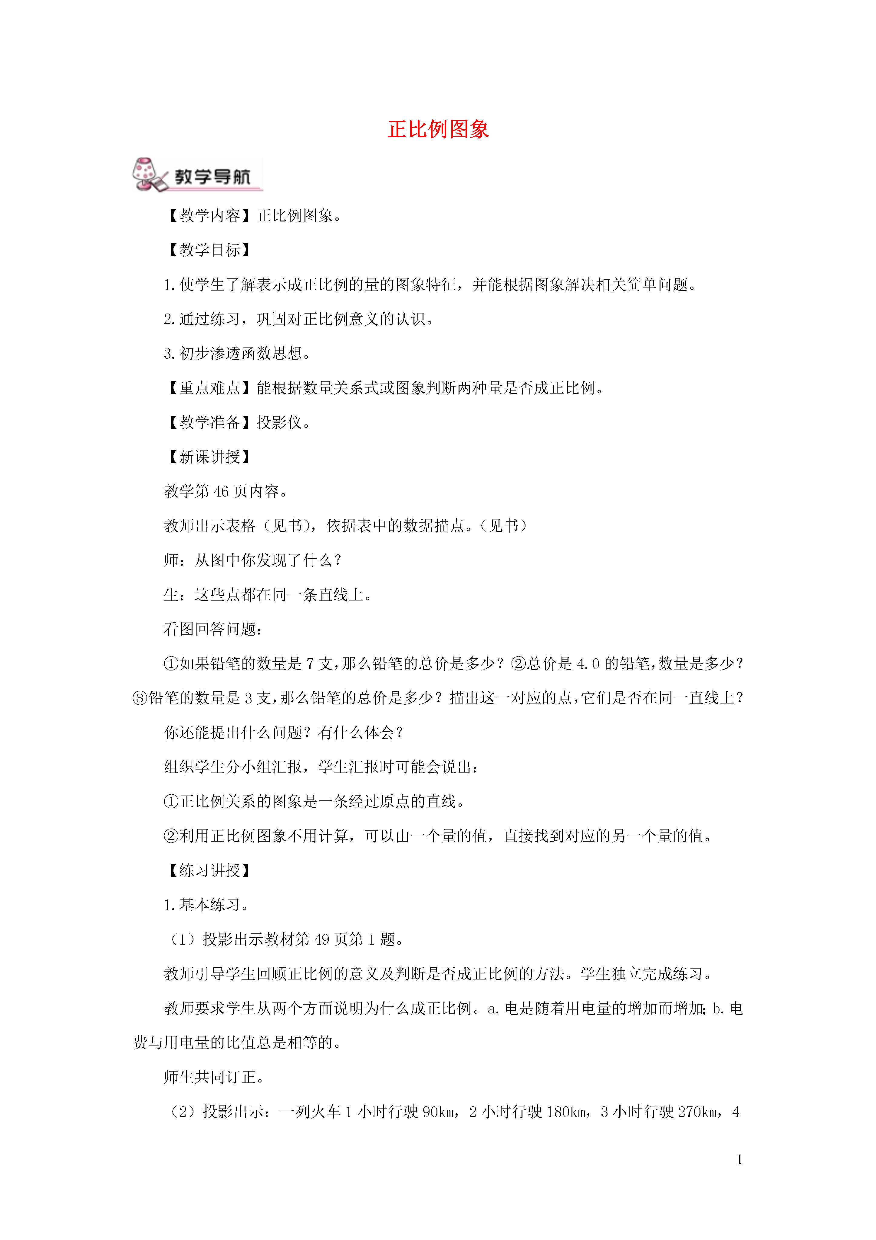 1正比例图象【教学内容】正比例图象。【教学目标】1.使学生了解表示成正比例的量的图象特征,并能根据图象解决相关简单问题。2.通过练习,巩固对正比例意义的认识。3.初步渗透函数思想。【重点难点】能根据数量关系式或图象判断两种量是否成正比例。【教学准备】投影仪。【新课讲授】教学内容。教师出示表格(见书),依据表中的数据描点。(见书)师:从图中你发现了什么?生:这些点都在同一条直线上。看图回答问题:①如果铅笔的数量是7支,那么铅笔的总价是多少?②总价是4.0的铅笔,数量是多少?③铅笔的数量是3支,那么铅笔的总价是多少?描出这一对应的点,它们是否在同一直线上?你还能提出什么问题?有什么体会?组织学生分小组汇报,学生汇报时可能会说出:①正比例关系的图象是一条经过原点的直线。②利用正比例图象不用计算,可以由一个量的值,直接找到对应的另一个量的值。【练习讲授】1.基本练习。(1)投影出示教材第1题。教师引导学生回顾正比例的意义及判断是否成正比例的方法。学生独立完成练习。教师要求学生从两个方面说明为什么成正比例。a.电是随着用电量的增加而增加;b.电费与用电量的比值总是相等的。师生共同订正。(2)投影出示:一列火车1小时行驶90km,2小时行驶180km,3小时行驶270km,4小时行驶360km,5小时行驶450km,6小时行驶540km,7小时行驶630km,8小时行驶720km……①出示下表,填表。一列火车行驶的时间和路程②填表并思考发现了什么?③教师点拨:随着时间的变化,路程也在变化,我们就说时间和路程是两种相关联的量。(板书:两种相关联的量)④教师:根据计算你们发现了什么?指出:相对应的两个数的比值固定不变,在数学上叫做一定。⑤用式子表示它们的关系:=速度(一定)。教师:上节课,我们学习了成正比例的量,下面我们继续学习和练习。2.指导练习。(1)完成教材第2题。(2)完成教材第3题,先由学生独立做,后由老师抽查。在抽查第(1)小题时,多让不同的学生回答。做第(2)小题时应多让学生们交流。第(3)小题汇报时要求说出,你是怎样估计的,上台在投影仪上展示估计的思维过程。(3)解决教材49页第4题:①投影出示书中的表格,引导学生观察表中的数据。②组织学生在小组中合作探究。a.动手画一画,指名汇报图象特点。b.组织学生说一说,相互交流。提示:判断两种量是否成正比例,先要判断它们是不是相关联的量,再判断它们的比值是否一定。【课堂作业】1.根据x和y成正比例关系,填写表中的空格。2.看图回答问题。(1)在这一过程中,哪个量没变?(2)路程和时间有什么关系?(3)不计算,从图中看出4小时行驶多少千米?(4)7小时行驶多少千米?【课堂小结】教师:判断两个相关联的量成正比例的三个要素是什么?通过这节课的学习,你有什么收获?【课后作业】完成练习册中本课时的练习。1.一部分学生对两种量的数量关系不熟,因此不知道到底是不是比值一定,因而上课前应让学生多搜集一些数量关系式,以方便快速地判断。2.述说成正比例的理由,一部分学生说得不够条理,因而还要加强对学生述说的训练。