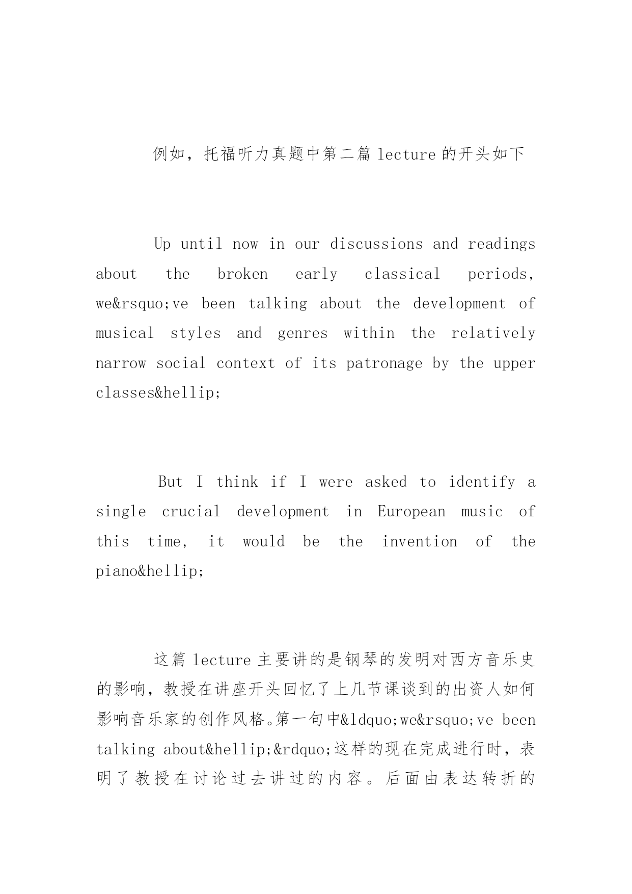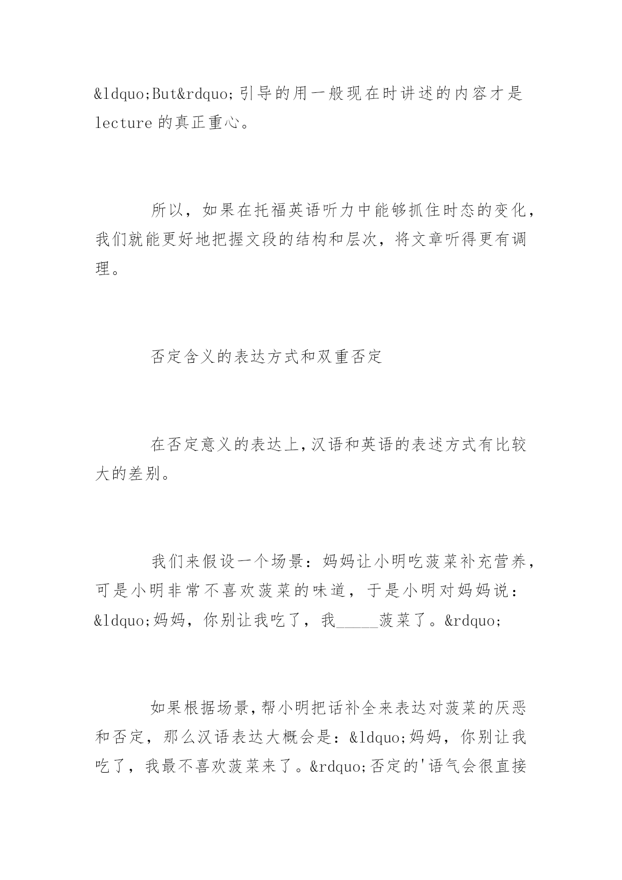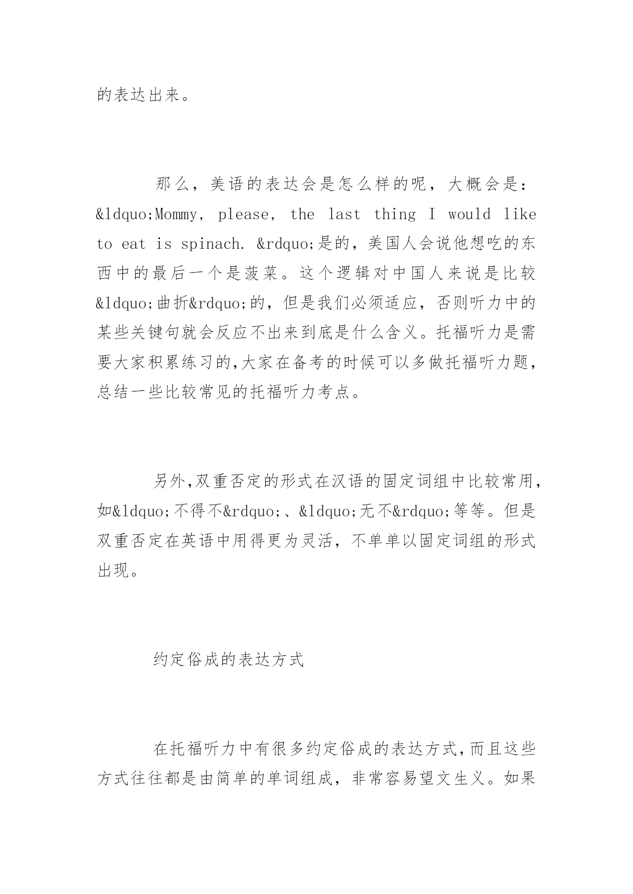 托福听力禁忌望文生义 2016托福听力禁忌望文生义 托福听力是美国人出的题目,自然托福英语听力也不会顾忌以前中国教育对英语的学习方法,从托福听力真题便可看出,那么我们一定要注意别望文生义。 时态的表达方式 汉语中用副词表达时态,而英语中是用动词的变形来表达时态的。中国考生一般都对时态缺乏敏感度,这是很正常的,这就像外国人很难掌握我们汉语中的声调一样。 在托福听力中,尤其是在lecture(讲座)中,我们要特别注意时态的变化。因为在托福的lecture文段开头部分,教授常常会通过讨论过去讲的内容来引出本次讲座的内容,或者讨论过去的理论和观点与当前的新理论和新观点进行对比。如果不注意时态,一股脑地听下来,很容易会混淆lecture的主题,影响答题。 例如,托福听力真题中第二篇lecture的开头如下 Upuntilnowinourdiscussionsandreadingsaboutthebrokenearlyclassicalperiods,we’vebeentalkingaboutthedevelopmentofmusicalstylesandgenreswithintherelativelynarrowsocialcontextofitspatronagebytheupperclasses… ButIthinkifIwereaskedtoidentifyasinglecrucialdevelopmentinEuropeanmusicofthistime,itwouldbetheinventionofthepiano… 这篇lecture主要讲的是钢琴的发明对西方音乐史的影响,教授在讲座开头回忆了上几节课谈到的出资人如何影响音乐家的创作风格。第一句中“we’vebeentalkingabout…”这样的现在完成进行时,表明了教授在讨论过去讲过的内容。后面由表达转折的“But”引导的用一般现在时讲述的内容才是lecture的真正重心。 所以,如果在托福英语听力中能够抓住时态的变化,我们就能更好地把握文段的结构和层次,将文章听得更有调理。 否定含义的表达方式和双重否定 在否定意义的表达上,汉语和英语的表述方式有比较大的差别。 我们来假设一个场景:妈妈让小明吃菠菜补充营养,可是小明非常不喜欢菠菜的味道,于是小明对妈妈说:“妈妈,你别让我吃了,我_____菠菜了。” 如果根据场景,帮小明把话补全来表达对菠菜的厌恶和否定,那么汉语表达大概会是:“妈妈,你别让我吃了,我最不喜欢菠菜来了。”否定的'语气会很直接的表达出来。 那么,美语的表达会是怎么样的呢,大概会是:“Mommy,please,thelastthingIwouldliketoeatisspinach.”是的,美国人会说他想吃的东西中的最后一个是菠菜。这个逻辑对中国人来说是比较“曲折”的,但是我们必须适应,否则听力中的某些关键句就会反应不出来到底是什么含义。托福听力是需要大家积累练习的,大家在备考的时候可以多做托福听力题,总结一些比较常见的托福听力考点。 另外,双重否定的形式在汉语的固定词组中比较常用,如“不得不”、“无不”等等。但是双重否定在英语中用得更为灵活,不单单以固定词组的形式出现。 约定俗成的表达方式 在托福听力中有很多约定俗成的表达方式,而且这些方式往往都是由简单的单词组成,非常容易望文生义。如果不知道这些表达方式的正确含义,以美式思维方式理解和记忆,就不能很好的理解听力文段。