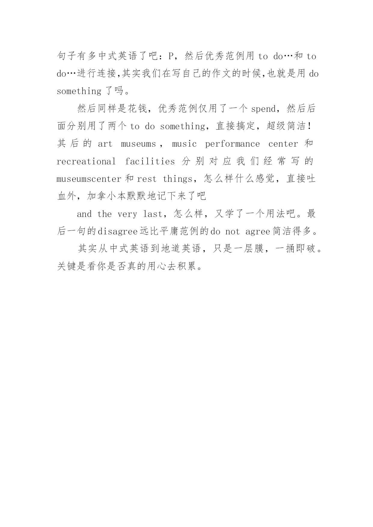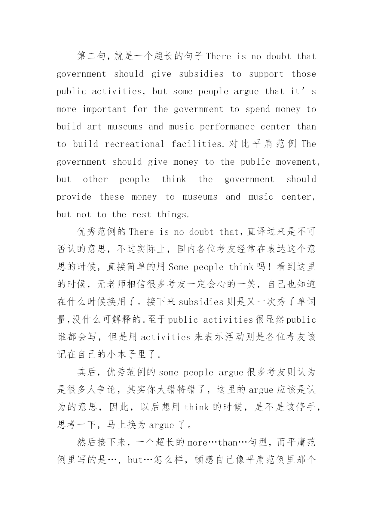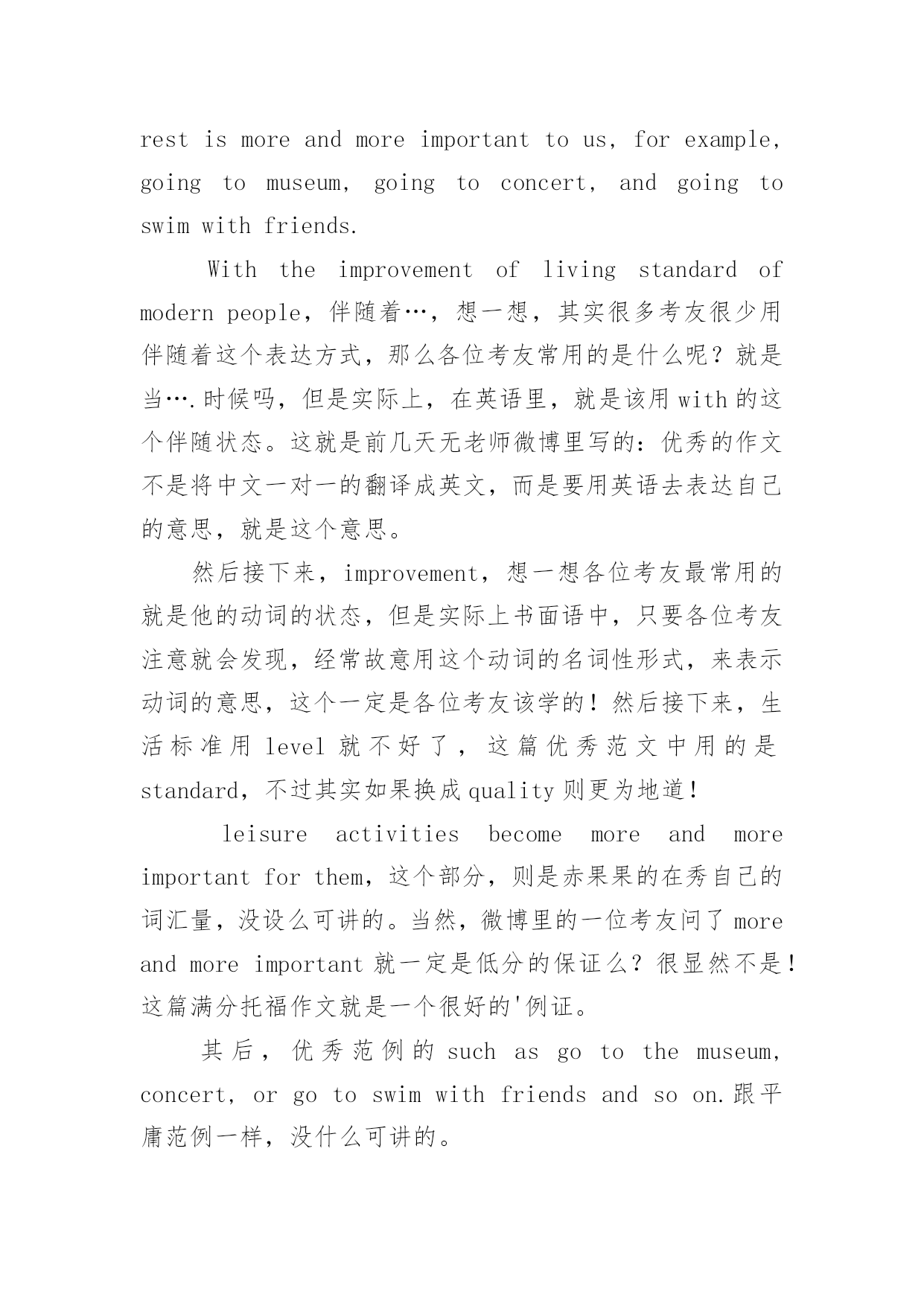 托福的满分作文 托福的满分作文无老师中文翻译:随着现代人生活标准越来越高,休闲活动对我们来说变得越来越重要了,比如说,逛博物馆,欣赏音乐会,亦或者和朋友去游泳。政府应该对于公众活动有补贴,但是另一些人则认为政府应该将钱投入到艺术馆和音乐厅,而不是投到娱乐设施上。我不同意这个观点。无老师平庸范例:Whenpeopleimprovetheirlivinglevel,restismoreandmoreimportanttous,forexample,goingtomuseum,goingtoconcert,andgoingtoswimwithfriends.Thegovernmentshouldgivemoneytothepublicmovement,butotherpeoplethinkthegovernmentshouldprovidethesemoneytomuseumsandmusiccenter,butnottotherestthings.Idonotagreewiththisopinion.本次的优秀范本原型,是一篇30分托福作文满分考友的习作,学习价值,空前绝后!加牛!无老师精析:当然又是先请出优秀范例:Withtheimprovementoflivingstandardofmodernpeople,leisureactivitiesbecomemoreandmoreimportantforthem,suchasgotothemuseum,concert,orgotoswimwithfriendsandsoon.然后从卫生间马桶里找出来平庸范例:Whenpeopleimprovetheirlivinglevel,restismoreandmoreimportanttous,forexample,goingtomuseum,goingtoconcert,andgoingtoswimwithfriends.Withtheimprovementoflivingstandardofmodernpeople,伴随着…,想一想,其实很多考友很少用伴随着这个表达方式,那么各位考友常用的是什么呢?就是当….时候吗,但是实际上,在英语里,就是该用with的这个伴随状态。这就是前几天无老师微博里写的:优秀的作文不是将中文一对一的翻译成英文,而是要用英语去表达自己的意思,就是这个意思。然后接下来,improvement,想一想各位考友最常用的就是他的动词的状态,但是实际上书面语中,只要各位考友注意就会发现,经常故意用这个动词的名词性形式,来表示动词的意思,这个一定是各位考友该学的!然后接下来,生活标准用level就不好了,这篇优秀范文中用的是standard,不过其实如果换成quality则更为地道!leisureactivitiesbecomemoreandmoreimportantforthem,这个部分,则是赤果果的在秀自己的词汇量,没设么可讲的。当然,微博里的一位考友问了moreandmoreimportant就一定是低分的保证么?很显然不是!这篇满分托福作文就是一个很好的'例证。其后,优秀范例的suchasgotothemuseum,concert,orgotoswimwithfriendsandsoon.跟平庸范例一样,没什么可讲的。第二句,就是一个超长的句子Thereisnodoubtthatgovernmentshouldgivesubsidiestosupportthosepublicactivities,butsomepeoplearguethatit’smoreimportantforthegovernmenttospendmoneytobuildartmuseumsandmusicperformancecenterthantobuildrecreationalfacilities.对比平庸范例Thegovernmentshouldgivemoneytothepublicmovement,butotherpeoplethinkthegovernmentshouldprovidethesemoneytomuseumsandmusiccenter,butnottotherestthings.优秀范例的Thereisnodoubtthat,直译过来是不可否认的意思,不过实际上,国内各位考友经常在表达这个意思的时候,直接简单的用Somepeoplethink吗!看到这里的时候,无老师相信很多考友一定会心的一笑,自己也知道在什么时候换用了。接下来subsidies则是又一次秀了单词量,没什么可解释的。至于publicactivities很显然public谁都会写,但是用activities来表示活动则是各位考友该记在自己的小本