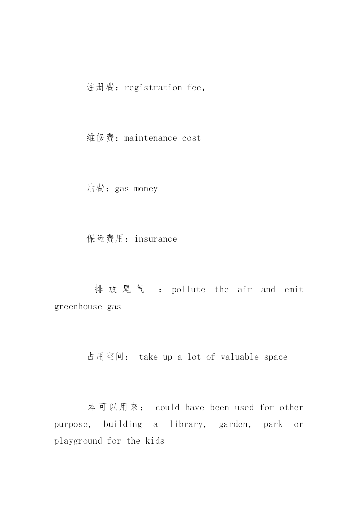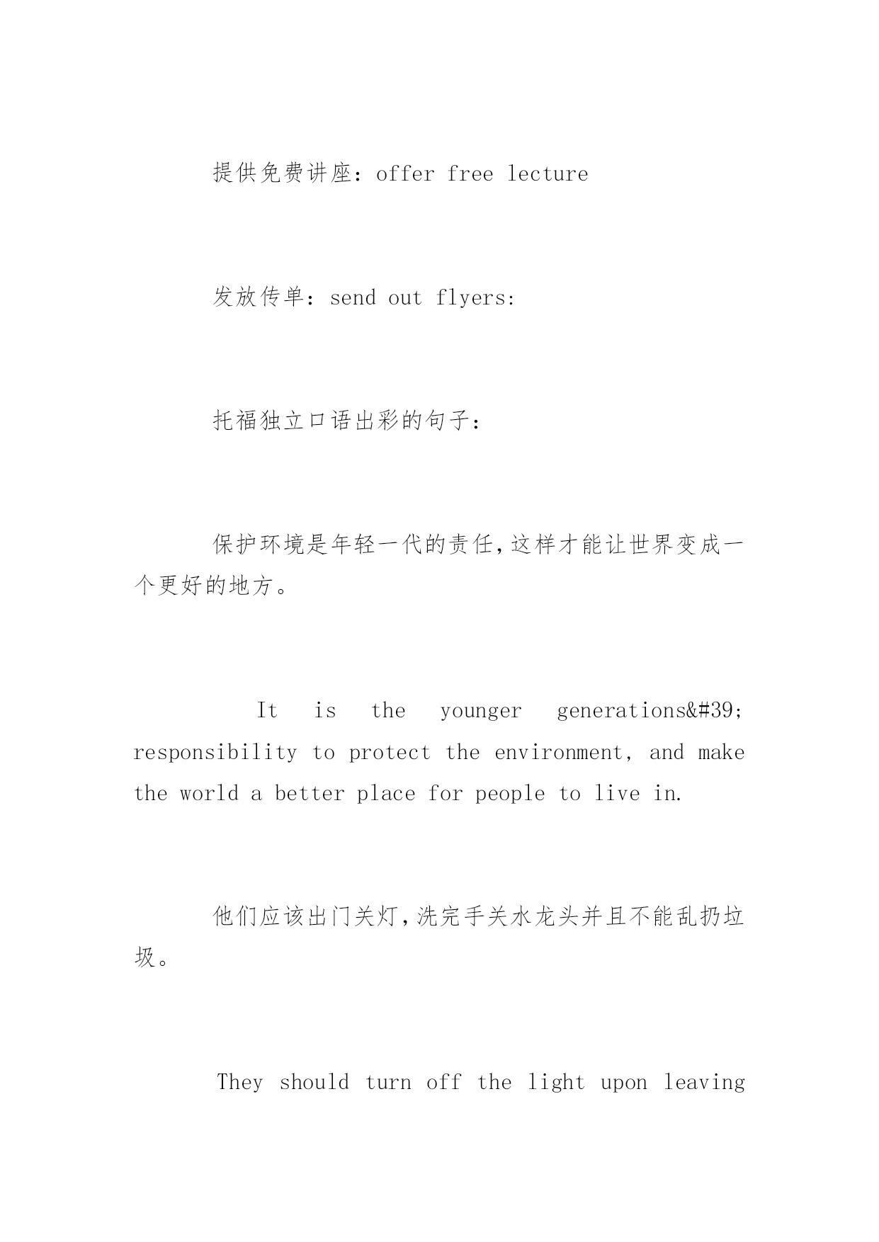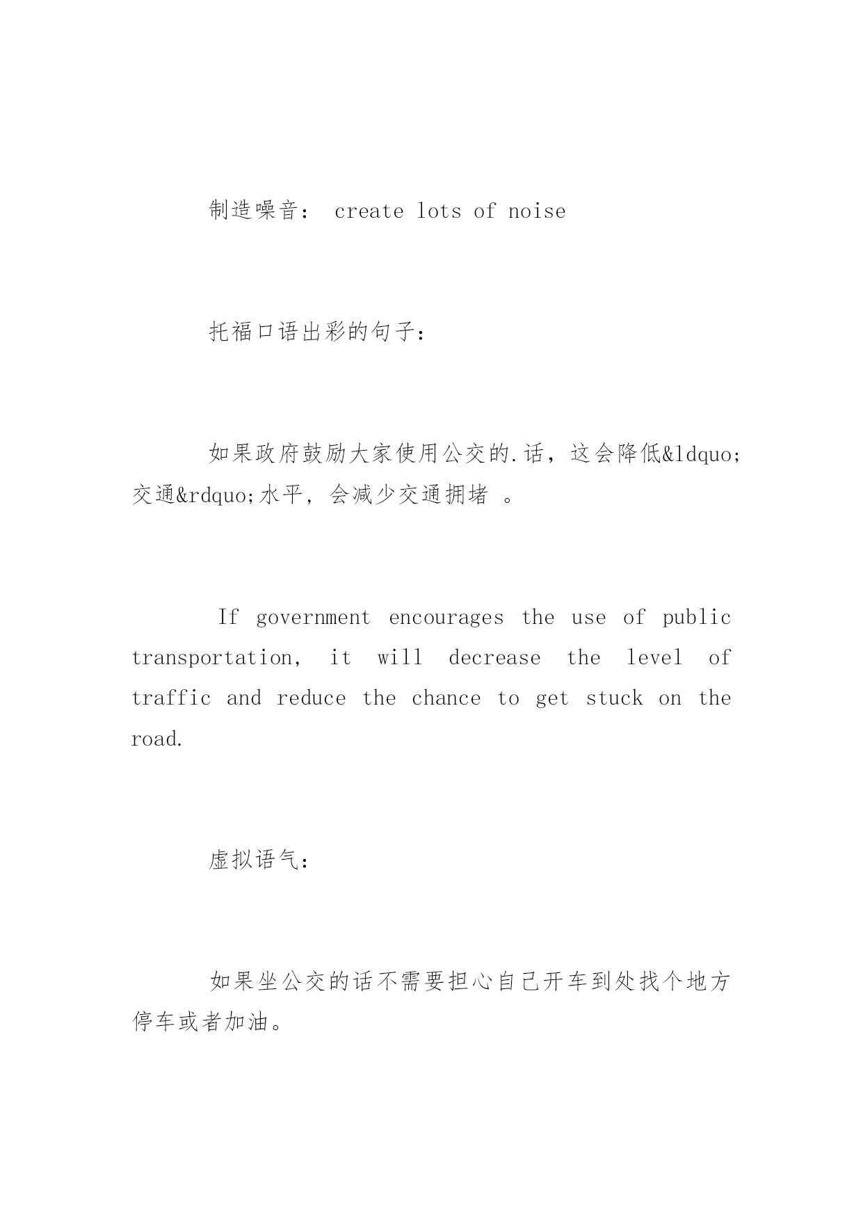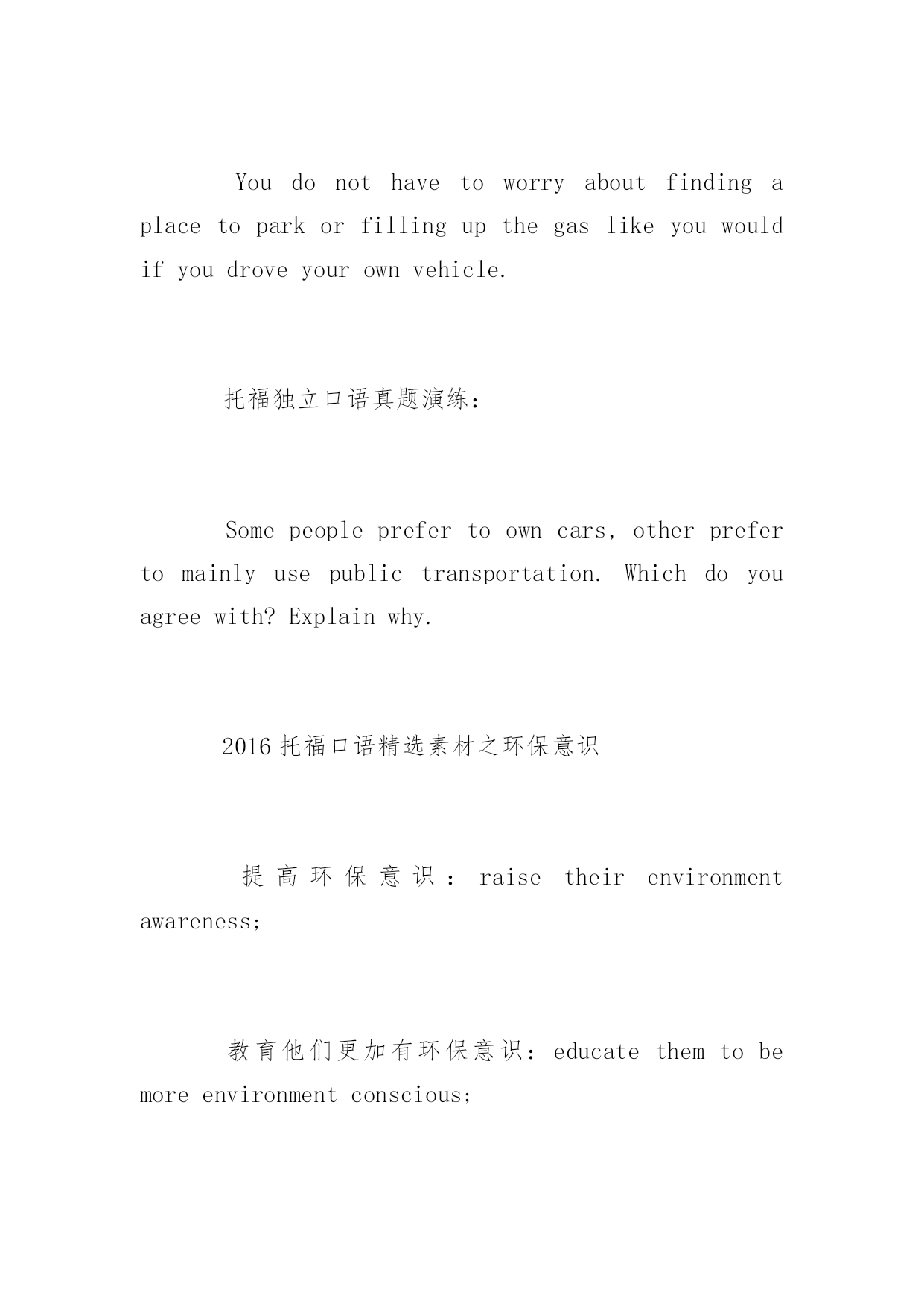 托福口语话题素材 2016托福口语话题素材 托福由四部分组成,分别是Reading、Listening、Speaking以及Writing。每个单项满分30分,总分120分。下面是yjbys网小编提供给大家关于托福口语话题素材,希望对大家的备考有所帮助。 2016托福口语话题素材之公交 必杀短语: 对环境有好处:benefitstheenvironment 私家车的坏处: 成本高:befarmorecostlythanxxx 注册费:registrationfee, 维修费:maintenancecost 油费:gasmoney 保险费用:insurance 排放尾气:pollutetheairandemitgreenhousegas 占用空间:takeupalotofvaluablespace 本可以用来:couldhavebeenusedforotherpurpose,buildingalibrary,garden,parkorplaygroundforthekids 制造噪音:createlotsofnoise 托福口语出彩的句子: 如果政府鼓励大家使用公交的.话,这会降低“交通”水平,会减少交通拥堵。 Ifgovernmentencouragestheuseofpublictransportation,itwilldecreasetheleveloftrafficandreducethechancetogetstuckontheroad. 虚拟语气: 如果坐公交的话不需要担心自己开车到处找个地方停车或者加油。 Youdonothavetoworryaboutfindingaplacetoparkorfillingupthegaslikeyouwouldifyoudroveyourownvehicle. 托福独立口语真题演练: Somepeopleprefertoowncars,otherprefertomainlyusepublictransportation.Whichdoyouagreewith?Explainwhy. 2016托福口语精选素材之环保意识 提高环保意识:raisetheirenvironmentawareness; 教育他们更加有环保意识:educatethemtobemoreenvironmentconscious; 提供免费讲座:offerfreelecture 发放传单:sendoutflyers: 托福独立口语出彩的句子: 保护环境是年轻一代的责任,这样才能让世界变成一个更好的地方。 Itistheyoungergenerations'responsibilitytoprotecttheenvironment,andmaketheworldabetterplaceforpeopletolivein. 他们应该出门关灯,洗完手关水龙头并且不能乱扔垃圾。 Theyshouldturnoffthelightuponleavingtheroom,andturnoffthefaucetafterwashingtheirhands,andnotlitteraround. 托福独立口语真题演练: Yourschoolisgoingtohelpthecommunity.Whichofthefollowingwouldyouprefer?1)cleanlittersandtrash2)planttreesandflowers3)teachchildrenknowledgeabouttheenvironment. 2016托福口语话题素材之私家车 必杀短语: 日程限制: schedulingconstraints 就会比另外一个选择有更多的自由: havemuchmorefreedomthanotherwise 托福独立口语出彩的句子: 不受日程的约束,想去哪去那,想什么时候去什么时候去,想跟谁去就跟谁去。不需要要转车,这样还可以帮你节省时间。 Youarenotboundbyschedulingconstraints,youcantravelwhereveryouwant,wheneveryouwant,withwhoeveryouwant,andyoudonothavetomakeanytransfers,whichhelpsyousavetime. 拥有一辆汽车的好处是,你将不必等待火车,电车或公共汽车或分享你的旅行经历与公众。 Theadvantageofhavingacaristhatyouwillneverhavetowaitforyourtrain,tramorbusorshareyourtravellingexperiencewiththegeneralpubl