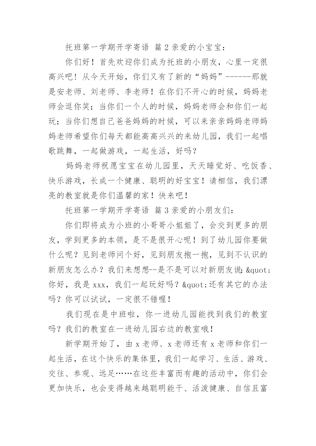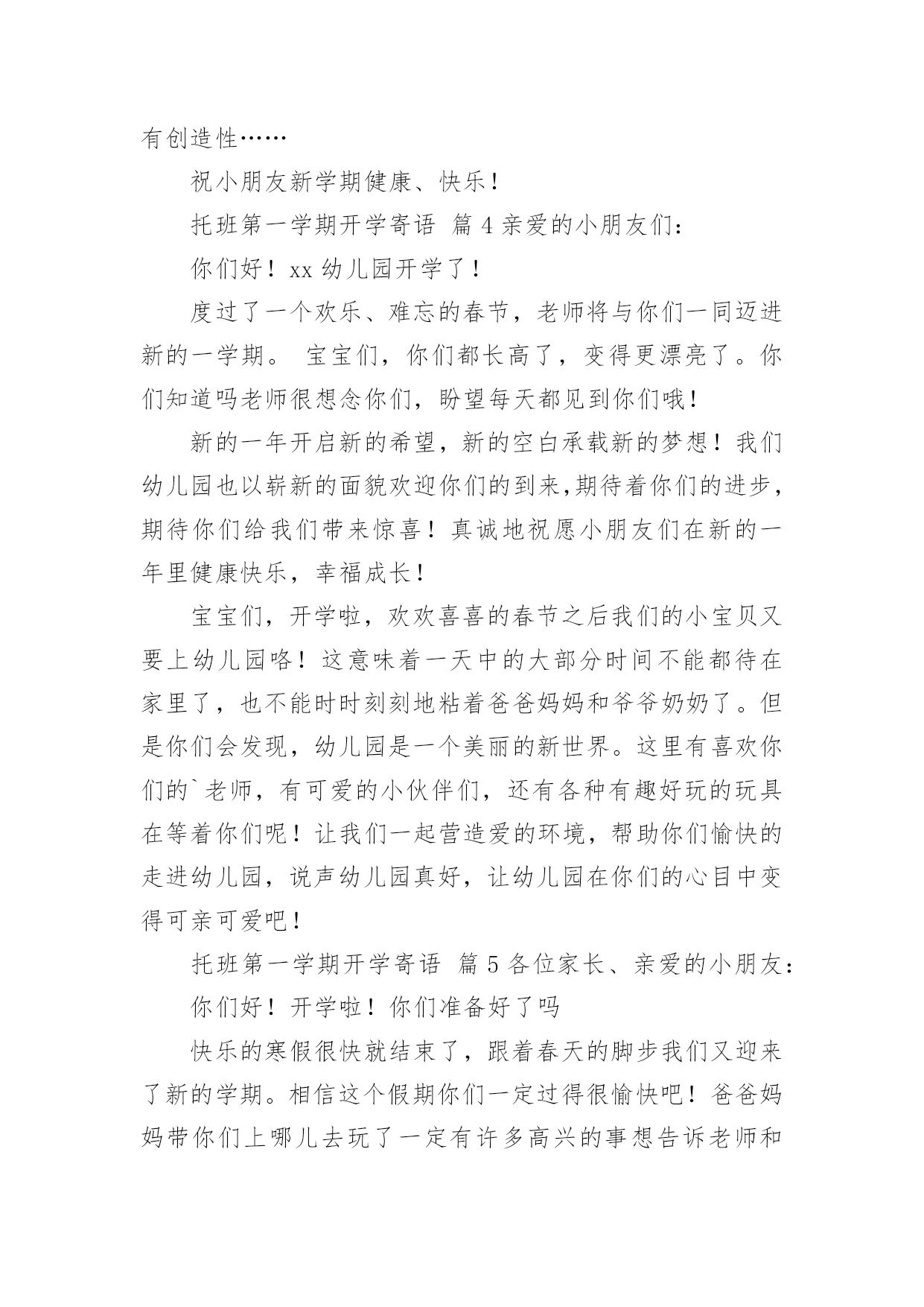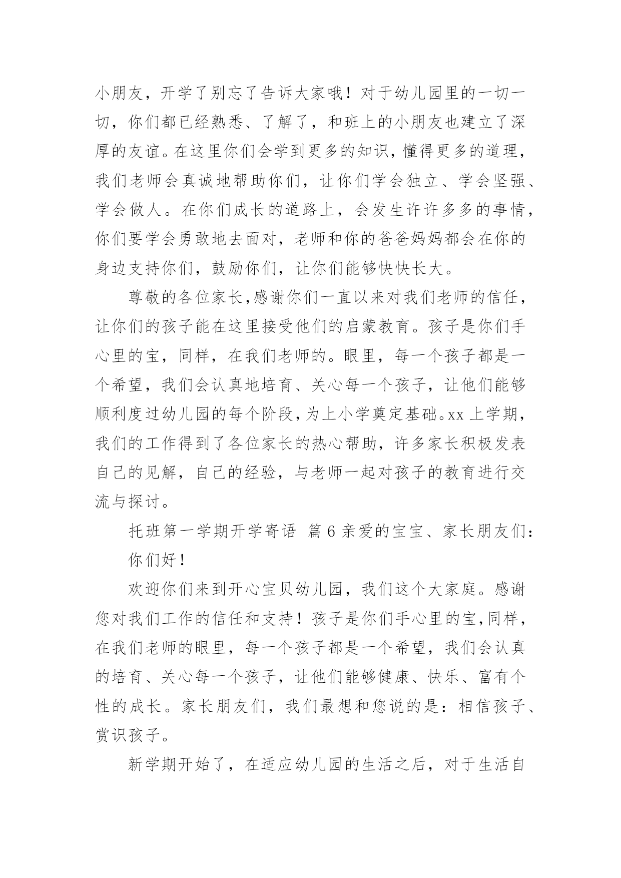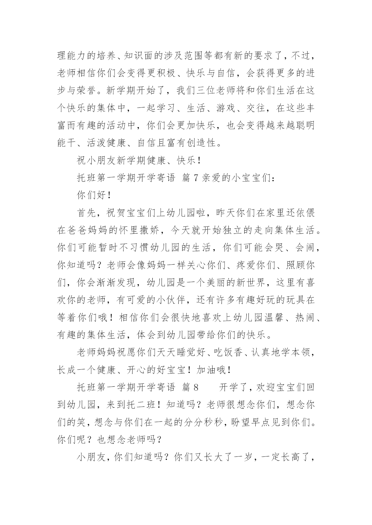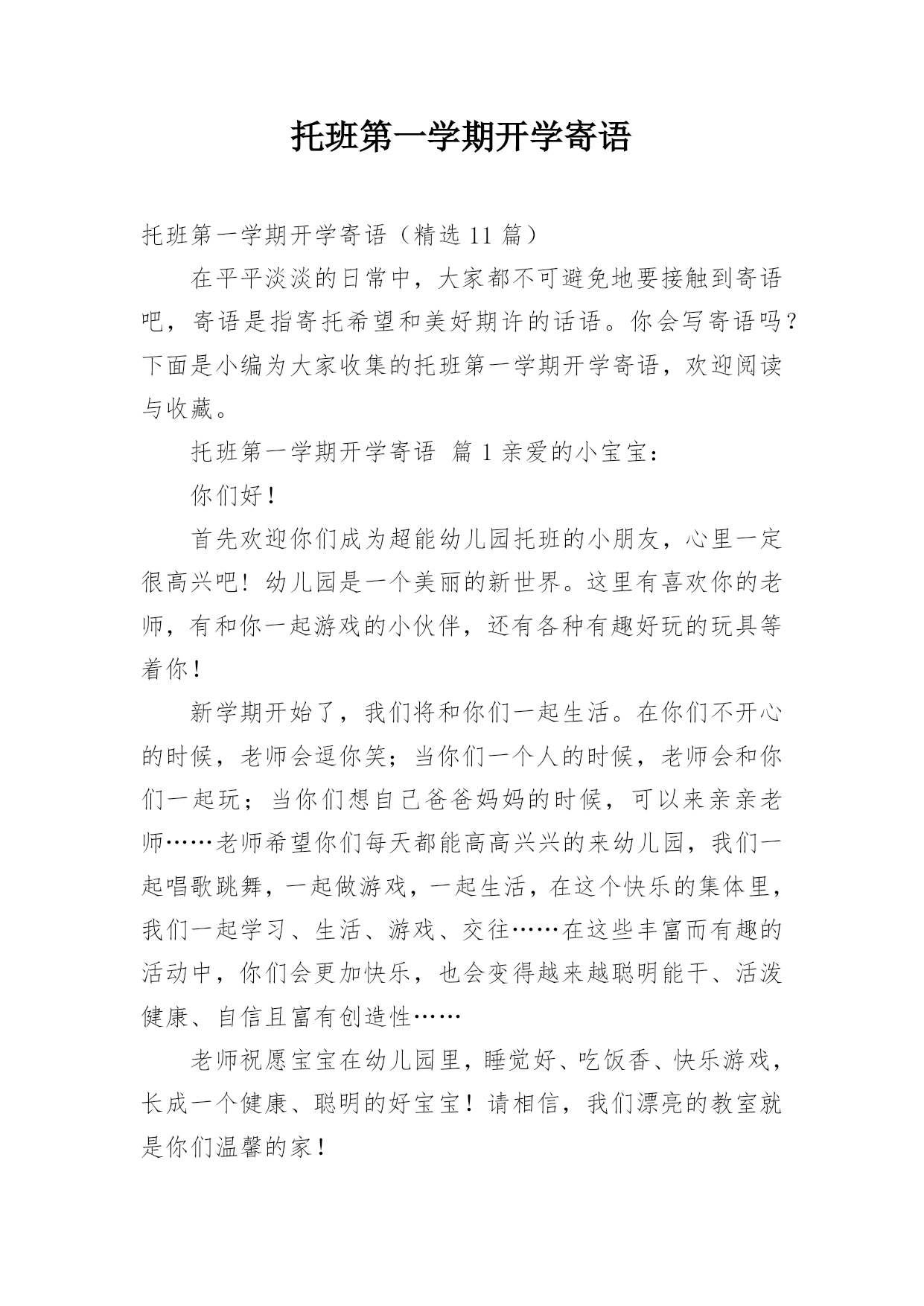托班第一学期开学寄语 托班第一学期开学寄语(精选11篇)在平平淡淡的日常中,大家都不可避免地要接触到寄语吧,寄语是指寄托希望和美好期许的话语。你会写寄语吗?下面是小编为大家收集的托班第一学期开学寄语,欢迎阅读与收藏。托班第一学期开学寄语篇1亲爱的小宝宝:你们好!首先欢迎你们成为超能幼儿园托班的小朋友,心里一定很高兴吧!幼儿园是一个美丽的新世界。这里有喜欢你的老师,有和你一起游戏的小伙伴,还有各种有趣好玩的玩具等着你!新学期开始了,我们将和你们一起生活。在你们不开心的时候,老师会逗你笑;当你们一个人的时候,老师会和你们一起玩;当你们想自己爸爸妈妈的时候,可以来亲亲老师……老师希望你们每天都能高高兴兴的来幼儿园,我们一起唱歌跳舞,一起做游戏,一起生活,在这个快乐的集体里,我们一起学习、生活、游戏、交往……在这些丰富而有趣的活动中,你们会更加快乐,也会变得越来越聪明能干、活泼健康、自信且富有创造性……老师祝愿宝宝在幼儿园里,睡觉好、吃饭香、快乐游戏,长成一个健康、聪明的好宝宝!请相信,我们漂亮的教室就是你们温馨的家!托班第一学期开学寄语篇2亲爱的小宝宝:你们好!首先欢迎你们成为托班的小朋友,心里一定很高兴吧!从今天开始,你们又有了新的“妈妈”------那就是安老师、刘老师、李老师!在你们不开心的时候,妈妈老师会逗你笑;当你们一个人的时候,妈妈老师会和你们一起玩;当你们想自己爸爸妈妈的时候,可以来亲亲妈妈老师妈妈老师希望你们每天都能高高兴兴的来幼儿园,我们一起唱歌跳舞,一起做游戏,一起生活,好吗?妈妈老师祝愿宝宝在幼儿园里,天天睡觉好、吃饭香、快乐游戏,长成一个健康、聪明的好宝宝!请相信,我们漂亮的教室就是你们温馨的家!快来吧!托班第一学期开学寄语篇3亲爱的小朋友们:你们即将成为小班的小哥哥小姐姐了,会交到更多的朋友,学到更多的本领,是不是很开心呢!到了幼儿园你要做什么呢?见到老师问个好,见到朋友抱一抱,见到不认识的新朋友怎么办?我们来想想--是不是可以对新朋友说:"你好,我是xxx,我们一起玩好吗?"还有其它的办法吗?你可以试试,一定很不错喔!我们现在是中班啦,你一进幼儿园能找到我们的教室吗?我们的教室在一进幼儿园右边的教室哦!新学期开始了,由x老师、x老师还有x老师和你们一起生活,在这个快乐的集体里,我们一起学习、生活、游戏、交往、参观、远足……在这些丰富而有趣的活动中,你们会更加快乐,也会变得越来越聪明能干、活泼健康、自信且富有创造性……祝小朋友新学期健康、快乐!托班第一学期开学寄语篇4亲爱的小朋友们:你们好!xx幼儿园开学了!度过了一个欢乐、难忘的春节,老师将与你们一同迈进新的一学期。宝宝们,你们都长高了,变得更漂亮了。你们知道吗老师很想念你们,盼望每天都见到你们哦!新的一年开启新的希望,新的空白承载新的梦想!我们幼儿园也以崭新的面貌欢迎你们的到来,期待着你们的进步,期待你们给我们带来惊喜!真诚地祝愿小朋友们在新的一年里健康快乐,幸福成长!宝宝们,开学啦,欢欢喜喜的春节之后我们的小宝贝又要上幼儿园咯!这意味着一天中的大部分时间不能都待在家里了,也不能时时刻刻地粘着爸爸妈妈和爷爷奶奶了。但是你们会发现,幼儿园是一个美丽的新世界。这里有喜欢你们的`老师,有可爱的小伙伴们,还有各种有趣好玩的玩具在等着你们呢!让我们一起营造爱的环境,帮助你们愉快的走进幼儿园,说声幼儿园真好,让幼儿园在你们的心目中变得可亲可爱吧!托班第一学期开学寄语篇5各位家长、亲爱的小朋友:你们好!开学啦!你们准备好了吗快乐的寒假很快就结束了,跟着春天的脚步我们又迎来了新的学期。相信这个假期你们一定过得很愉快吧!爸爸妈妈带你们上哪儿去玩了一定有许多高兴的事想告诉老师和小朋友,开学了别忘了告诉大家哦!对于幼儿园里的一切一切,你们都已经熟悉、了解了,和班上的小朋友也建立了深厚的友谊。在这里你们会学到更多的知识,懂得更多的道理,我们老师会真诚地帮助你们,让你们学会独立、学会坚强、学会做人。在你们成长的道路上,会发生许许多多的事情,你们要学会勇敢地去面对,老师和你的爸爸妈妈都会在你的身边支持你们,鼓励你们,让你们能够快快长大。尊敬的各位家长,感谢你们一直以来对我们老师的信任,让你们的孩子能在这里接受他们的启蒙教育。孩子是你们手心里的宝,同样,在我们老师的。眼里,每一个孩子都是一个希望,我们会认真地培育、关心每一个孩子,让他们能够顺利度过幼儿园的每个阶段,为上小学奠定基础。xx上学期,我们的工作得到了各位家长的热心帮助,许多家长积极发表自己的见解,自己的经验,与老师一起对孩子的教育进行交流与探讨。托班第一学期开学寄语篇6亲爱的宝宝、家长朋友们:你们好!欢迎你们来到开心宝贝幼儿园,我们这个大家庭。感谢您对我们工作的信任和支持!孩子是你们手心里的宝,同样,