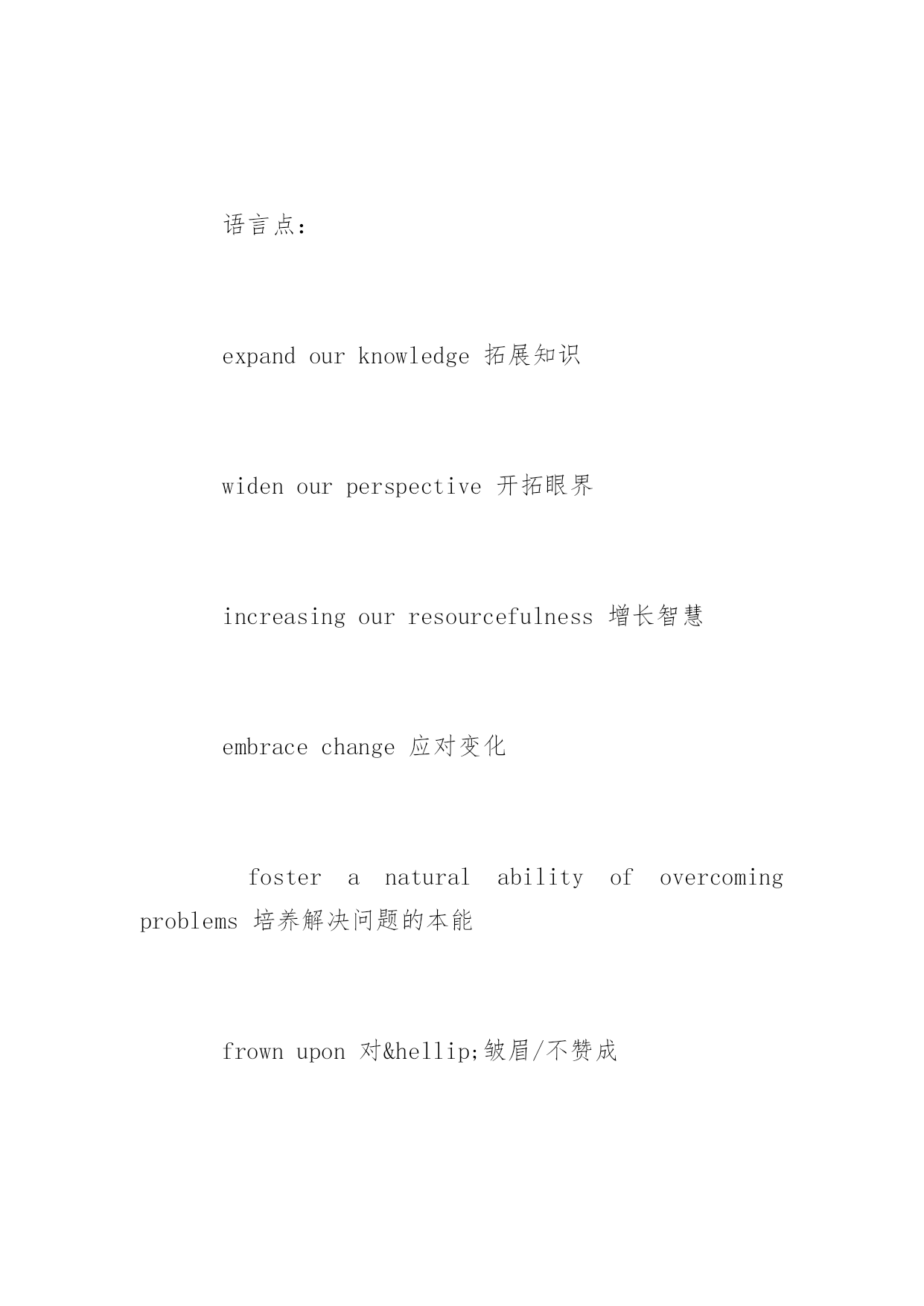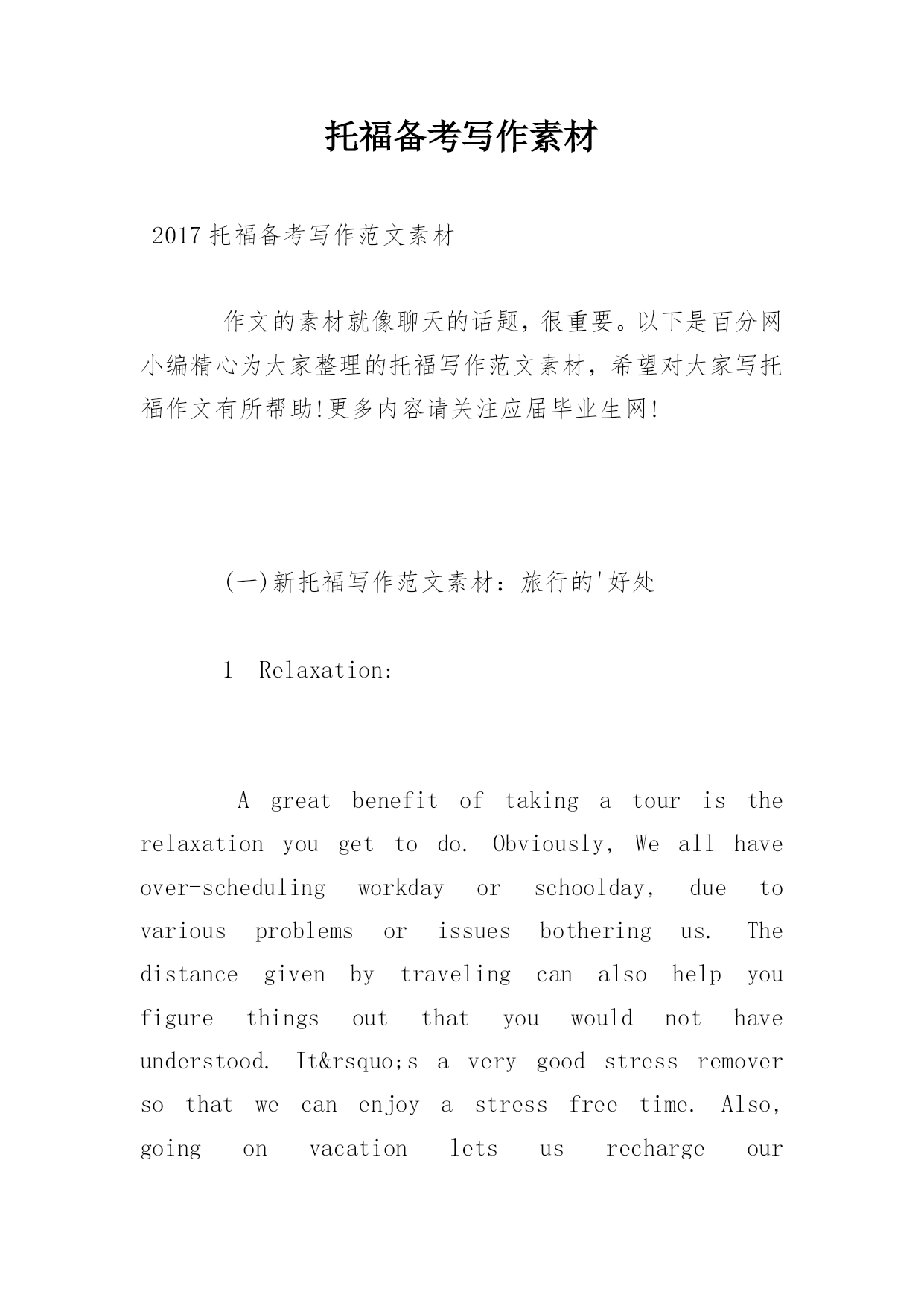 托福备考写作素材 2017托福备考写作范文素材 作文的素材就像聊天的话题,很重要。以下是百分网小编精心为大家整理的托福写作范文素材,希望对大家写托福作文有所帮助!更多内容请关注应届毕业生网! (一)新托福写作范文素材:旅行的'好处 1Relaxation: Agreatbenefitoftakingatouristherelaxationyougettodo.Obviously,Weallhaveover-schedulingworkdayorschoolday,duetovariousproblemsorissuesbotheringus.Thedistancegivenbytravelingcanalsohelpyoufigurethingsoutthatyouwouldnothaveunderstood.It’saverygoodstressremoversothatwecanenjoyastressfreetime.Also,goingonvacationletsusrechargeour“batteries”bydisconnectingusfromourregularlife.Whenwecomebackwefeelinvigoratedandwearehappytobebackinourdaytodayroutine. 语言点: 放松:relax/unwindoneself Haveover-schedulingworkdayorschoolday: 超负荷的工作时间和学校时光 averygoodstressremover缓解压力的好方式 travel/goonvacation/takeatrip旅行 rechargeour“batteries”补充能量 Escapefromthehustleandbustle/takeabreakfromdailyrountine/disconnectsbfromone’sregularlife从日常生活中分离出来 feelinvigorated/recharged/refreshed感到能力充沛 2Newexperience Travelingexpandsourknowledgeandwidensourperspective,thusincreasingourresourcefulness.Toviewnewcustoms,differentwaysoflivingisfantasticforthemind.Itgivesusanewperspectiveaboutlifeandespeciallyourlife.Ihavenoticedthatpeoplewhotraveledalotinlifewerereadytoembracechangeandfosteranaturalabilityofovercomingproblemsthatotherswouldfrownupon. 语言点: expandourknowledge拓展知识 widenourperspective开拓眼界 increasingourresourcefulness增长智慧 embracechange应对变化 fosteranaturalabilityofovercomingproblems培养解决问题的本能 frownupon对…皱眉/不赞成 3Lastingmemory Whentravelingwithfriendsorfamilyitcreatesmemoriesforalifetime.Travellingiswortheverypennyyouwillspendbecausememorieslastforever.Thesememorieswillcreateanemotionalbondthatnothingcanerasenomatterwhathappenstothefriendship/relationship.Itcanalsogiveanewperspectiveontherelationshipandcementthebondforever.Italsogivesnicestoriestotellpeopleafterwards,youcanmakephotoalbumsaboutyourtripsandwhenyoufeelnostalgicyoucantakeanhourofyourlifeandexperiencethetripsagainbylookingatyourpictures. 语言点: createsmemoriesforalifetime:留下永生的回忆 create